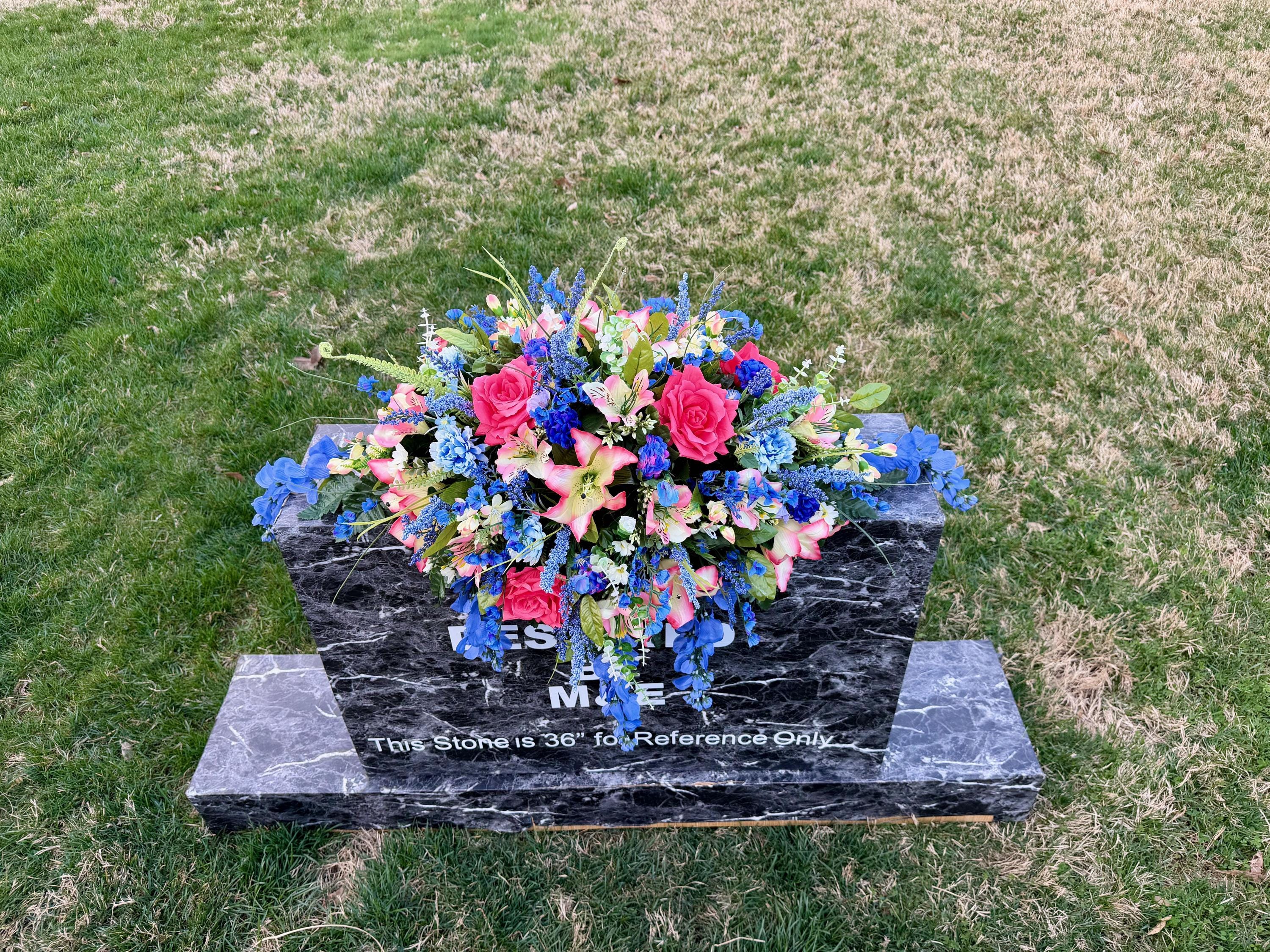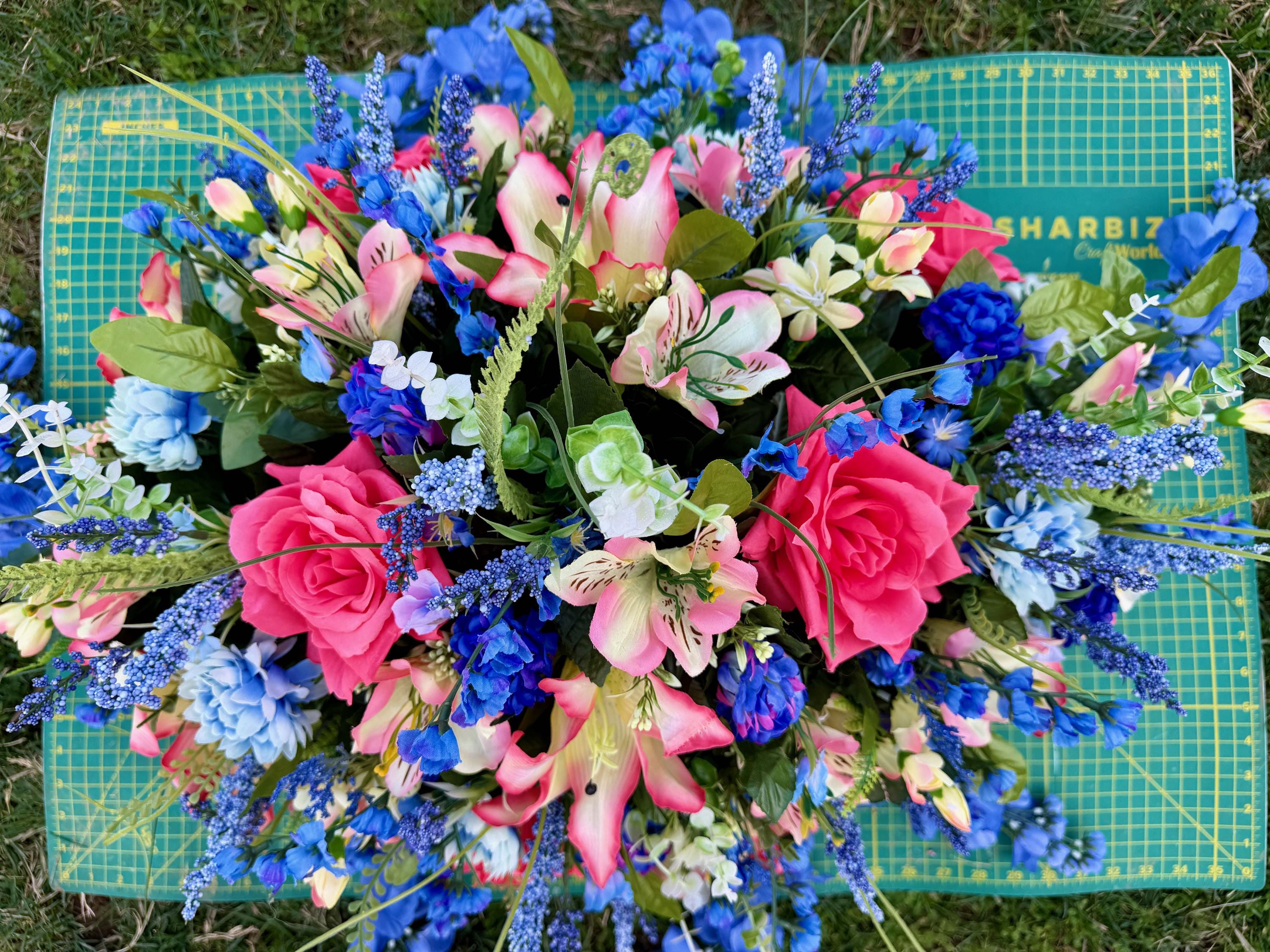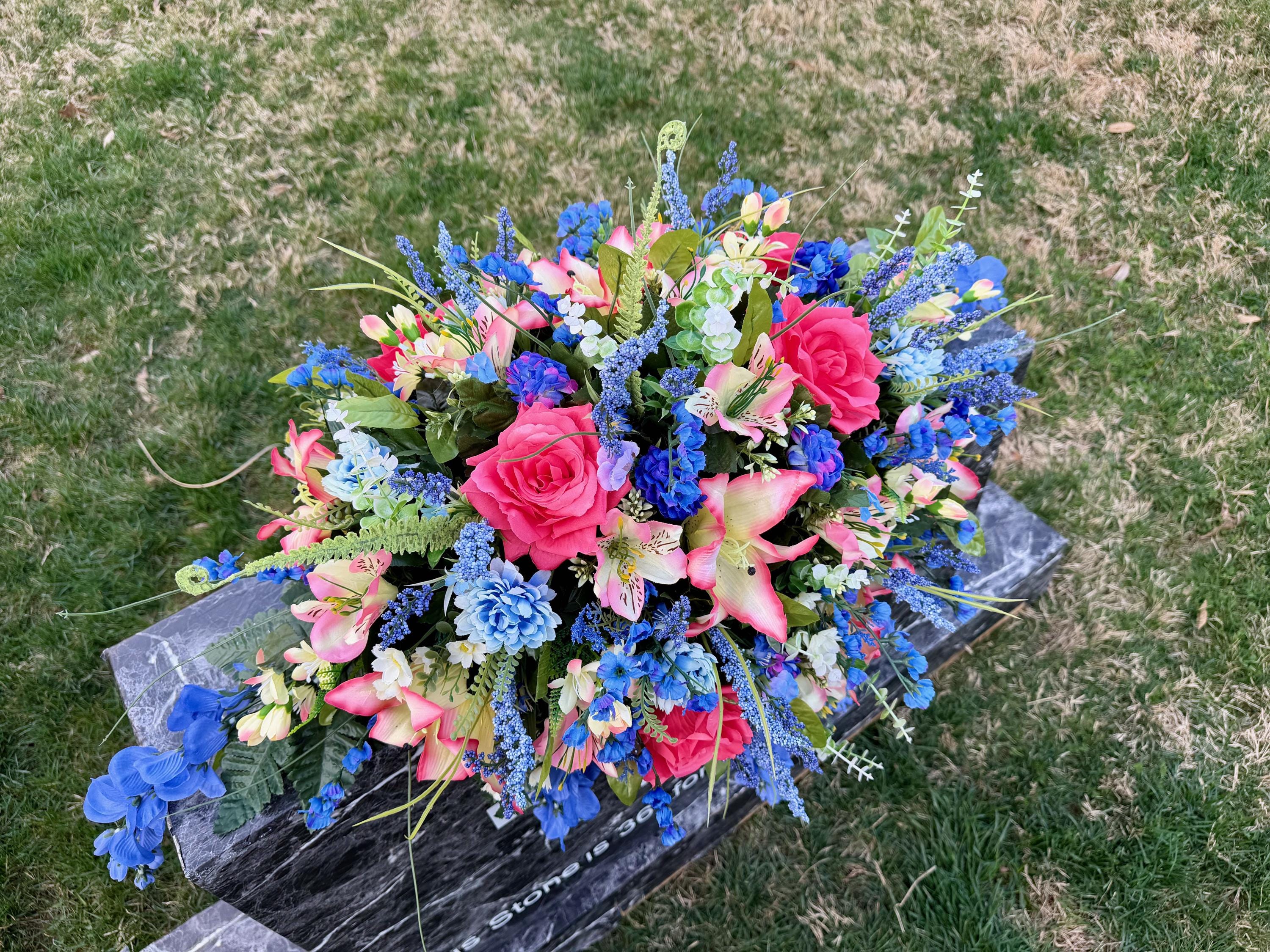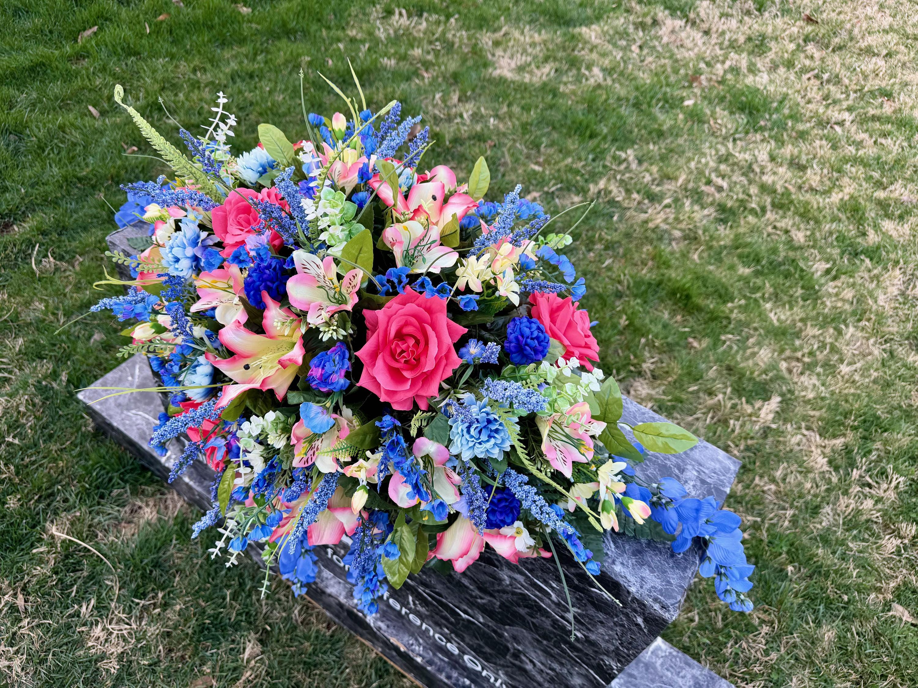 Beautiful Blues and Pinks Saddle Quality Silk Flowers, Cemetery Saddle, Cemetery Flowers, Headstone Saddle, Cemetery Arrangement, Memorial