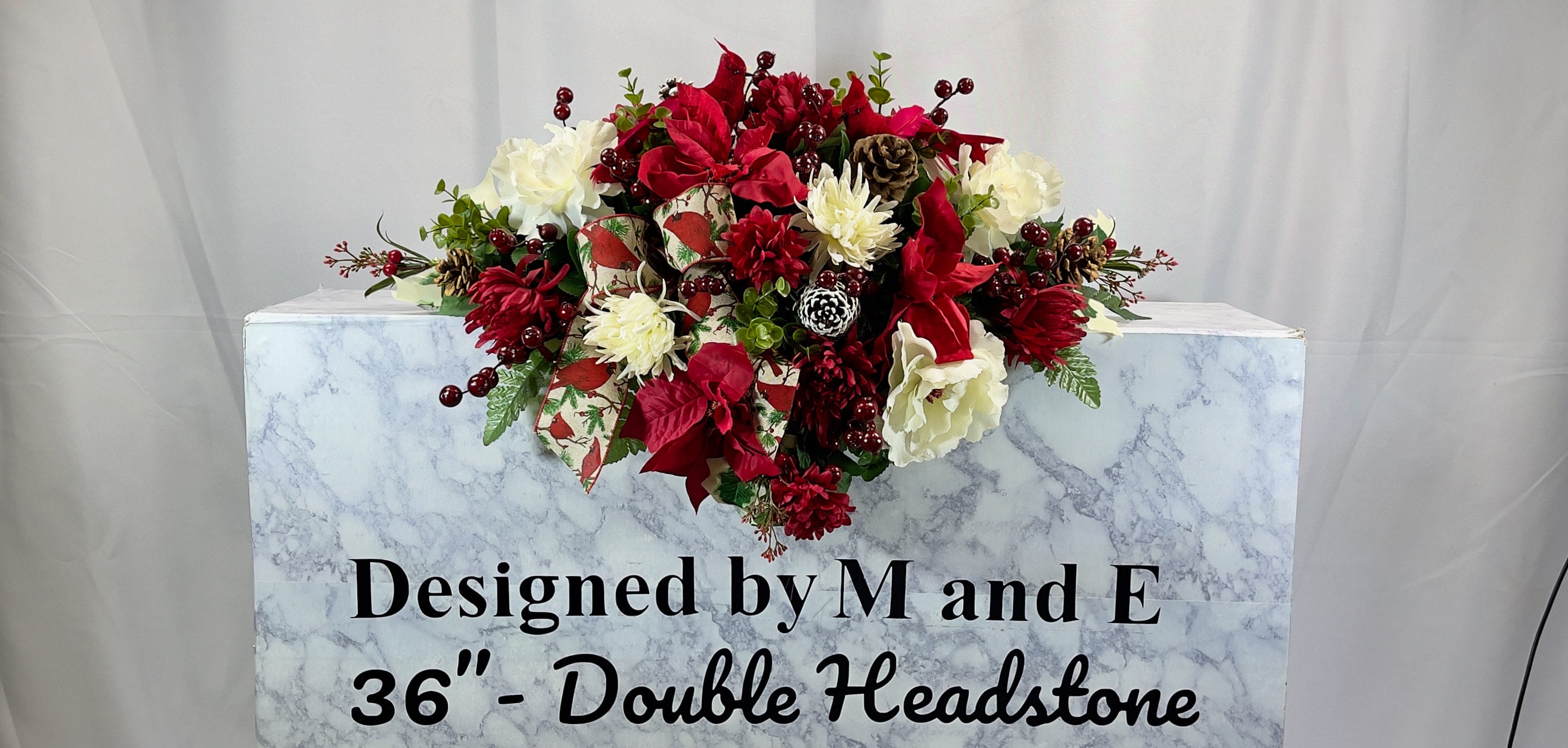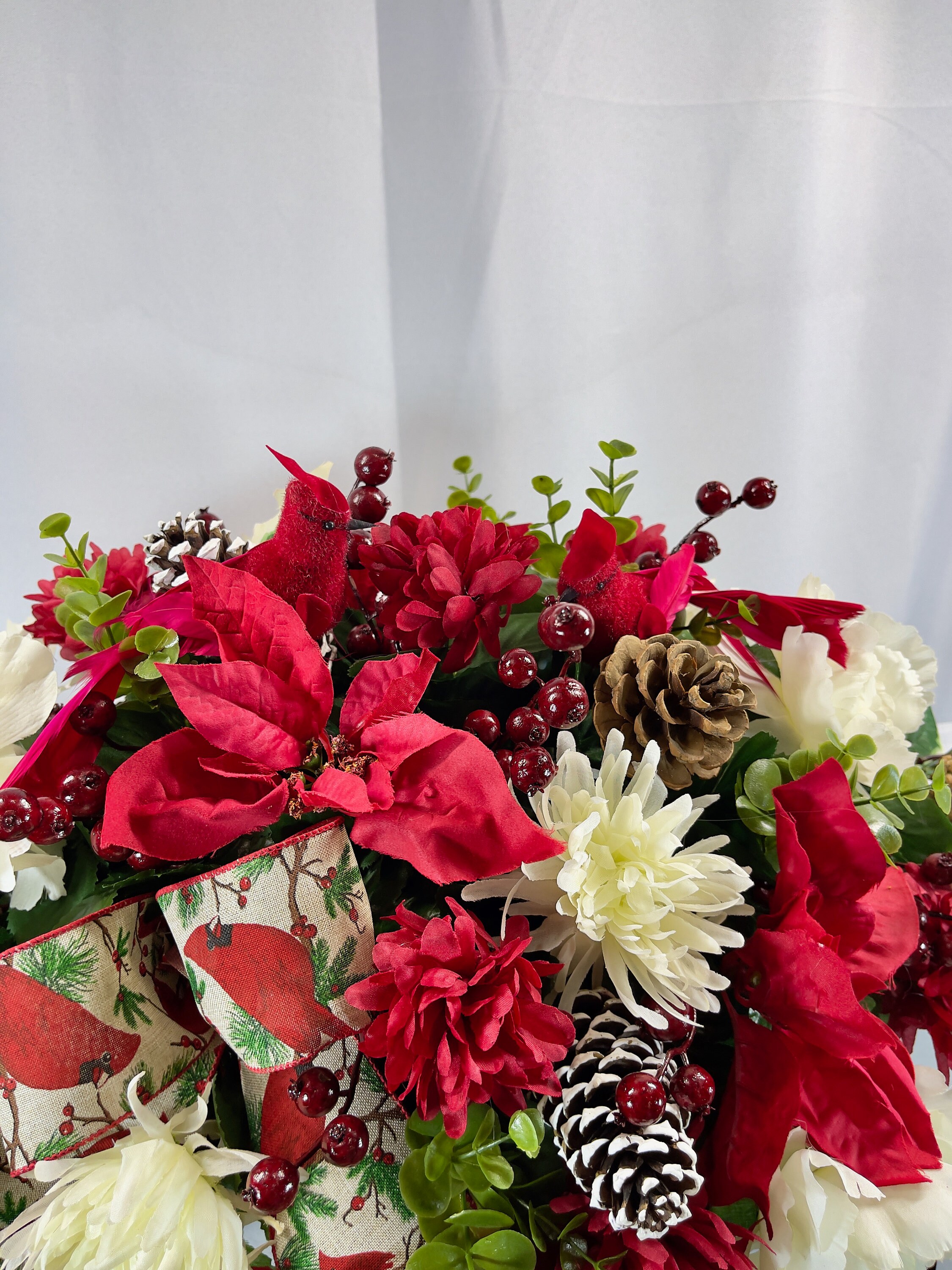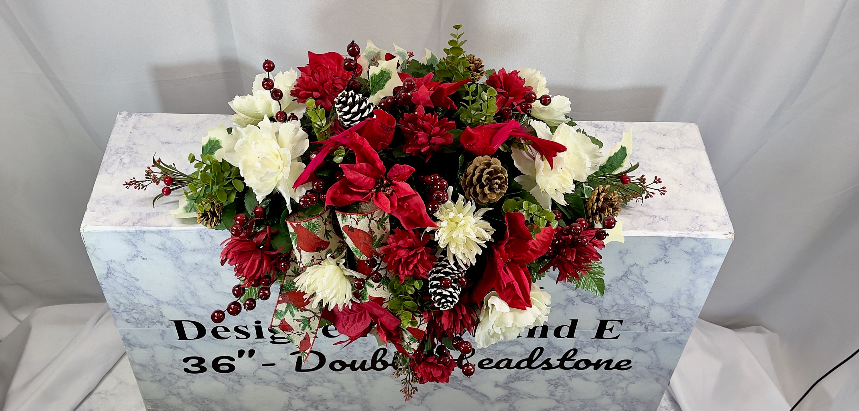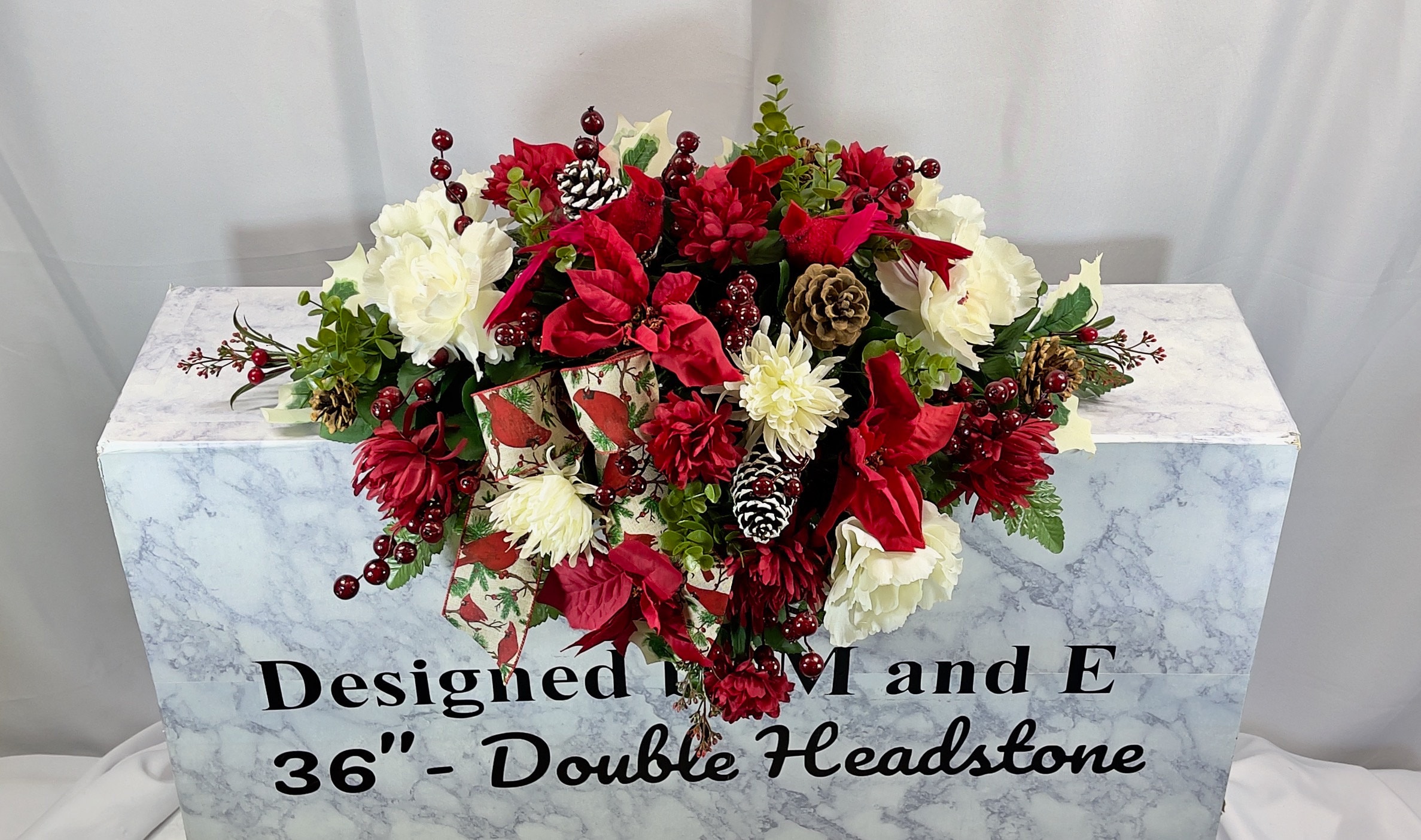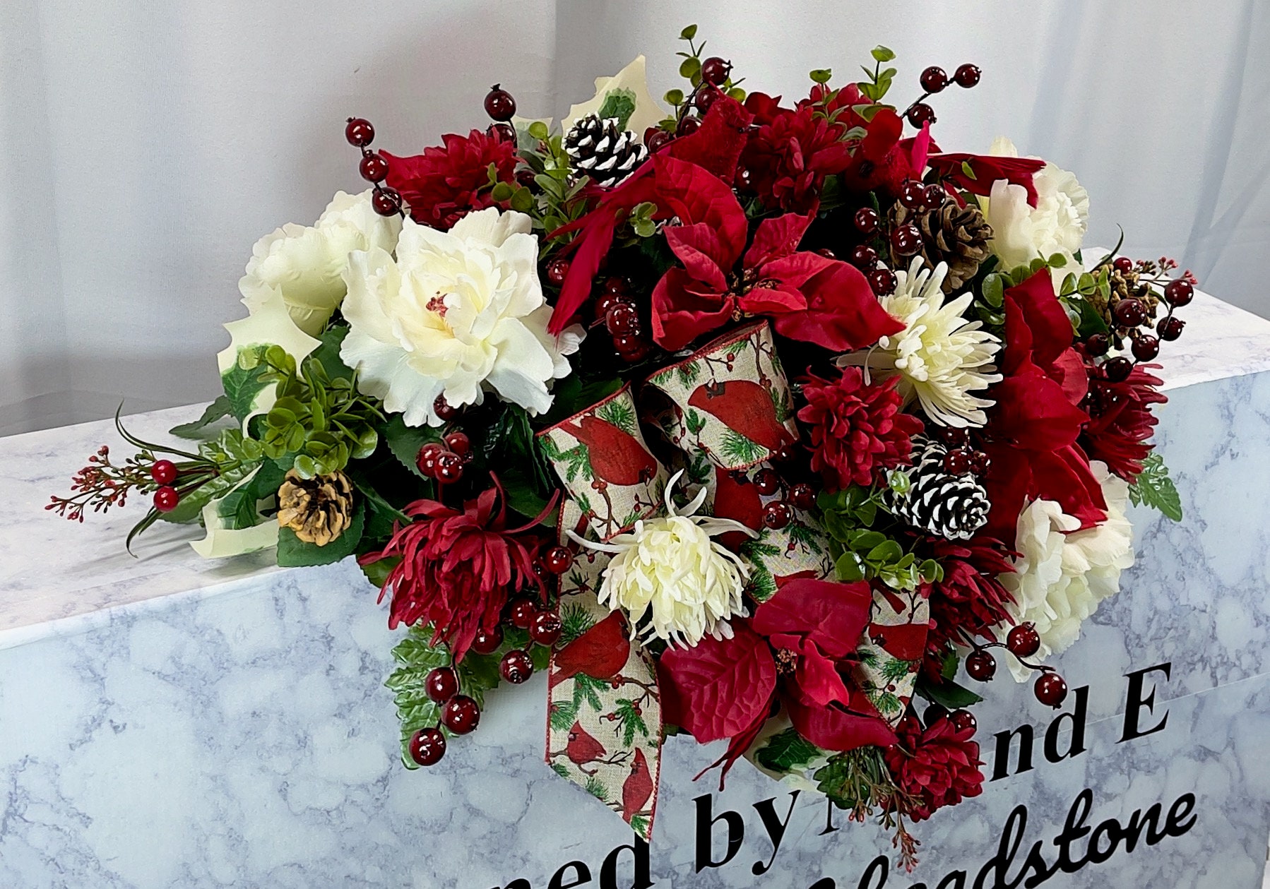 Redbirds and Beautiful Flowers Christmas Cemetery Saddle, Christmas Flowers, Headstone Saddle Arrangement, Christmas Headstone Saddle