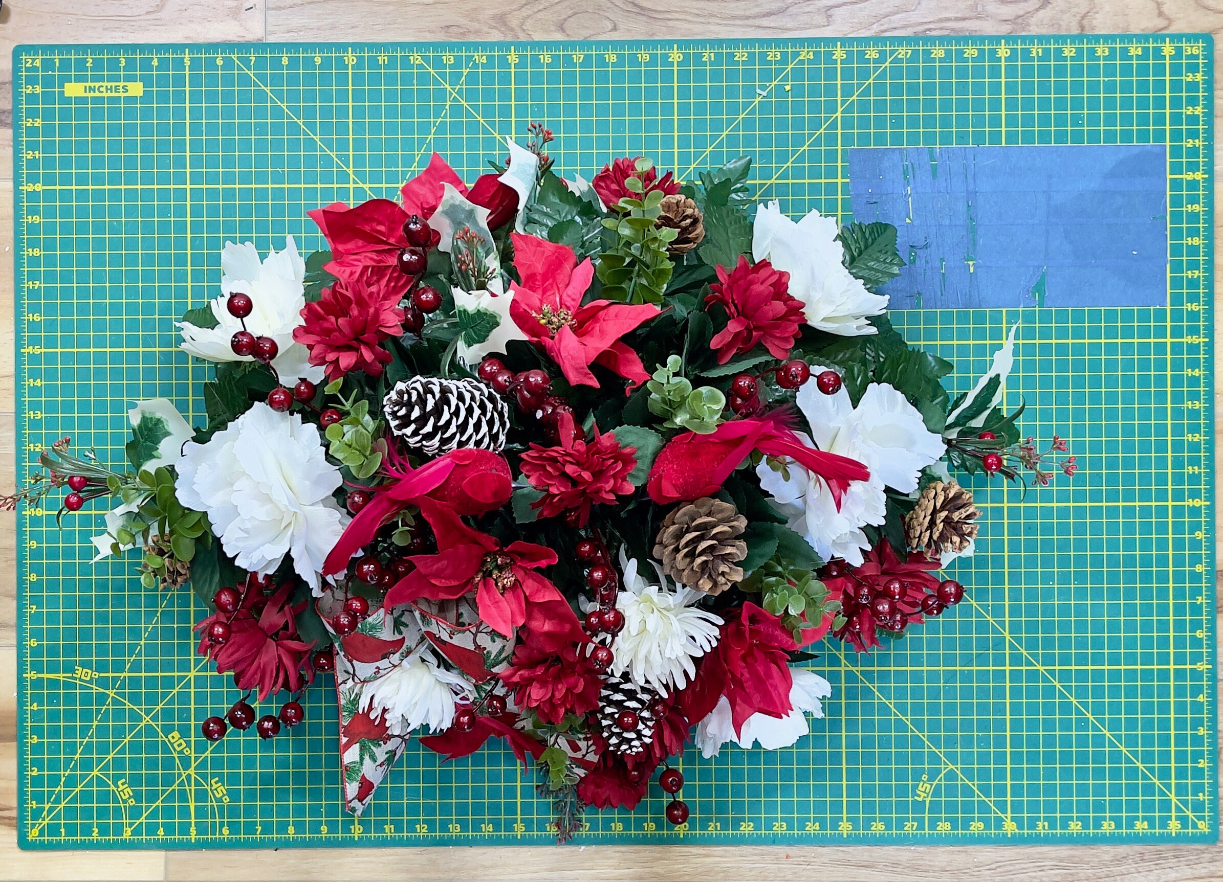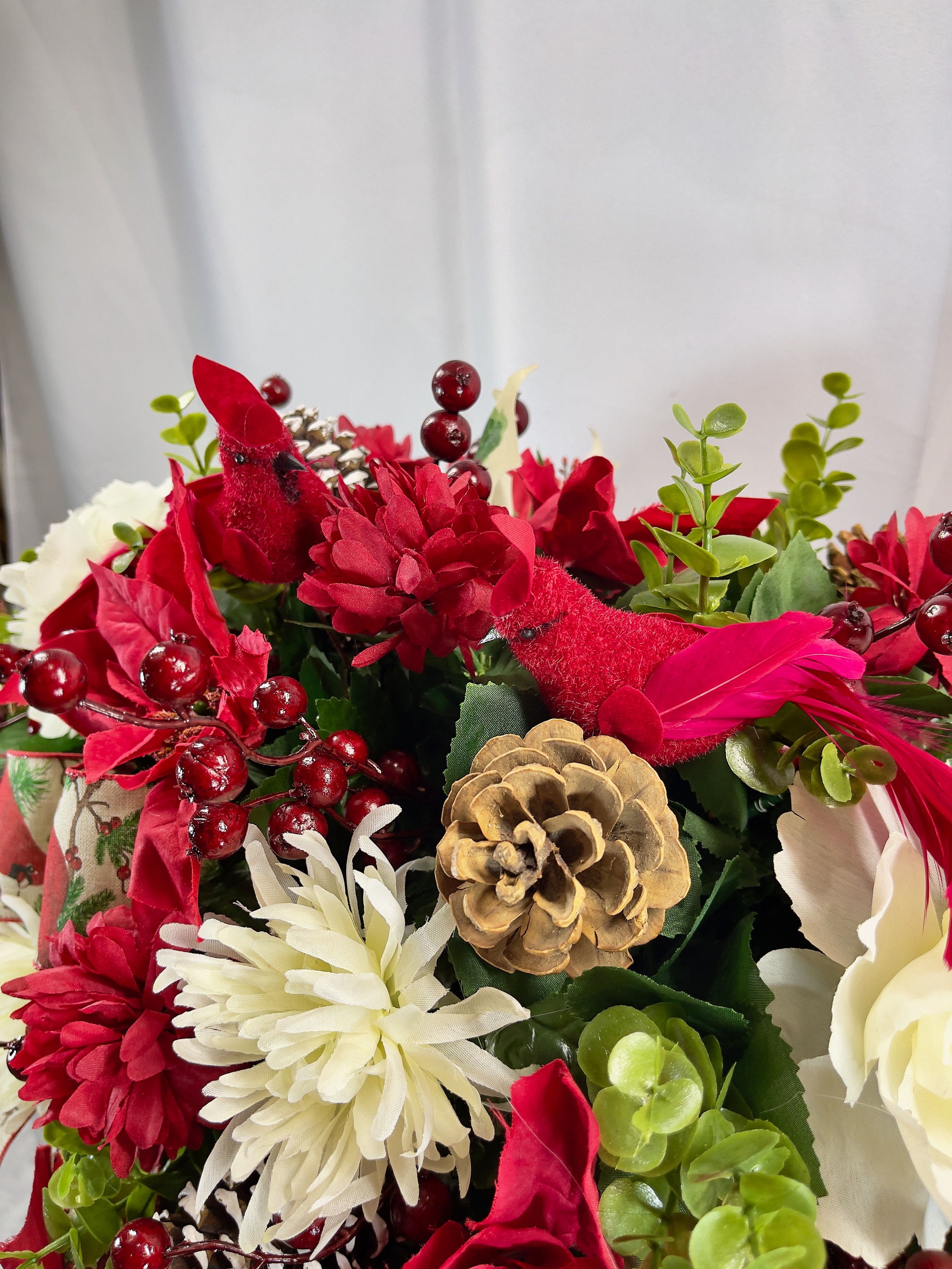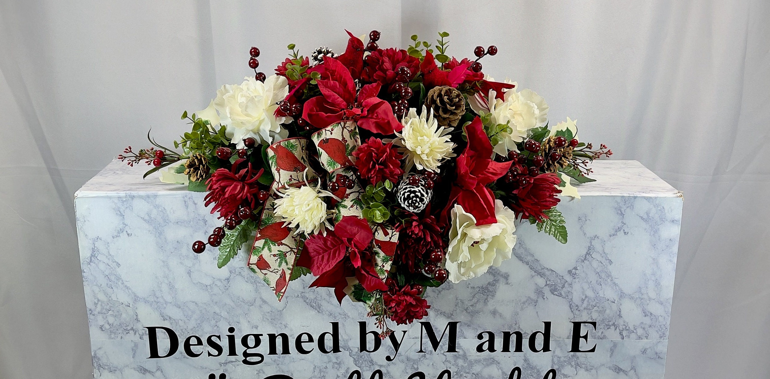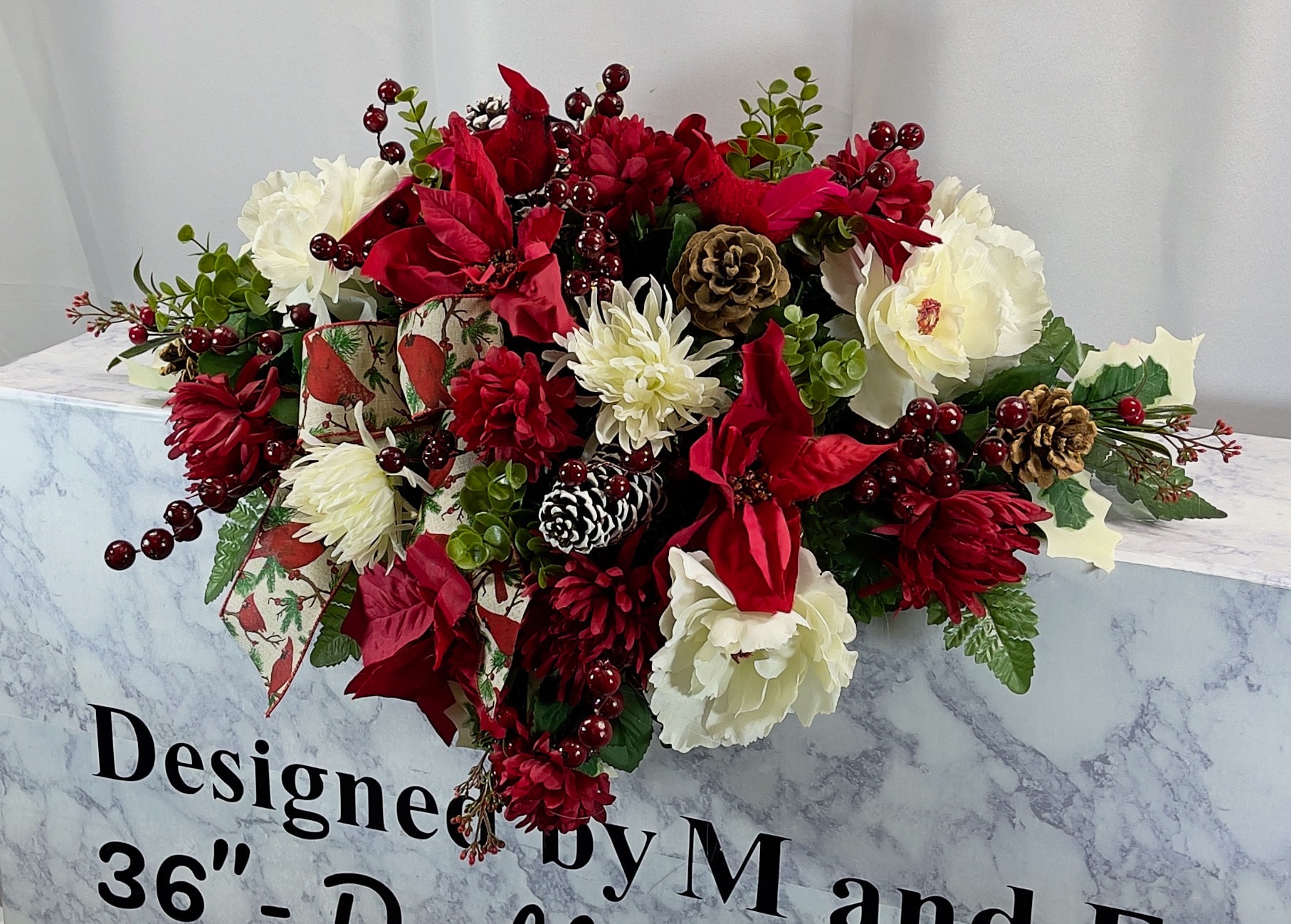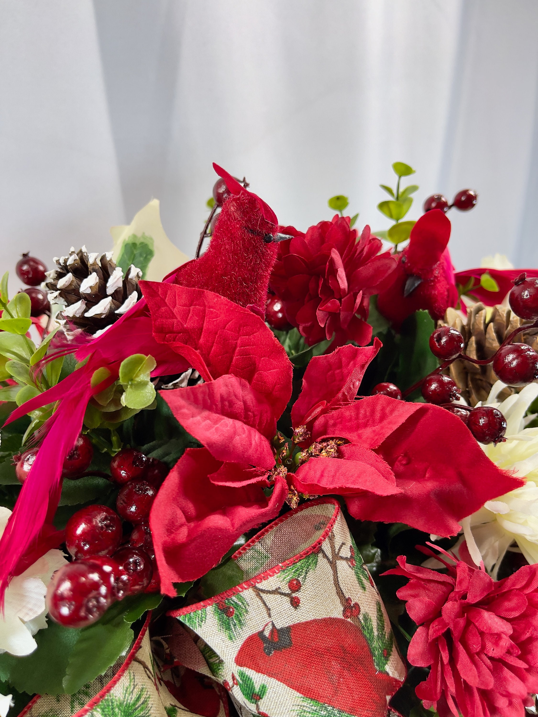 Redbirds and Beautiful Flowers Christmas Cemetery Saddle, Christmas Flowers, Headstone Saddle Arrangement, Christmas Headstone Saddle