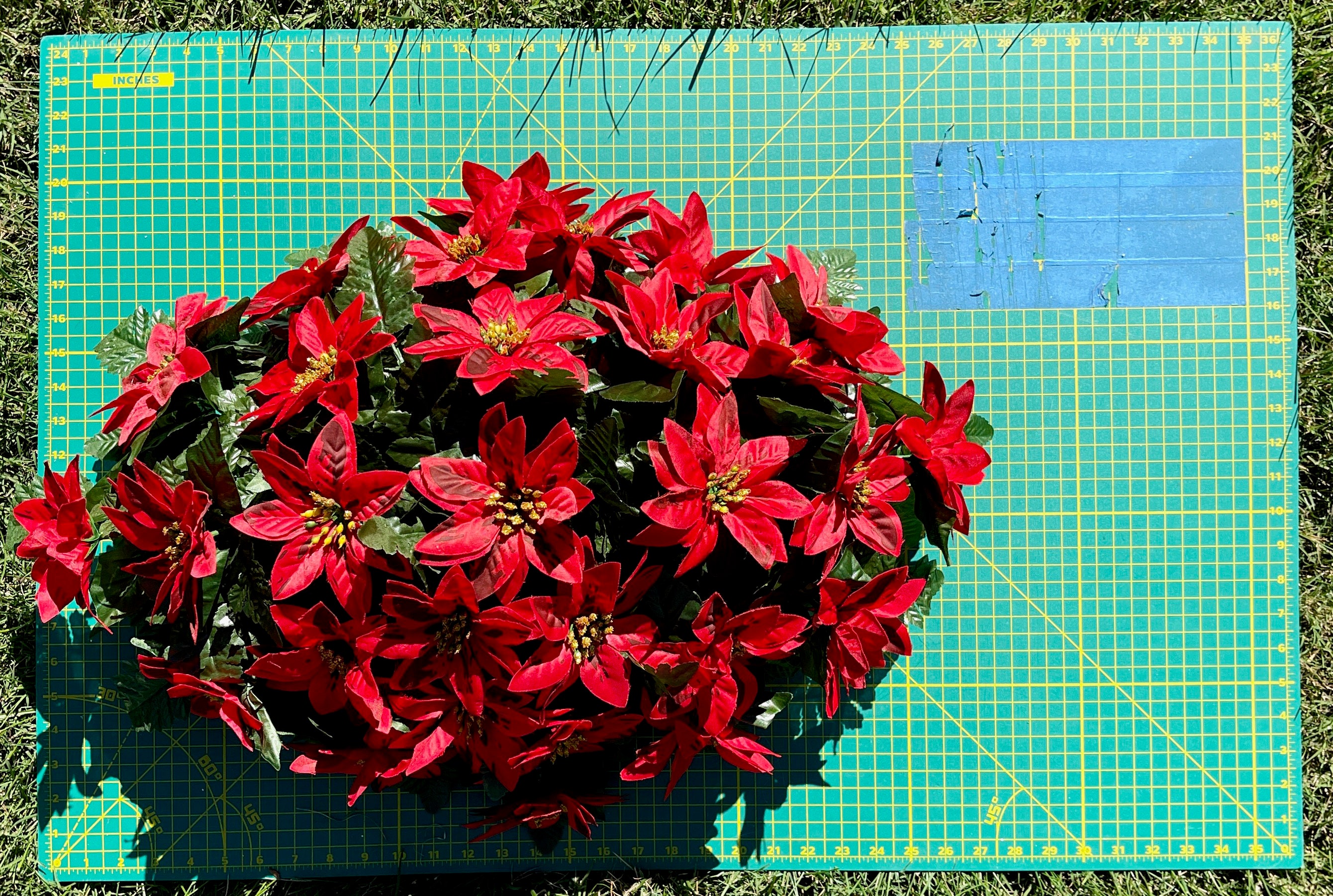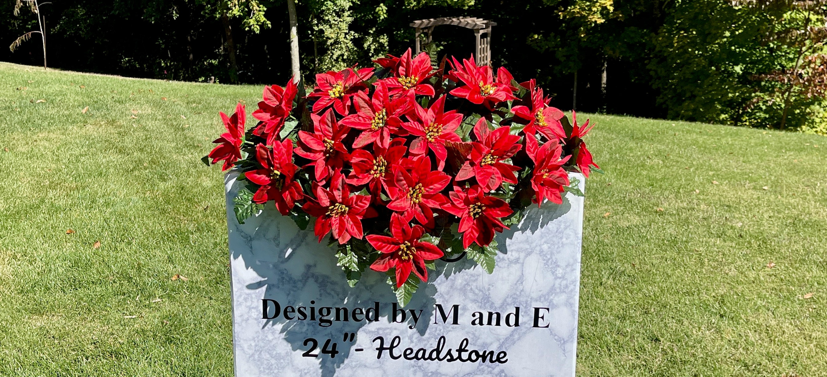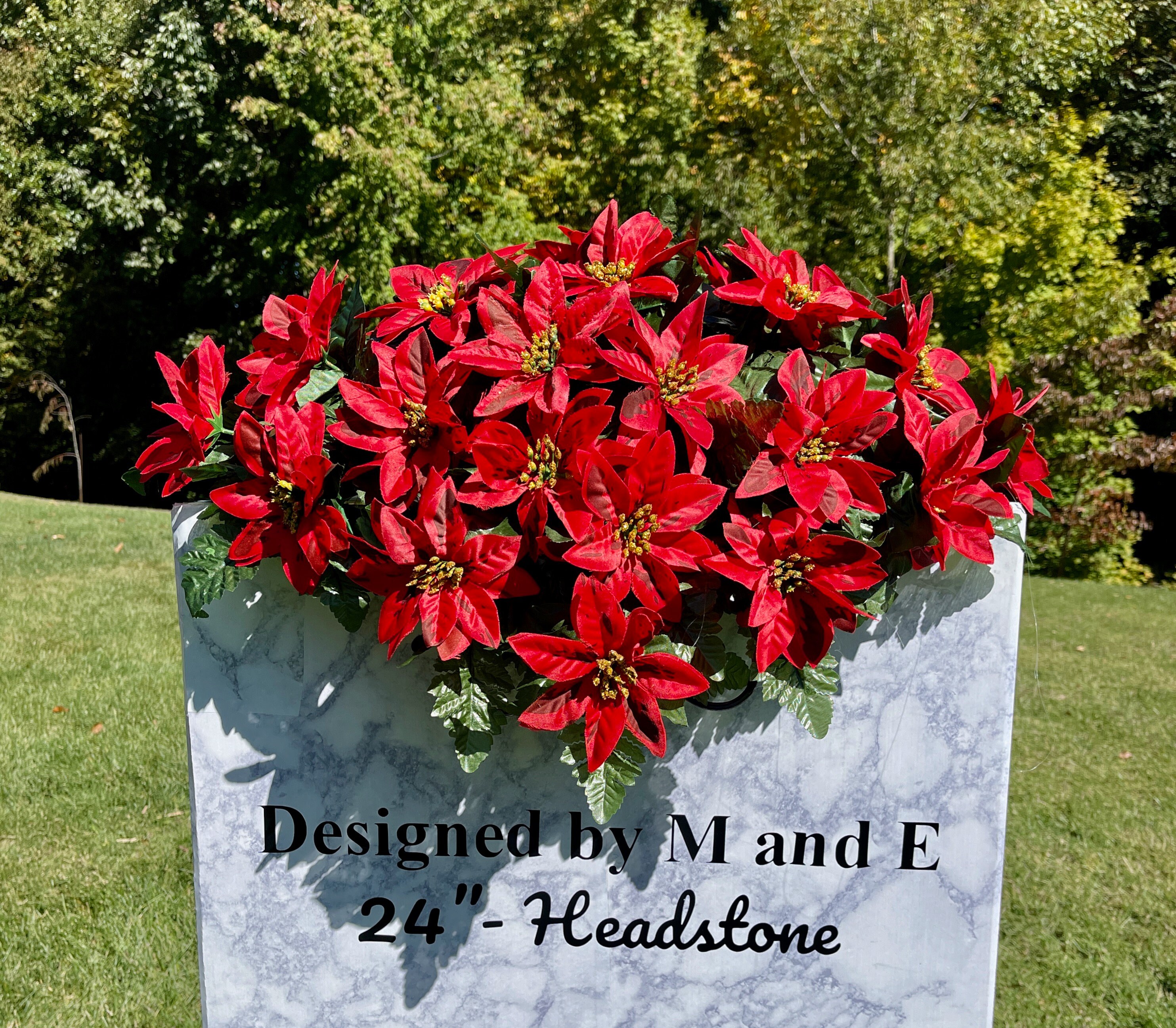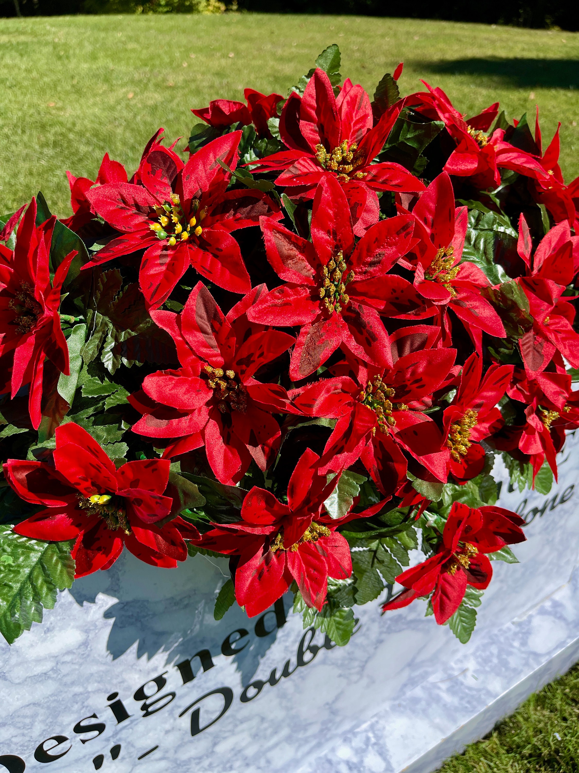 Burgundy and Red Pointsetta Christmas Cemetery Saddle, Christmas Cemetery Flowers, Christmas Headstone Saddle Arrangement, Memorial Flowers