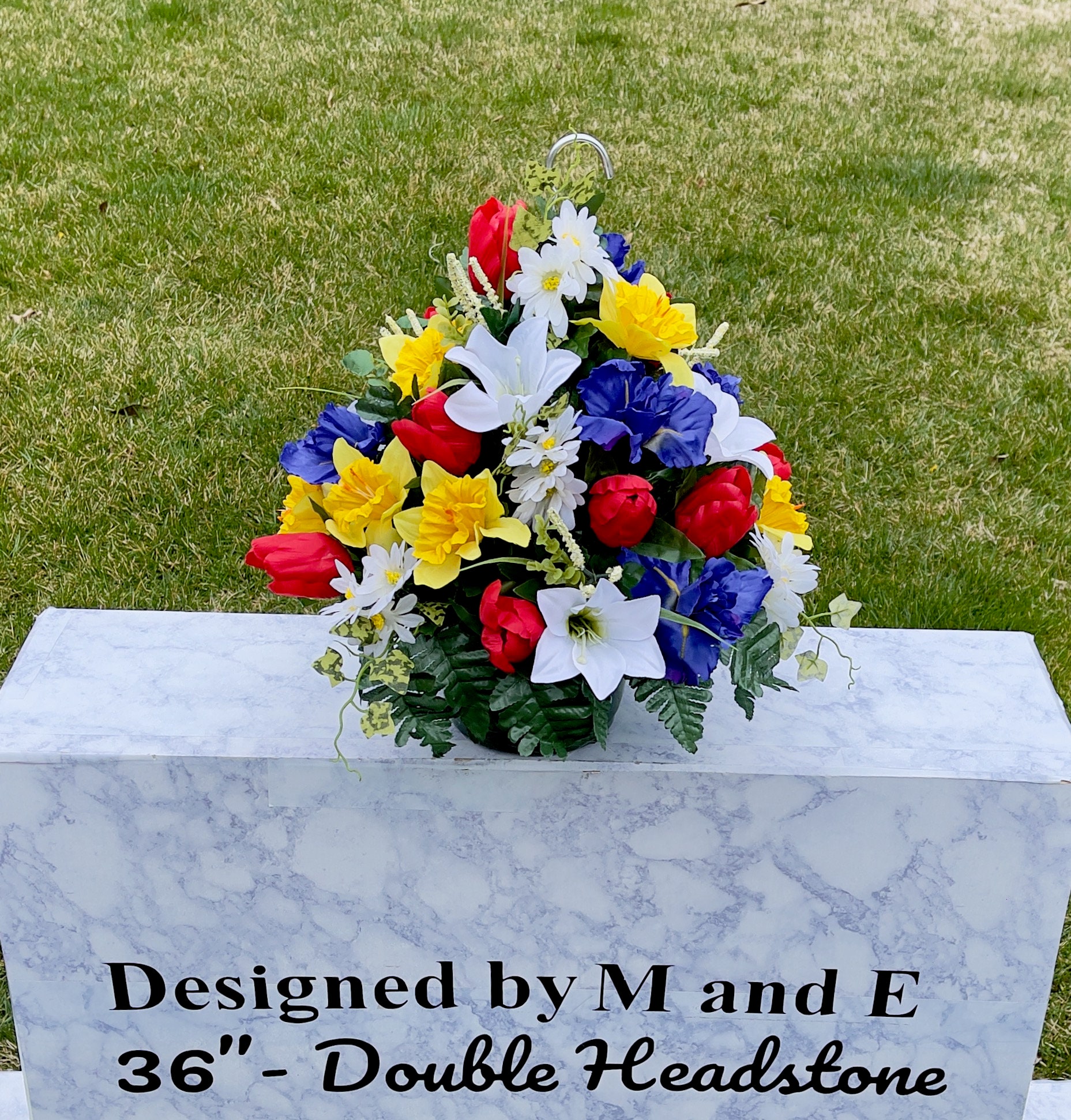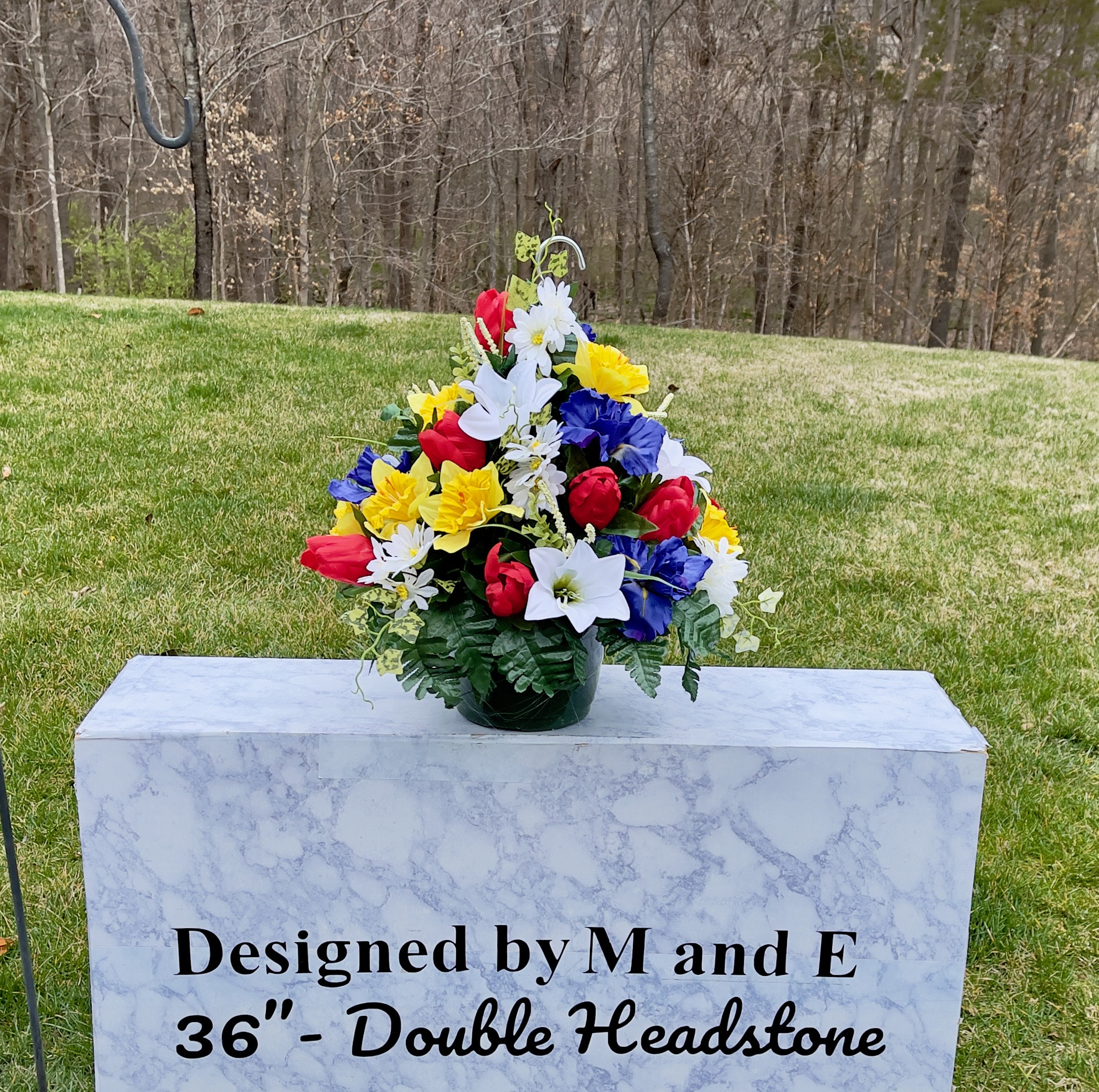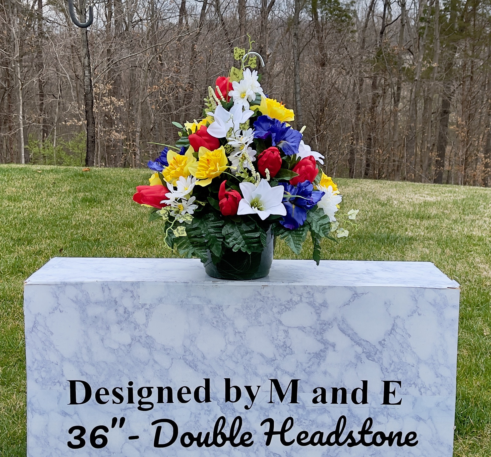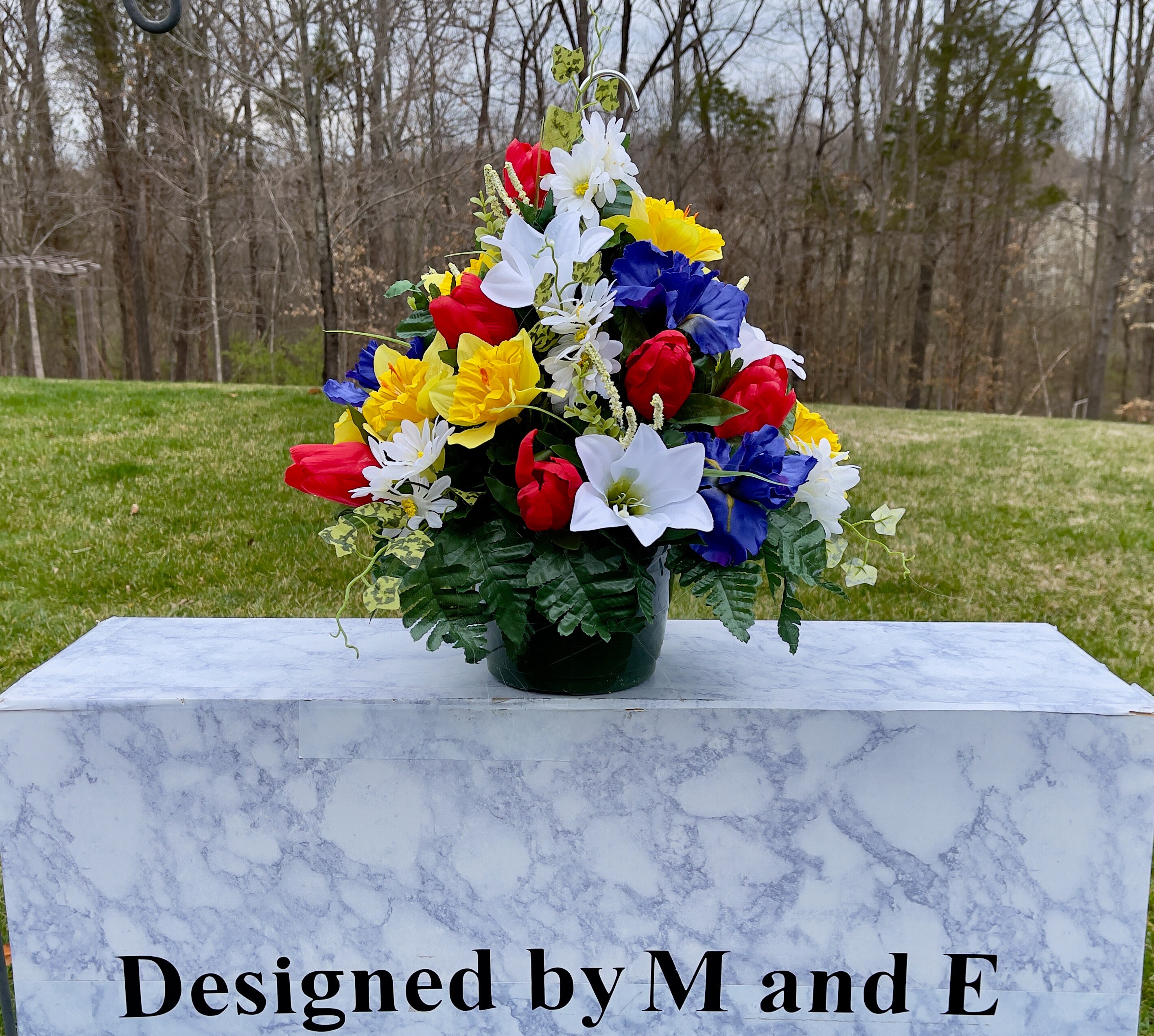 We’re a small, family-operated business consisting of myself, my husband, and my daughter. We personally manage every order and strive for excellent customer service. All our arrangements use high-quality silk flowers, though all silk blooms may fade over time. Each stem is glued into foam to withstand the elements. Designed by M&E uses only premium silks, and we put genuine care into every piece we create. Rest assured, the arrangement shown in our photos is exactly the one you’ll receive, as I design and assemble each one myself. If you’re searching for something unique or have a particular flower, color, or matching vases in mind, please contact me to discuss a custom order.