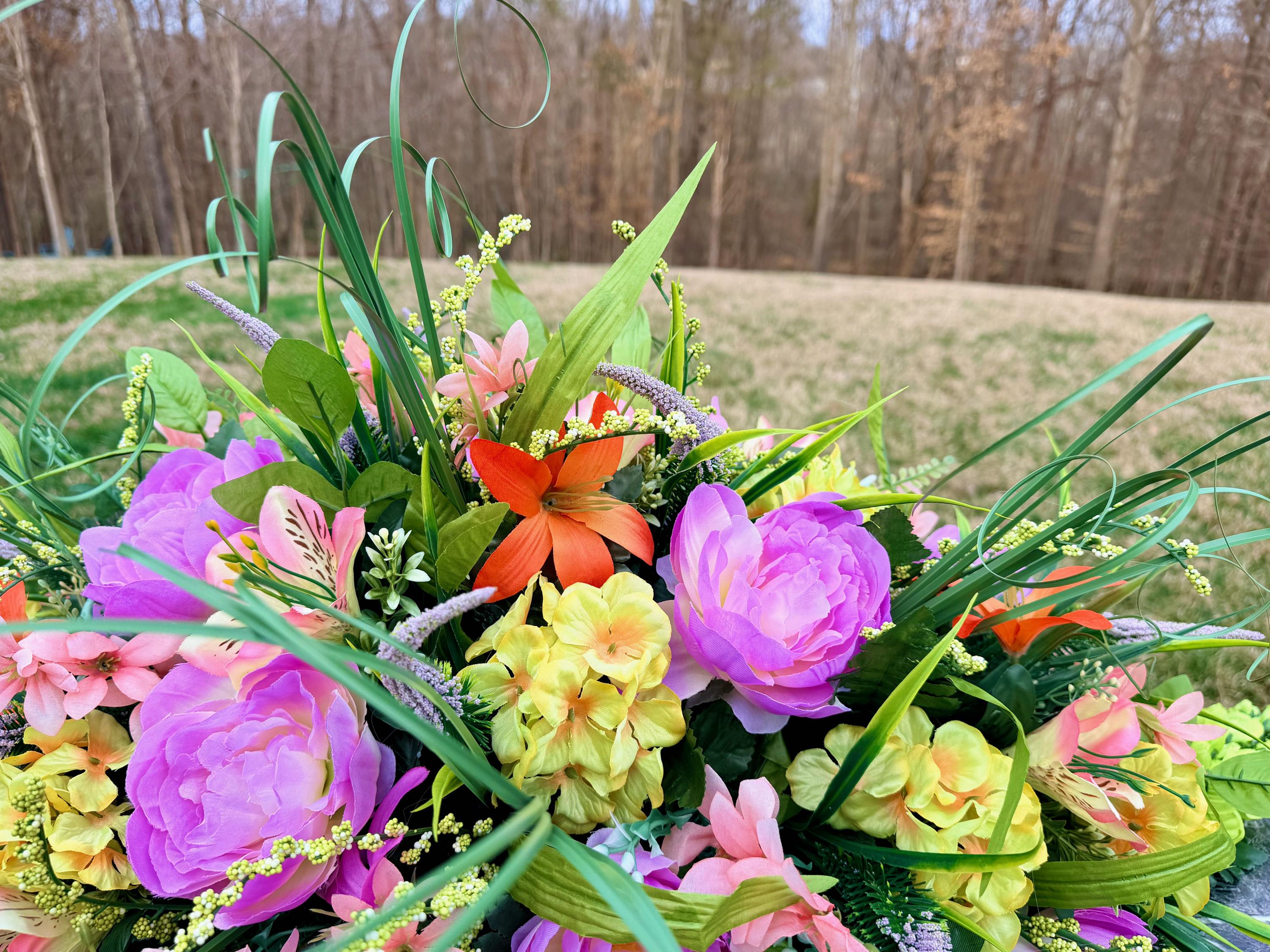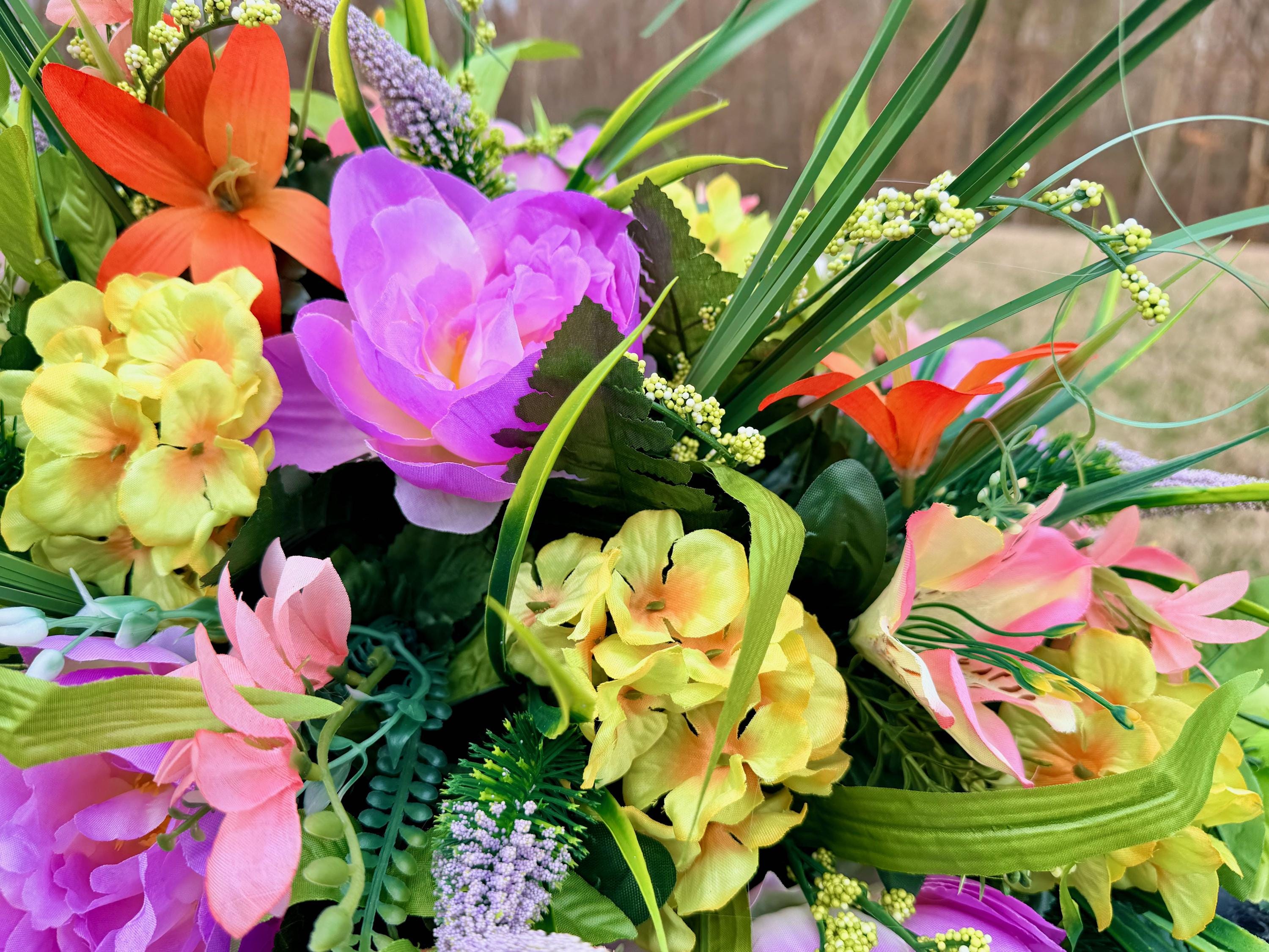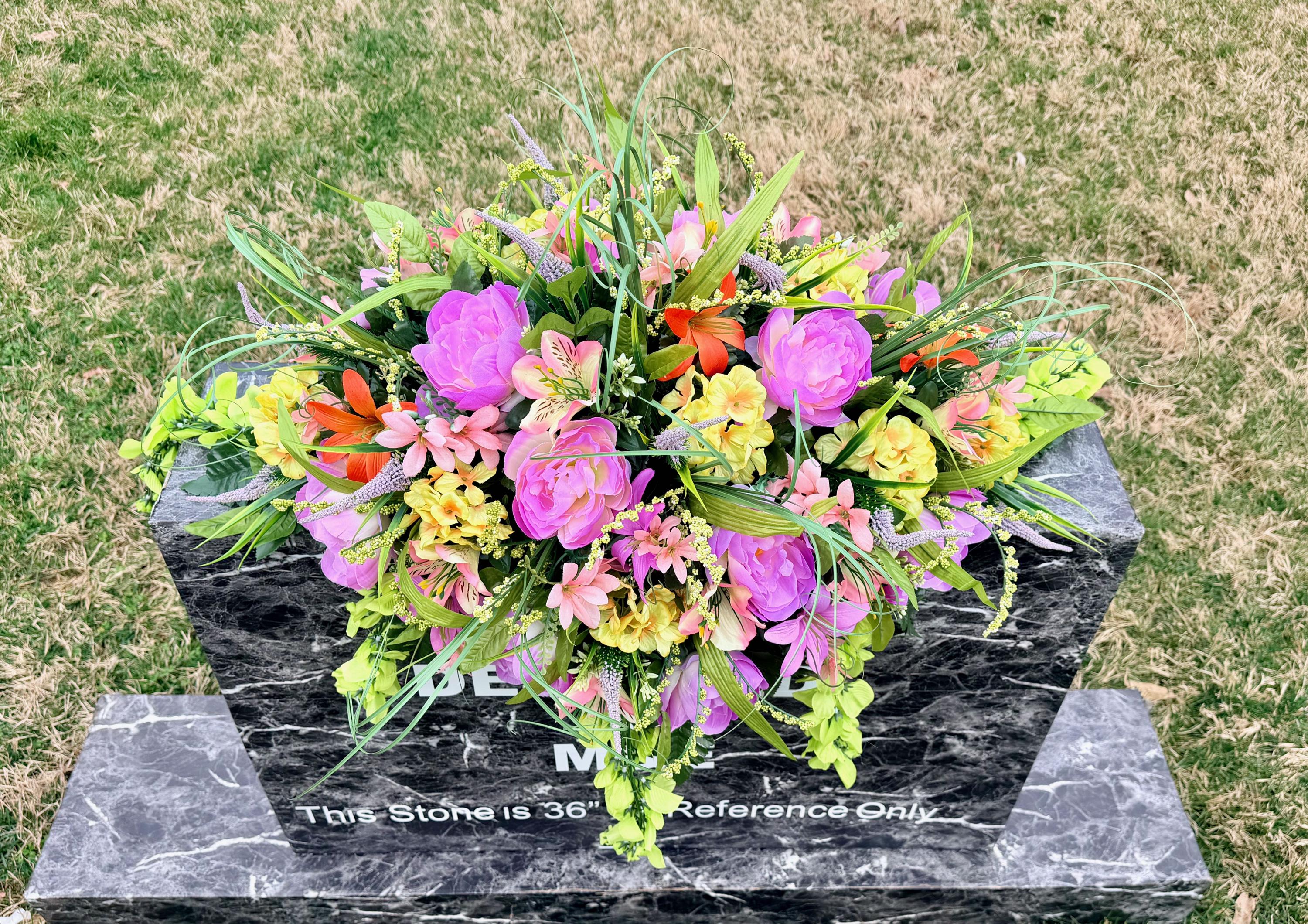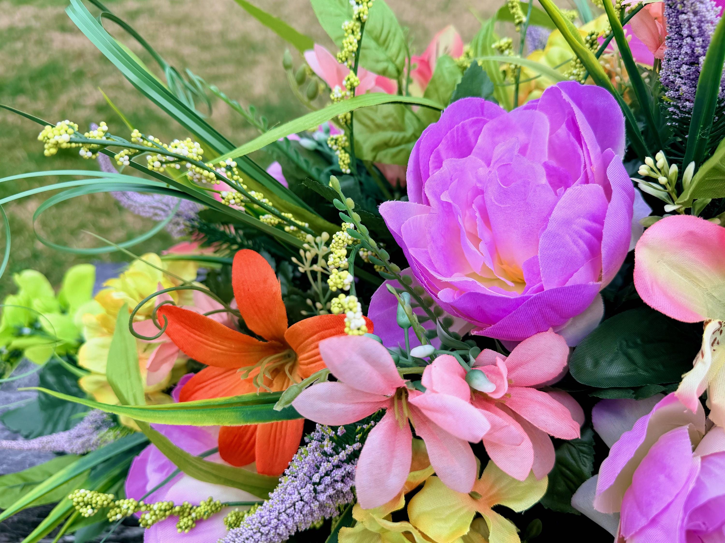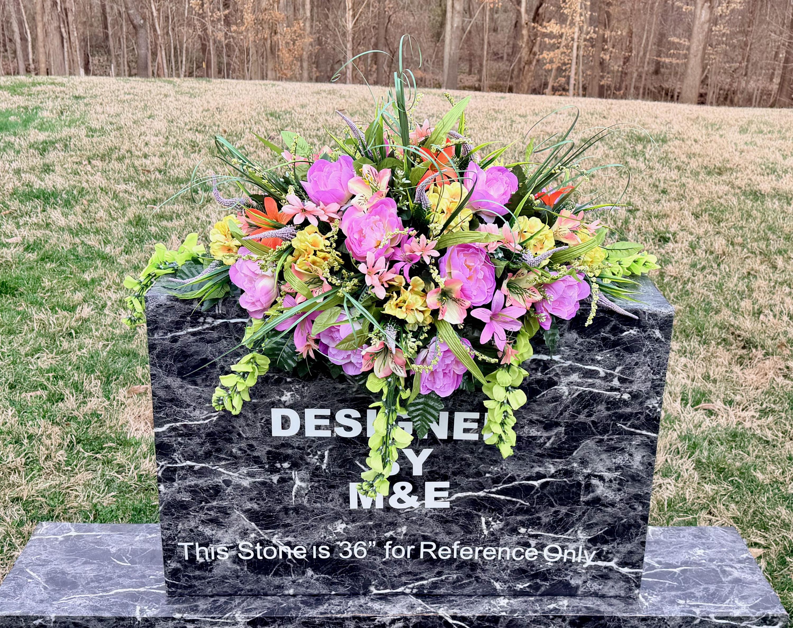 We’re a small, family-operated business consisting of myself, my husband, and my daughter. We personally manage every order and strive for excellent customer service. All our arrangements use high-quality silk flowers, though all silk blooms may fade over time. Each stem is glued into foam to withstand the elements. Designed by M&E uses only premium silks, and we put genuine care into every piece we create. Rest assured, the arrangement shown in our photos is exactly the one you’ll receive, as I design and assemble each one myself. If you’re searching for something unique or have a particular flower, color, or matching vases in mind, please contact me to discuss a custom order.