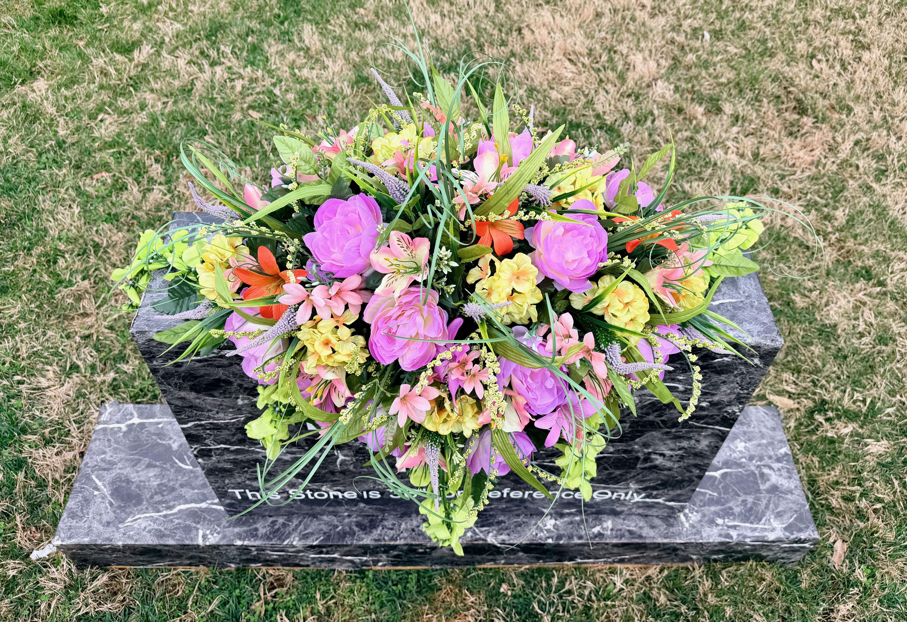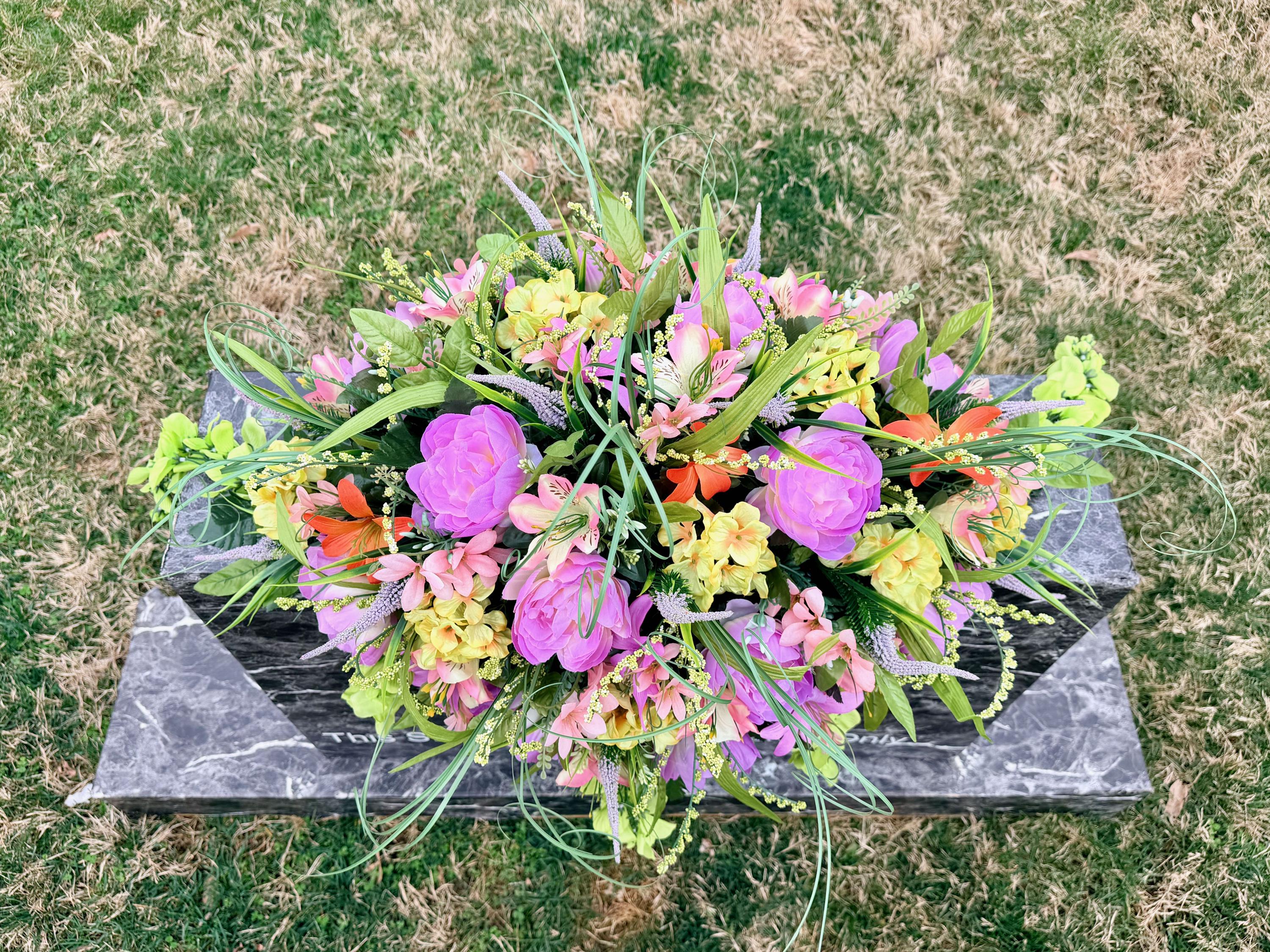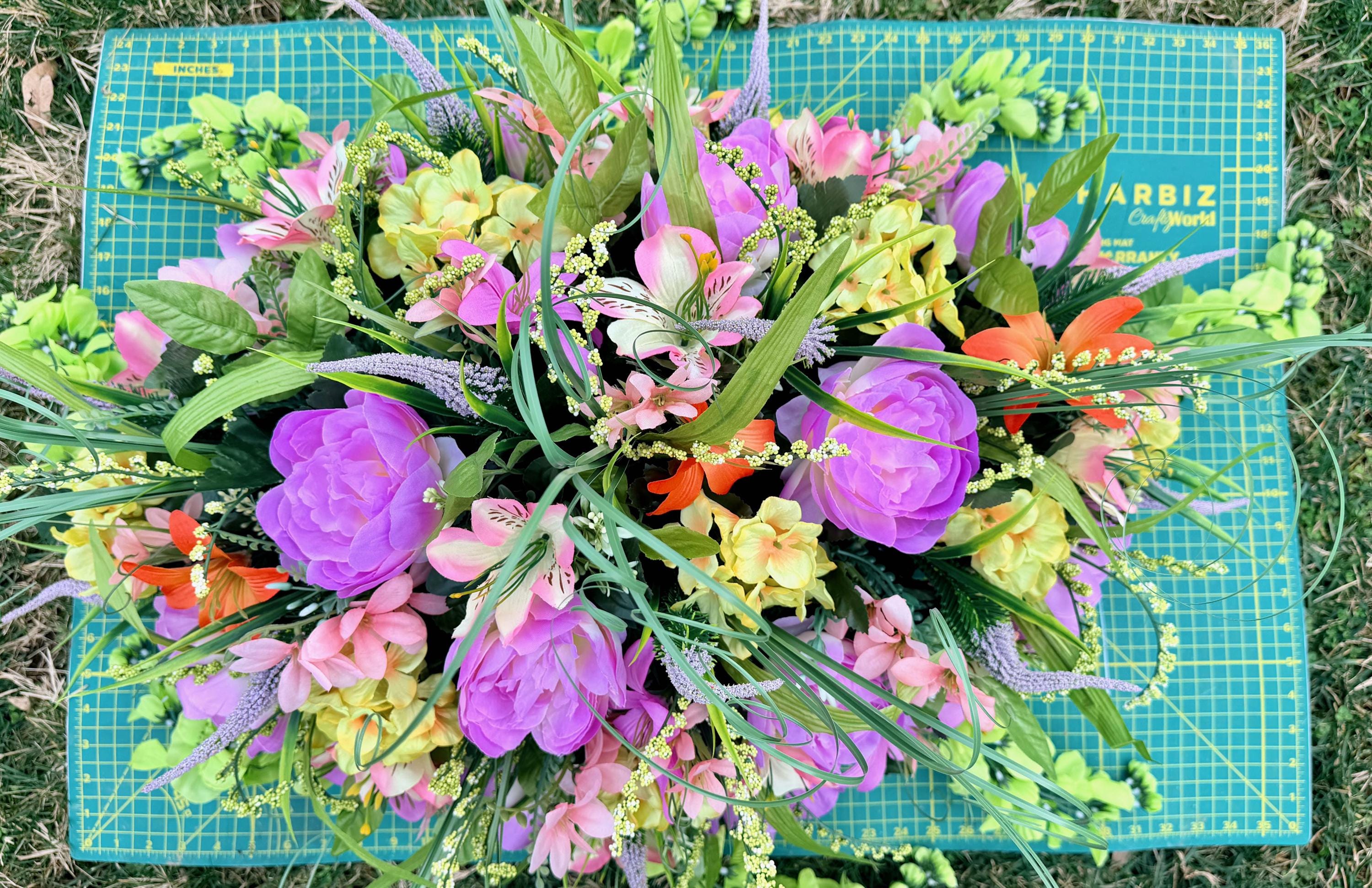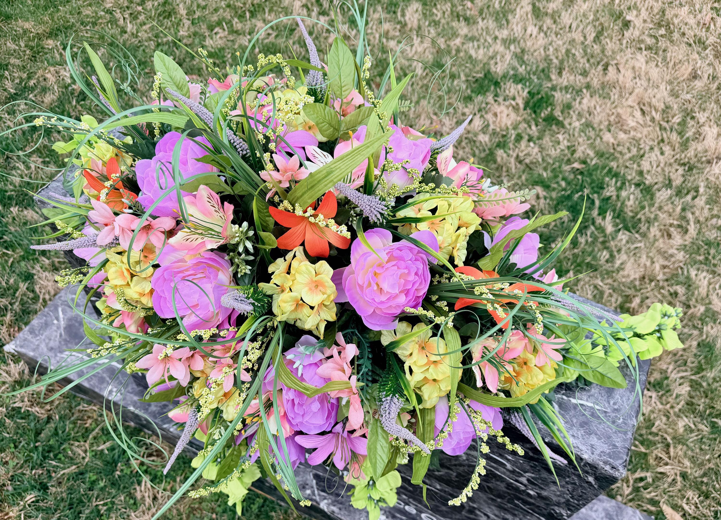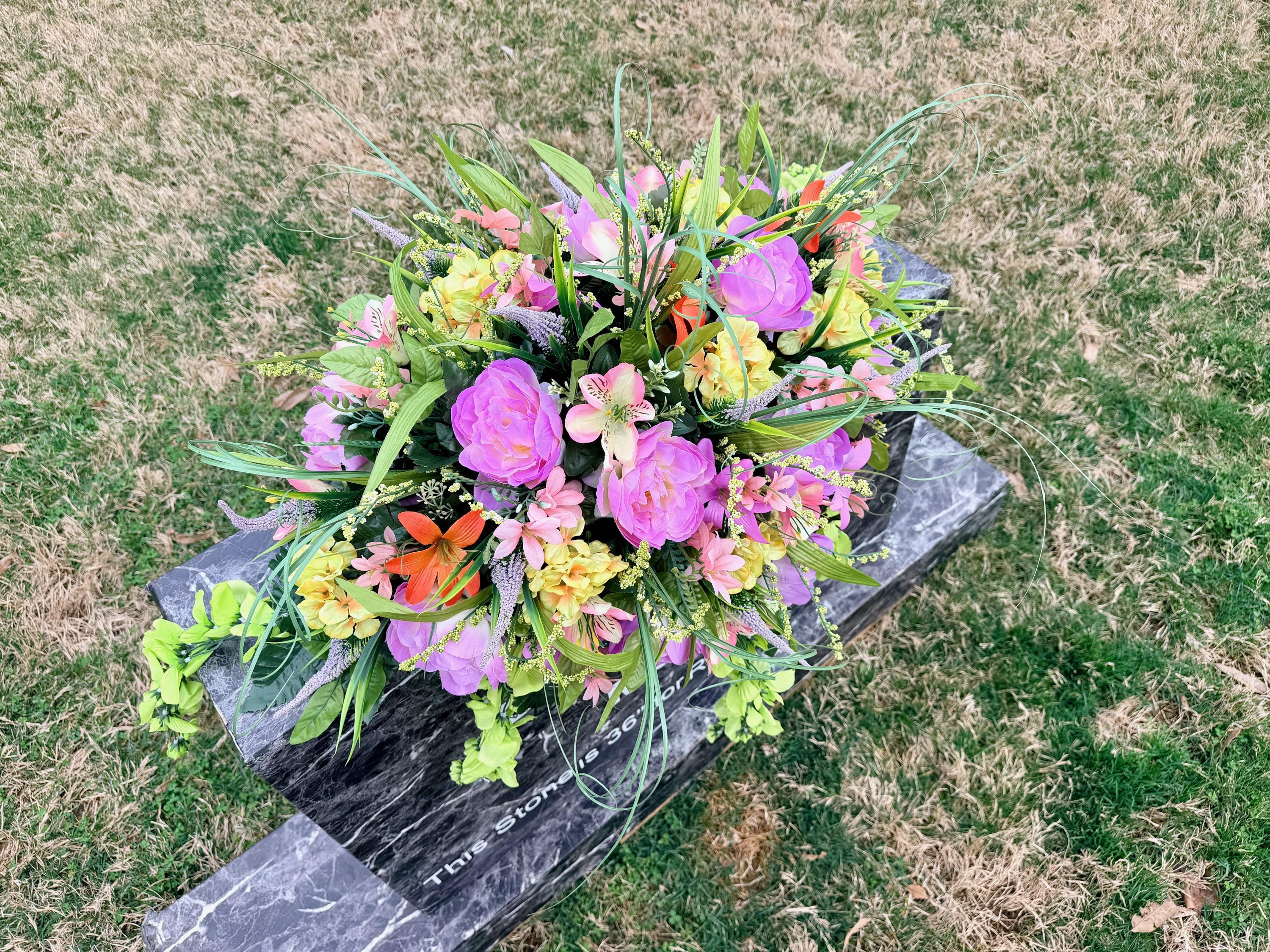Beautiful Pastels, Pink, Orange, Purple and Blue Cemetery Saddle, Grave Decorations Silk Memorial Flowers
