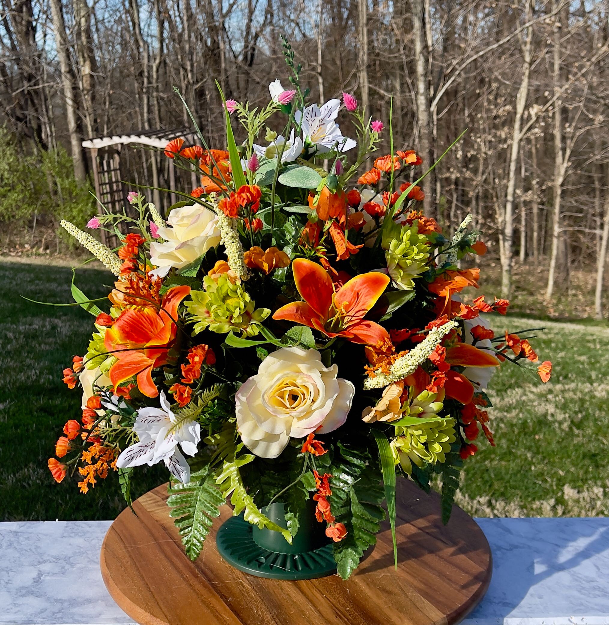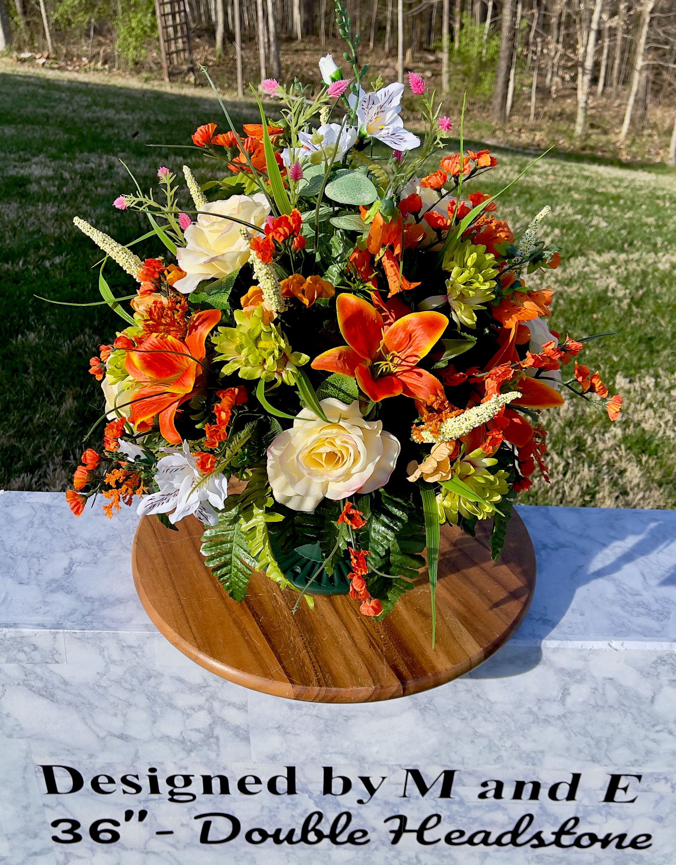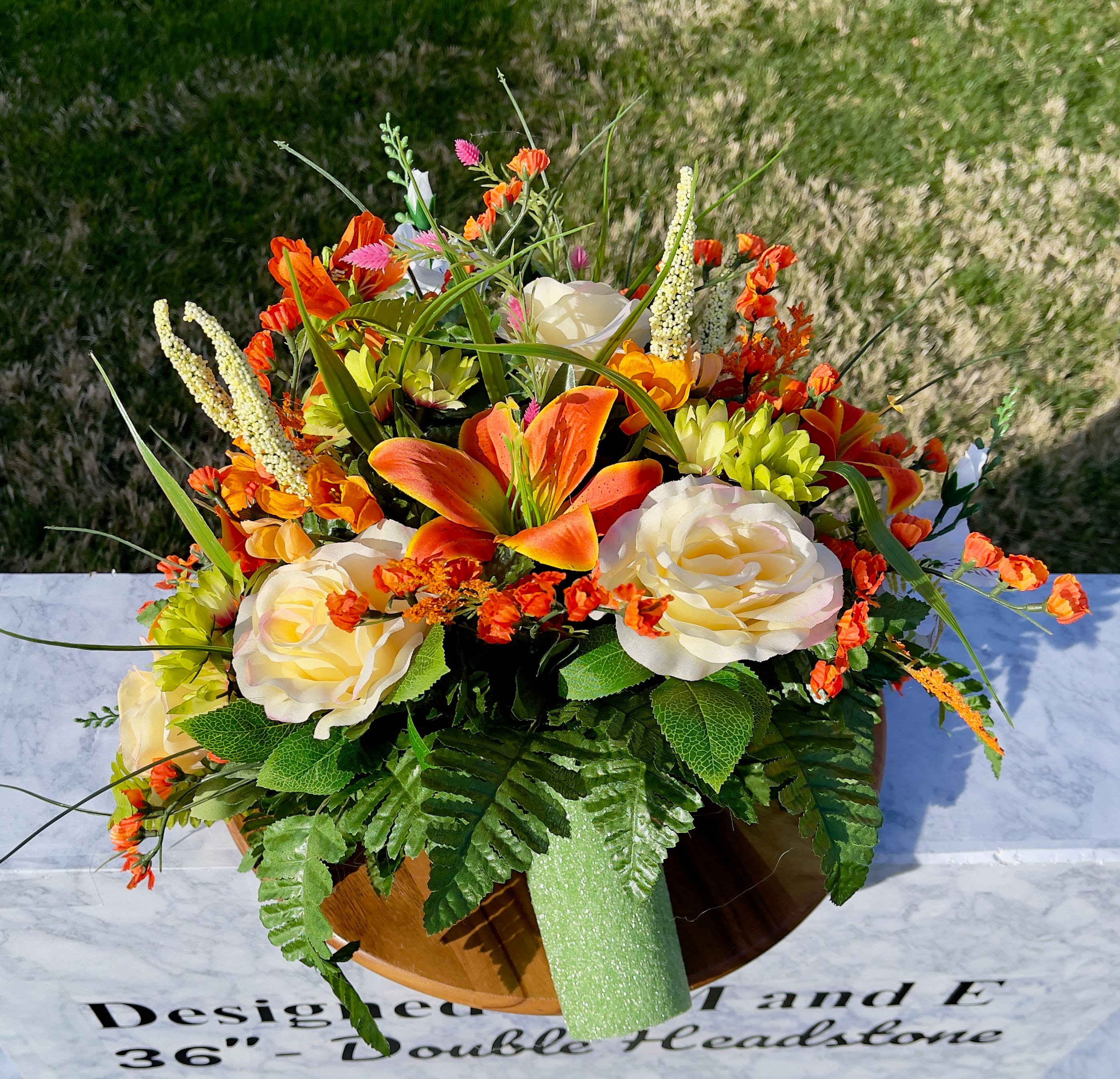We’re a small, family-operated business consisting of myself, my husband, and my daughter. We personally manage every order and strive for excellent customer service. All our arrangements use high-quality silk flowers, though all silk blooms may fade over time. Each stem is glued into foam to withstand the elements. Designed by M&E uses only premium silks, and we put genuine care into every piece we create. Rest assured, the arrangement shown in our photos is exactly the one you’ll receive, as I design and assemble each one myself. If you’re searching for something unique or have a particular flower, color, or matching vases in mind, please contact me to discuss a custom order.