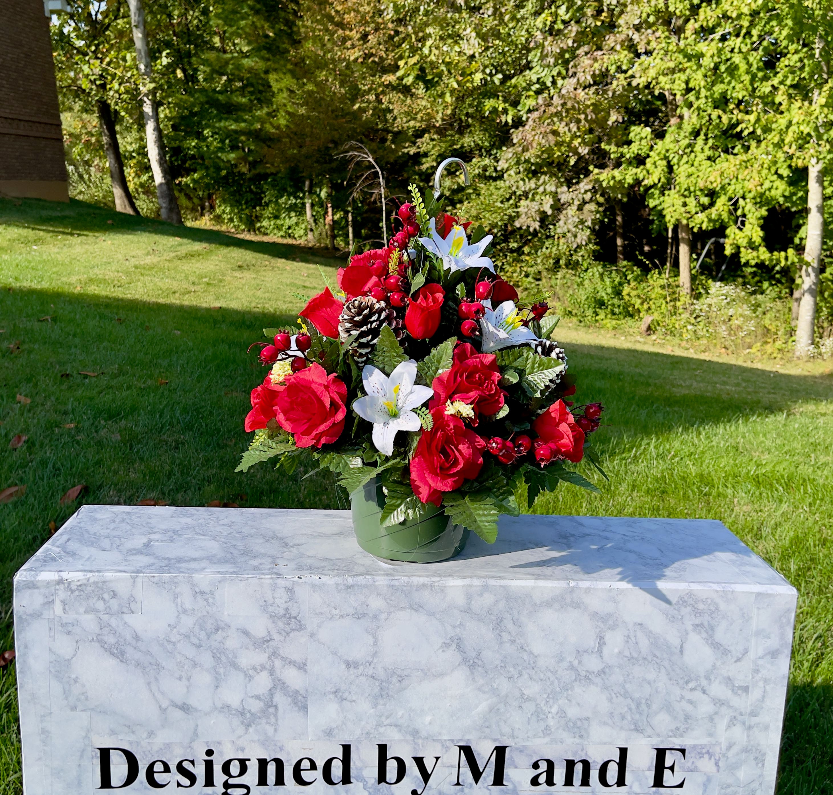 I put my love in every piece I build and do all I can to make them last. Every flower stem in glued into the foam to ensure they hold up to the elements. Designed by M&E sources only high-quality silk flowers for all my arrangements. All flowers will fade in time however, a good quality silk will ensure you get months of enjoyment.