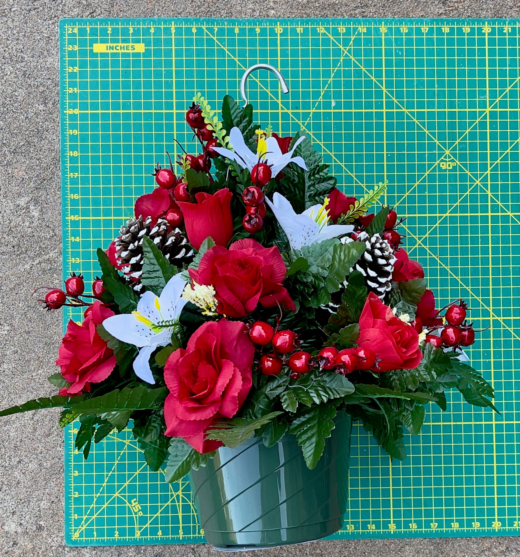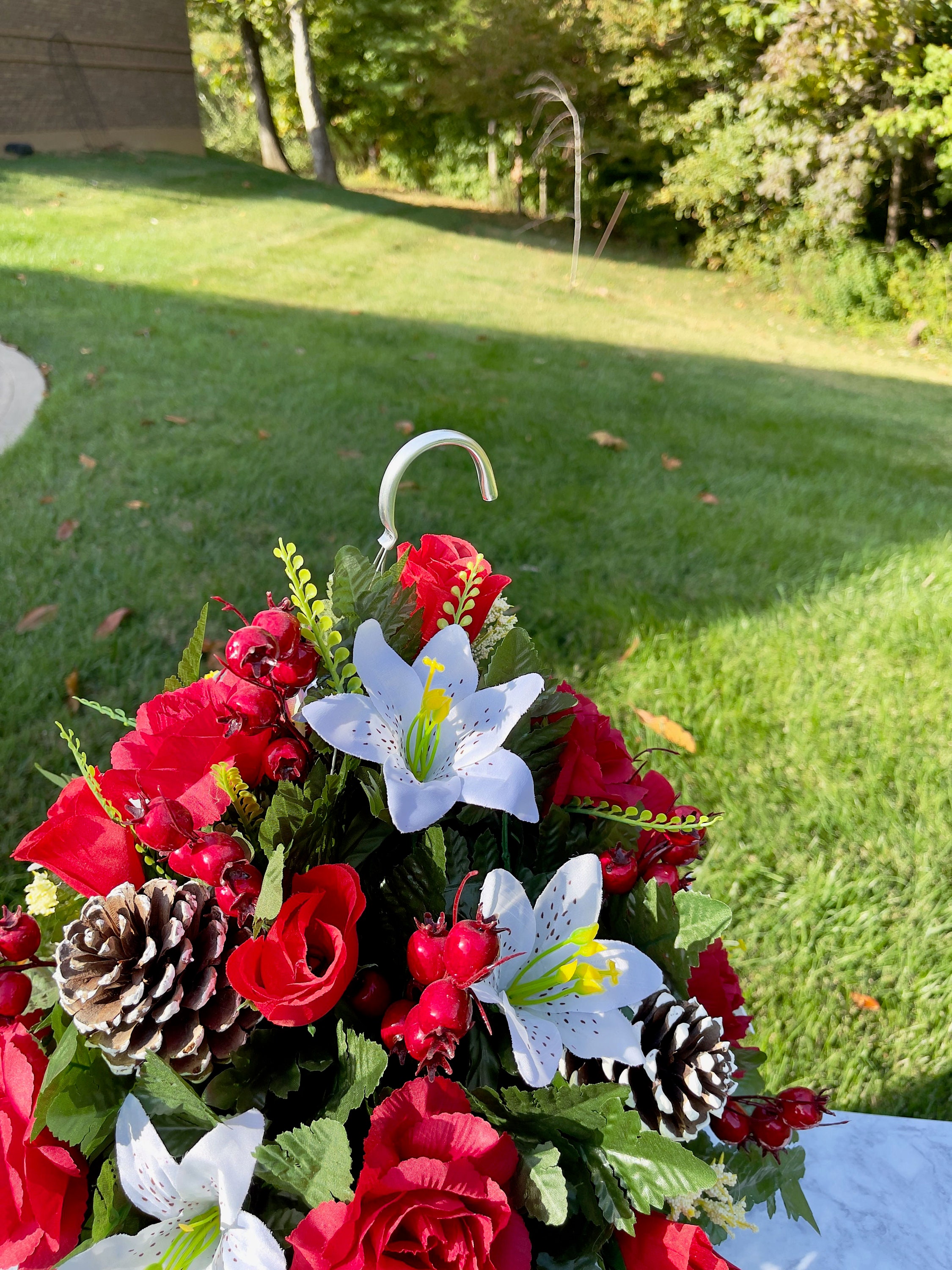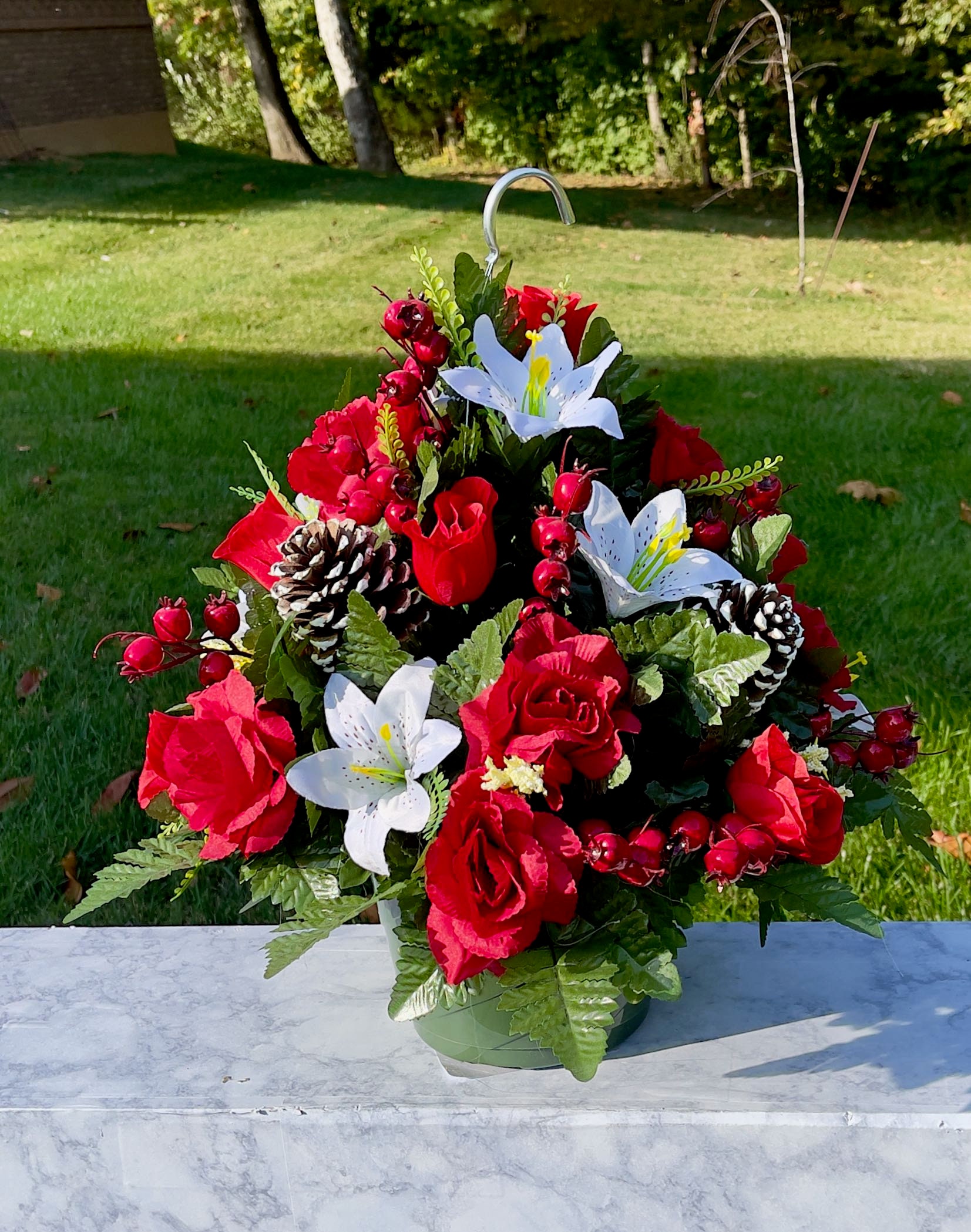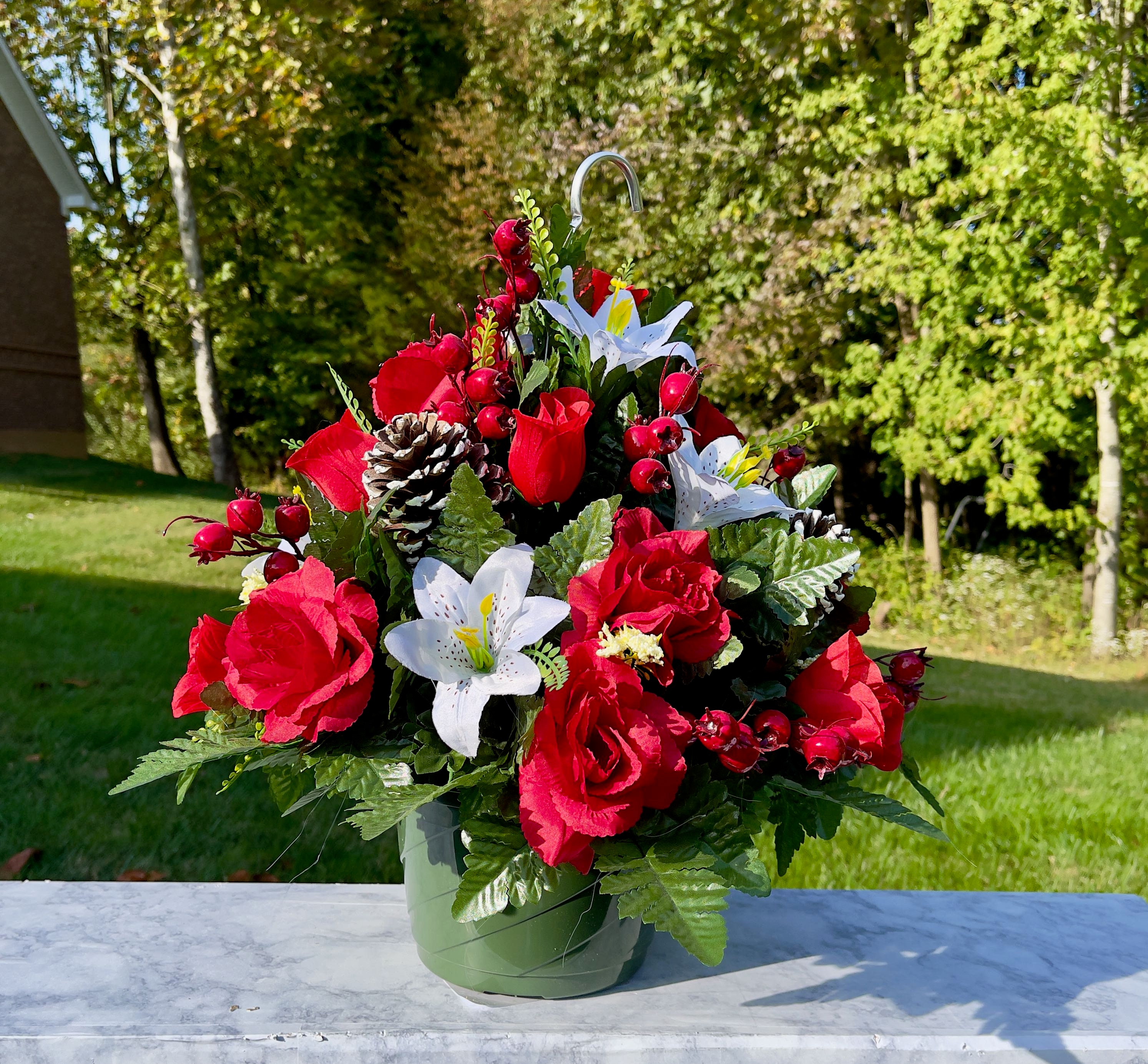 Red-White Christmas Hanging Basket, Cemetery Hanging Basket, Memorial Flower, Grave Decoration, Hanging Cemetery Arrangement