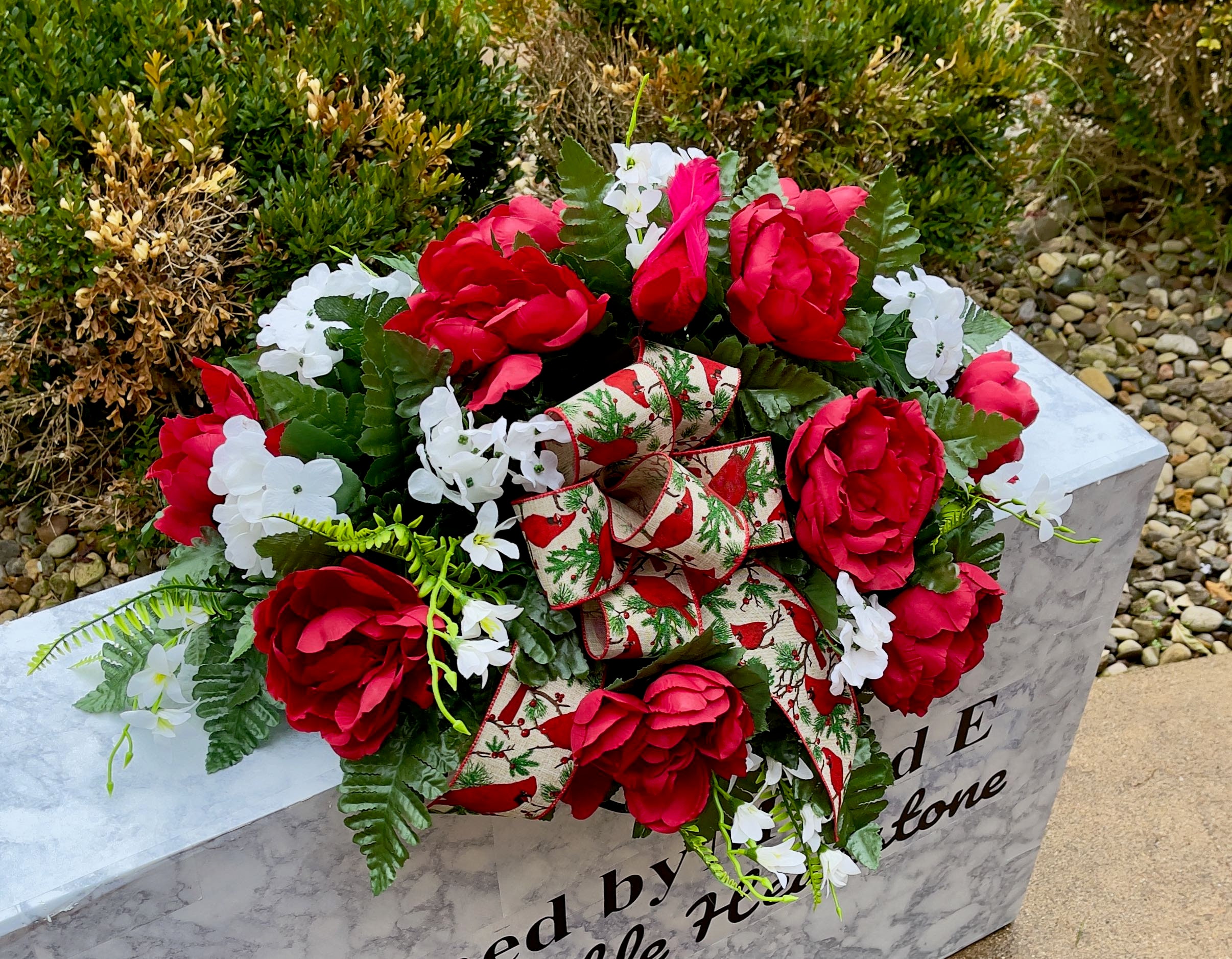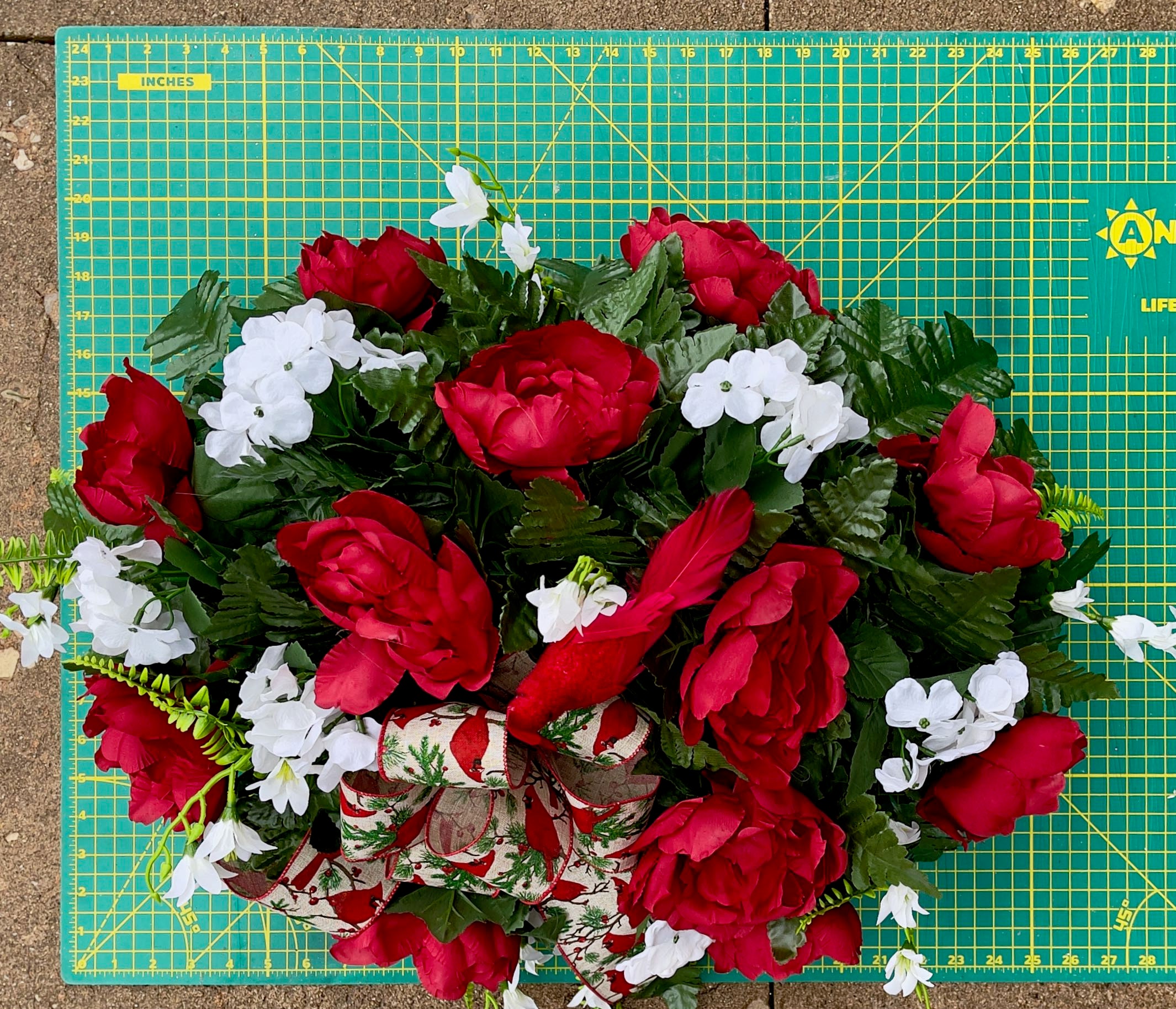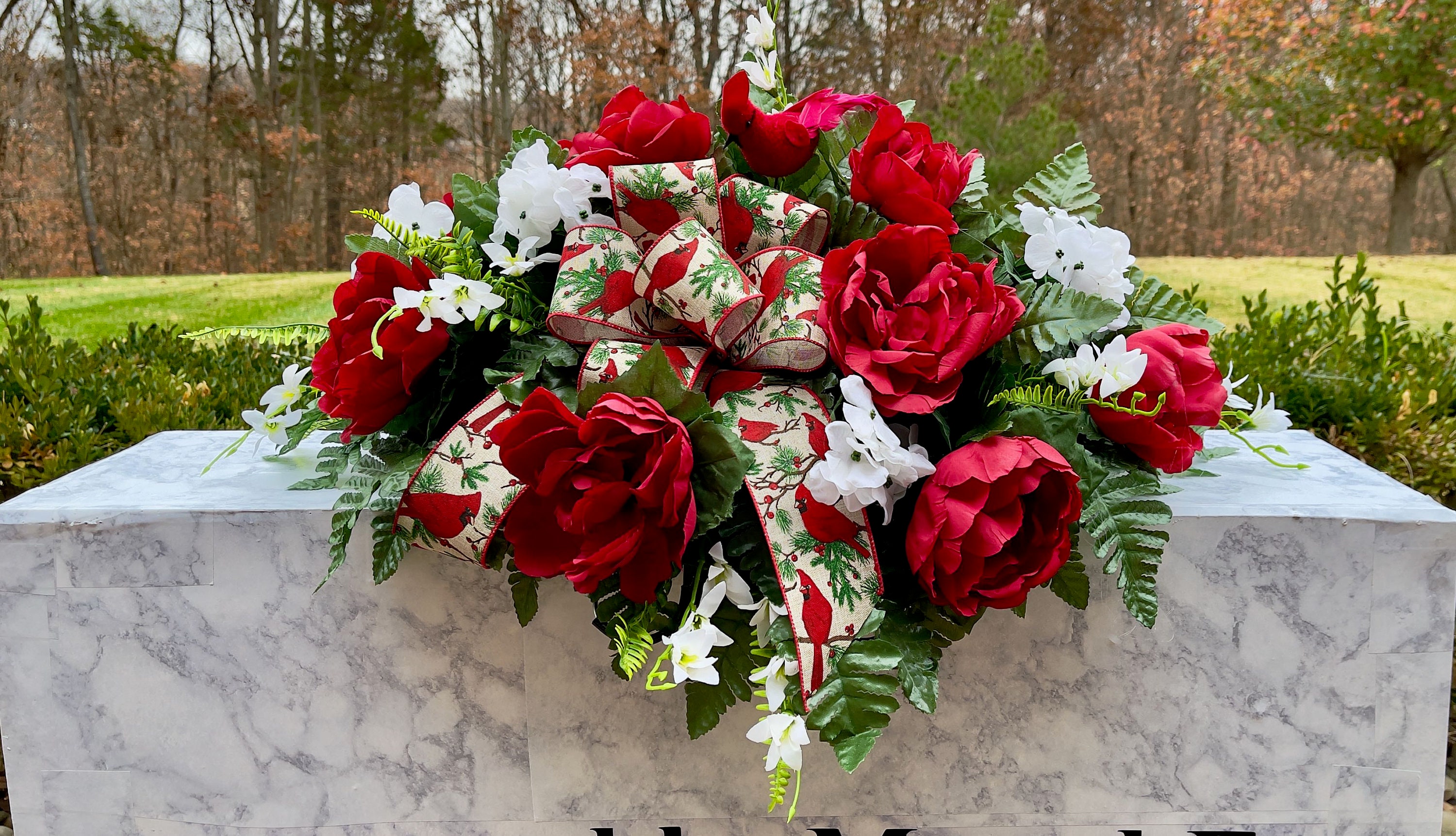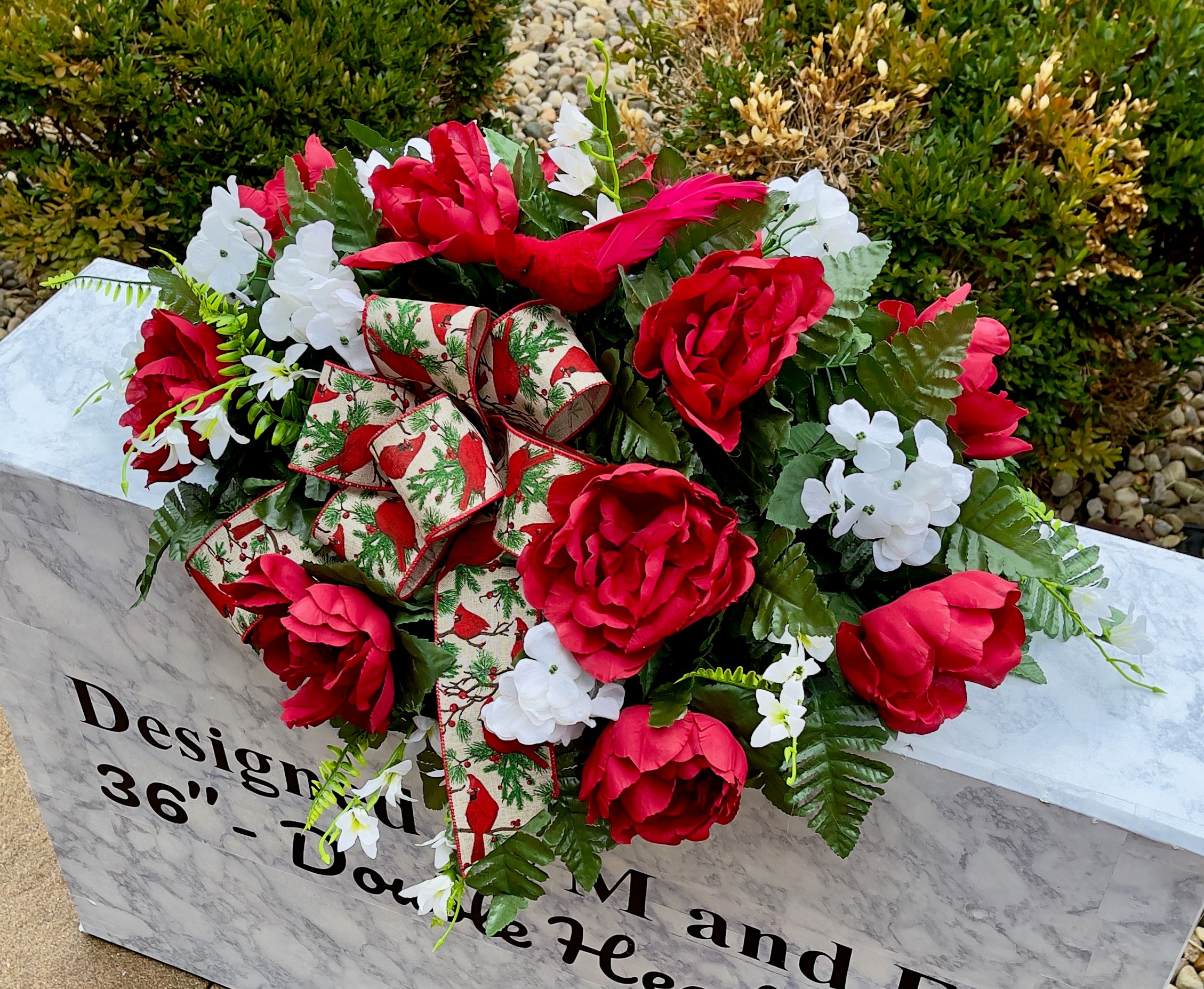 Cardinal Redbirds with Bow in Christmas Cemetery Saddle Christmas, Christmas Cemetery Flower, Christmas Headstone Saddle Arrangement