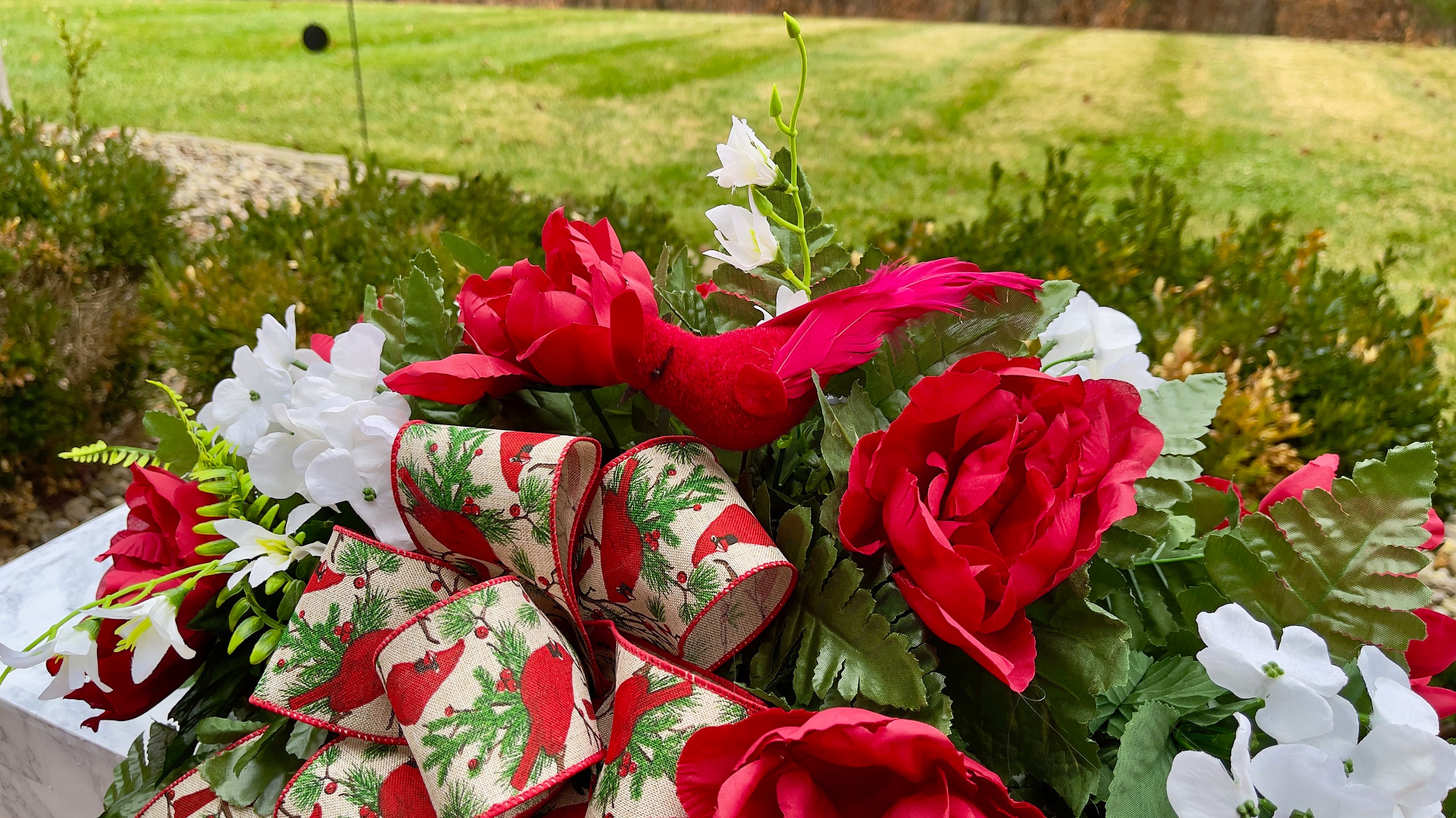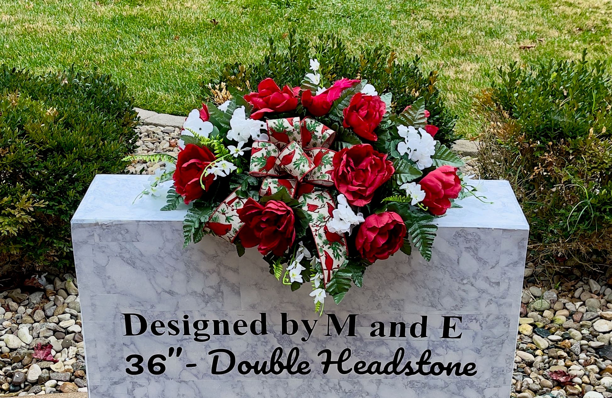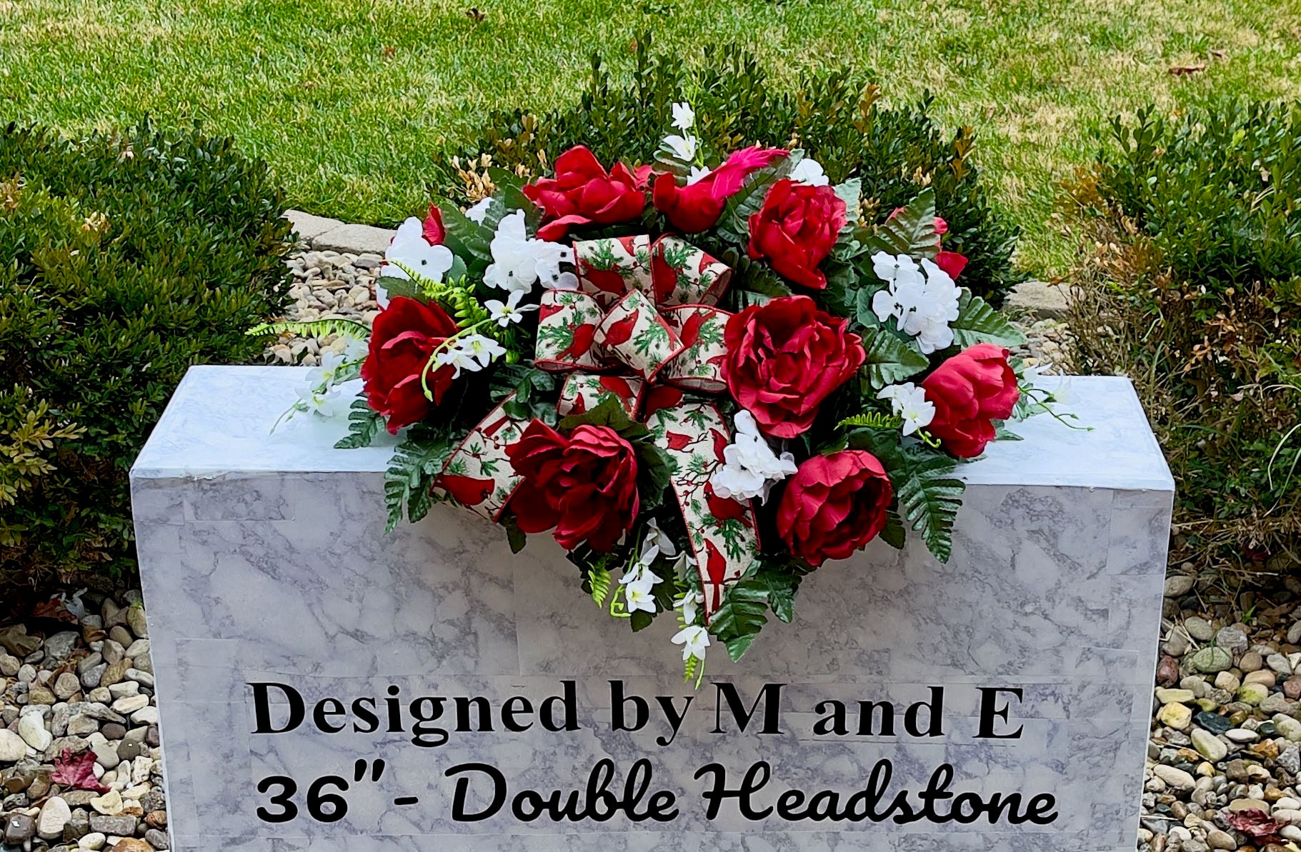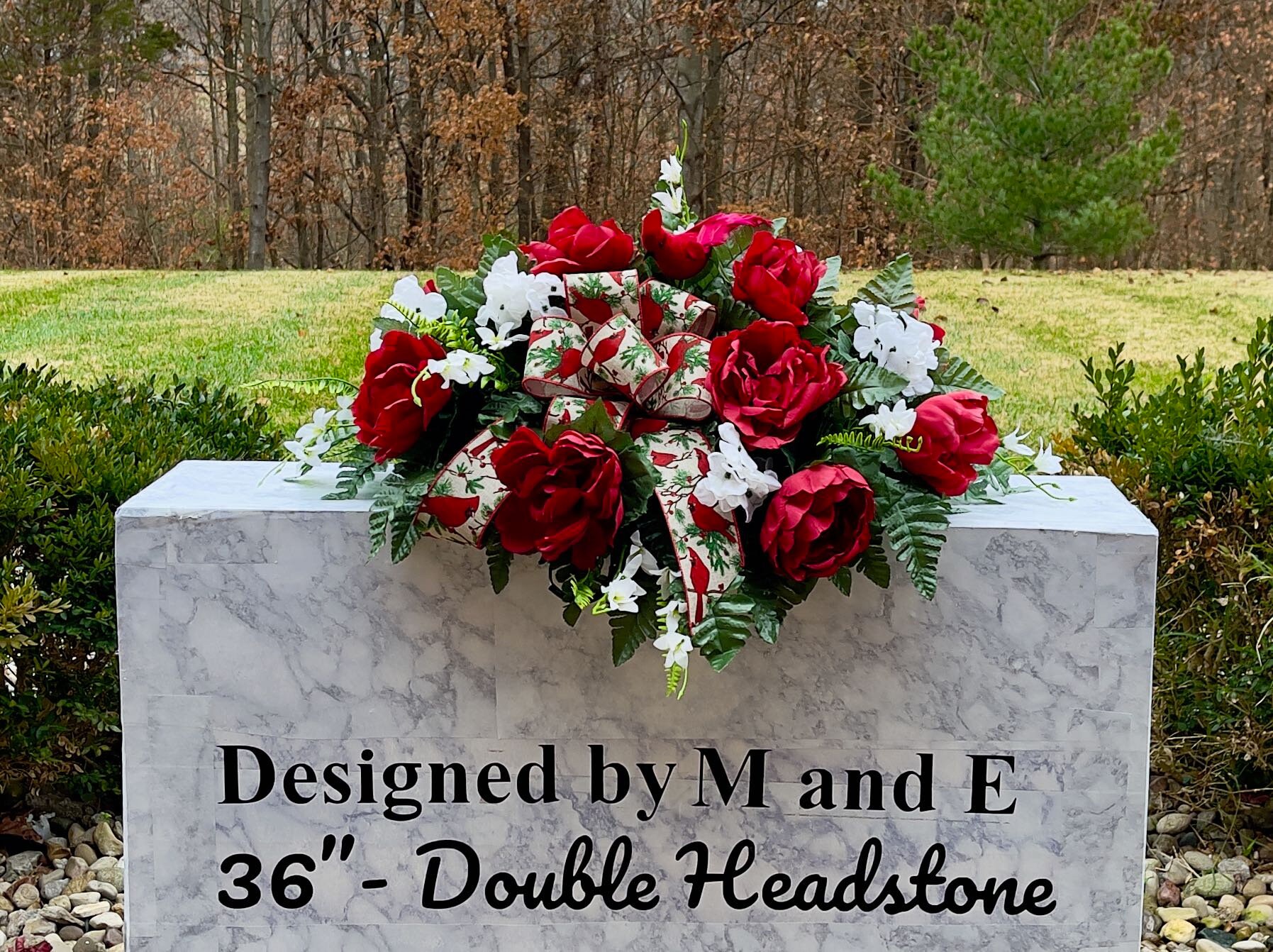 Cardinal Redbirds with Bow in Christmas Cemetery Saddle Christmas, Christmas Cemetery Flower, Christmas Headstone Saddle Arrangement