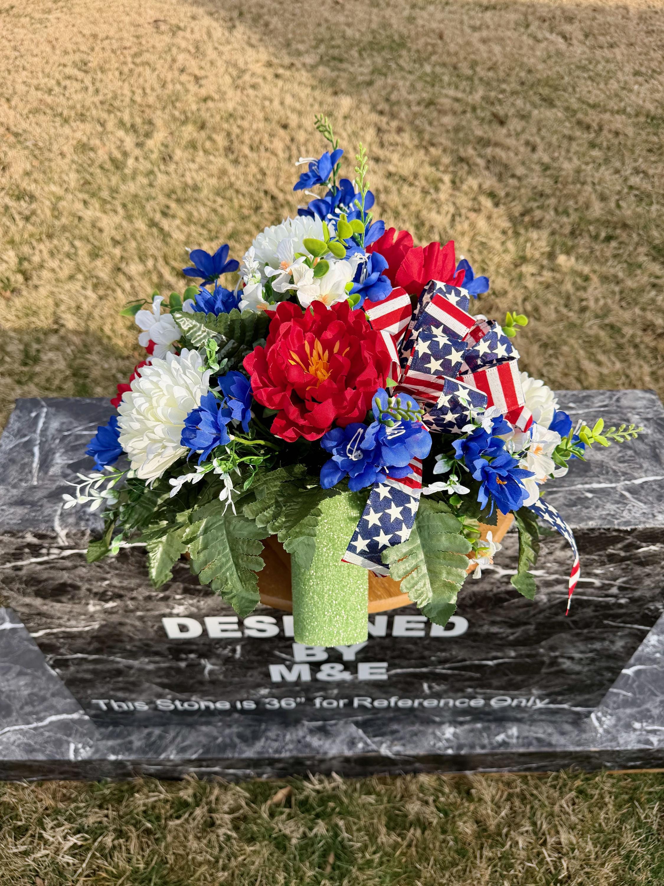 We’re a small, family-operated business consisting of myself, my husband, and my daughter. We personally manage every order and strive for excellent customer service. All our arrangements use high-quality silk flowers, though all silk blooms may fade over time. Each stem is glued into foam to withstand the elements. Designed by M&E uses only premium silks, and we put genuine care into every piece we create. Rest assured, the arrangement shown in our photos is exactly the one you’ll receive, as I design and assemble each one myself. If you’re searching for something unique or have a particular flower, color, or matching vases in mind, please contact me to discuss a custom order.