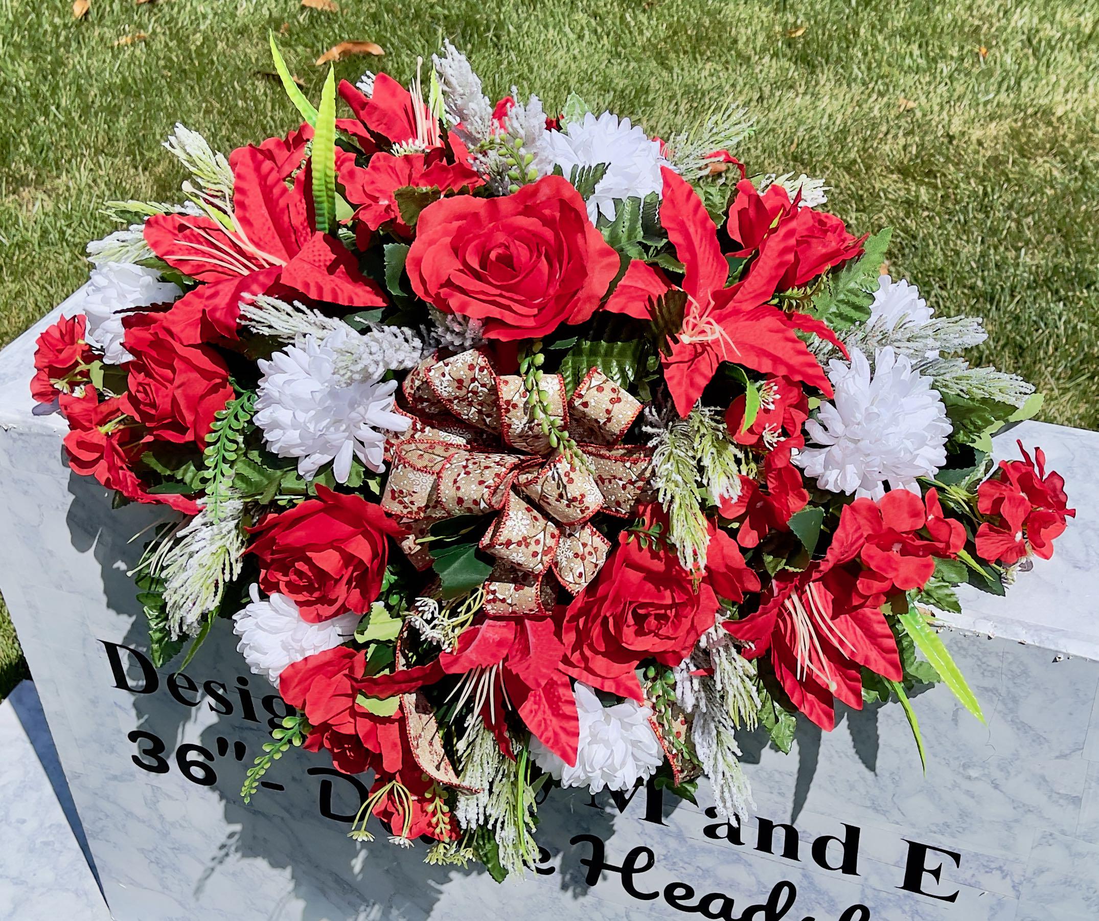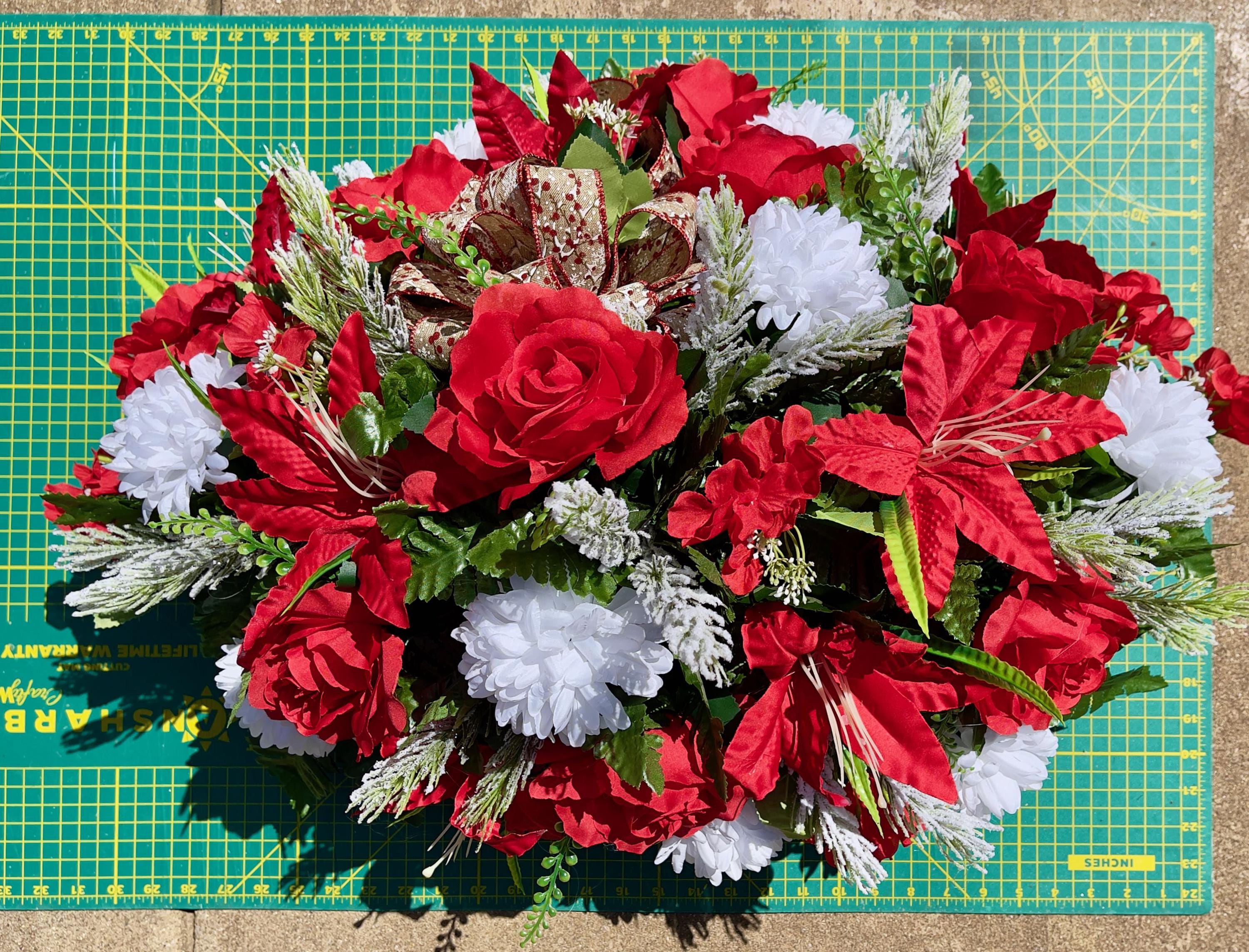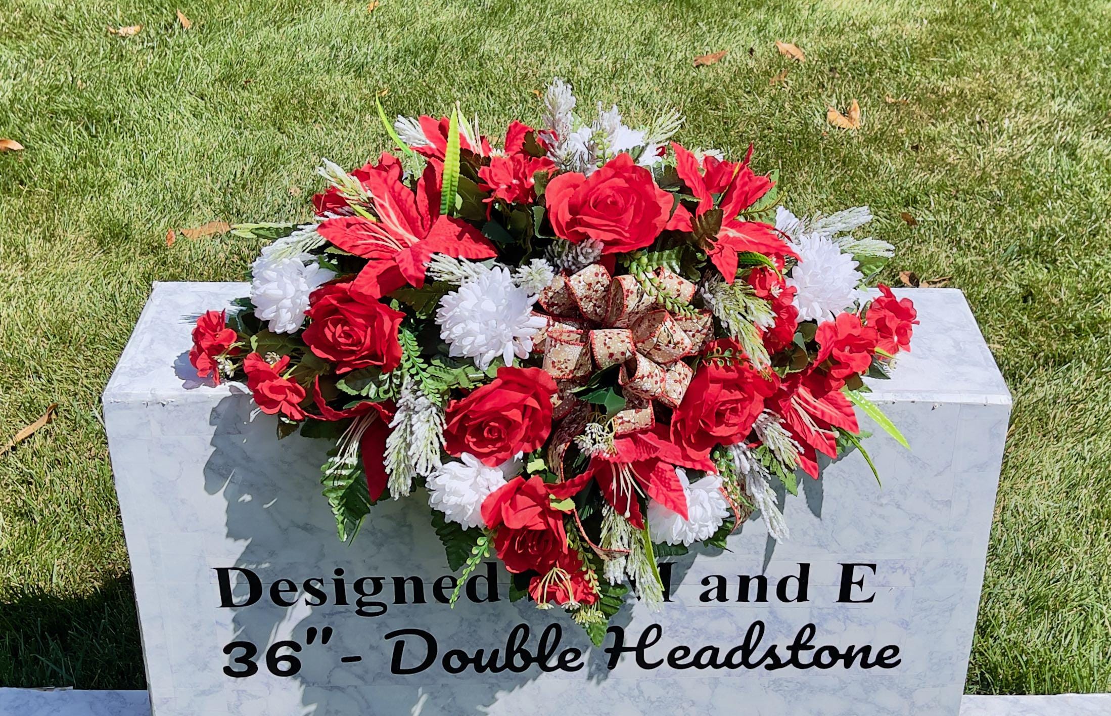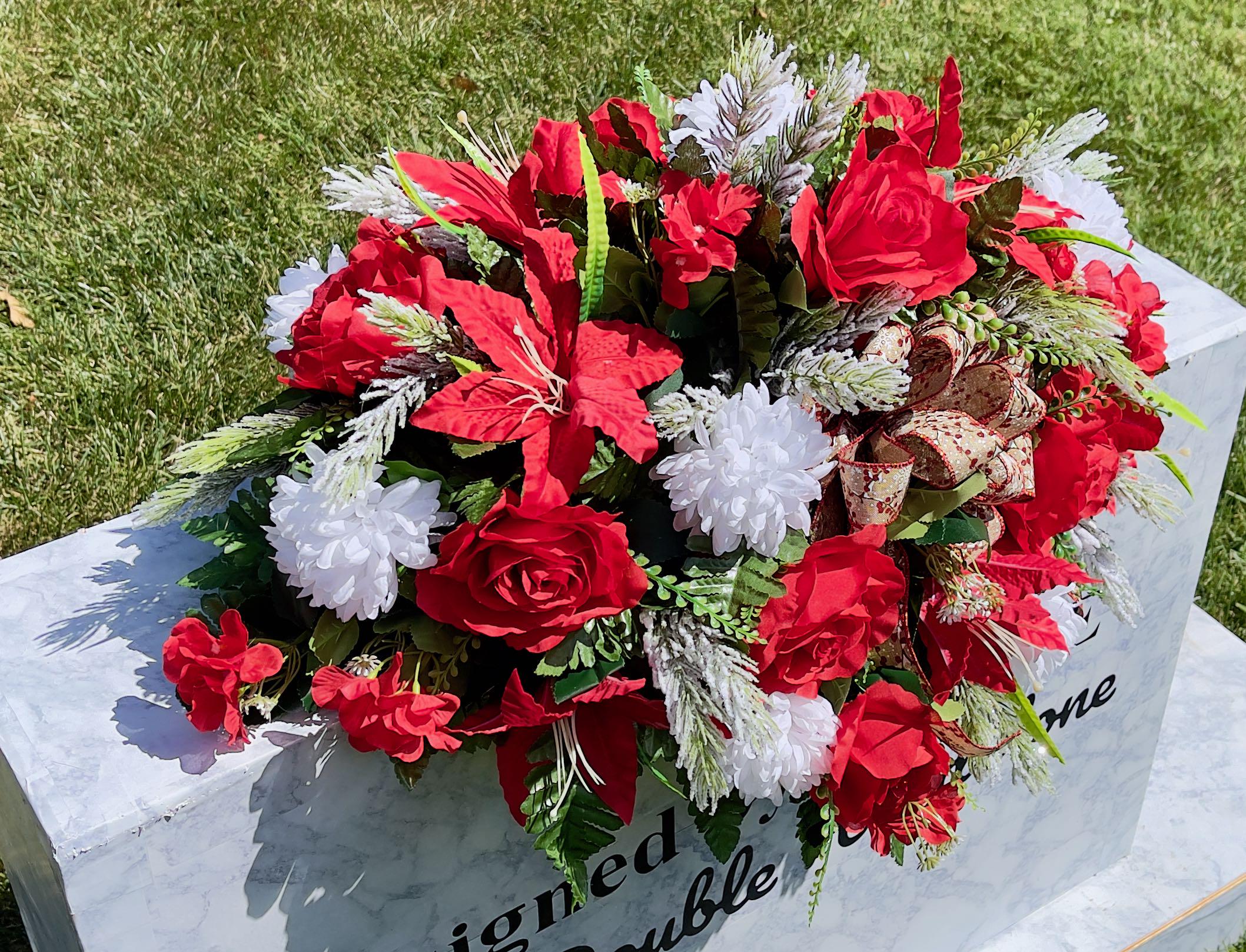 Beautiful Red-White Winter Cemetery Saddle, Christmas Grave, Christmas Cemetery Flowers, Christmas Headstone Arrangement, Memorial Flowers