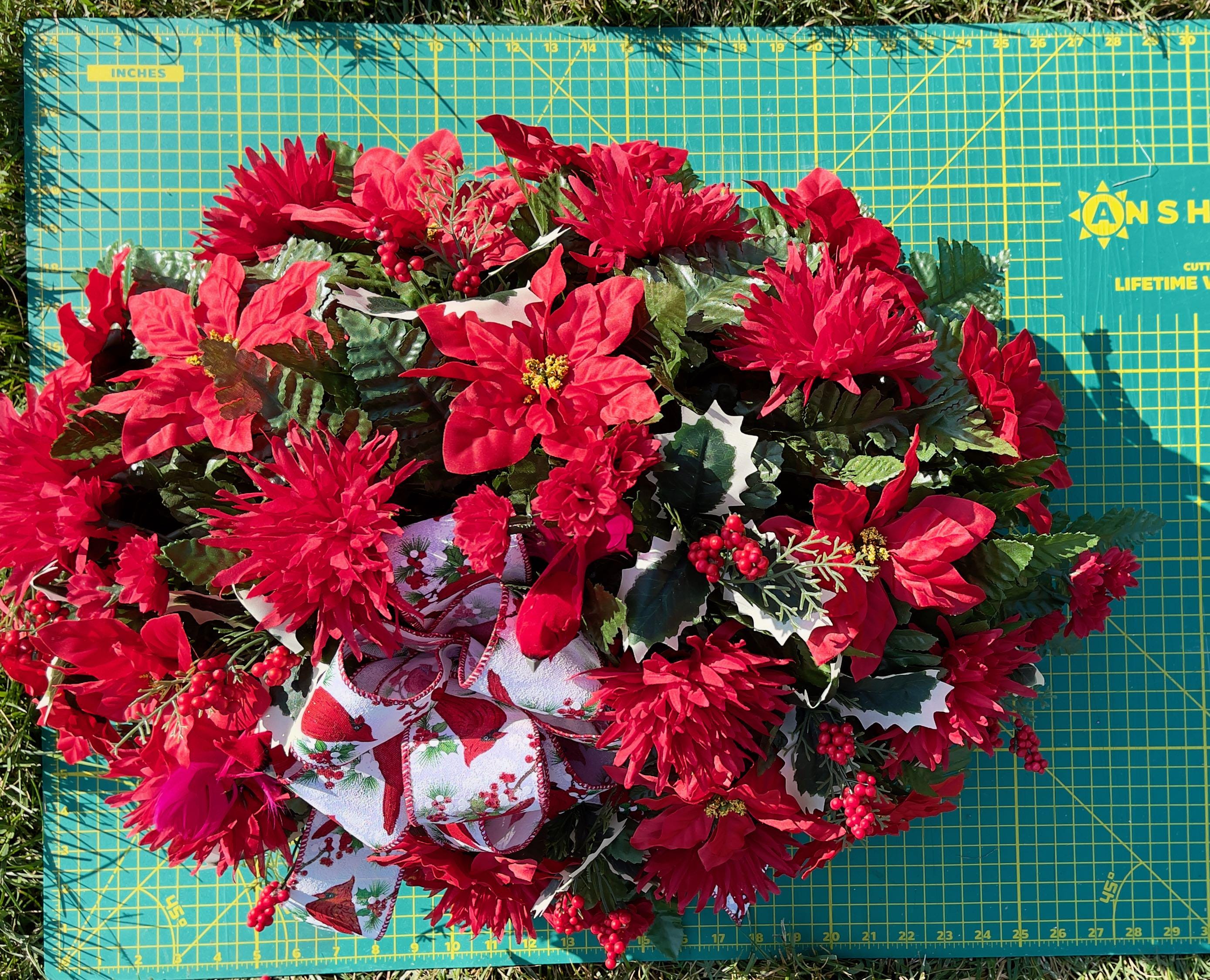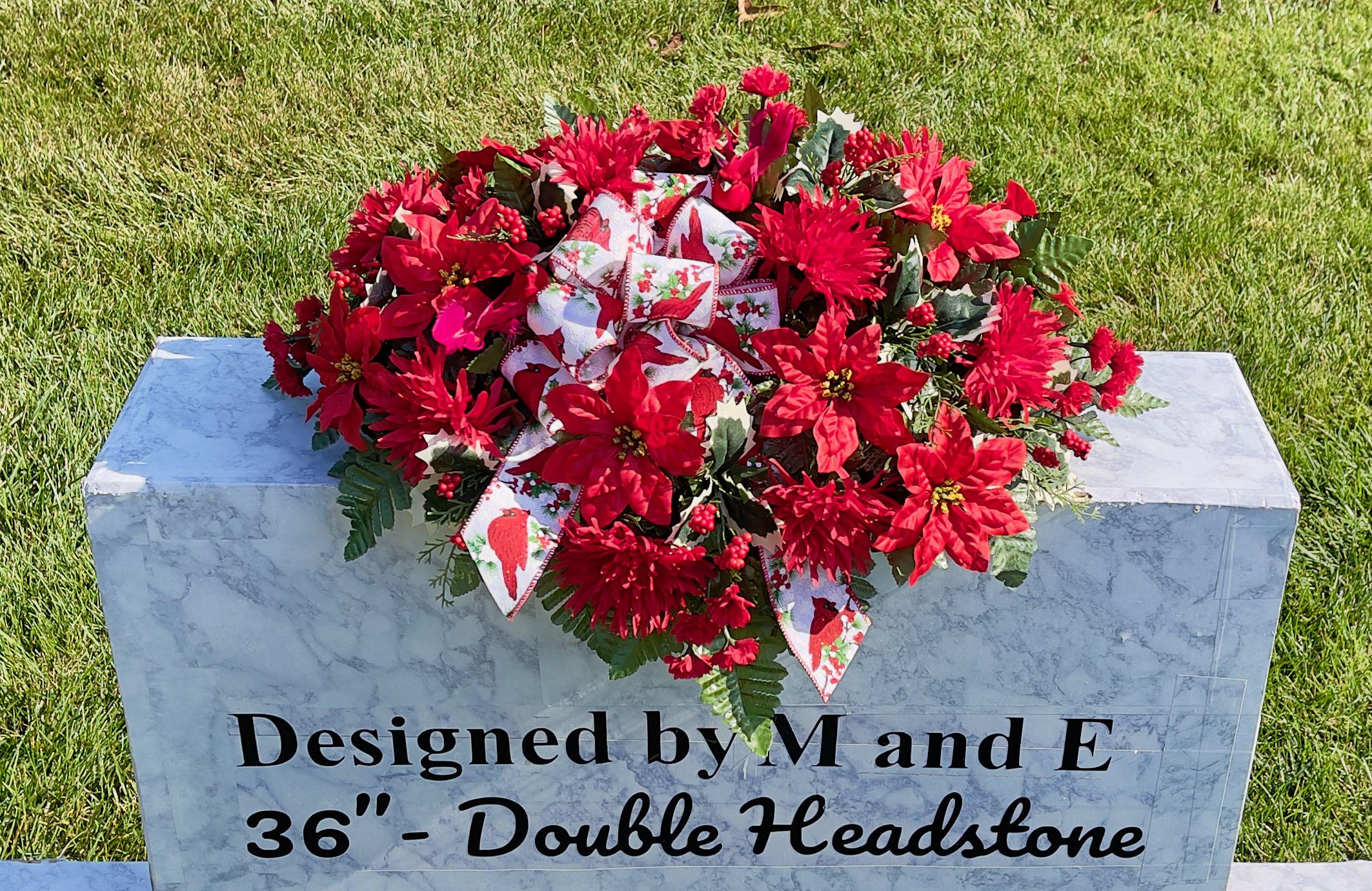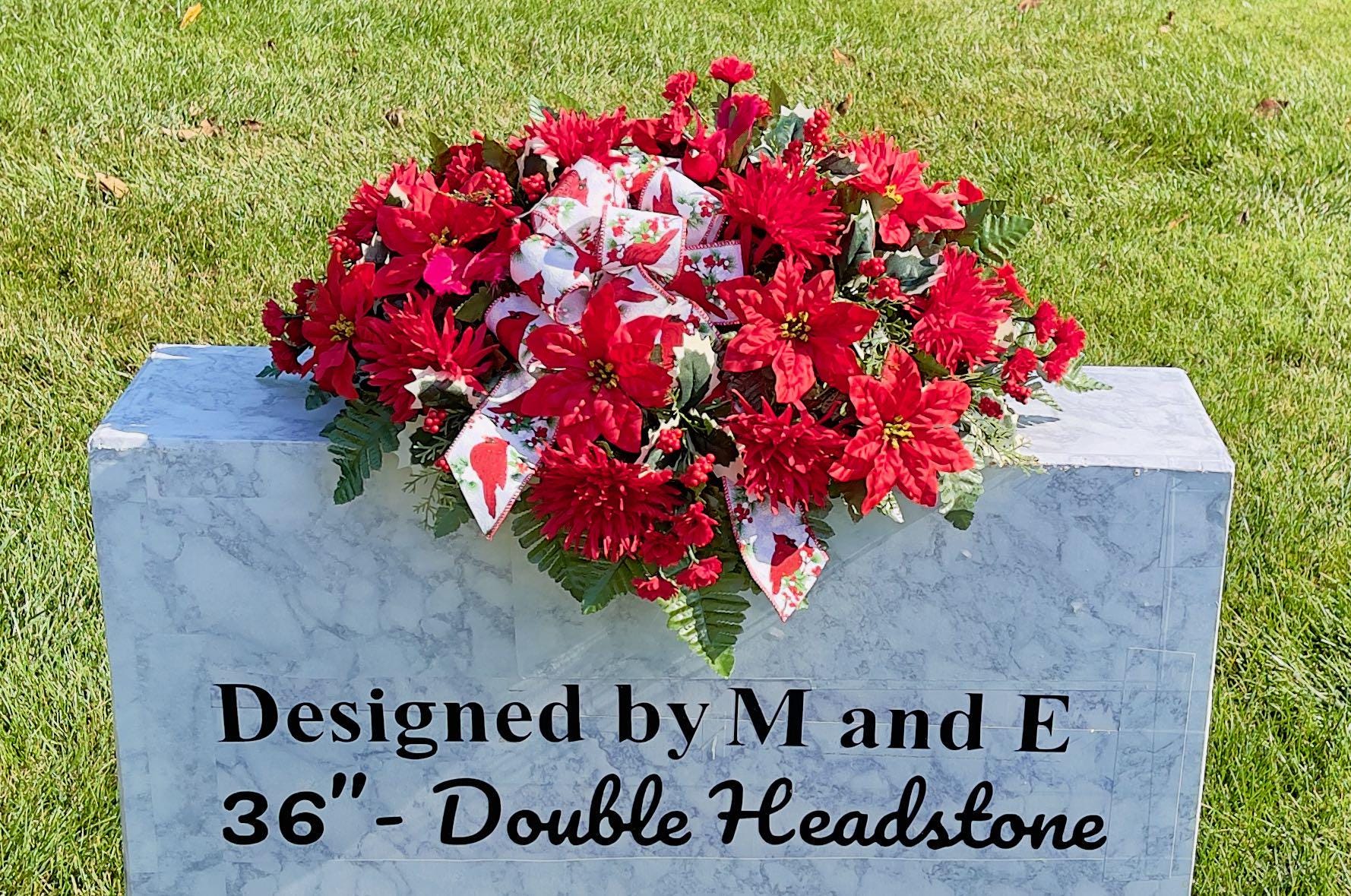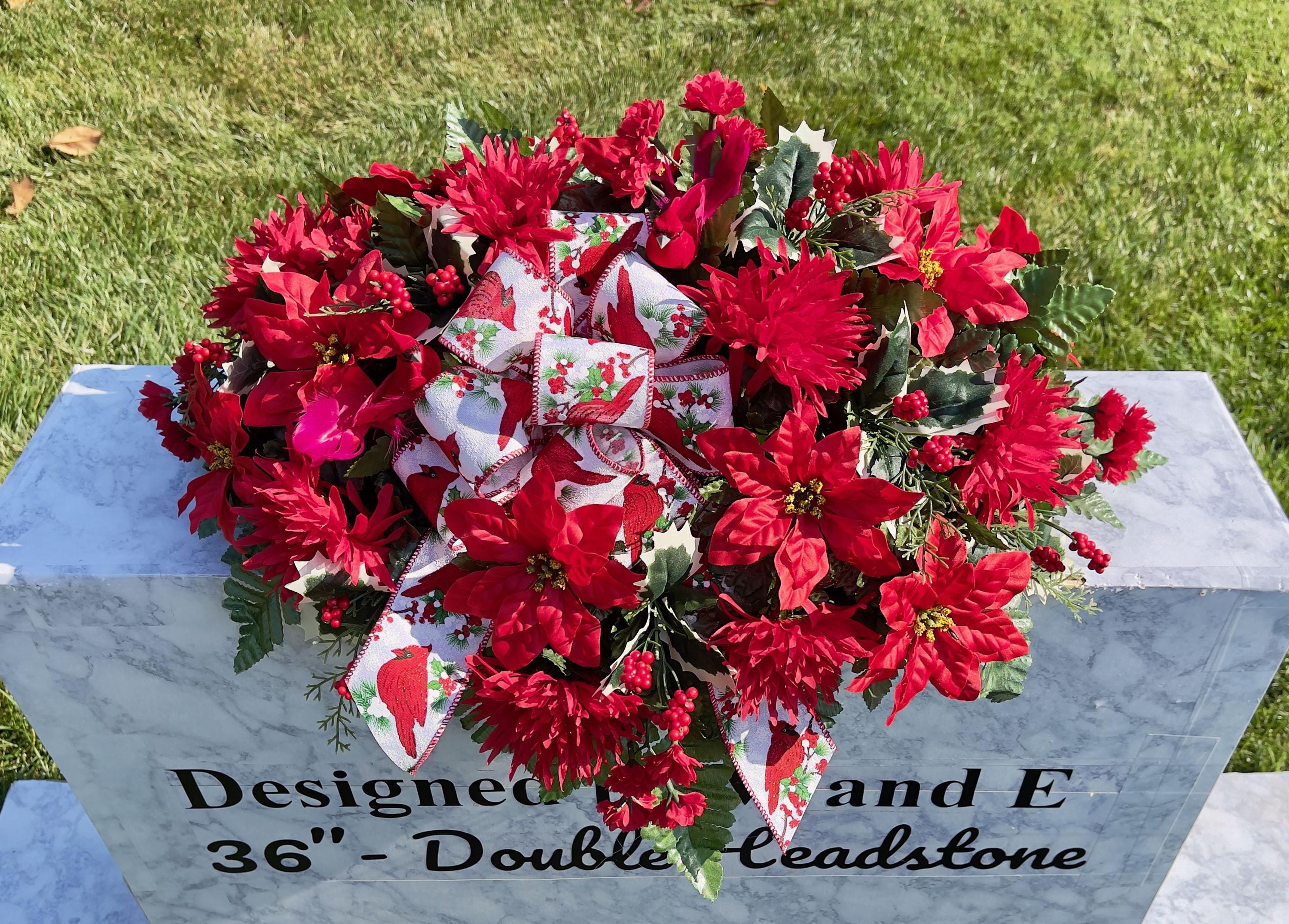 Redbirds with Cardinal Bow Cemetery Saddle, Christmas Grave, Christmas Cemetery Flowers, Christmas Headstone Arrangement, Memorial Flowers