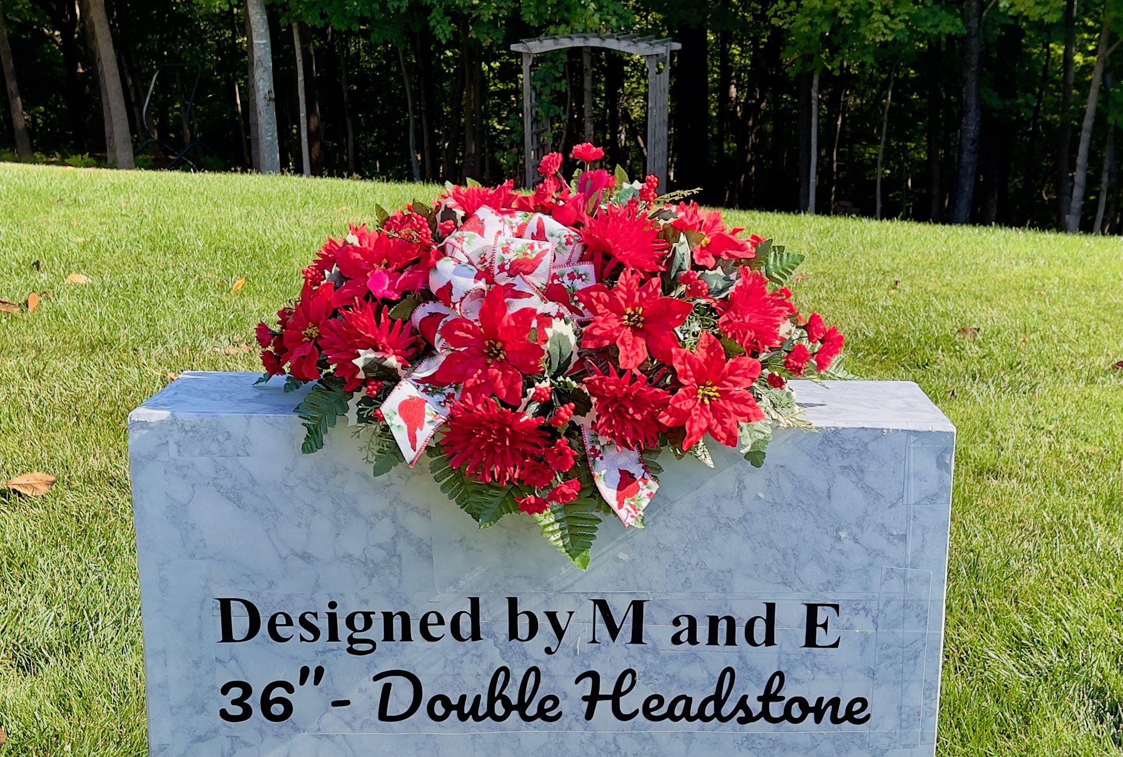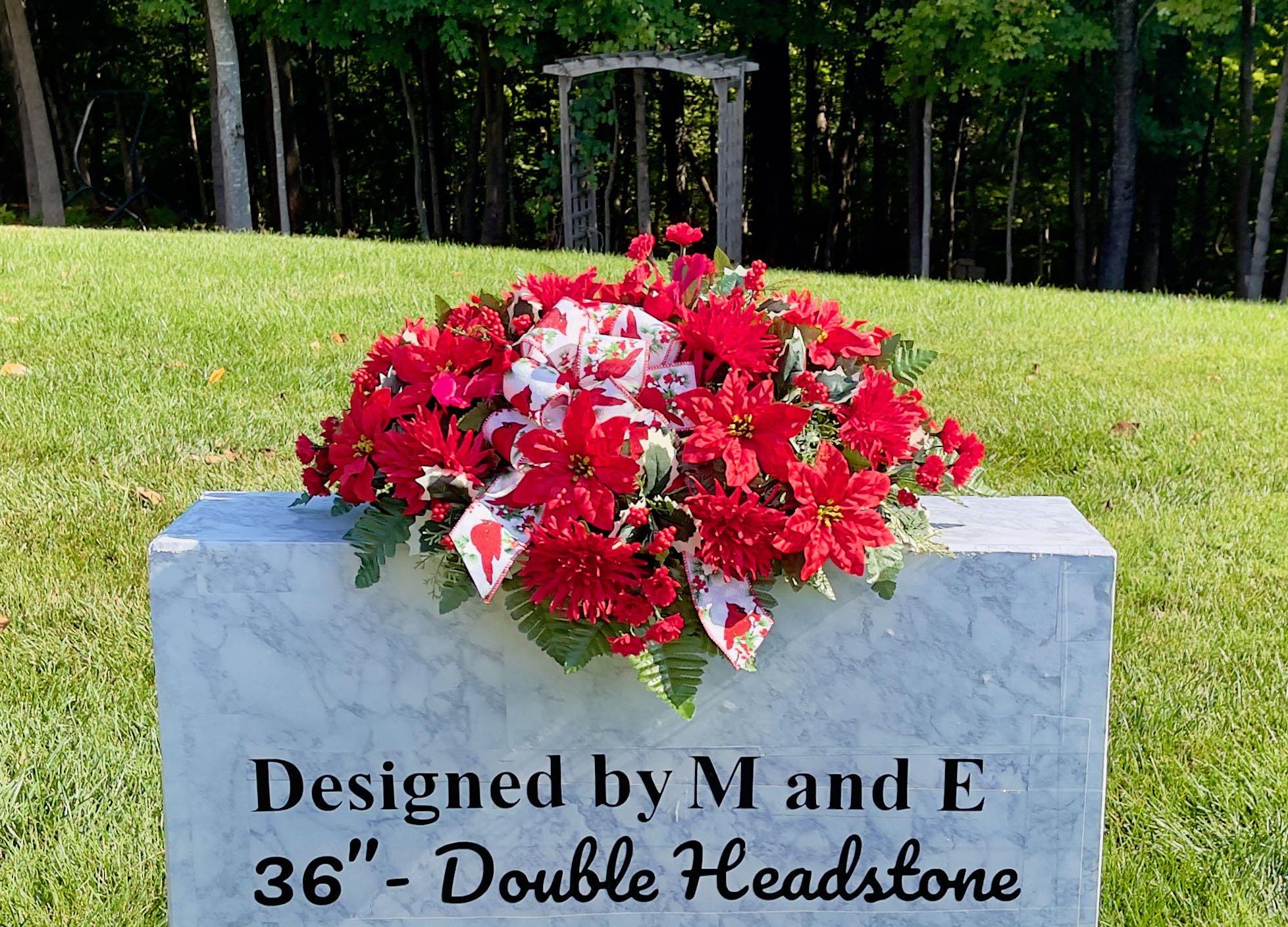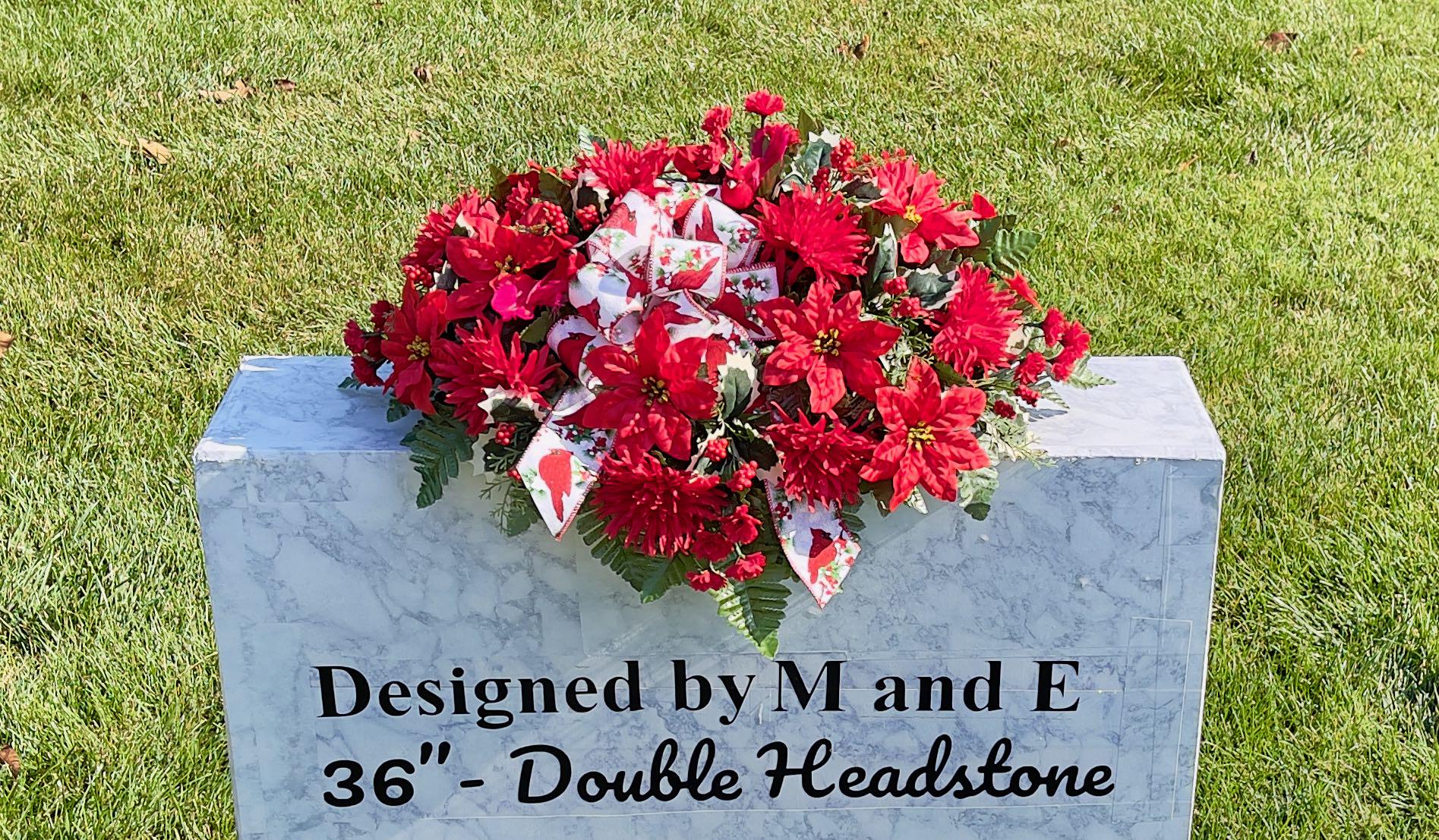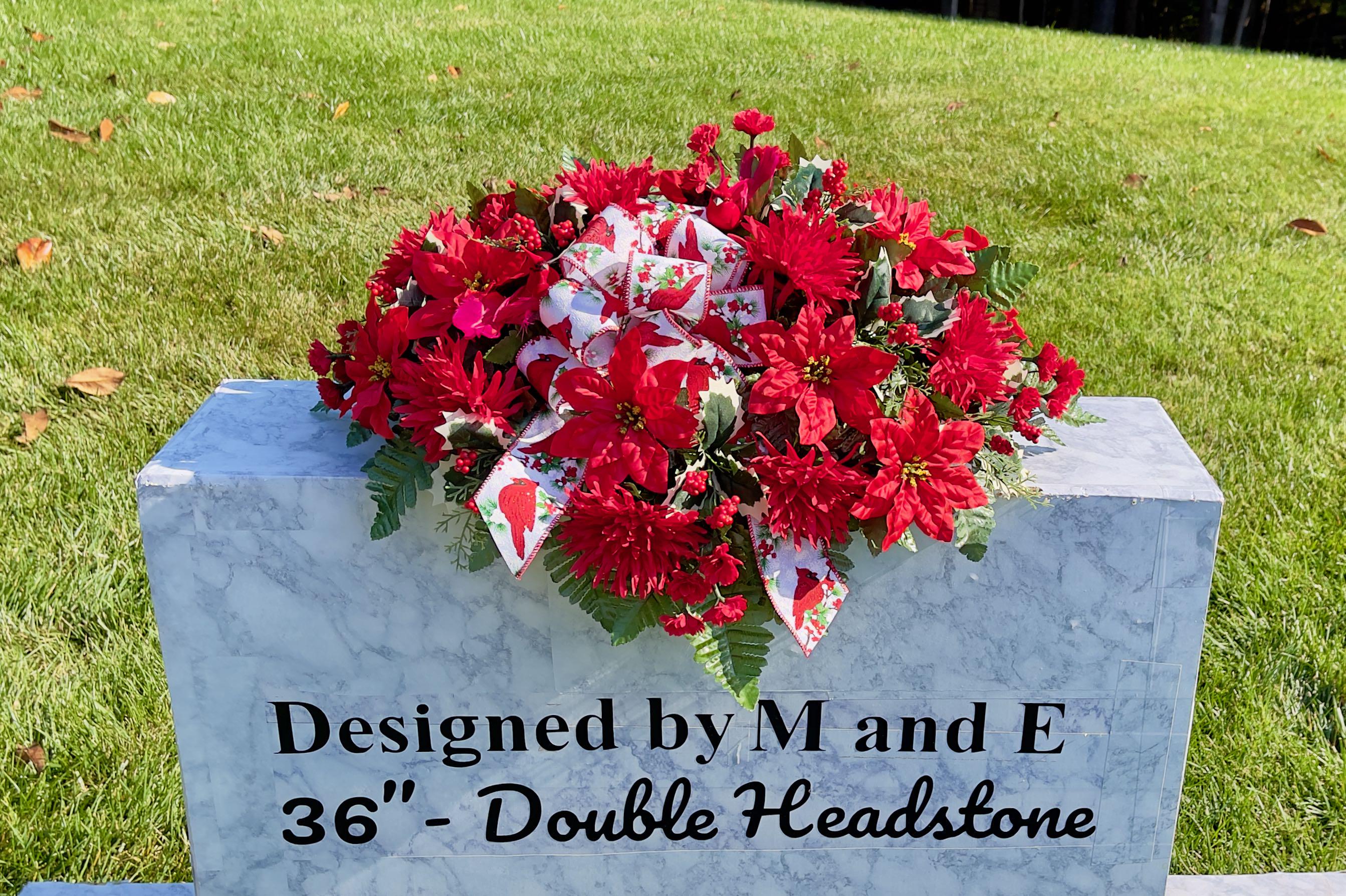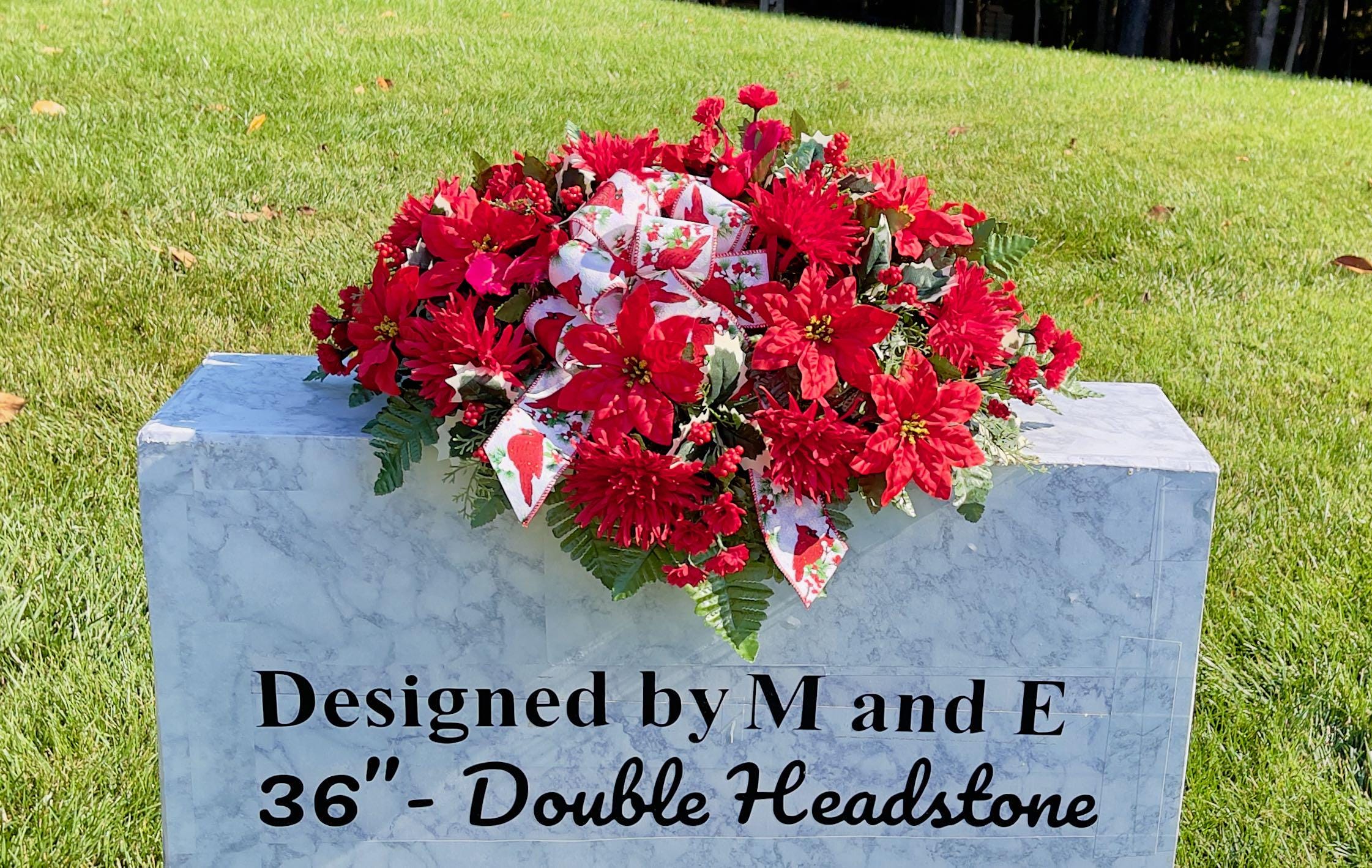 Redbirds with Cardinal Bow Cemetery Saddle, Christmas Grave, Christmas Cemetery Flowers, Christmas Headstone Arrangement, Memorial Flowers
