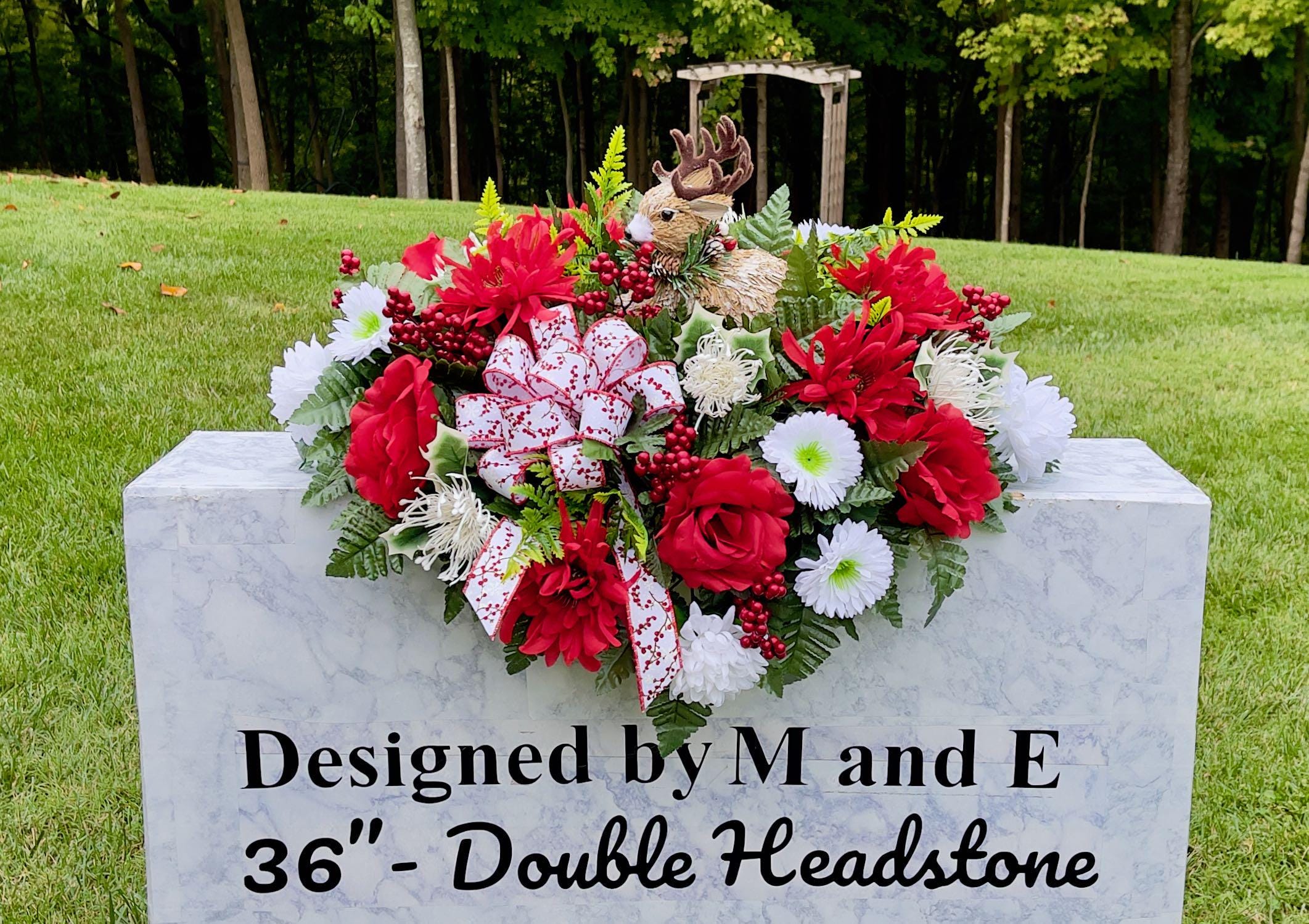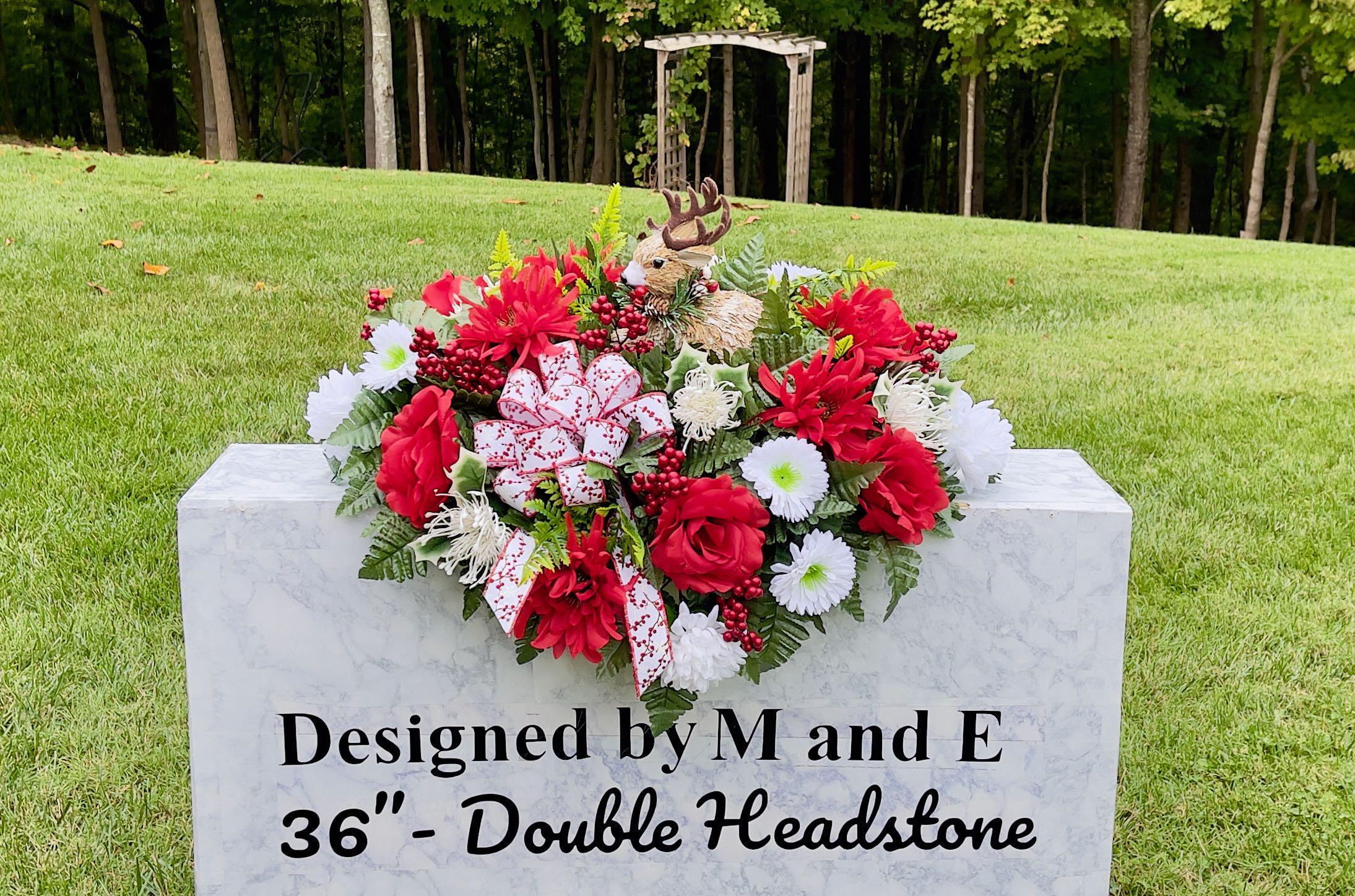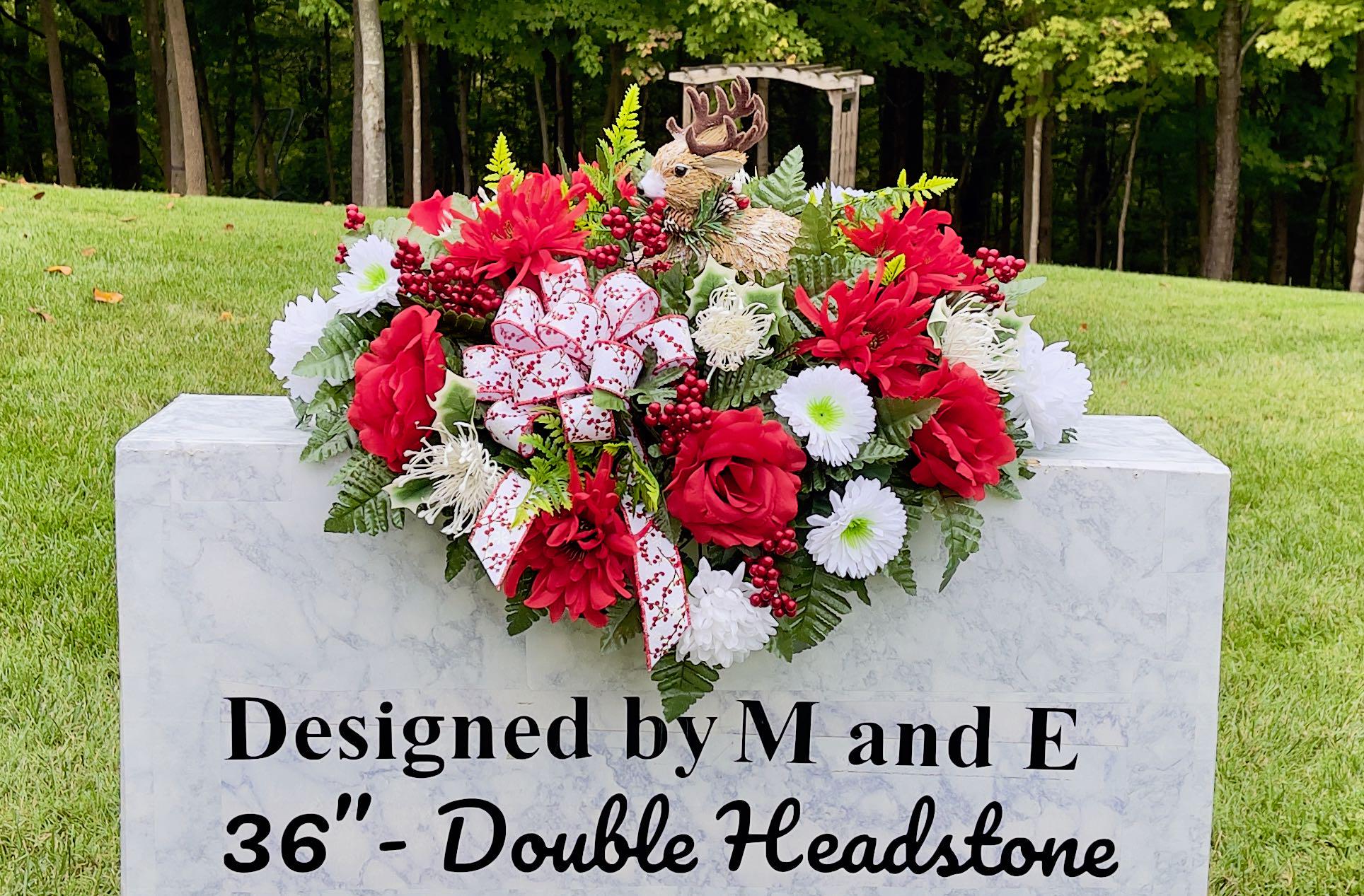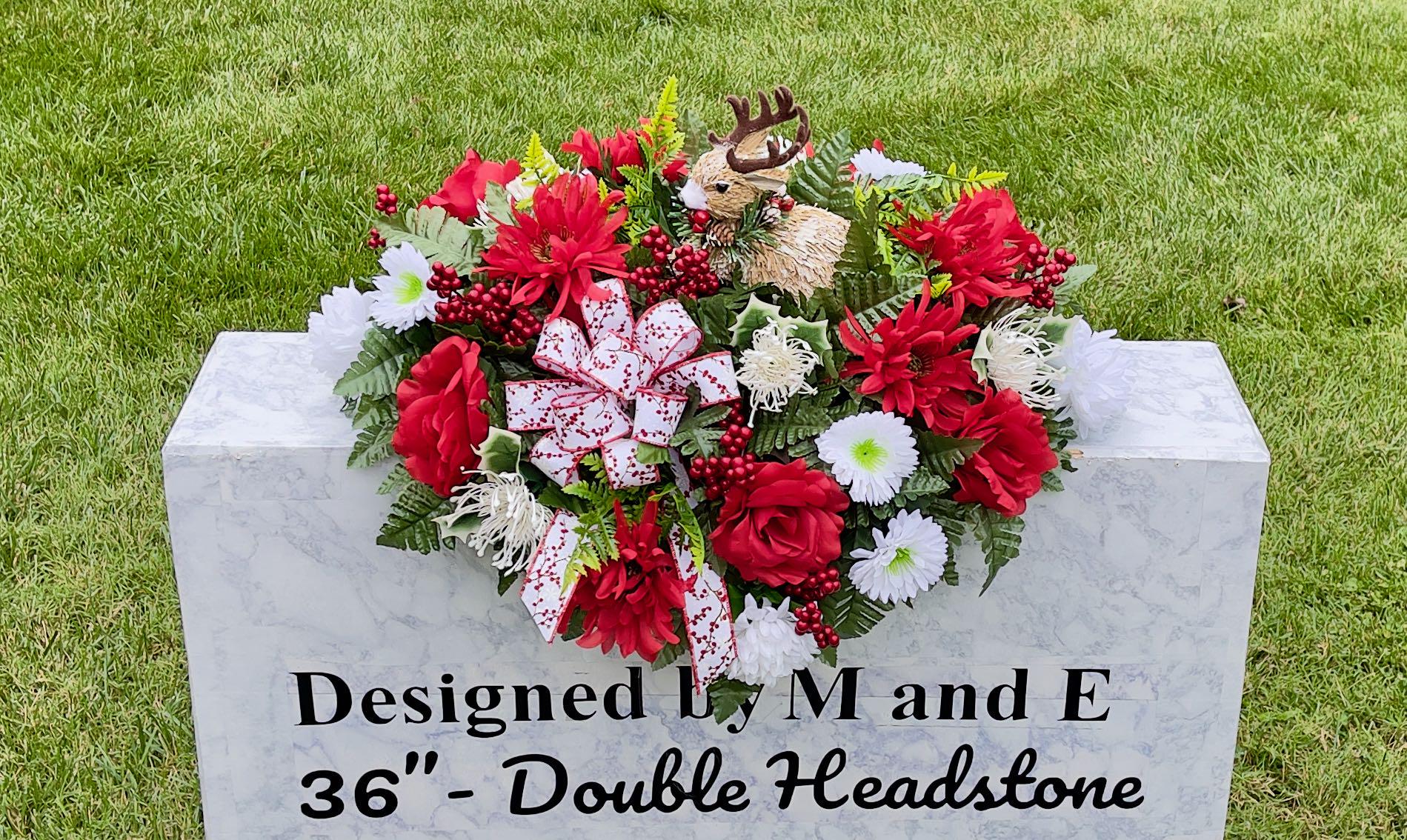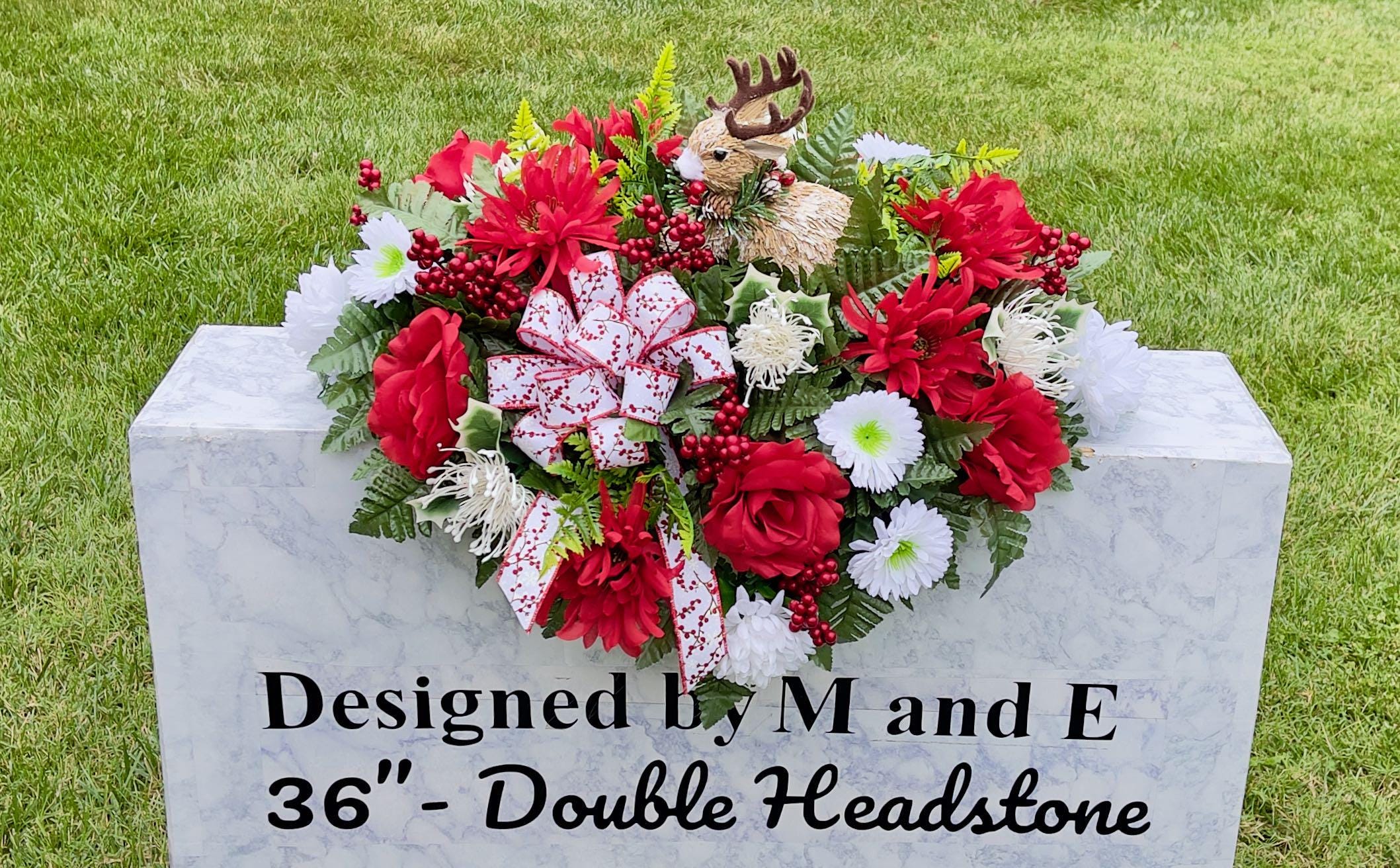 The photos are taken on a 36" headstone for reference only. For arrangement size please see the photo on the green measuring mat.