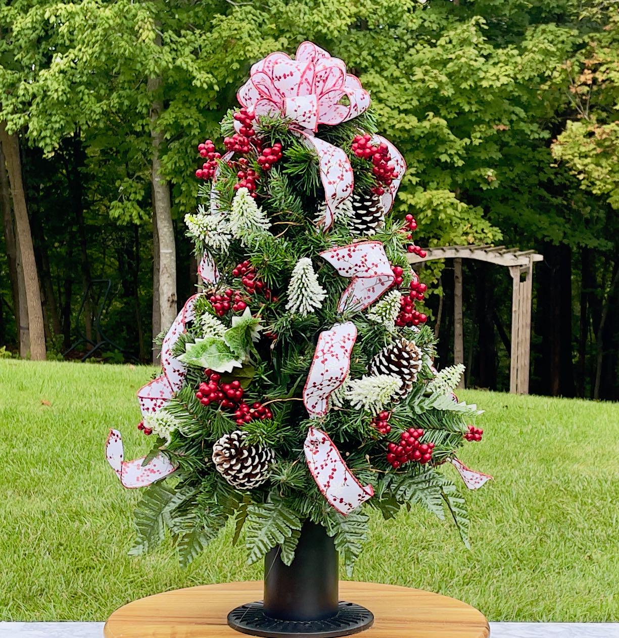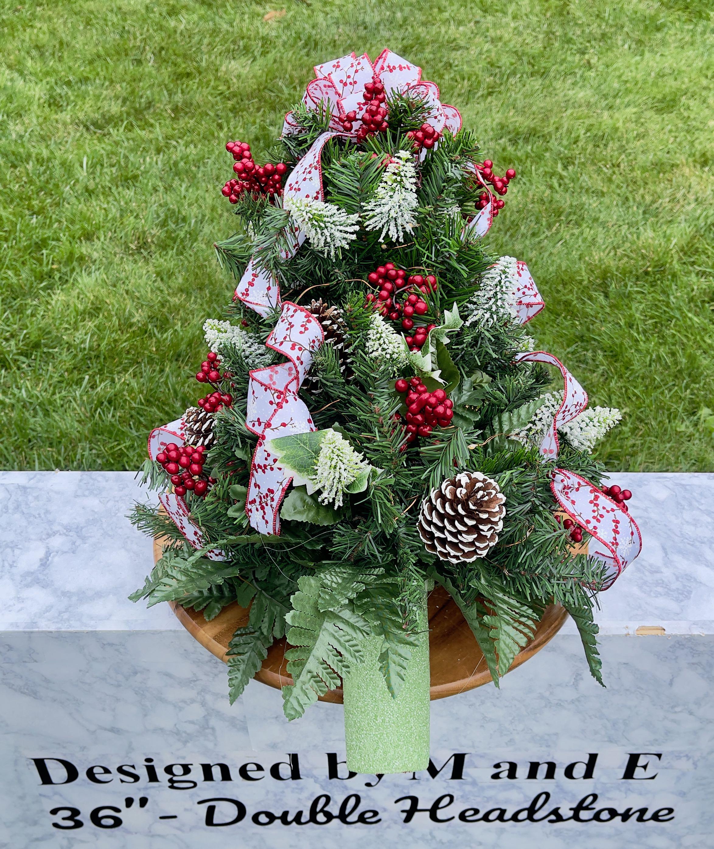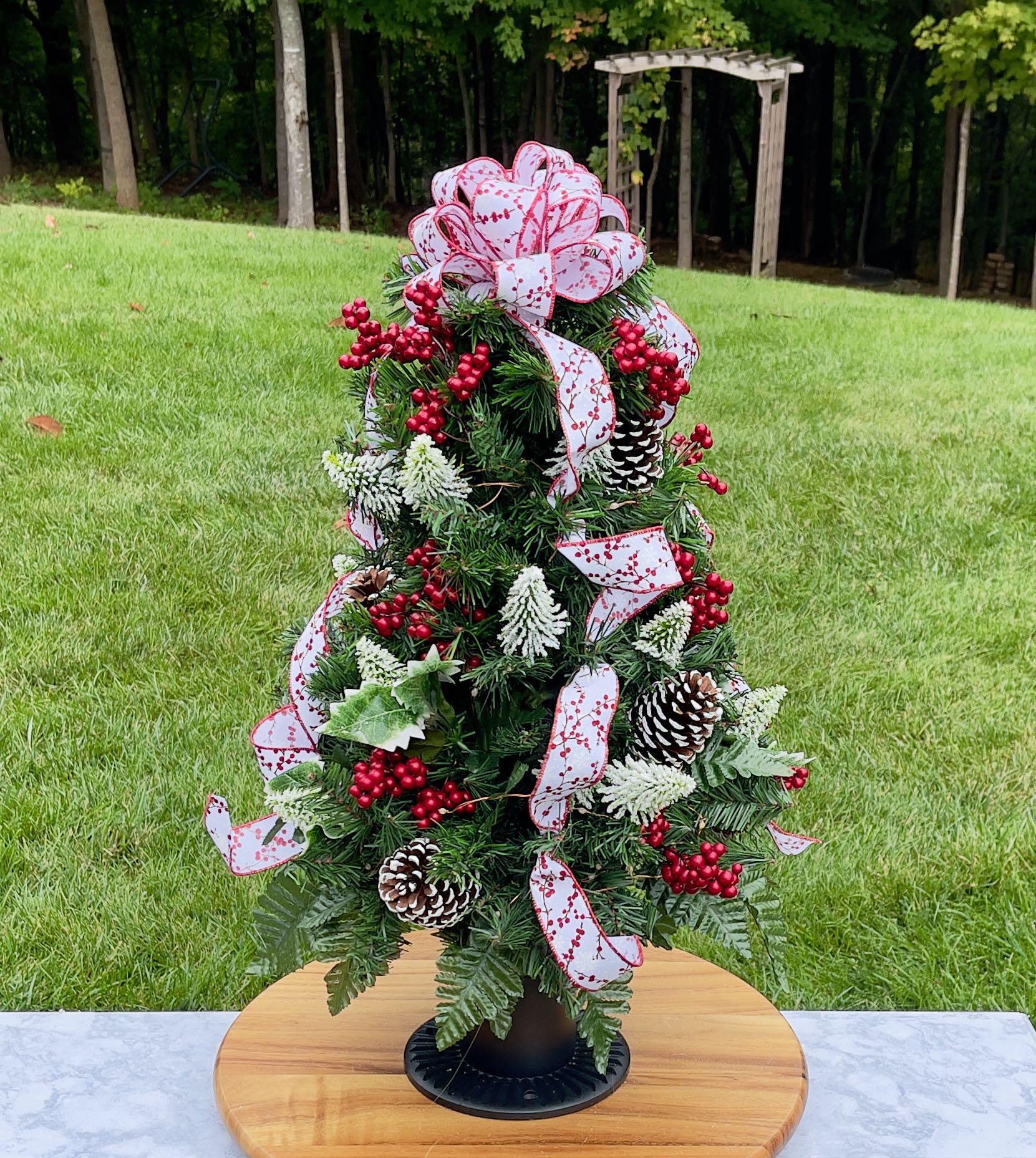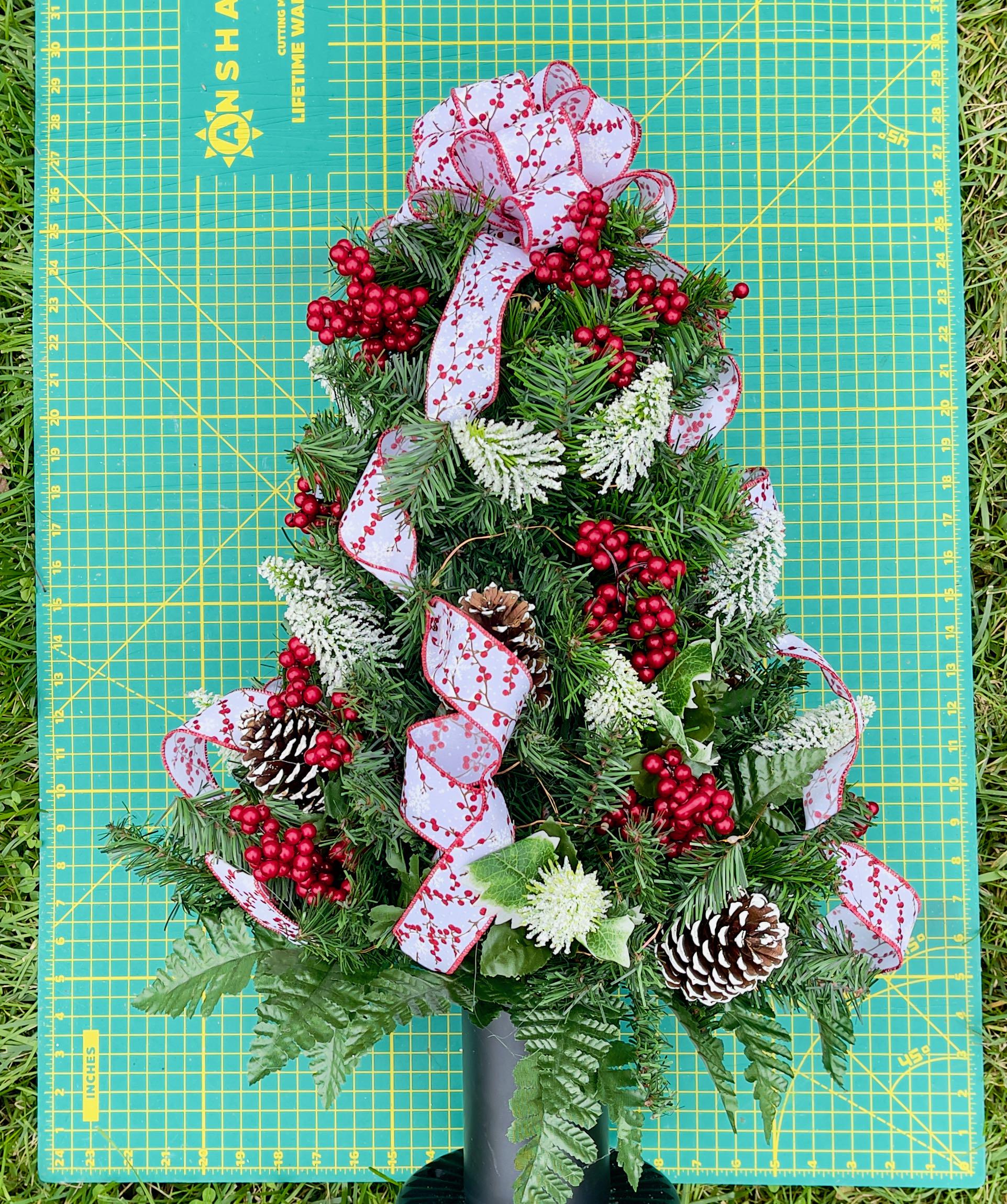 Lights, Pinecones, Berries, Ribbon and Bows 24" Mini Christmas Tree, Miniature Tree, Christmas Tree for Cemetery, Christmas Cemetery Vase