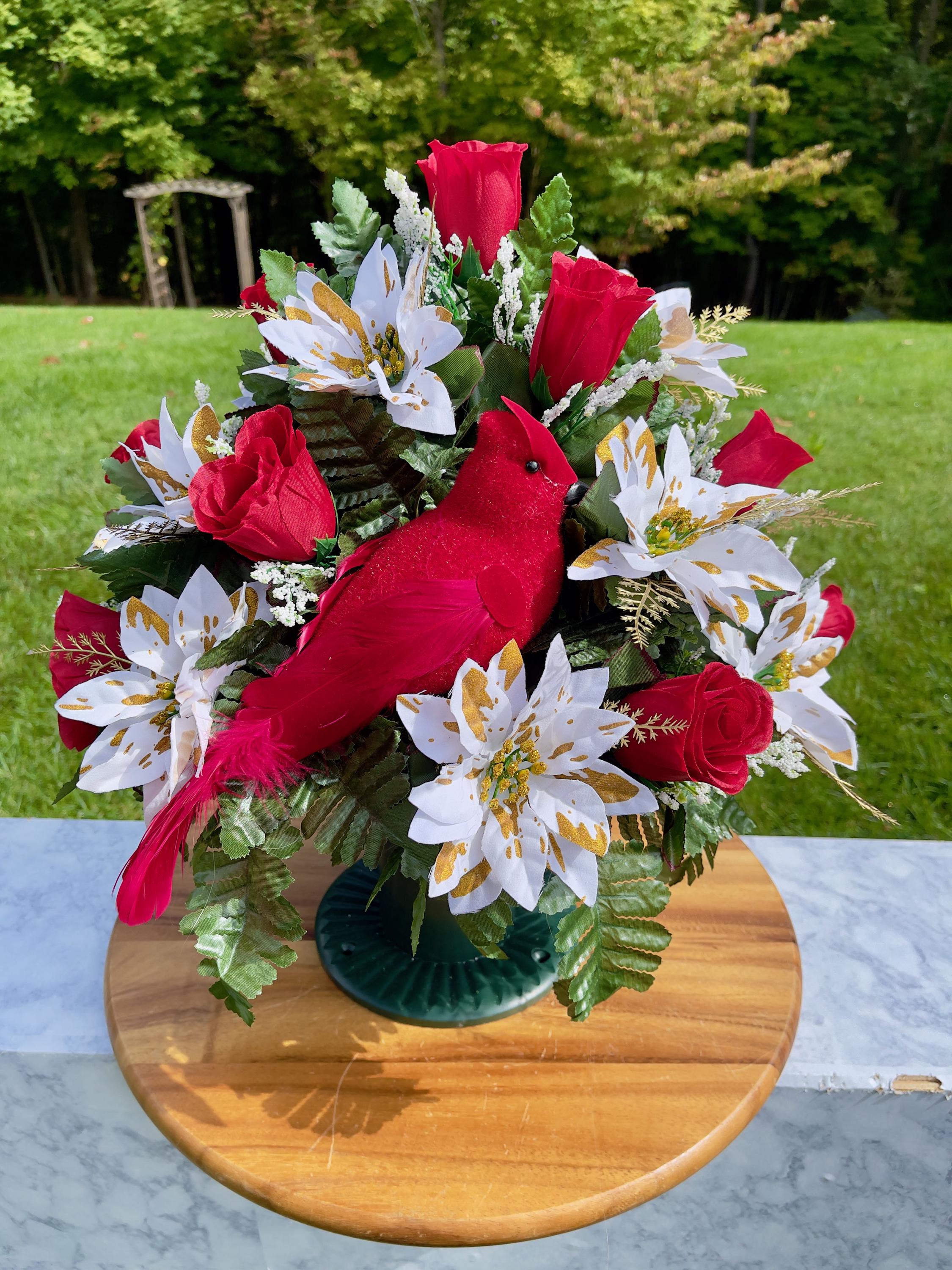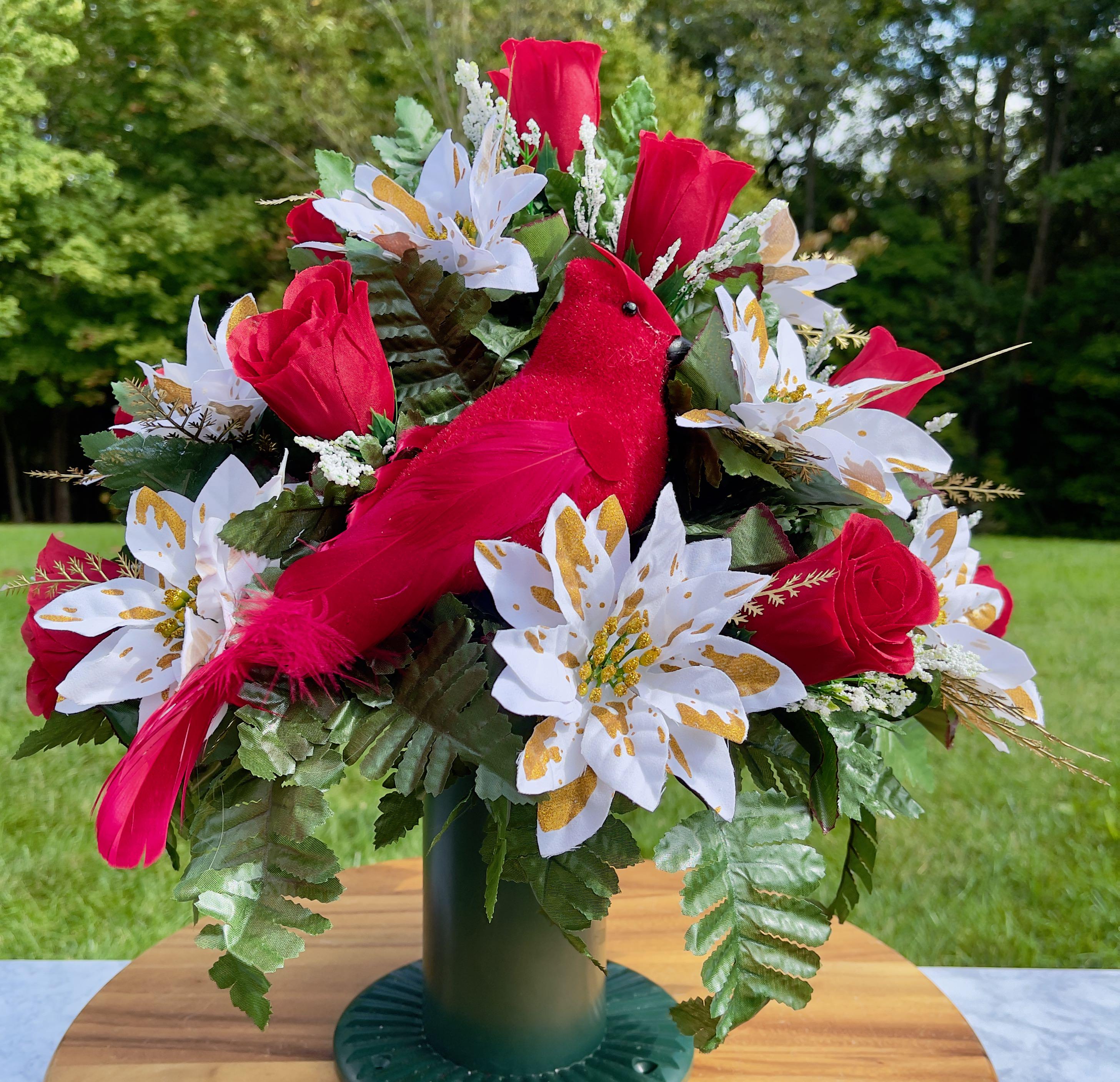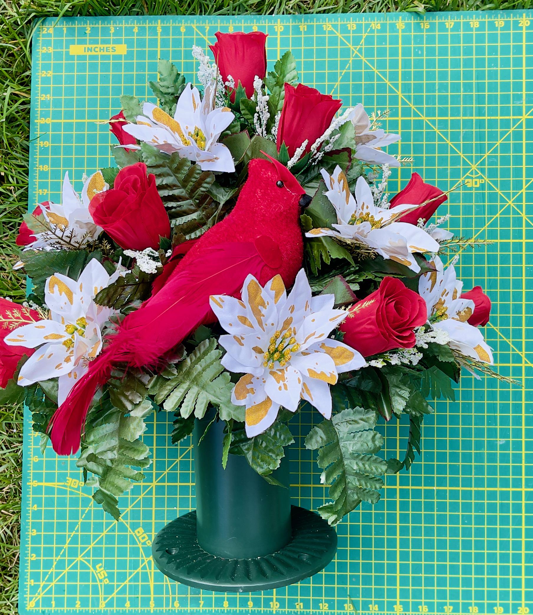 Cardinal with Red Roses Christmas Cemetery Vase, Memorial Cemetery Vase, Memorial Flowers, Memorial Day Cemetery Vase, Sympathy Flowers