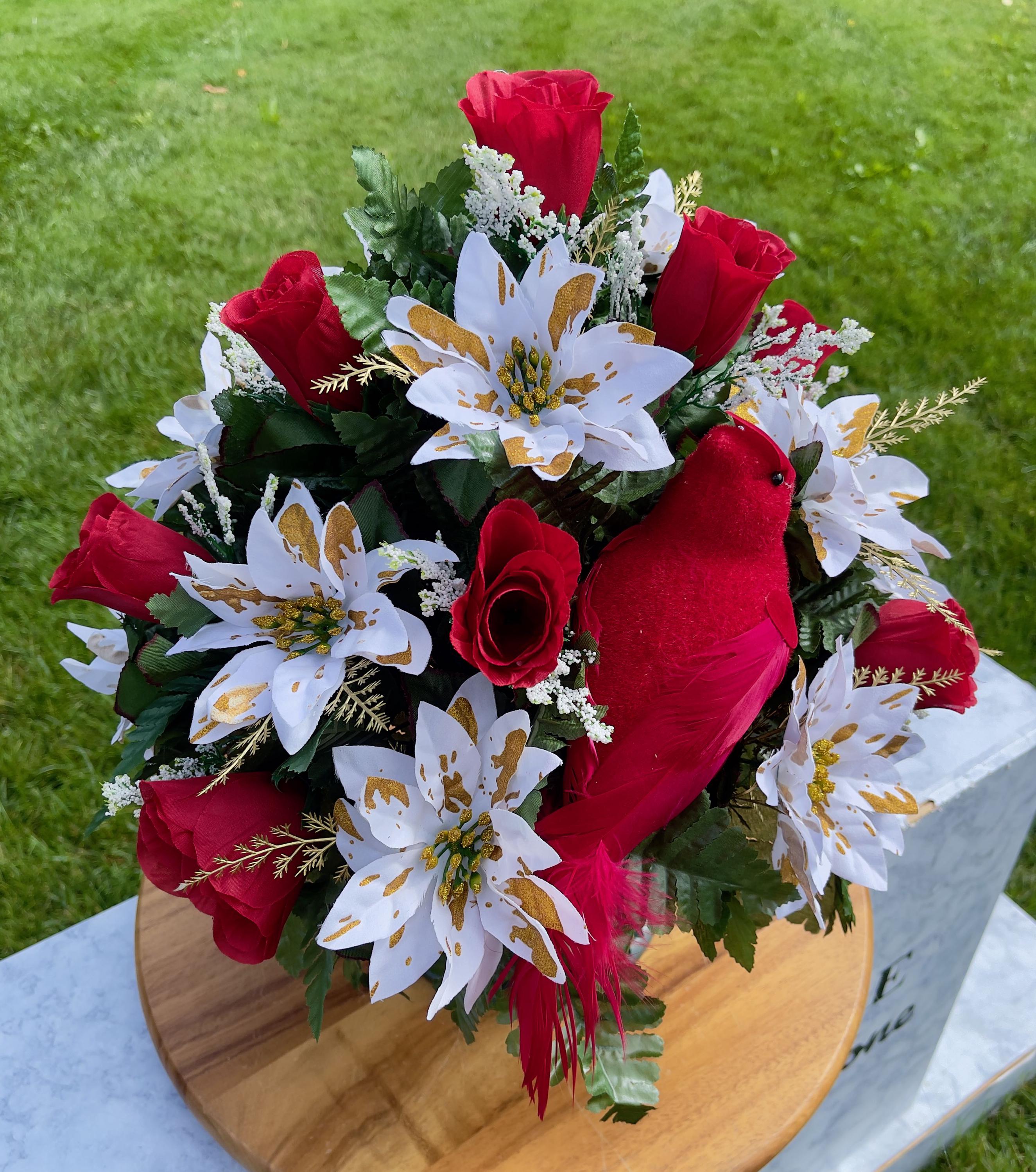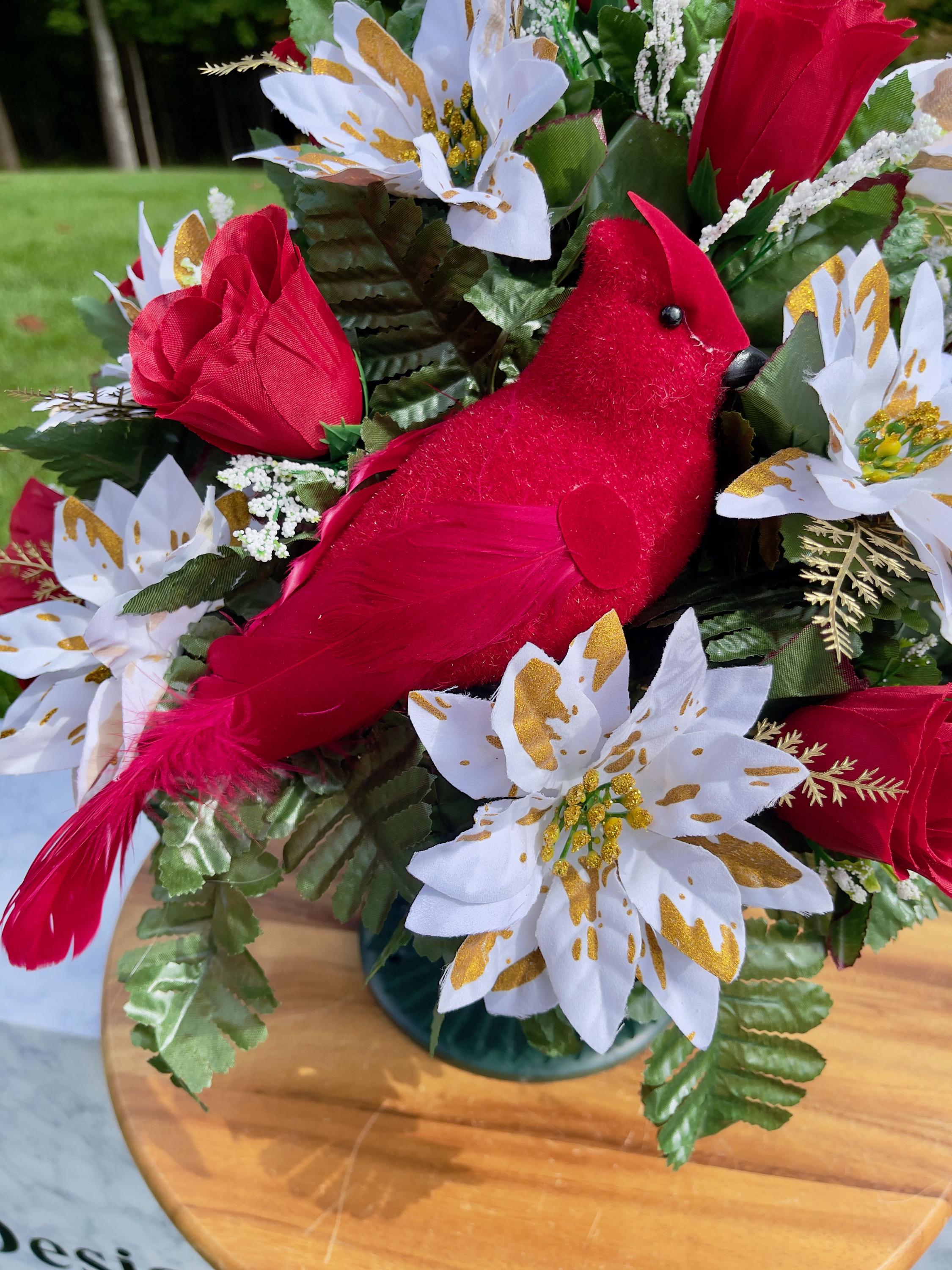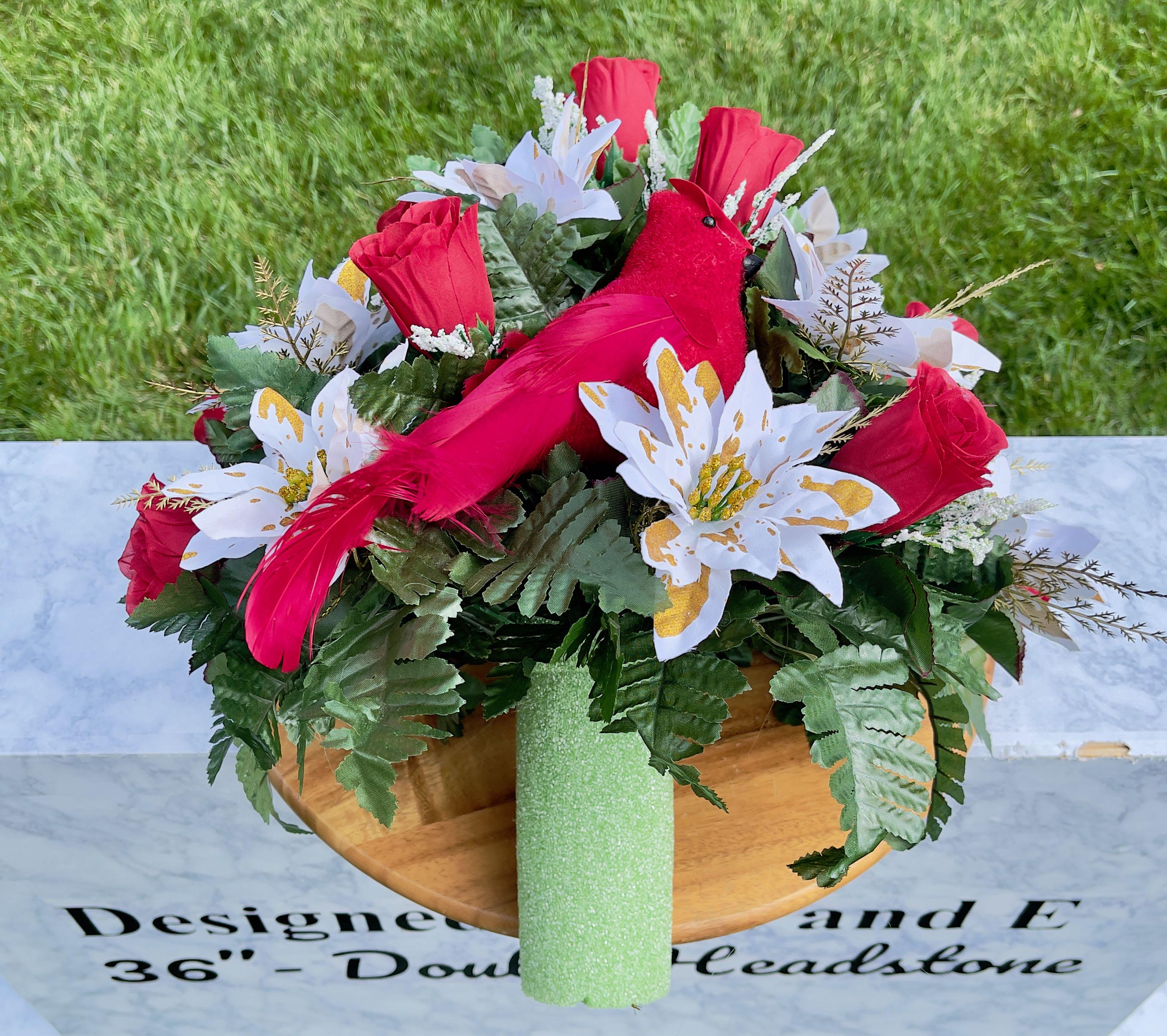 Cardinal with Red Roses Christmas Cemetery Vase, Memorial Cemetery Vase, Memorial Flowers, Memorial Day Cemetery Vase, Sympathy Flowers