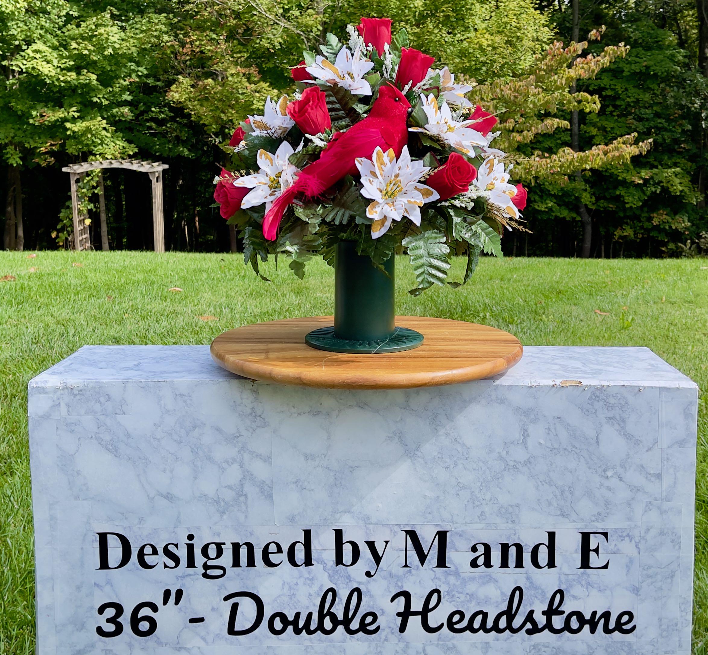 **Note** - The headstone pictured is 36" for reference only, please see photo on green measuring mat for arrangements exact dimensions.
