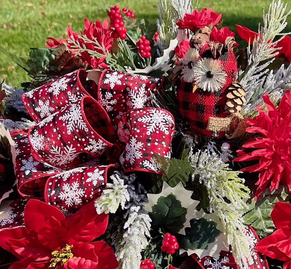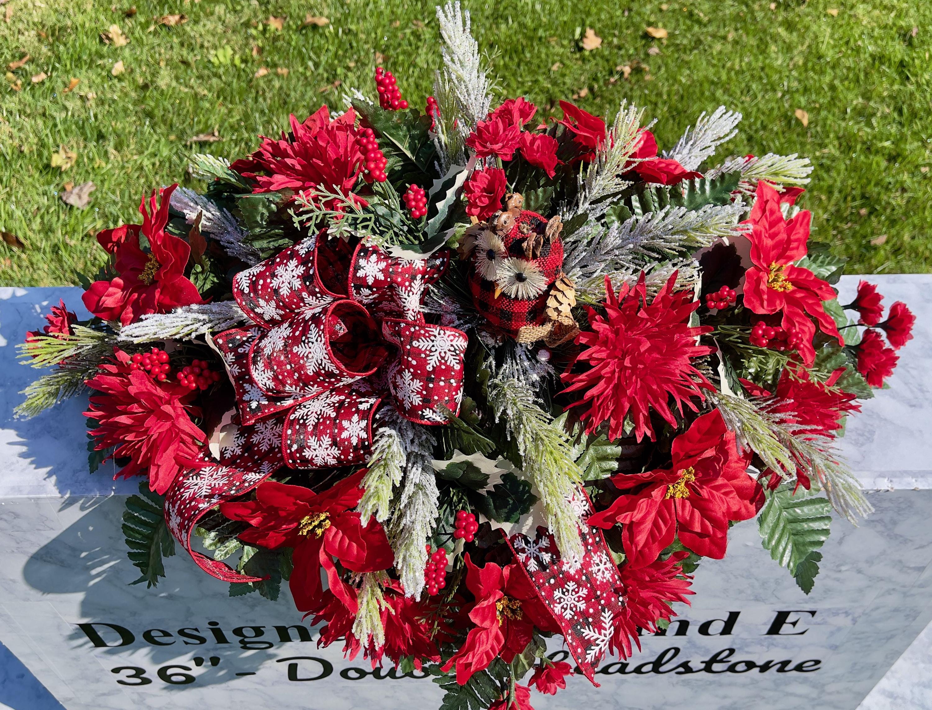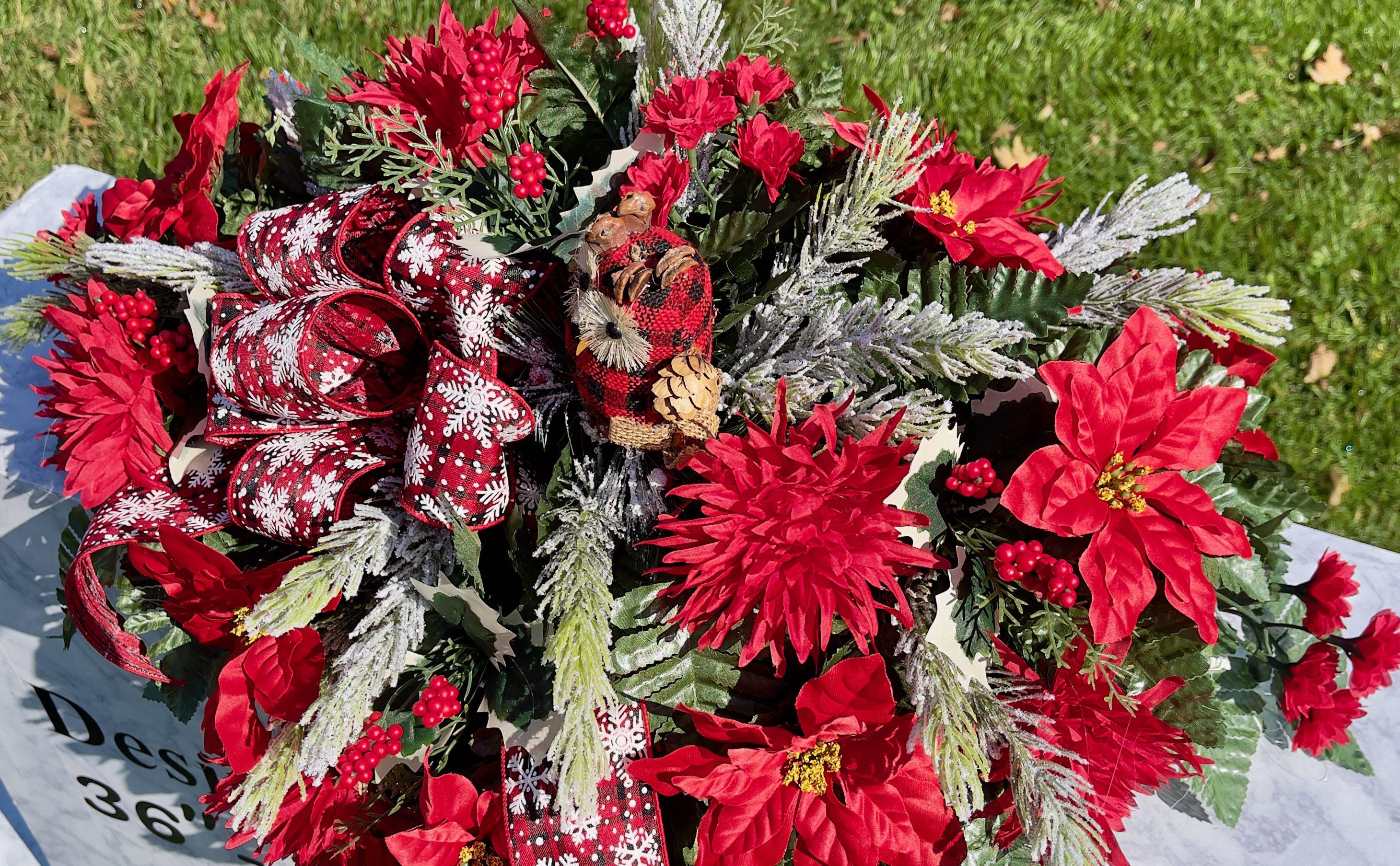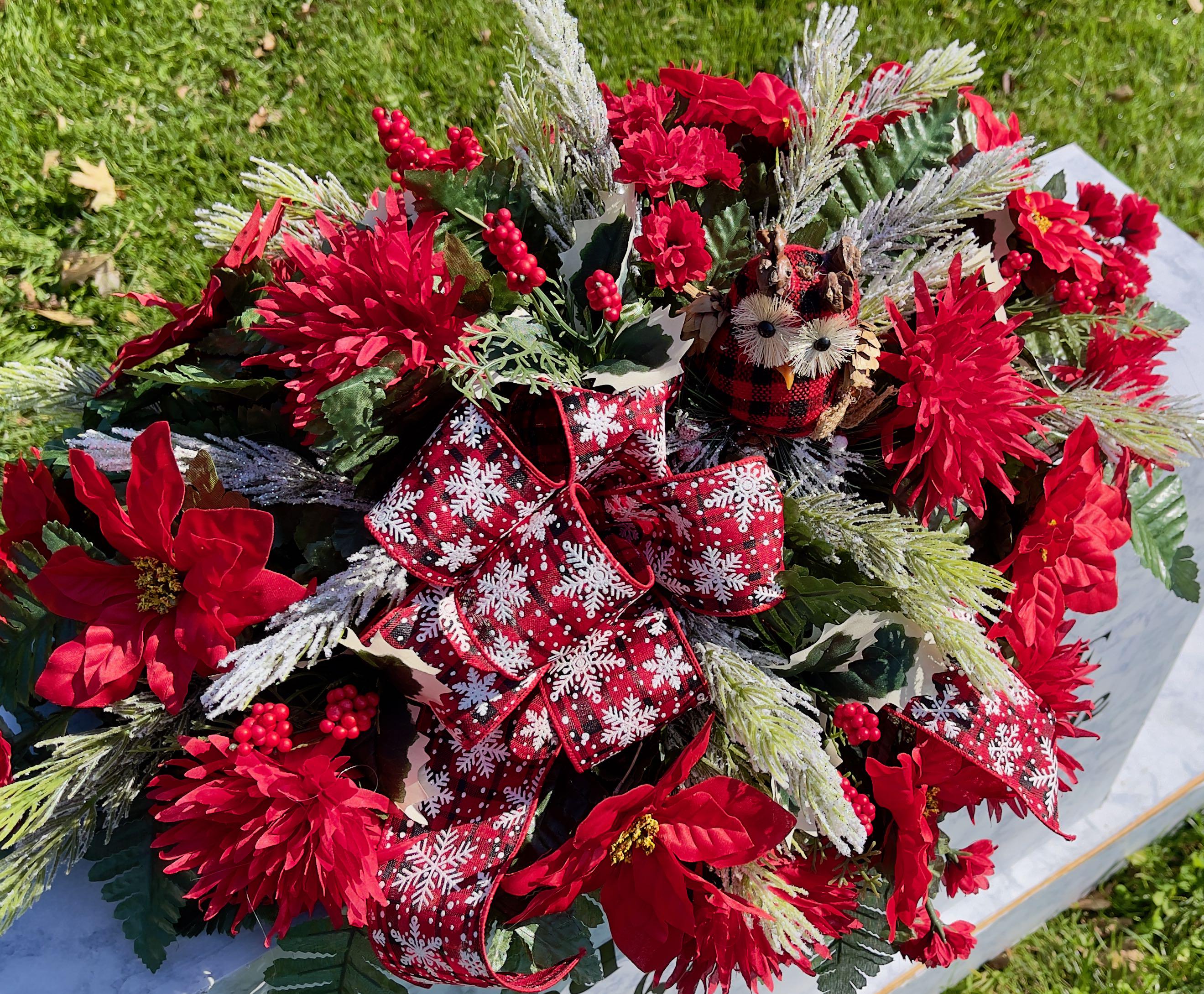 Owl with Snowflake Bow Christmas Cemetery Saddle Christmas, Christmas Cemetery Flowers, Christmas Headstone Saddle Arrangement