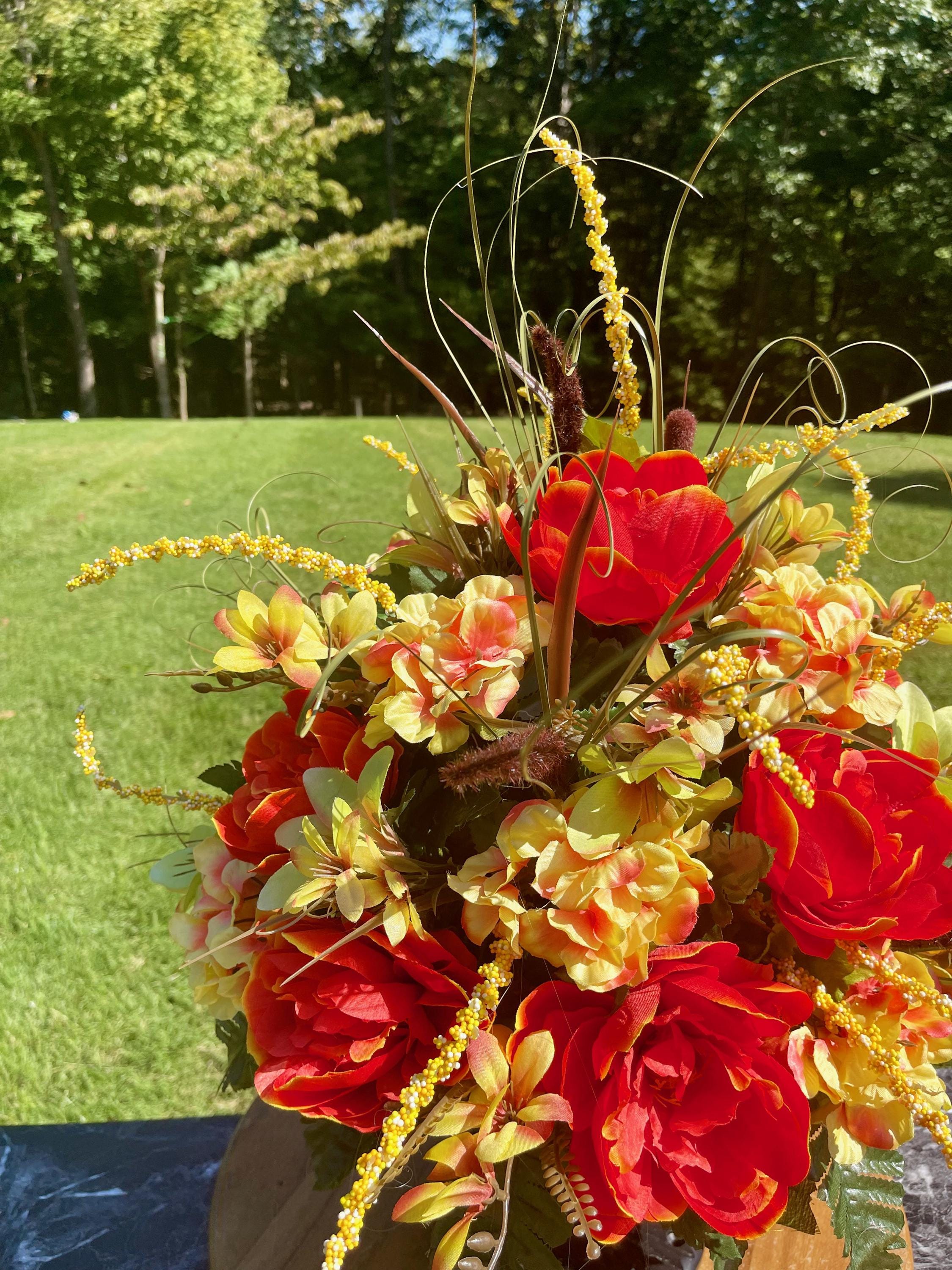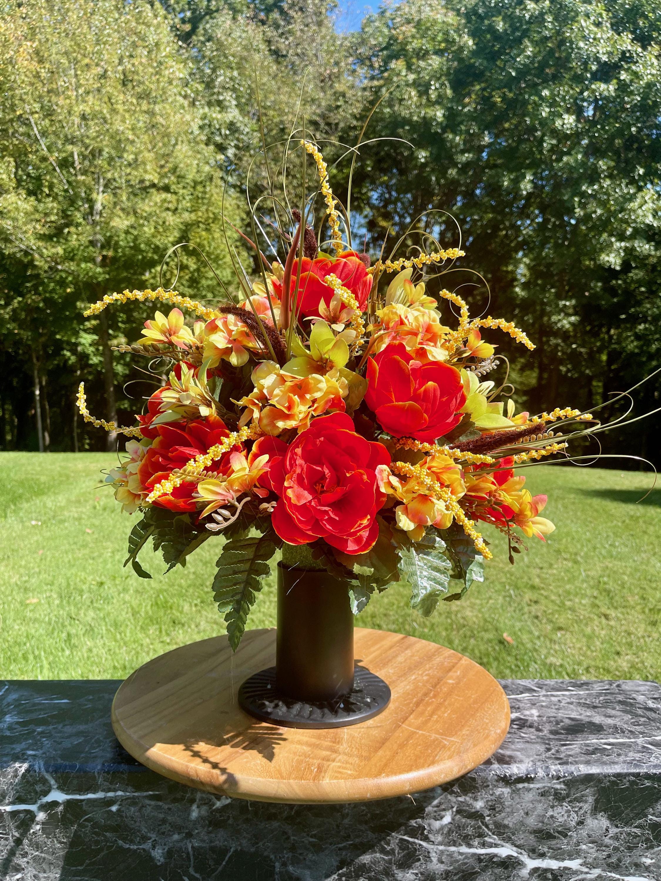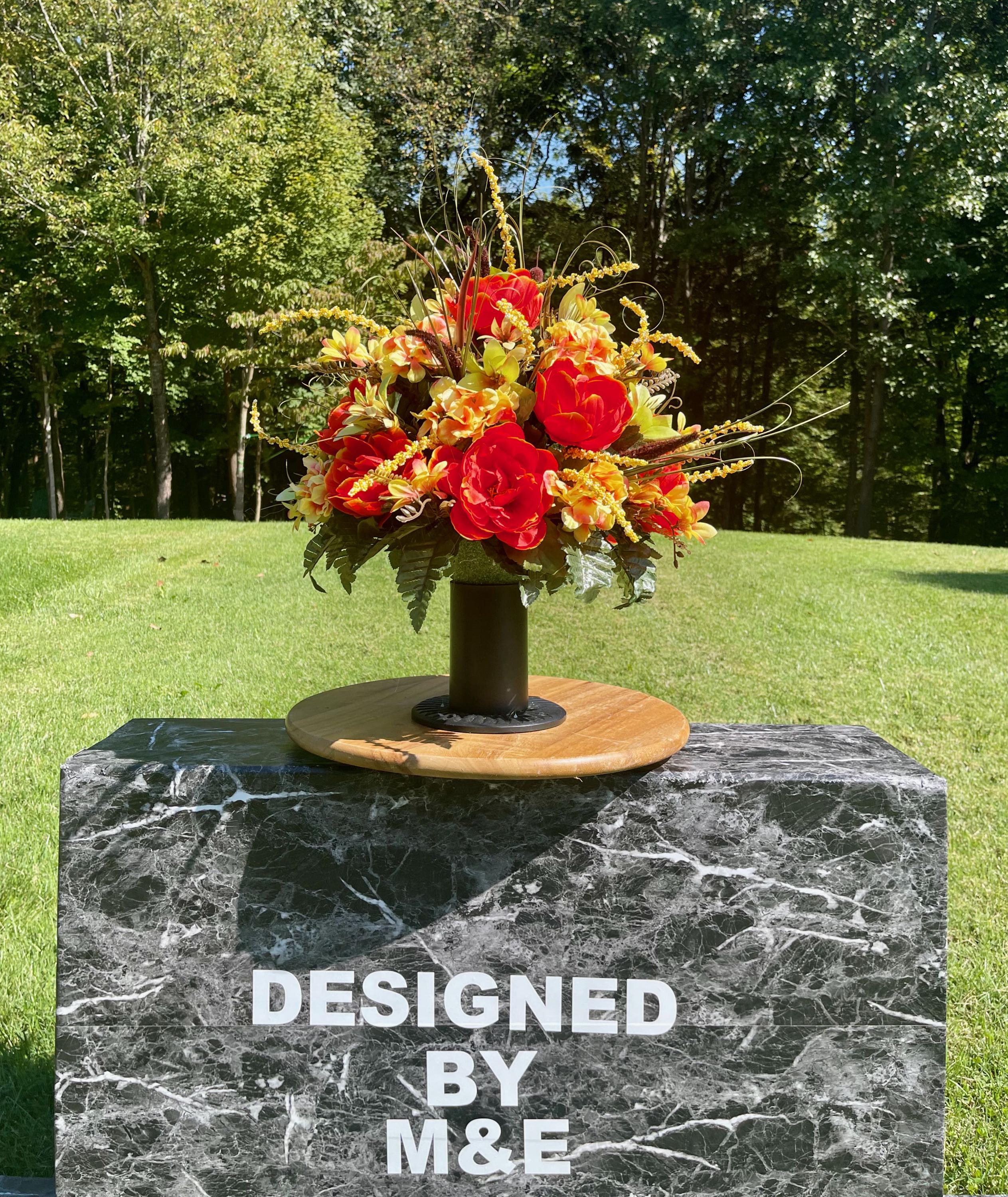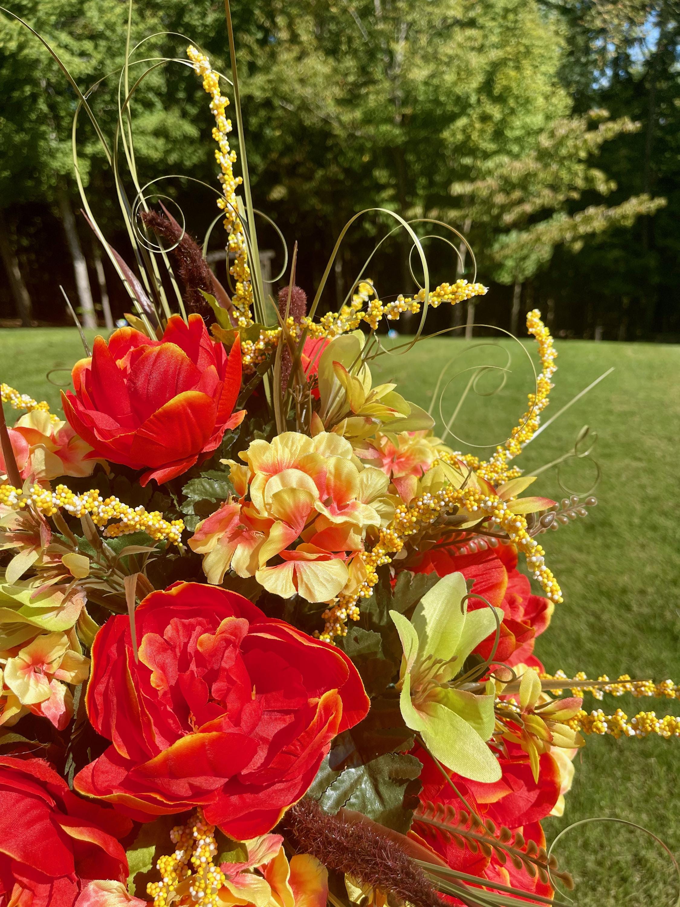 I put my love in every piece I build and do all I can to make them last. Every flower stem in glued into the foam to ensure they hold up to the elements. Designed by M&E sources only high-quality silk flowers for all my arrangements. All flowers will fade in time however, a good quality silk will ensure you get months of enjoyment.
