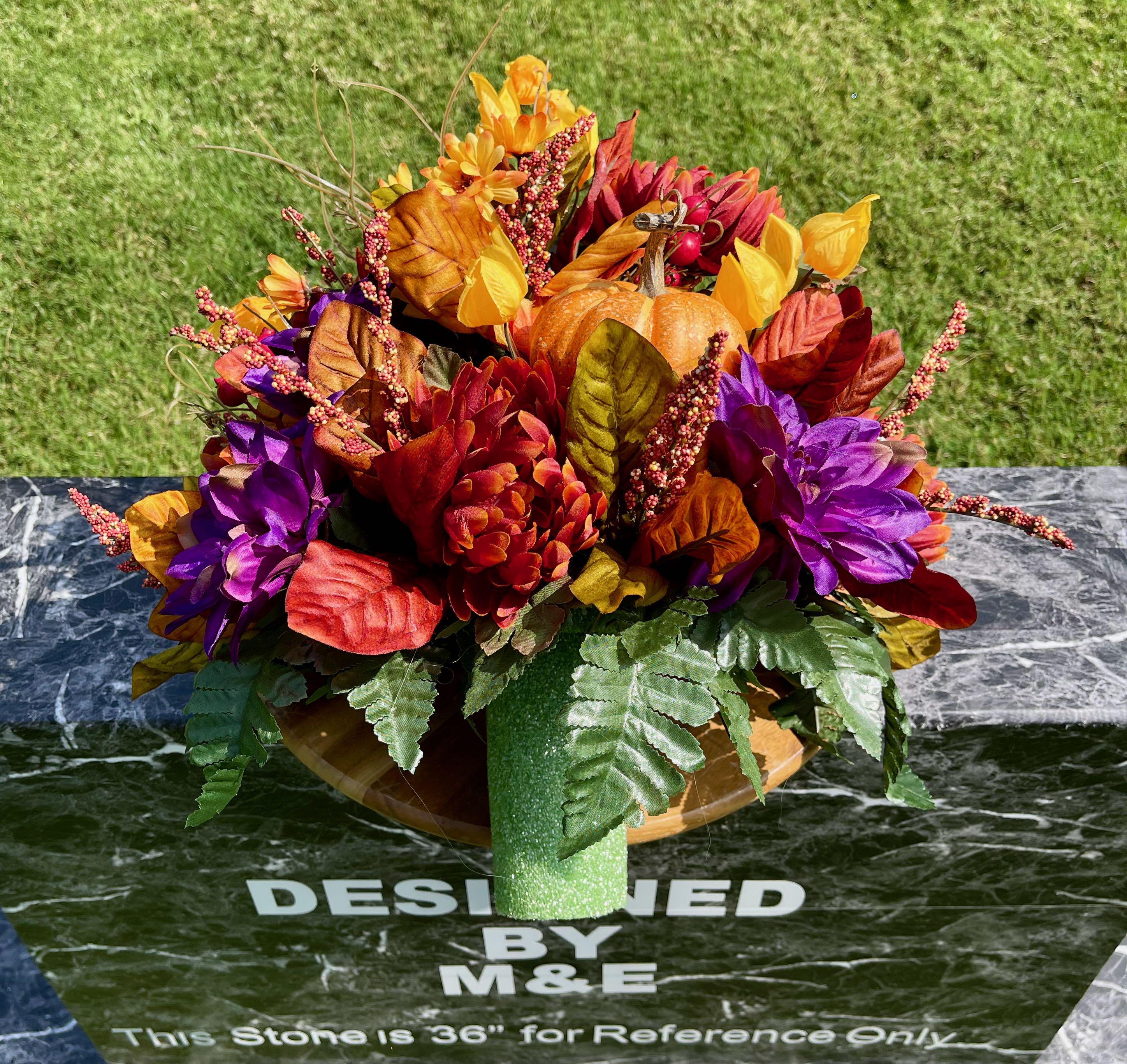 We’re a small, family-operated business consisting of myself, my husband, and my daughter. We personally manage every order and strive for excellent customer service. All our arrangements use high-quality silk flowers, though all silk blooms may fade over time. Each stem is glued into foam to withstand the elements. Designed by M&E uses only premium silks, and we put genuine care into every piece we create. Rest assured, the arrangement shown in our photos is exactly the one you’ll receive, as I design and assemble each one myself. If you’re searching for something unique or have a particular flower, color, or matching vases in mind, please contact me to discuss a custom order.