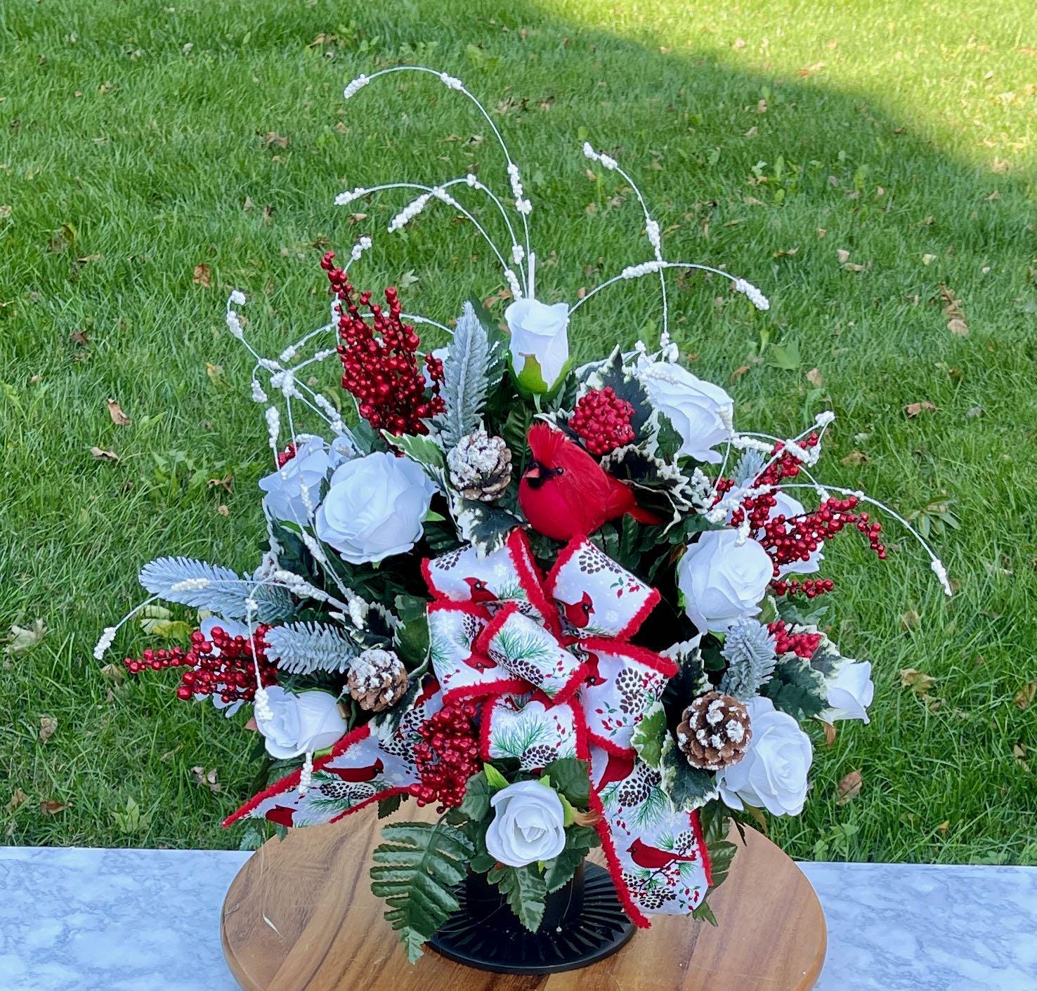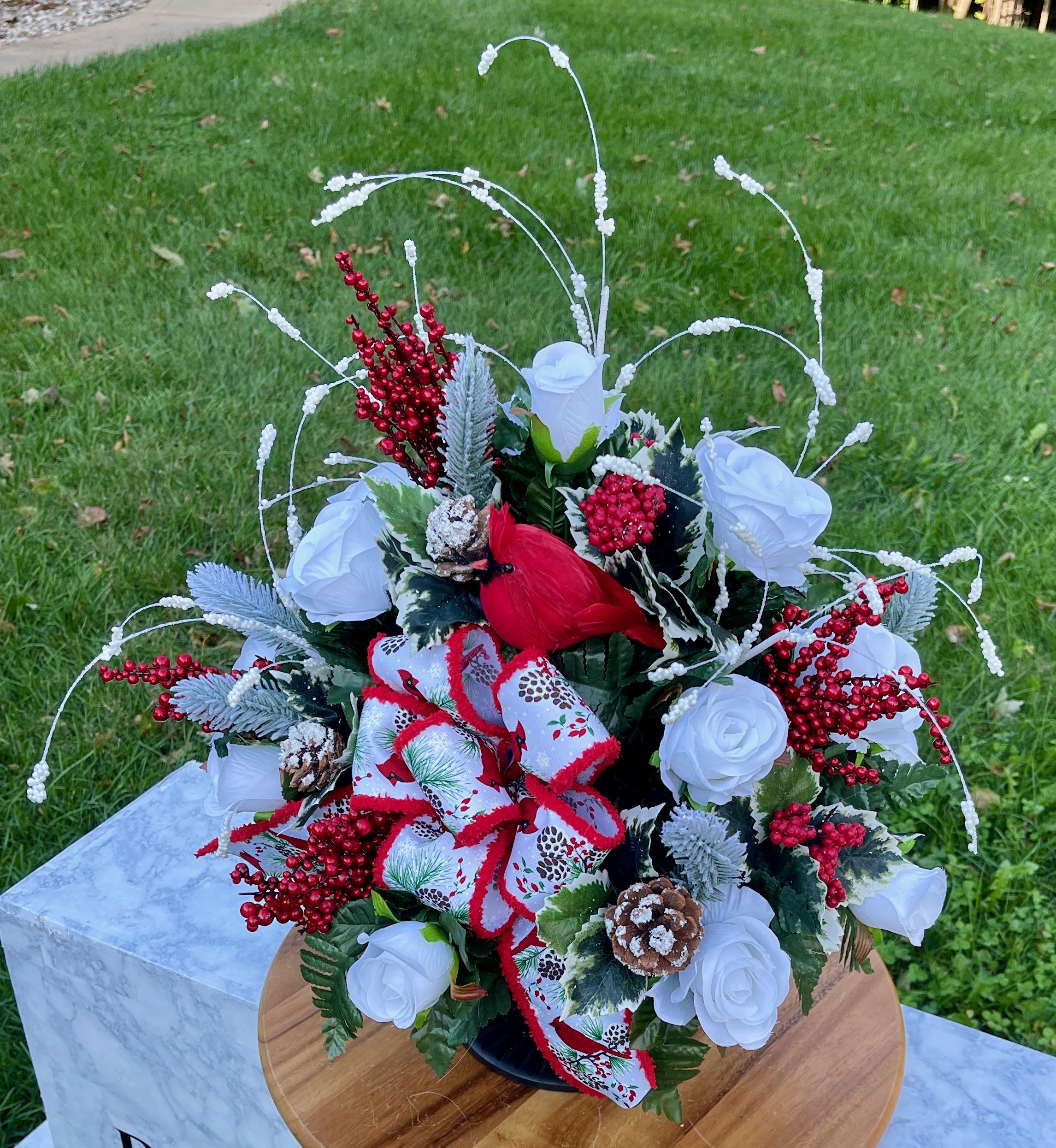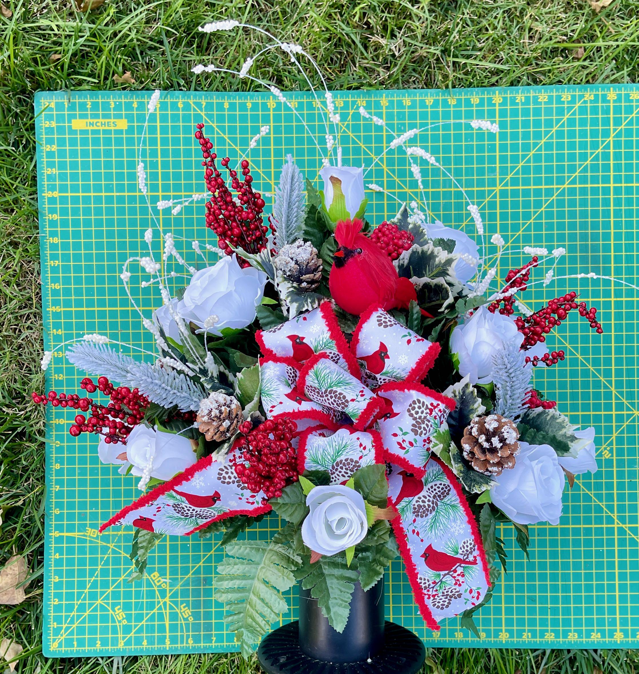Redbird with Cardinal Bow Christmas Cemetery Vase, Vase Arrangement, Memorial Cemetery Vase, Christmas Vase, Grave Flowers