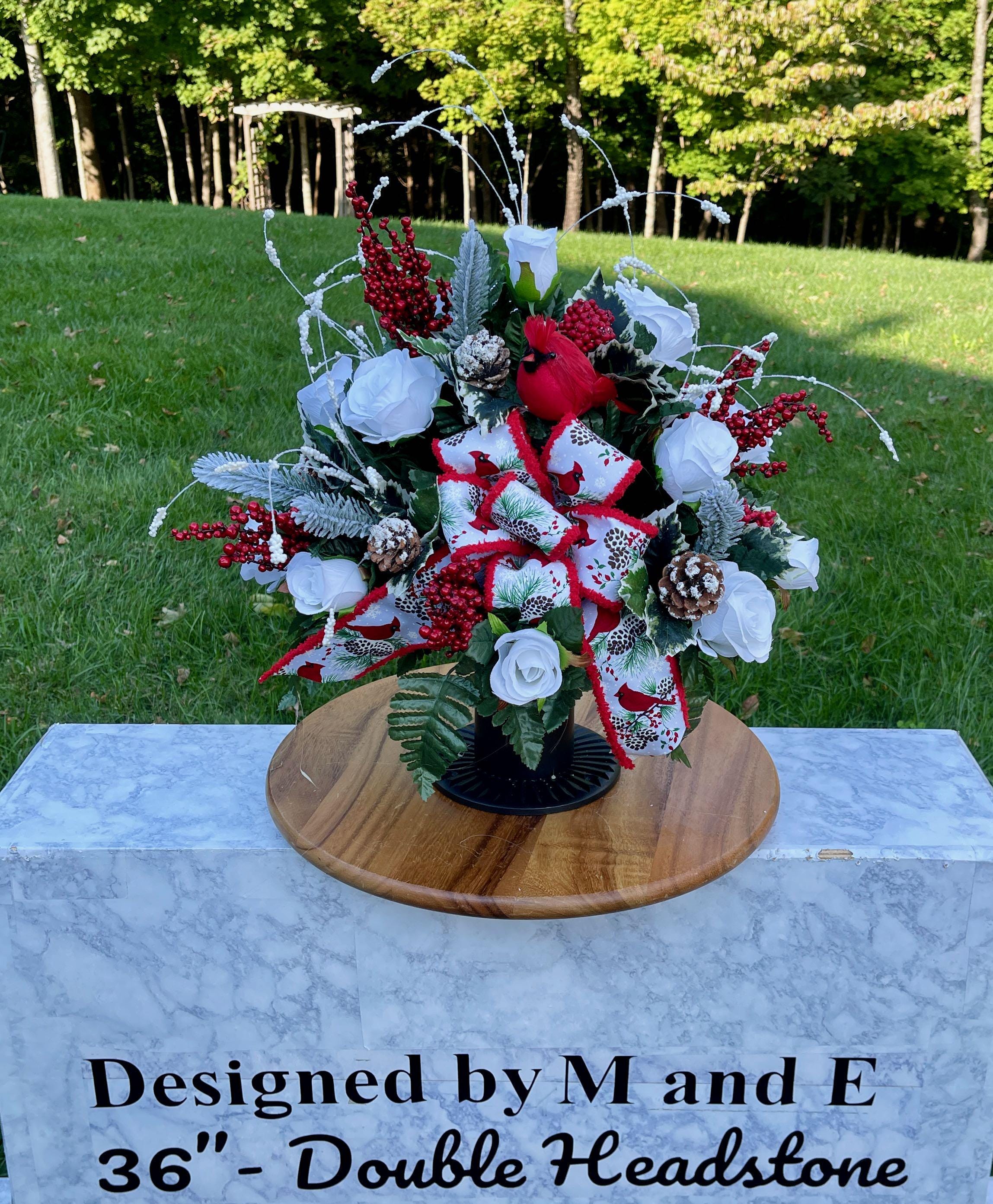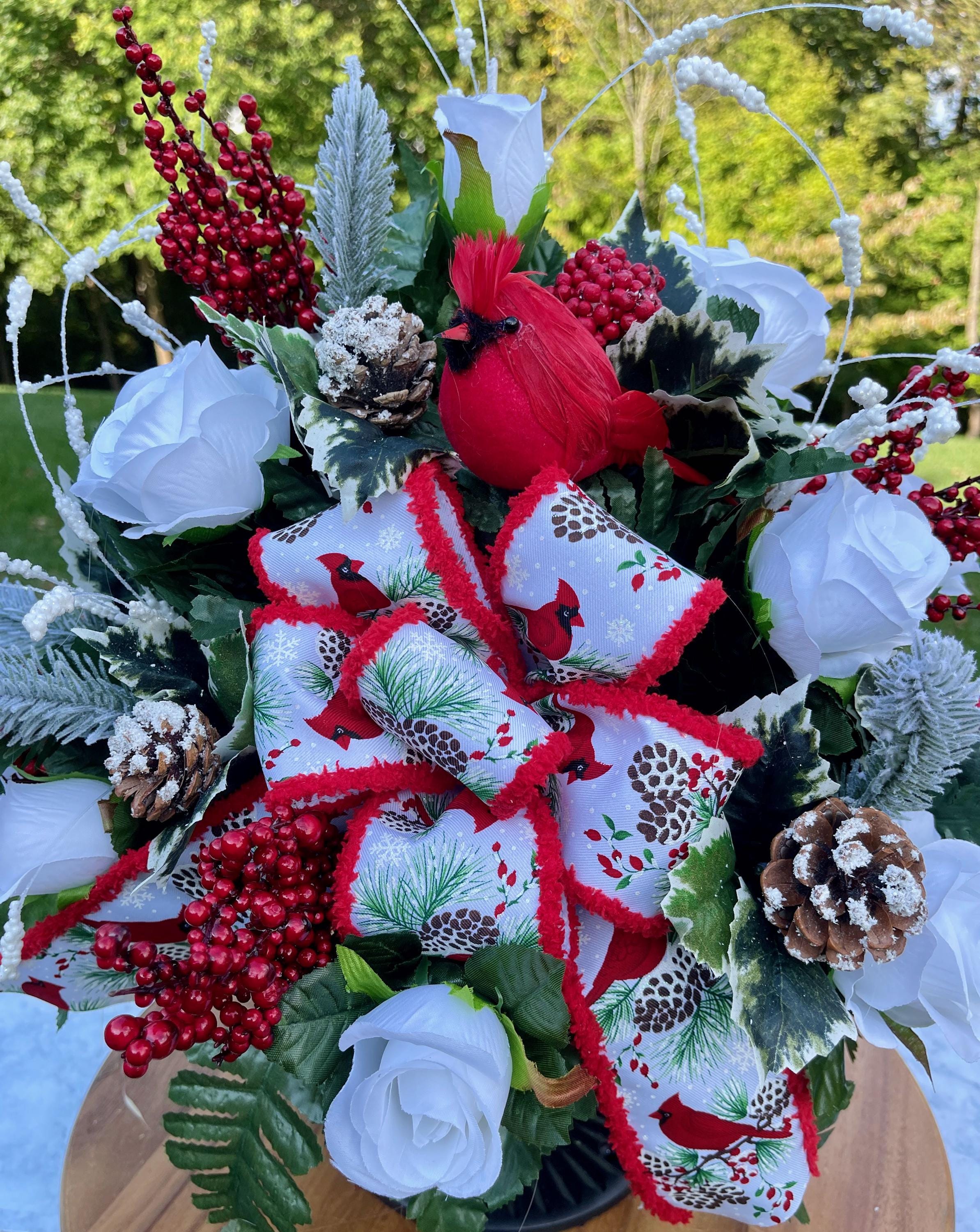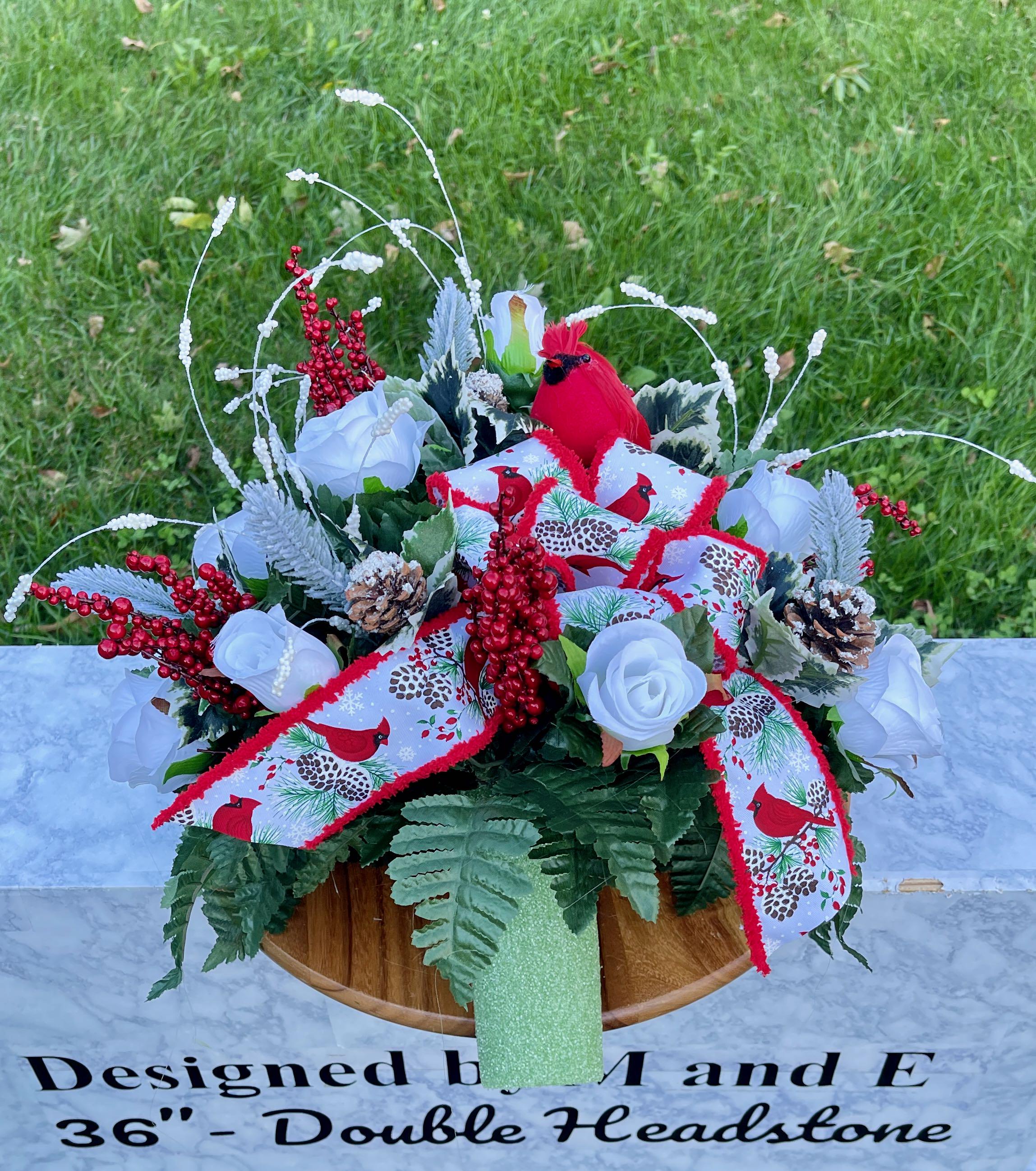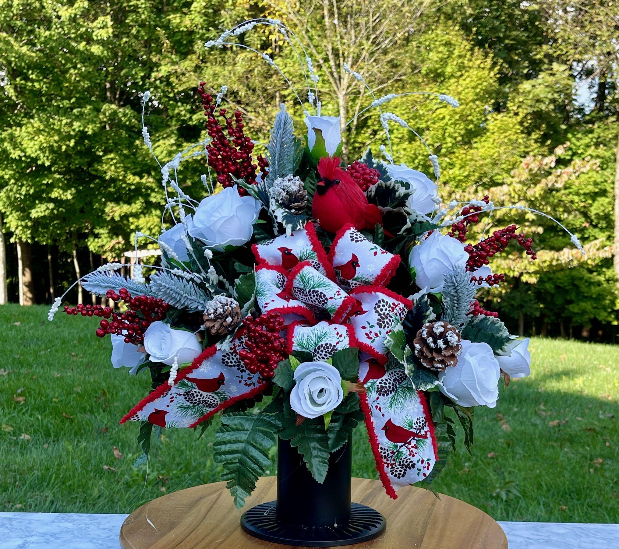 Redbird with Cardinal Bow Christmas Cemetery Vase, Vase Arrangement, Memorial Cemetery Vase, Christmas Vase, Grave Flowers