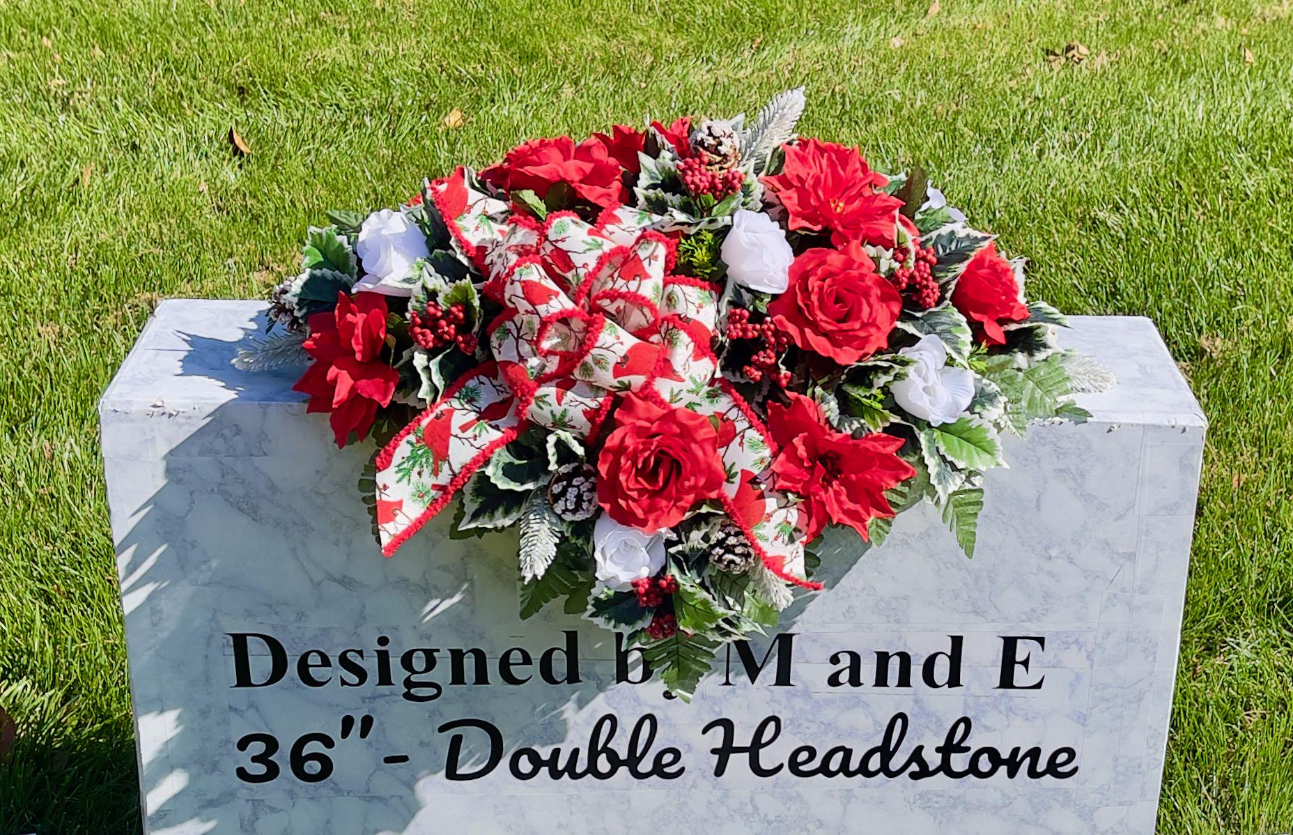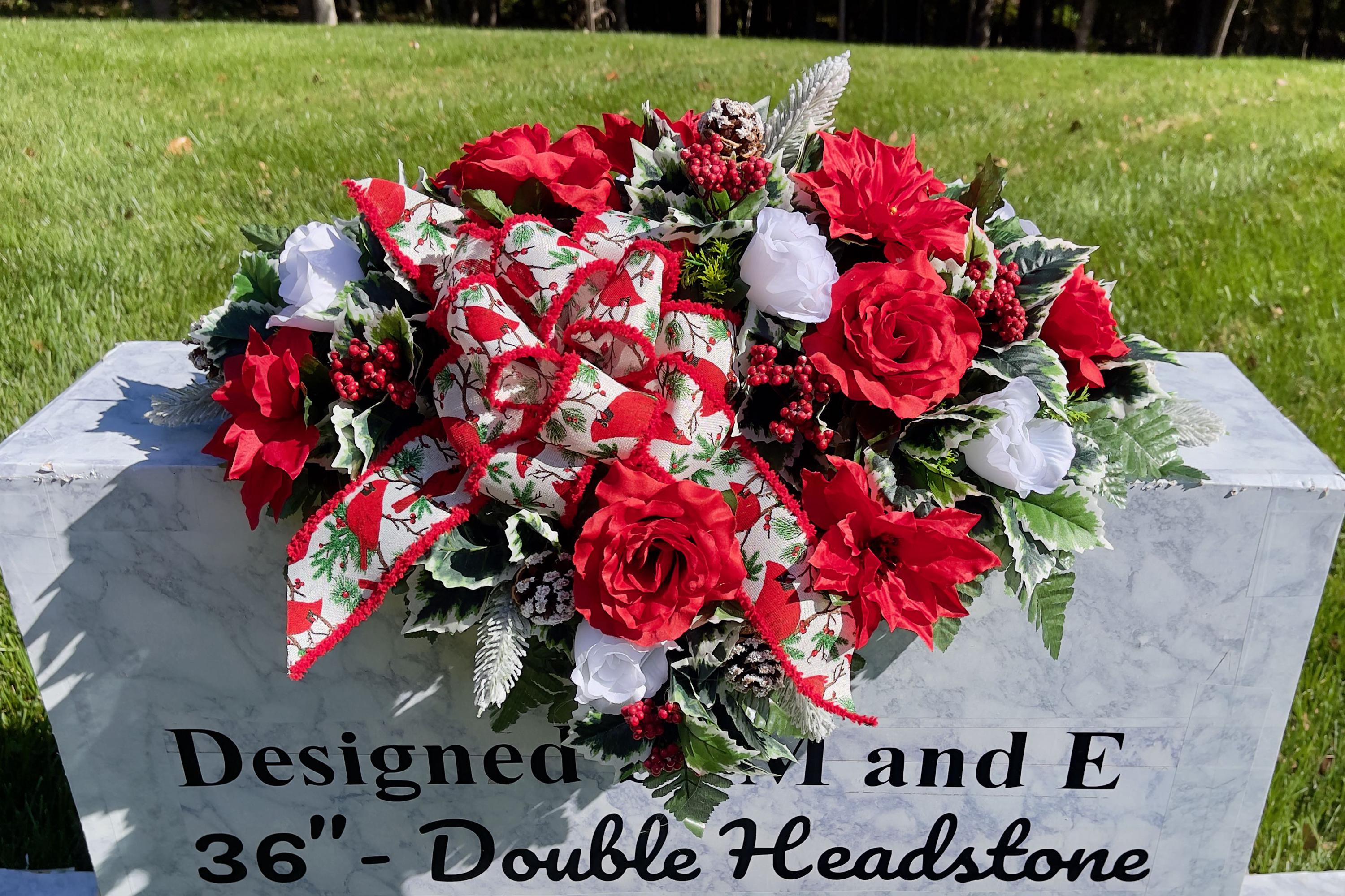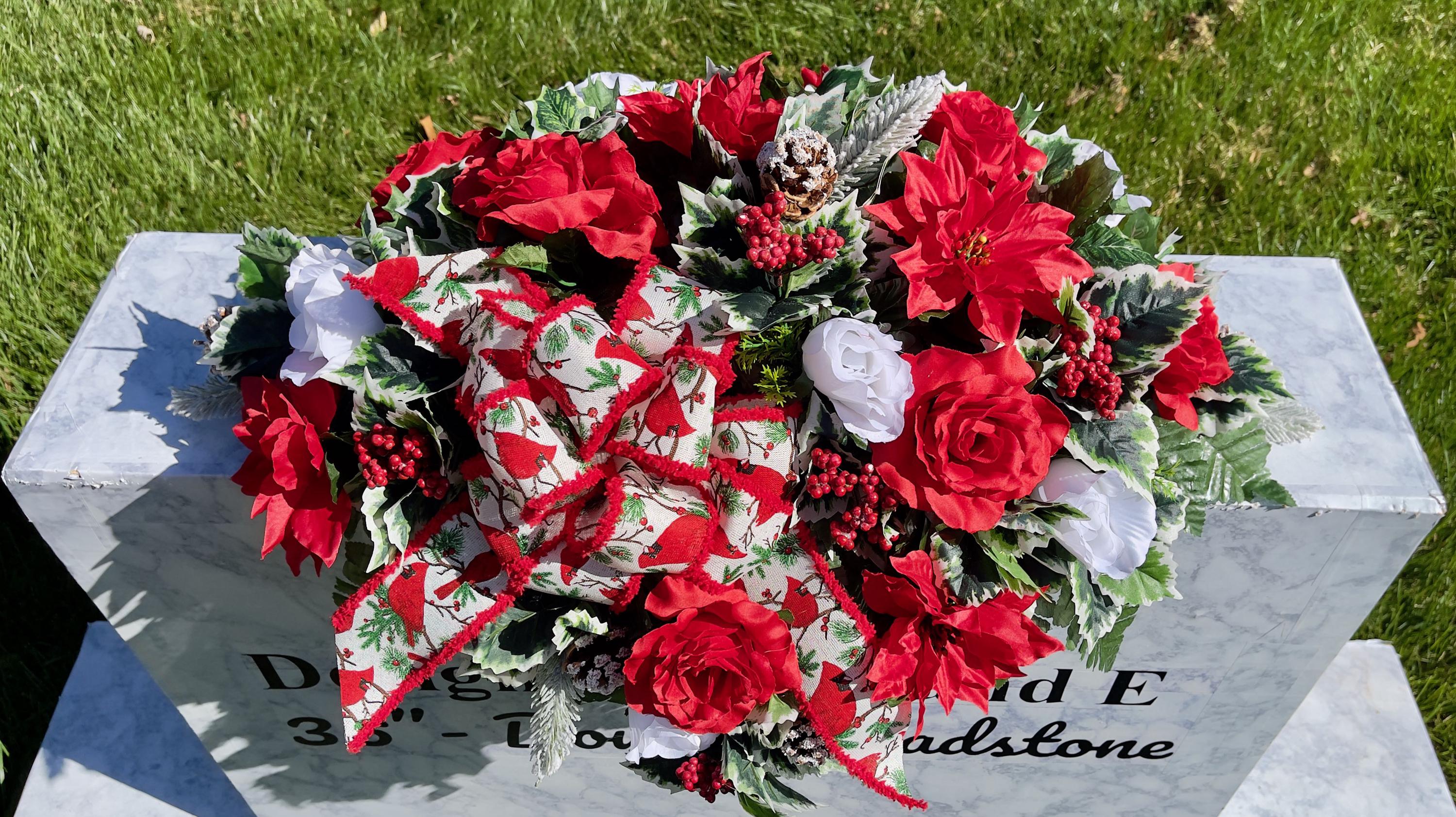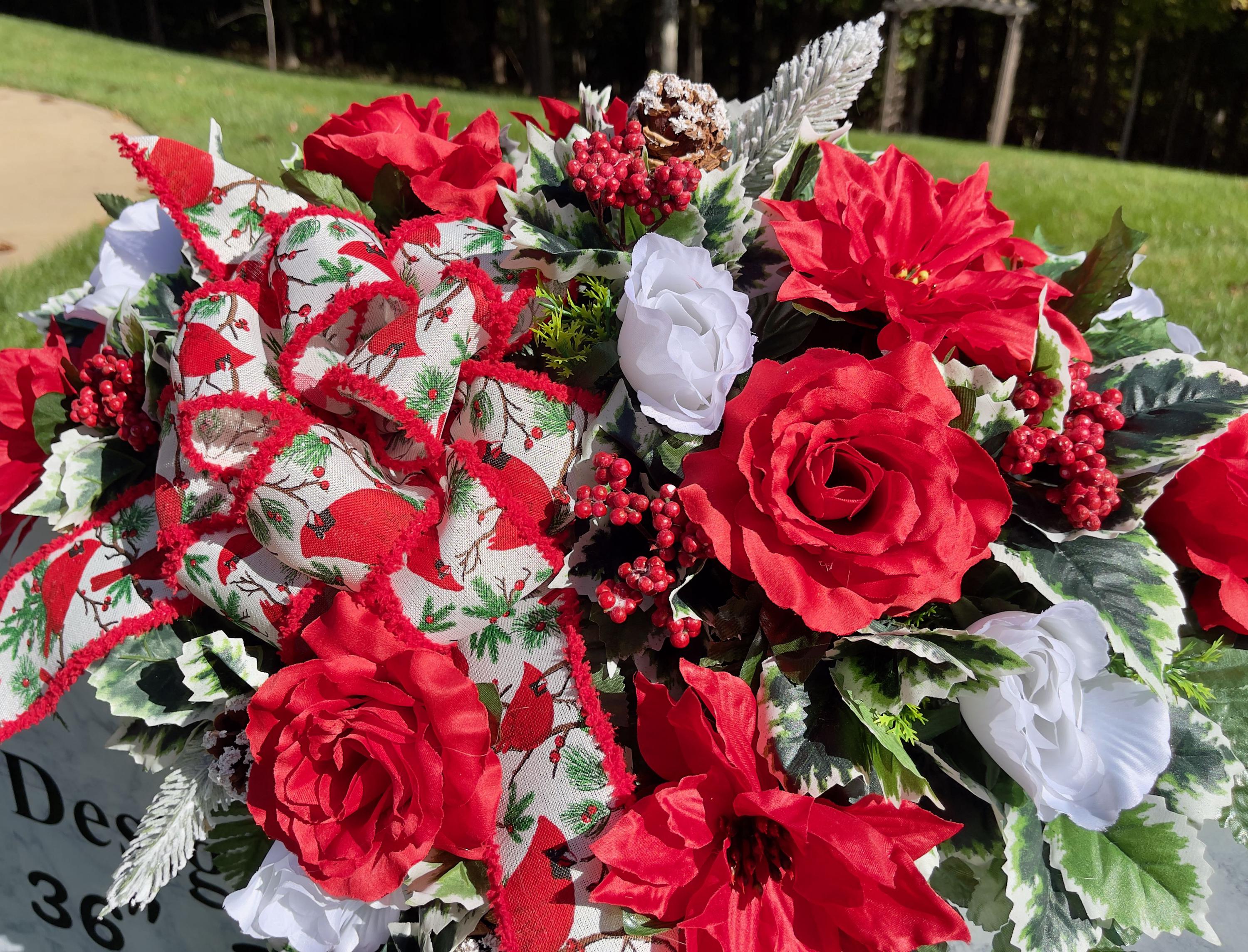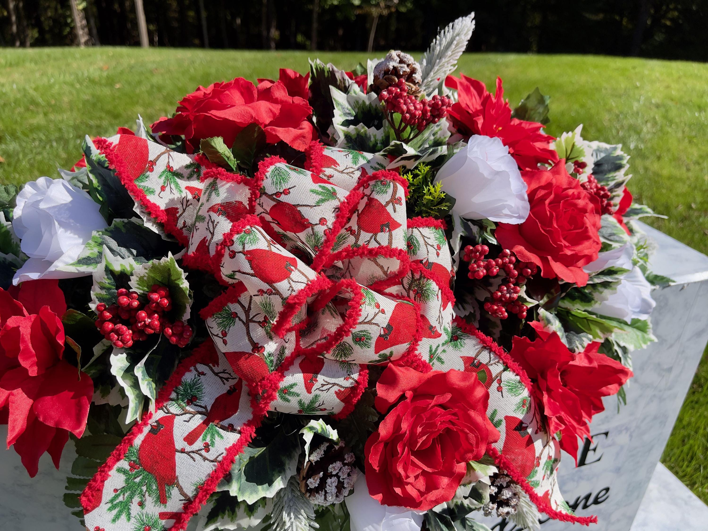 Available to Ship ASAP, One-of-a-Kind Cardinal Bow, Berries and Pinecones Christmas Cemetery Saddle, Christmas Cemetery Flowers, Headstone