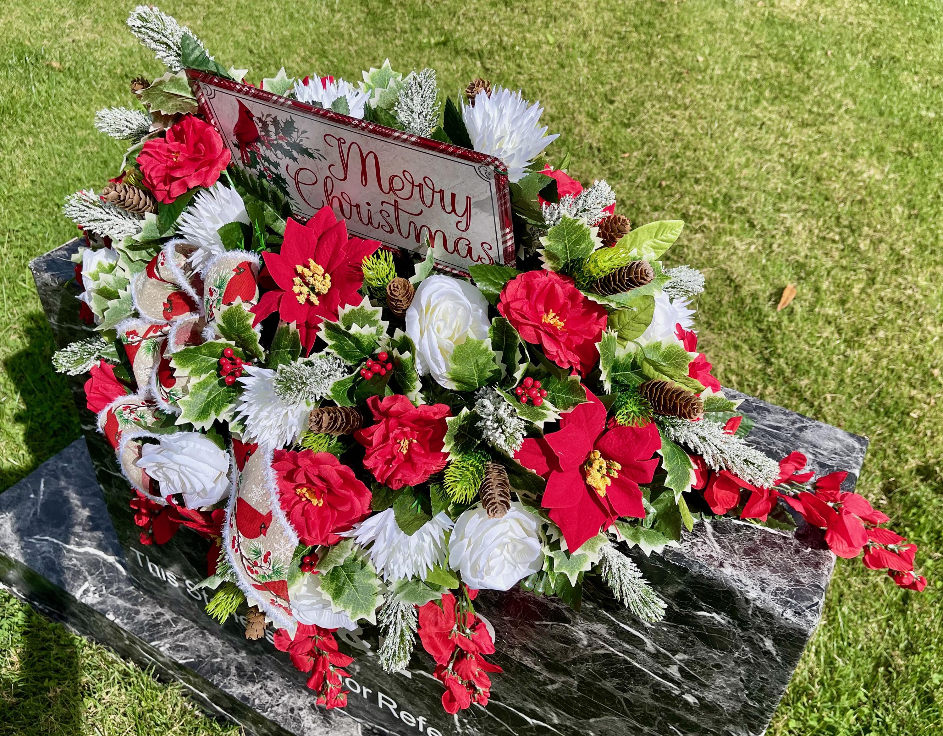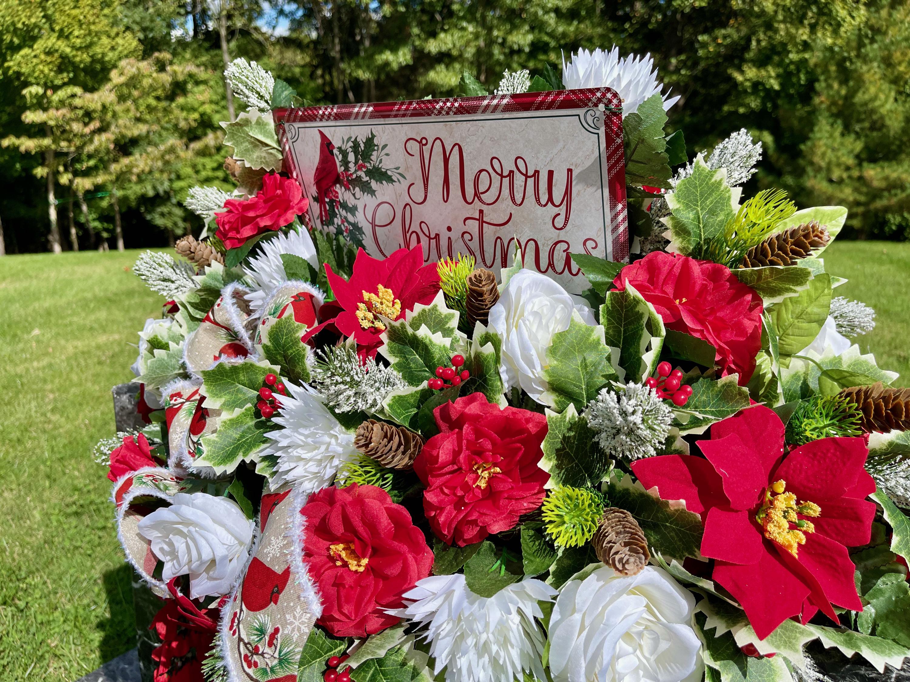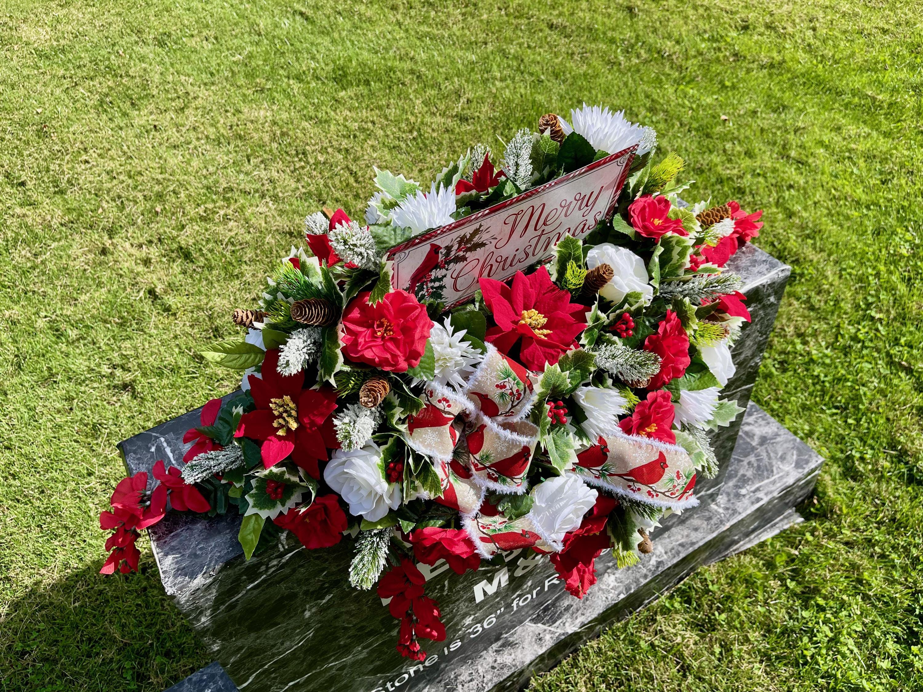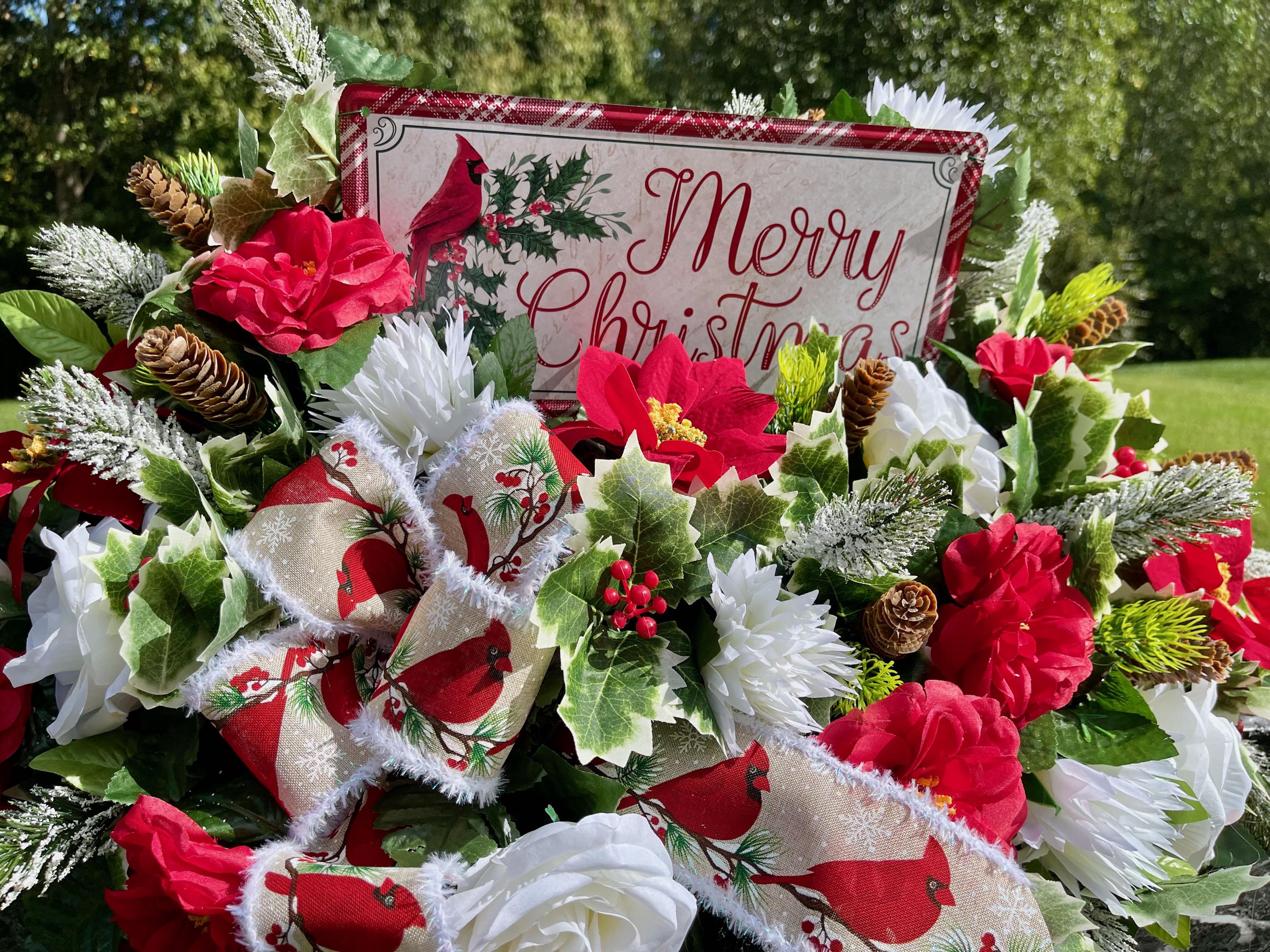 Merry Christmas Cardinal Sign Bow Christmas Cemetery Saddle Christmas, Christmas Cemetery Flowers, Christmas Headstone Saddle Arrangement