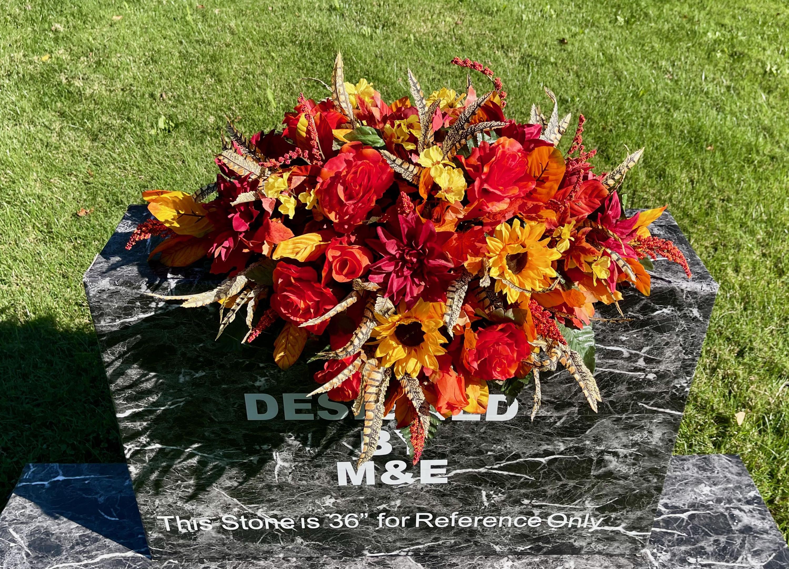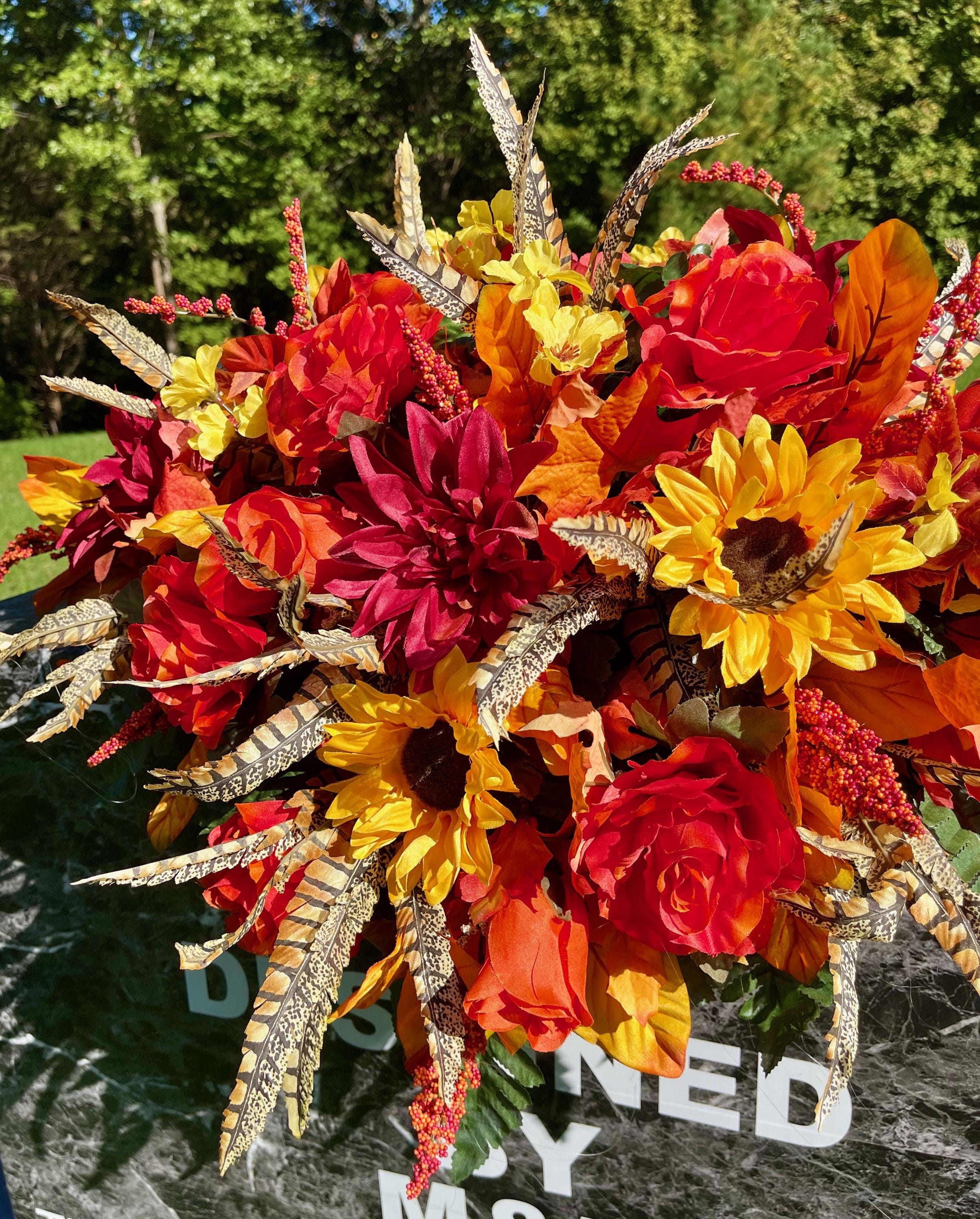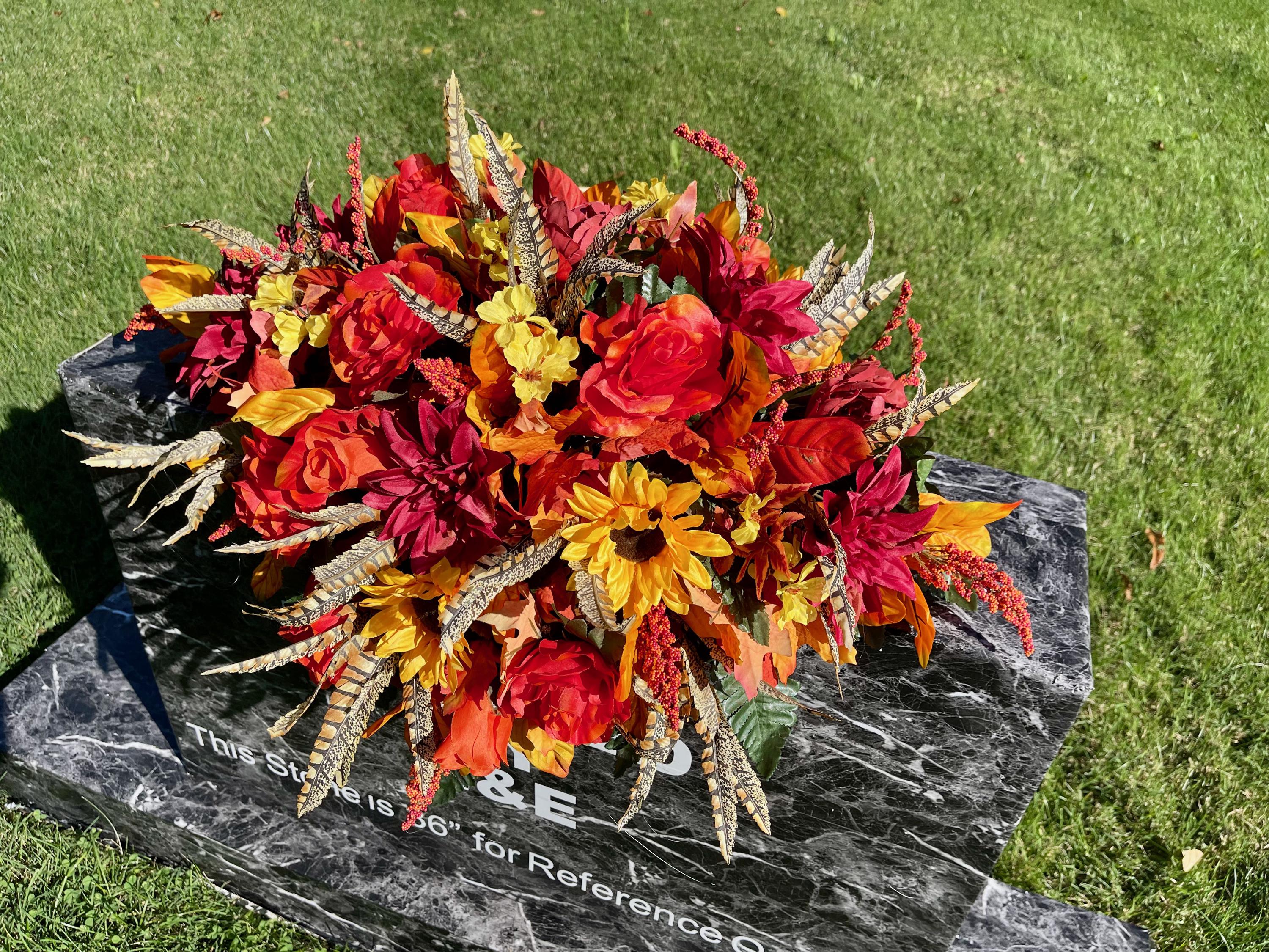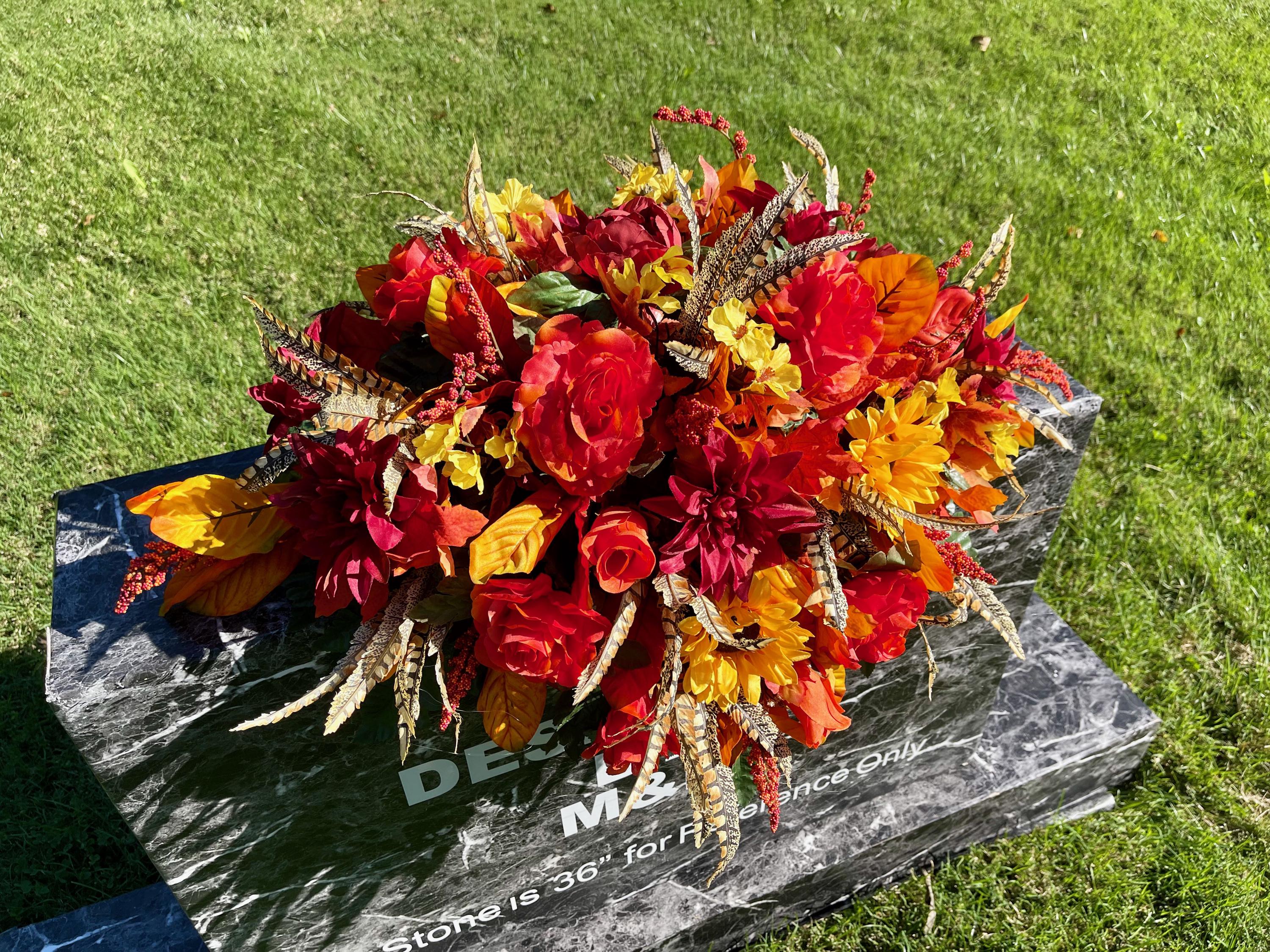 Beautiful Fall Colors Cemetery Saddle: Orange Yellow and Burgundy Silk Flowers Headstone Arrangement