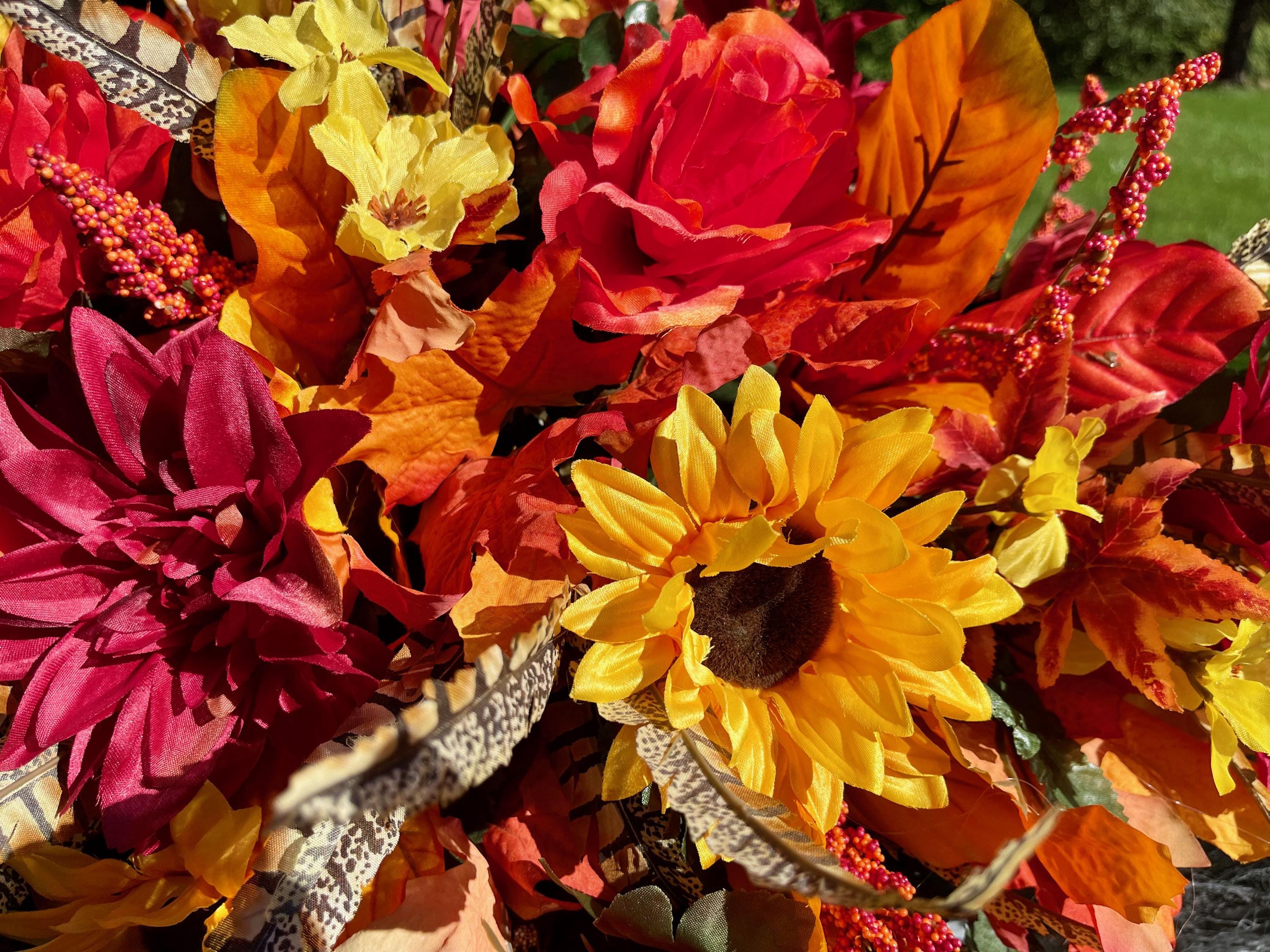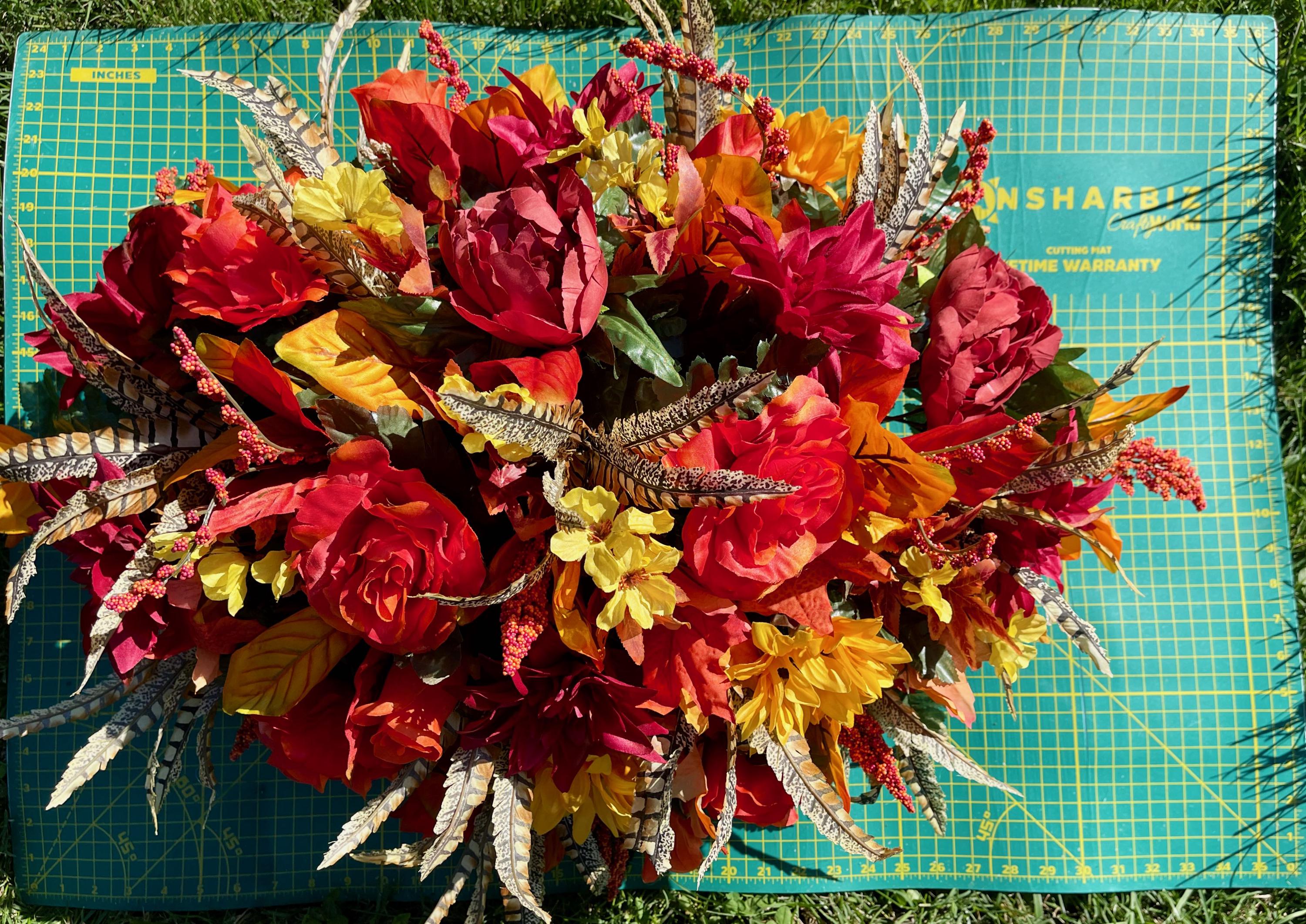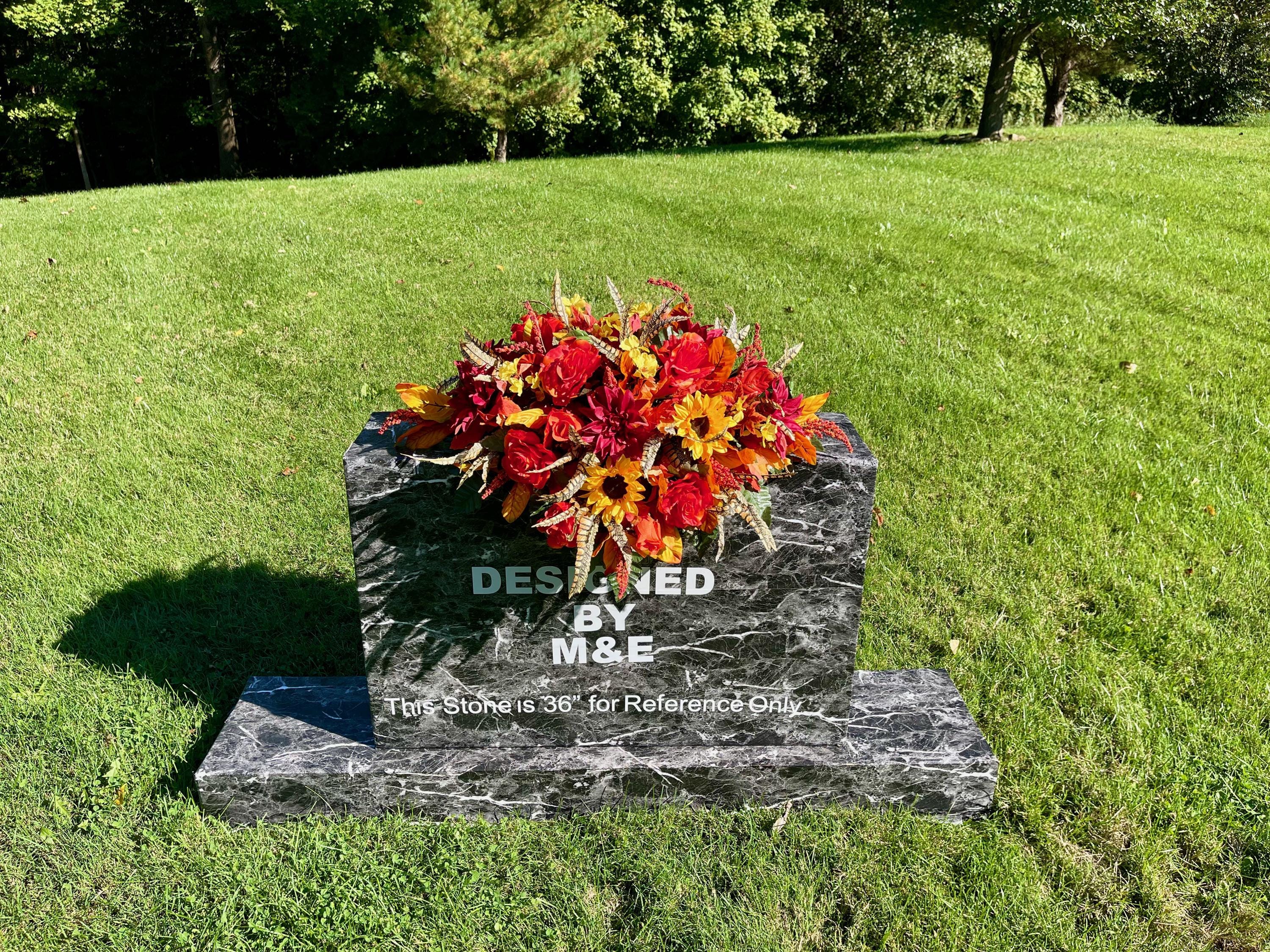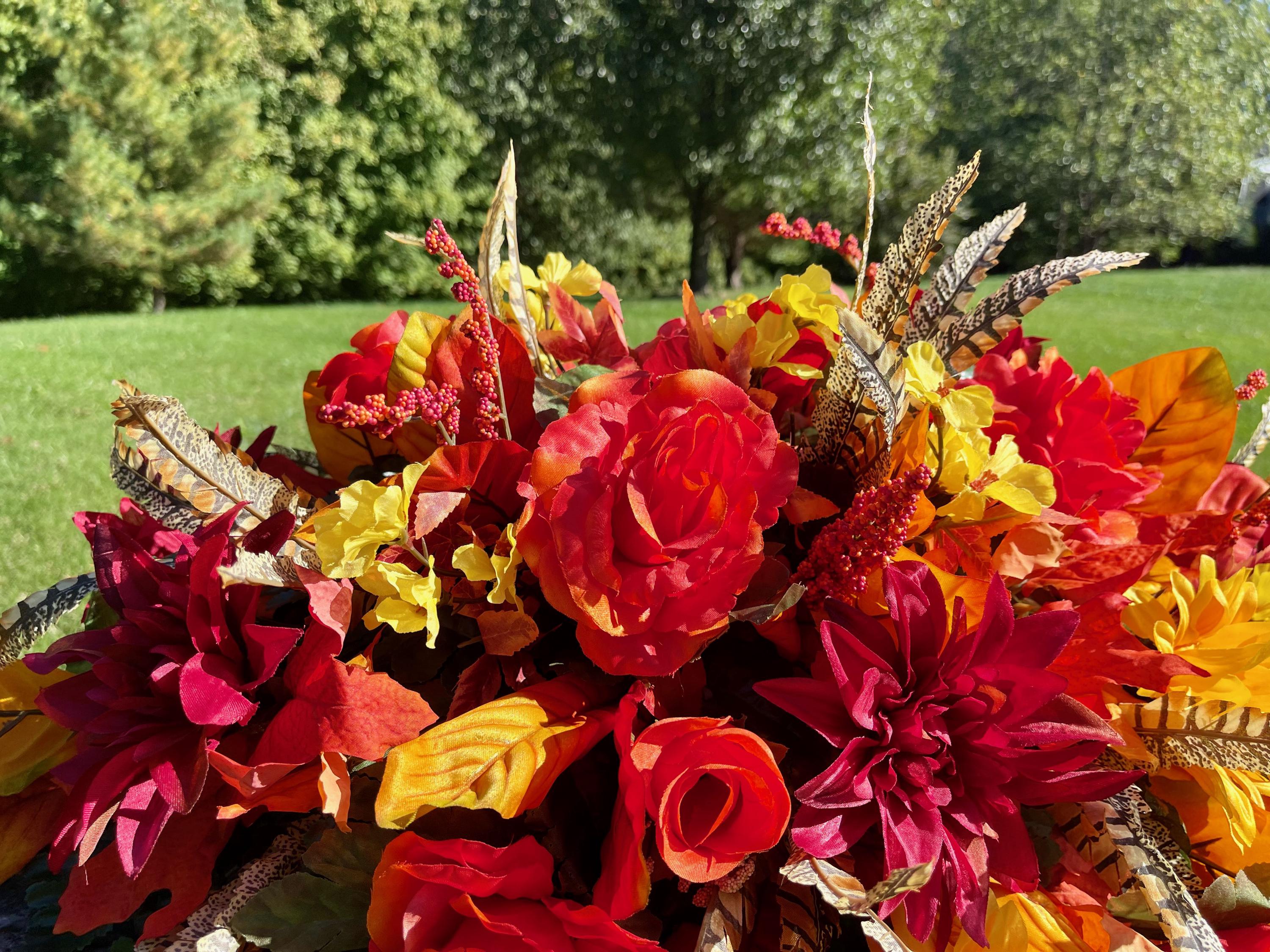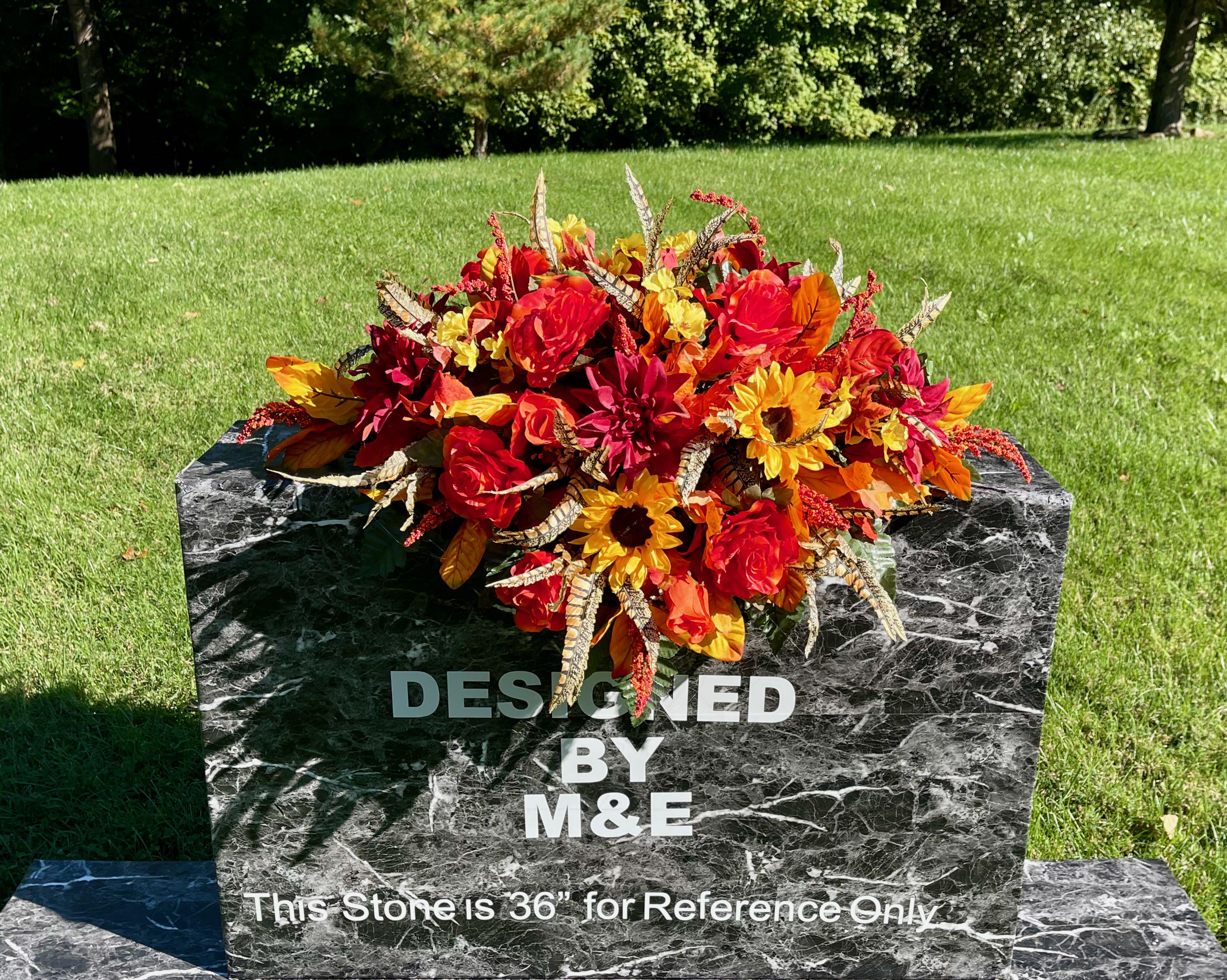 Beautiful Fall Colors Cemetery Saddle: Orange Yellow and Burgundy Silk Flowers Headstone Arrangement