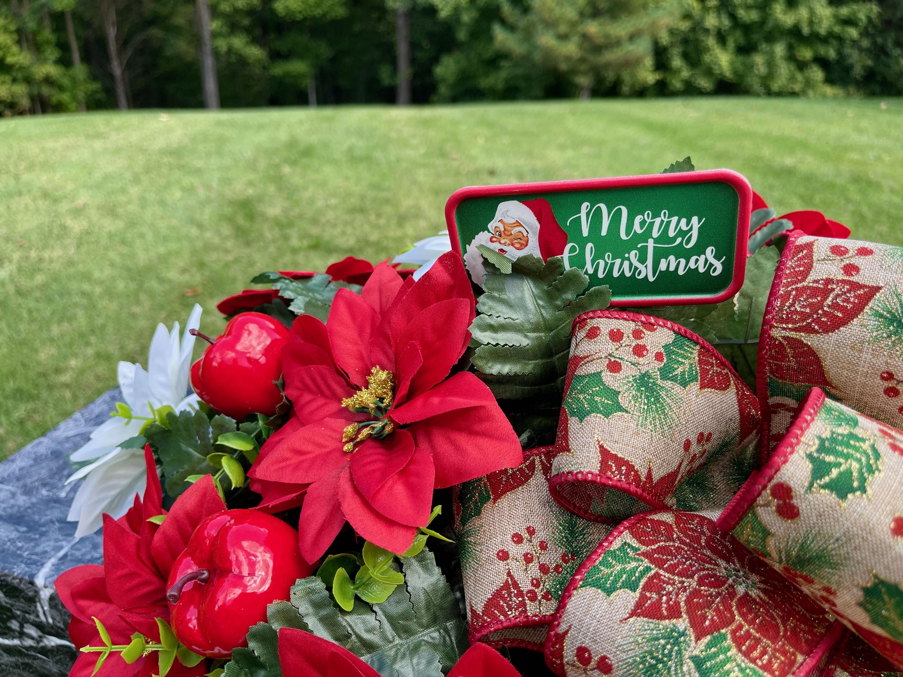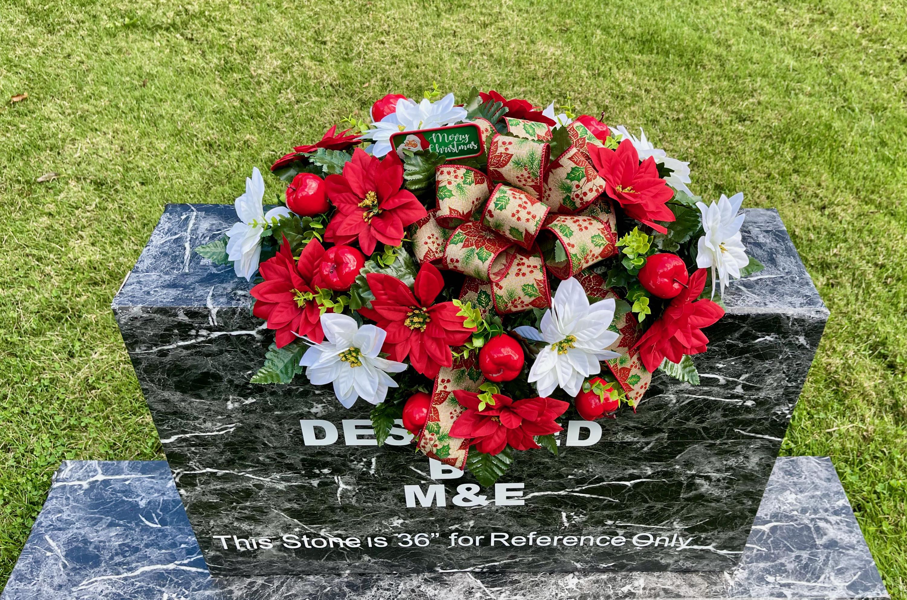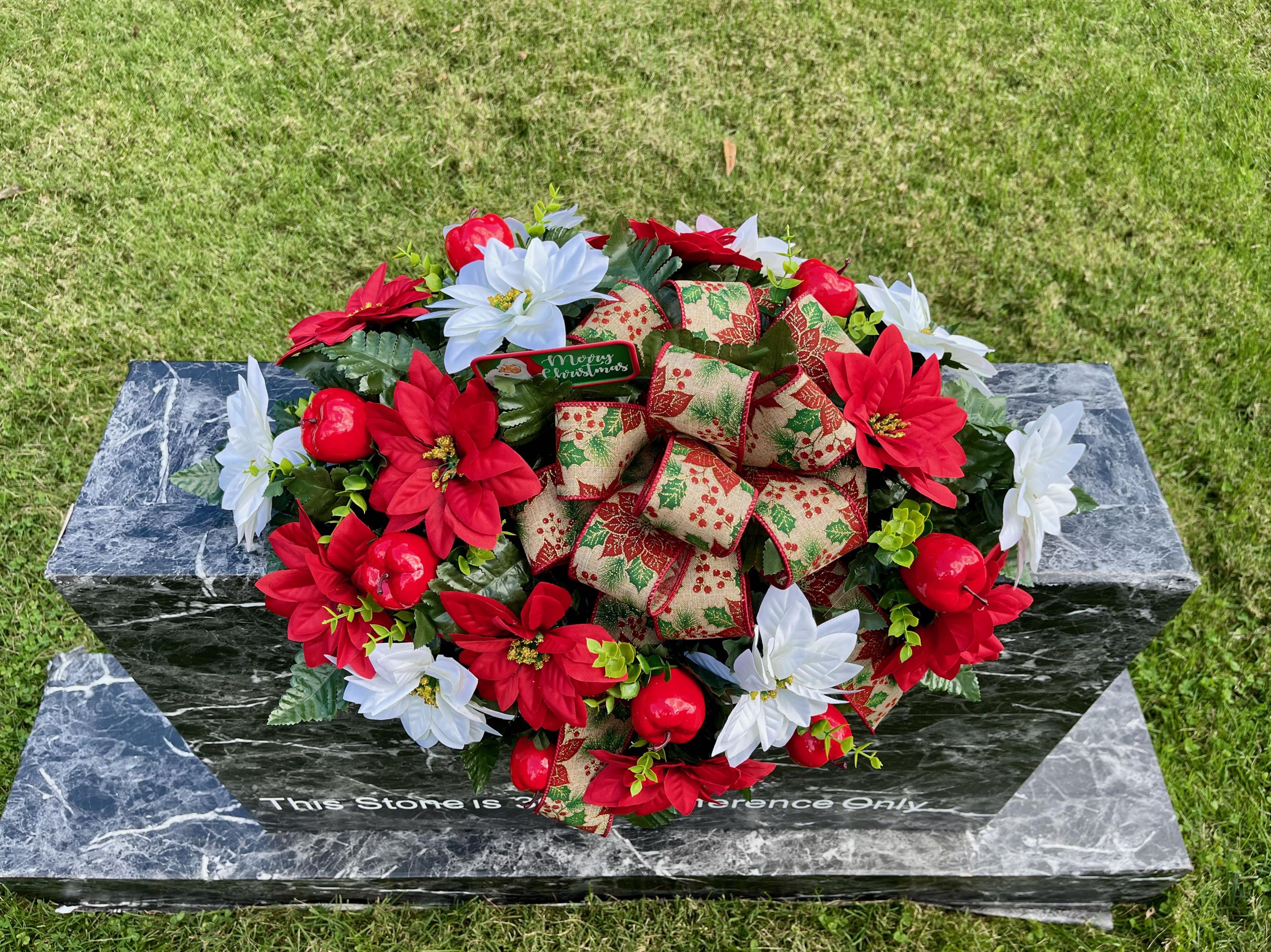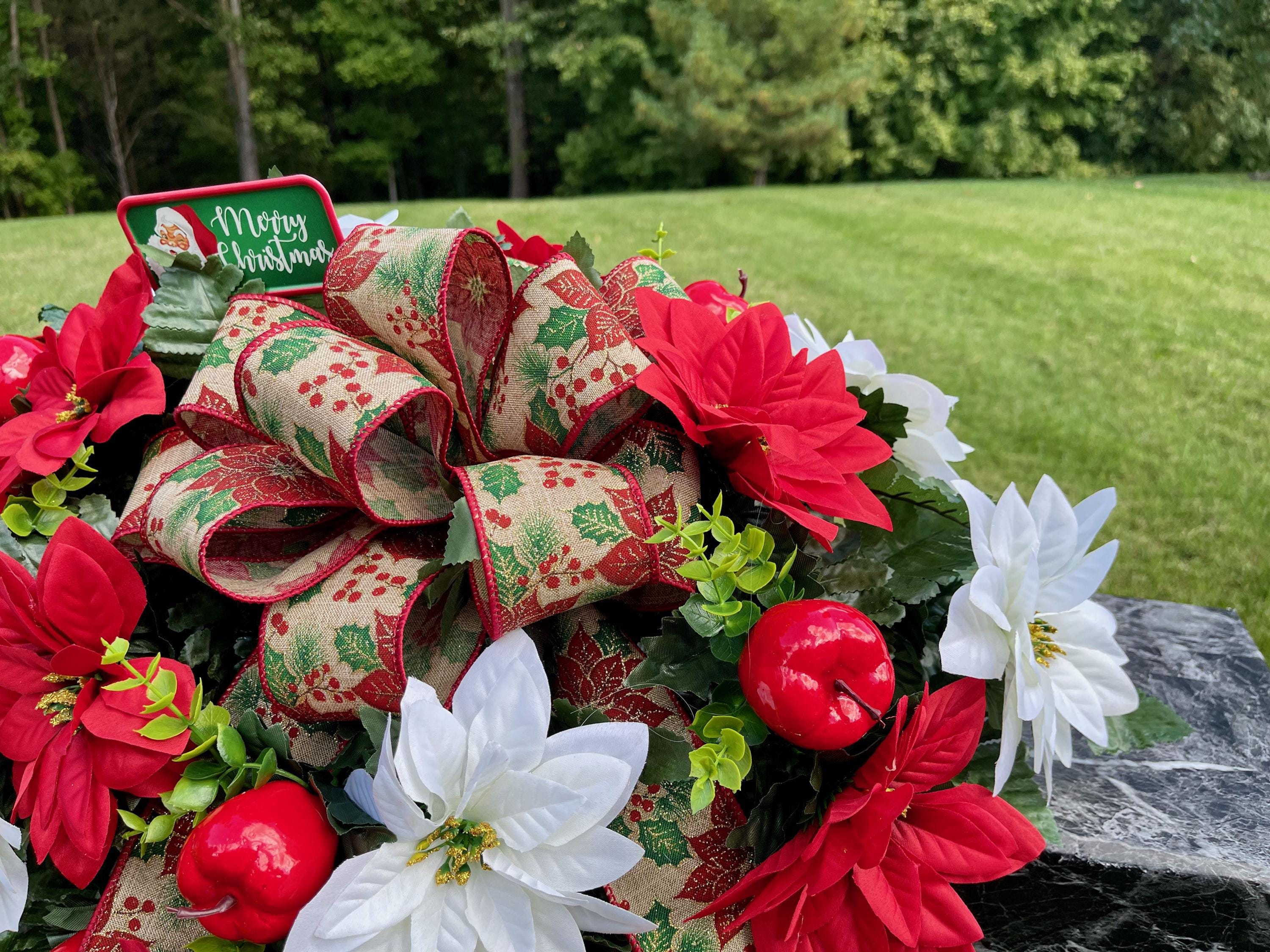 Christmas Cemetery Saddle: Merry Christmas Sign with Apples & Bow Memorial Flowers