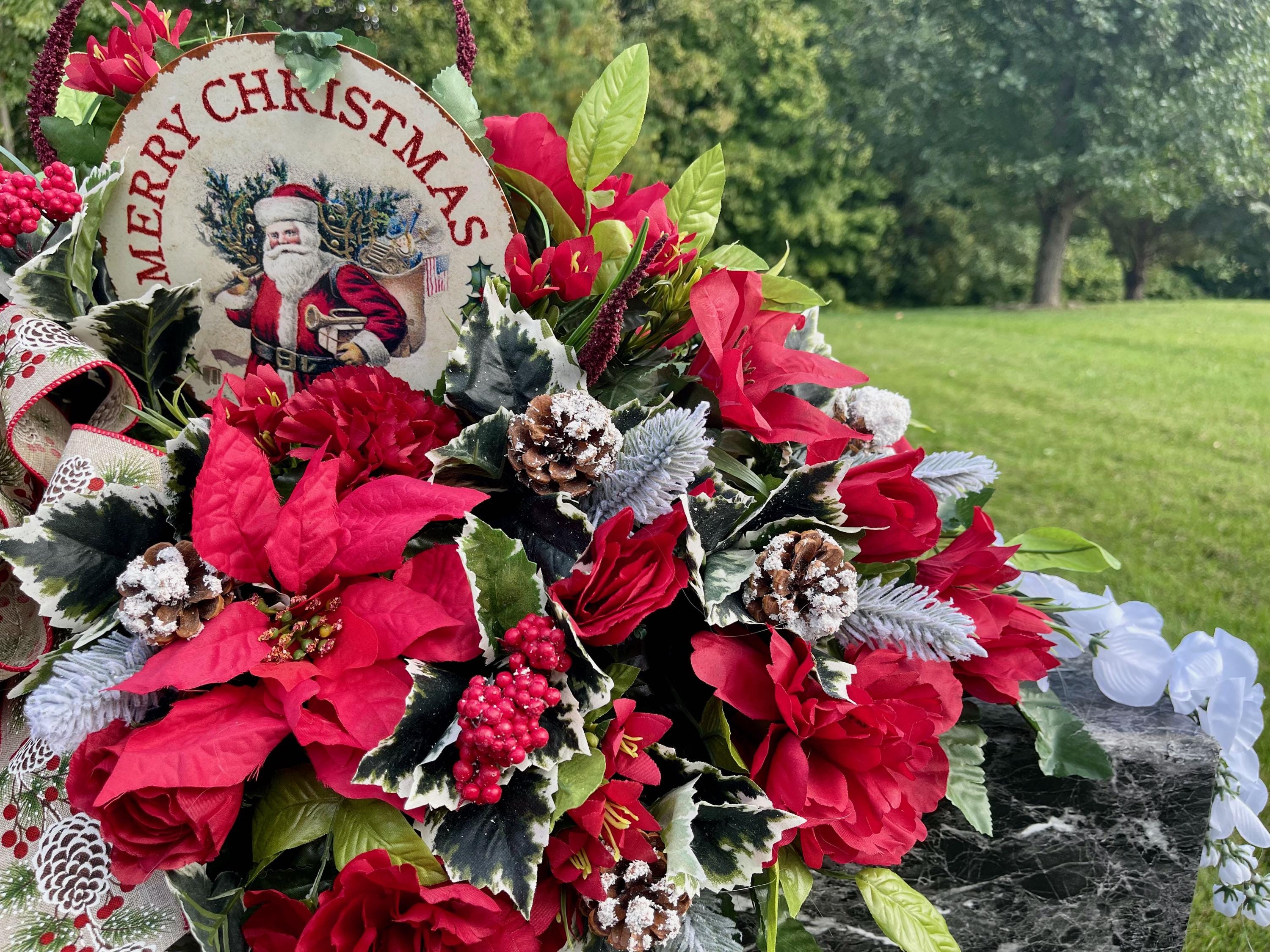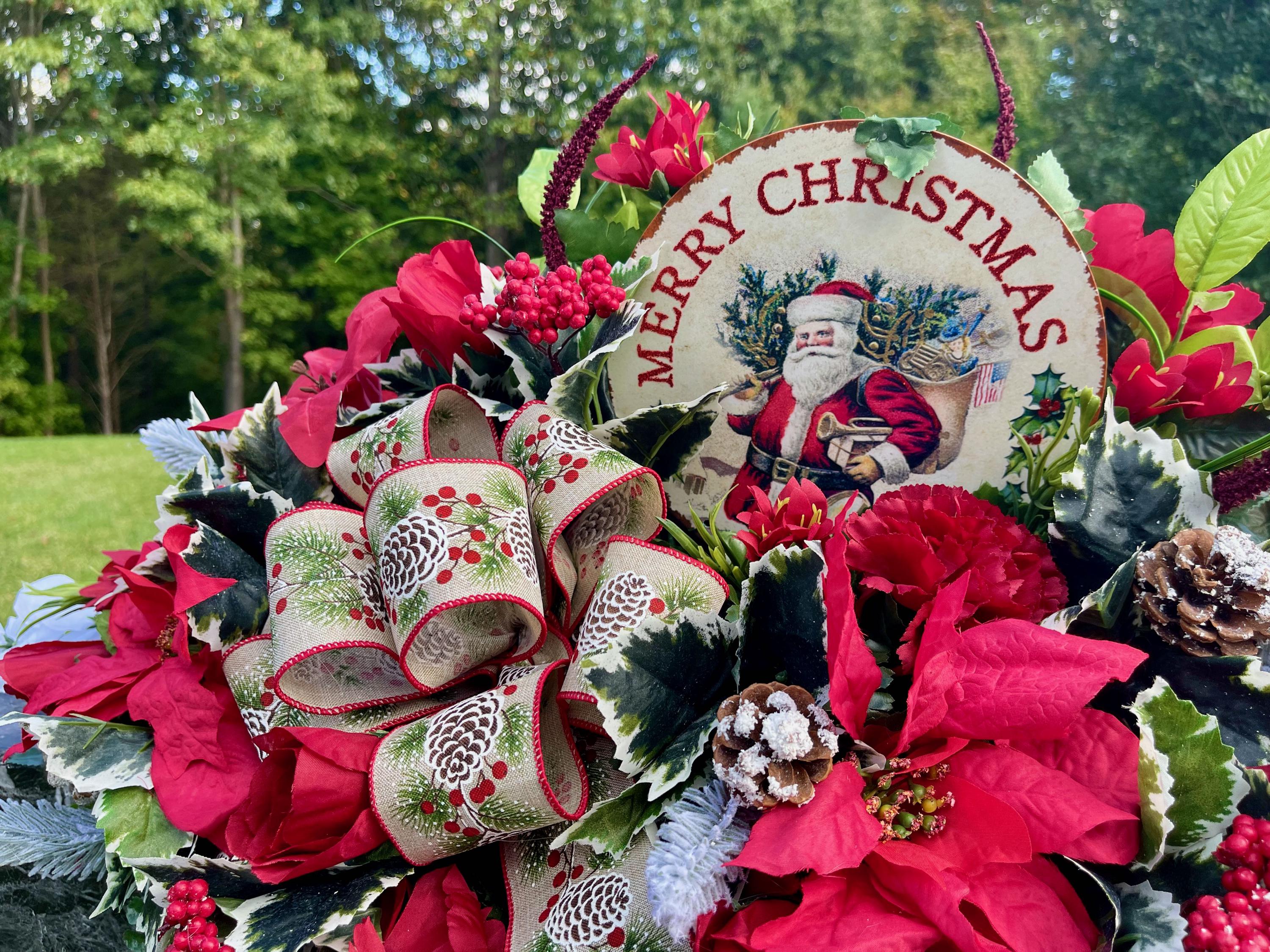 Large Christmas Cemetery Saddle: Patriotic Santa on Metal Sign & Bow Memorial Flowers