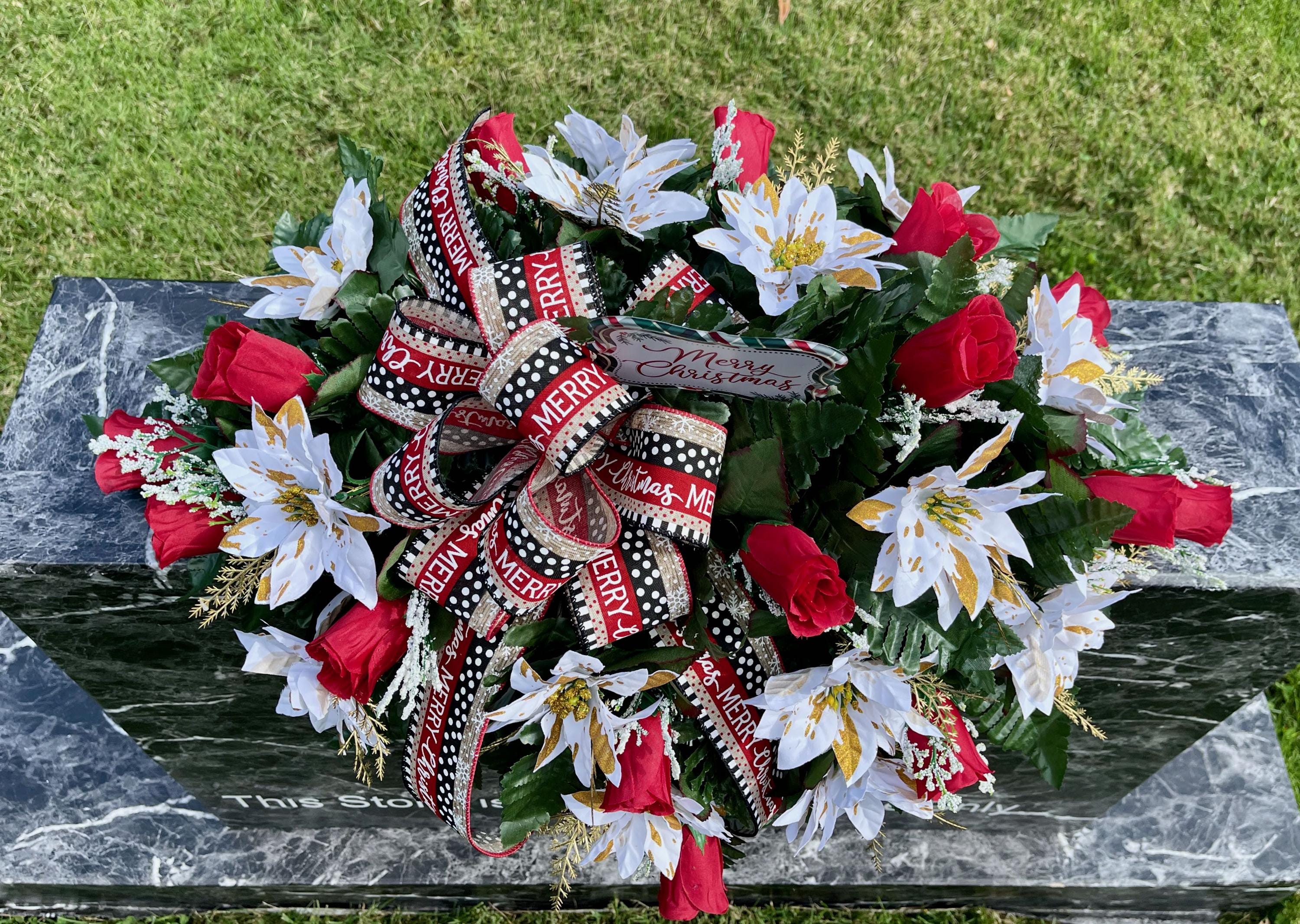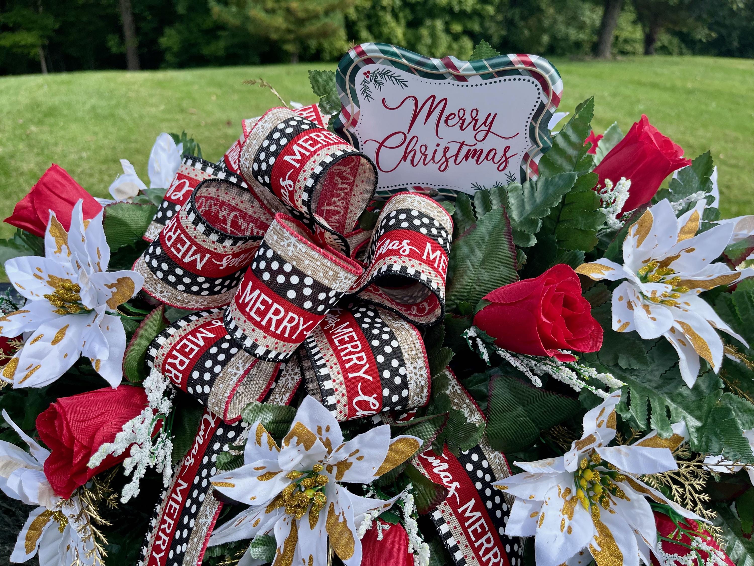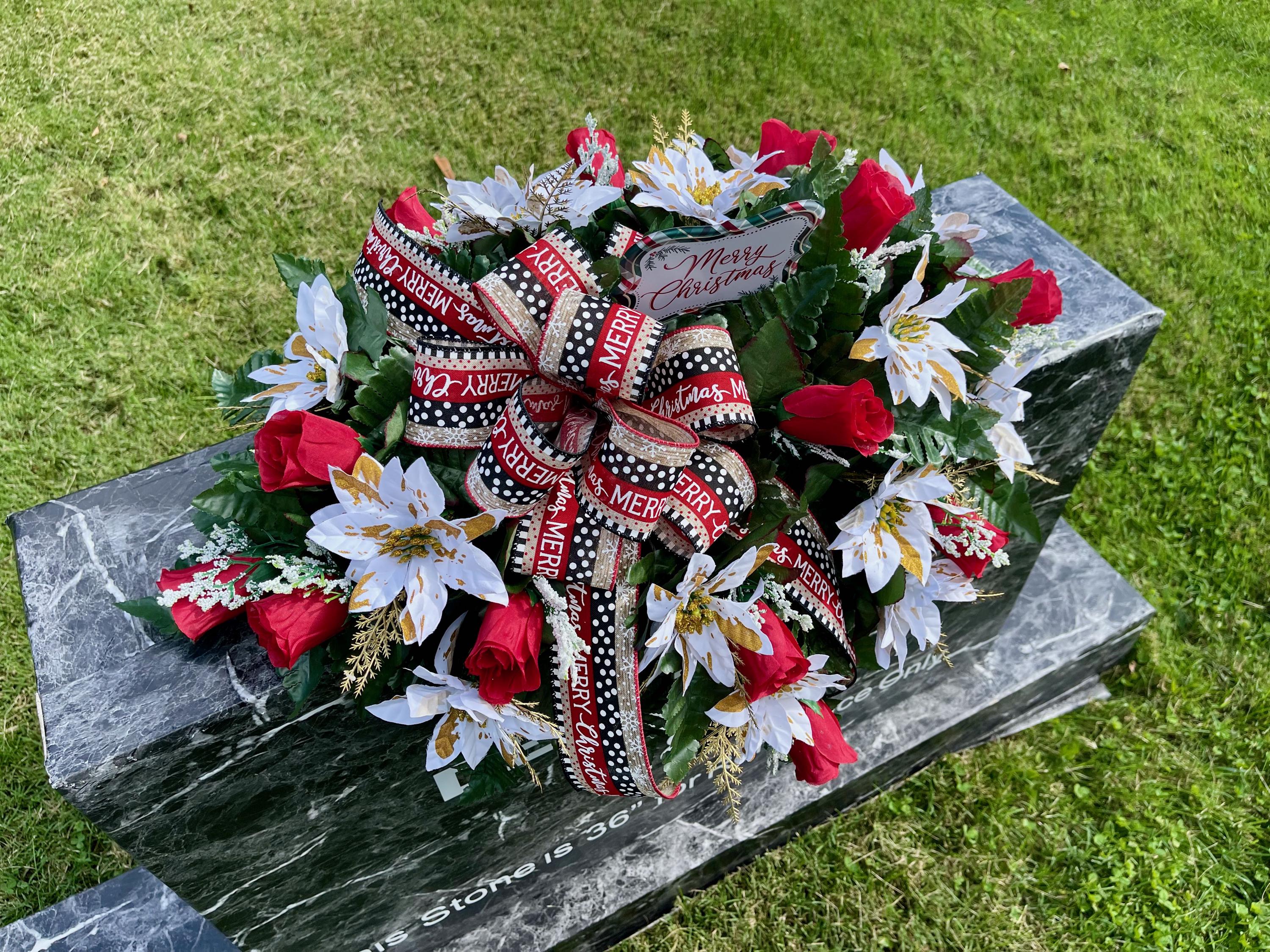Christmas Cemetery Saddle: Merry Christmas Sign with Merry Christmas Bow Memorial Flowers
