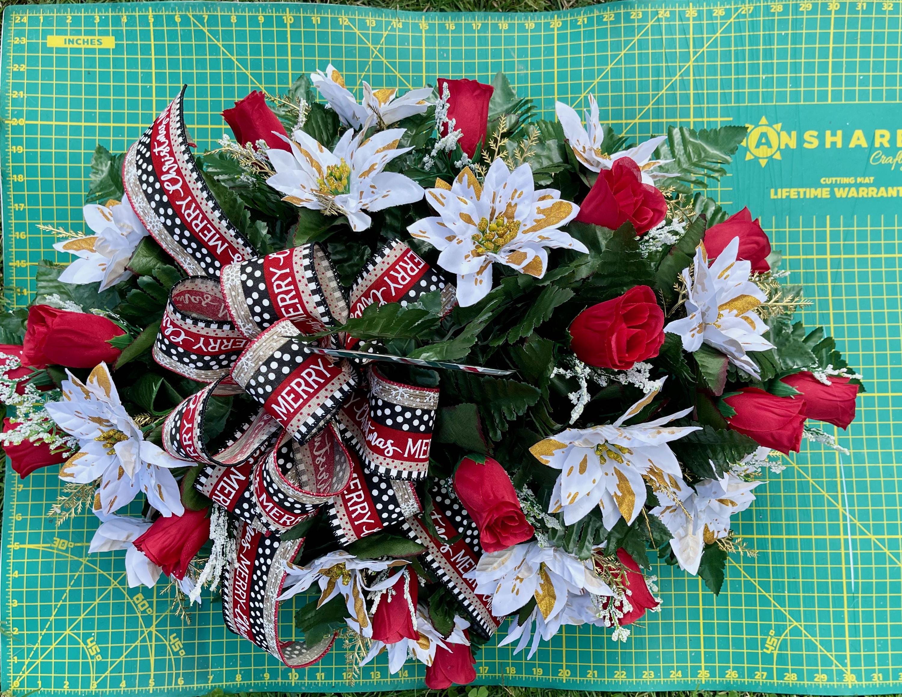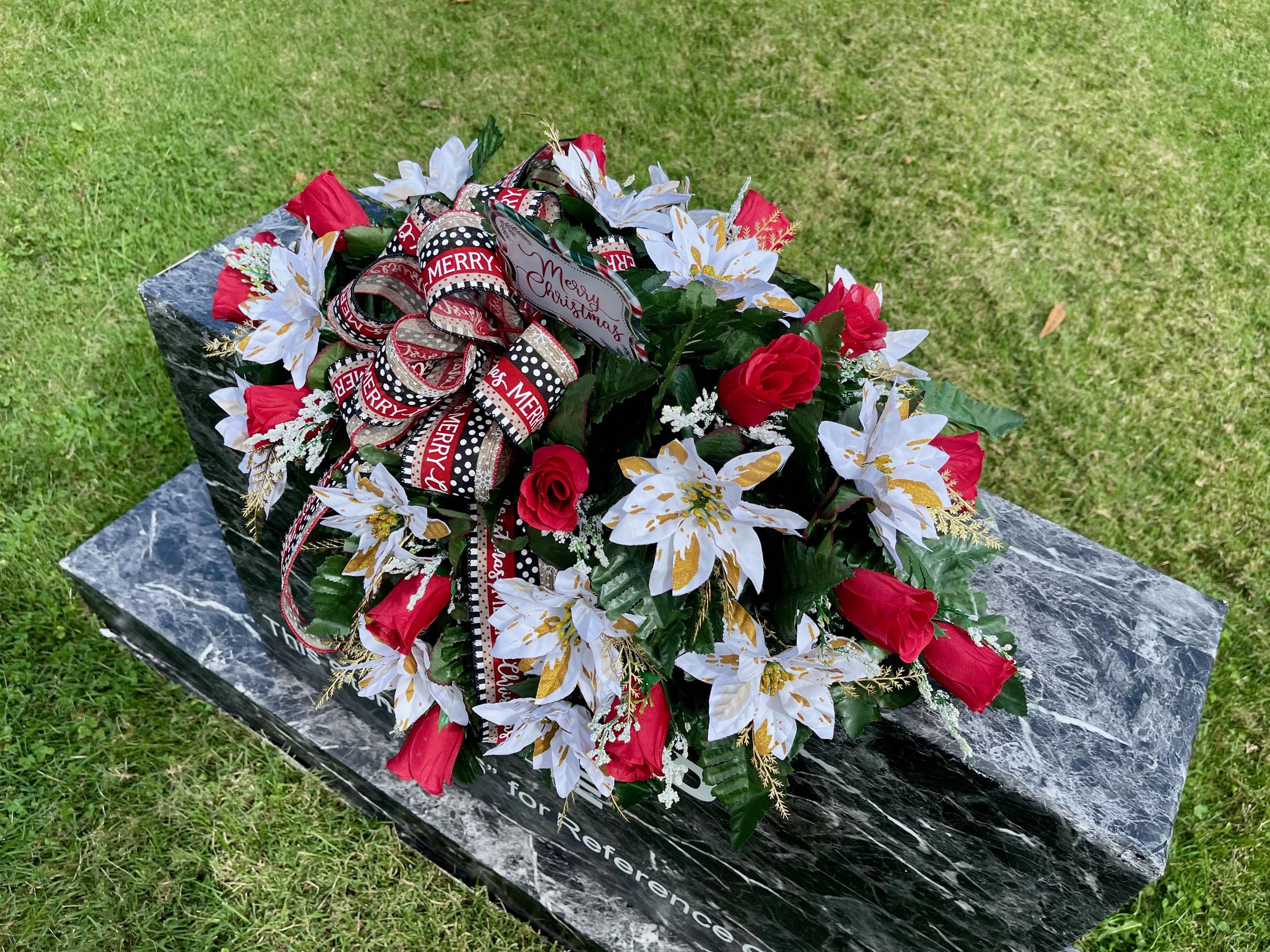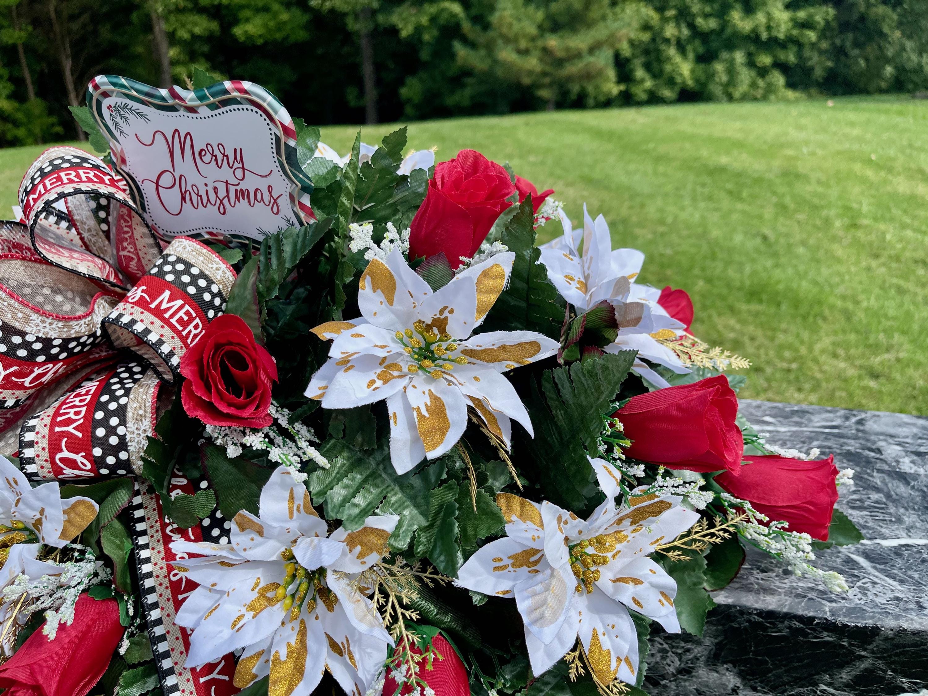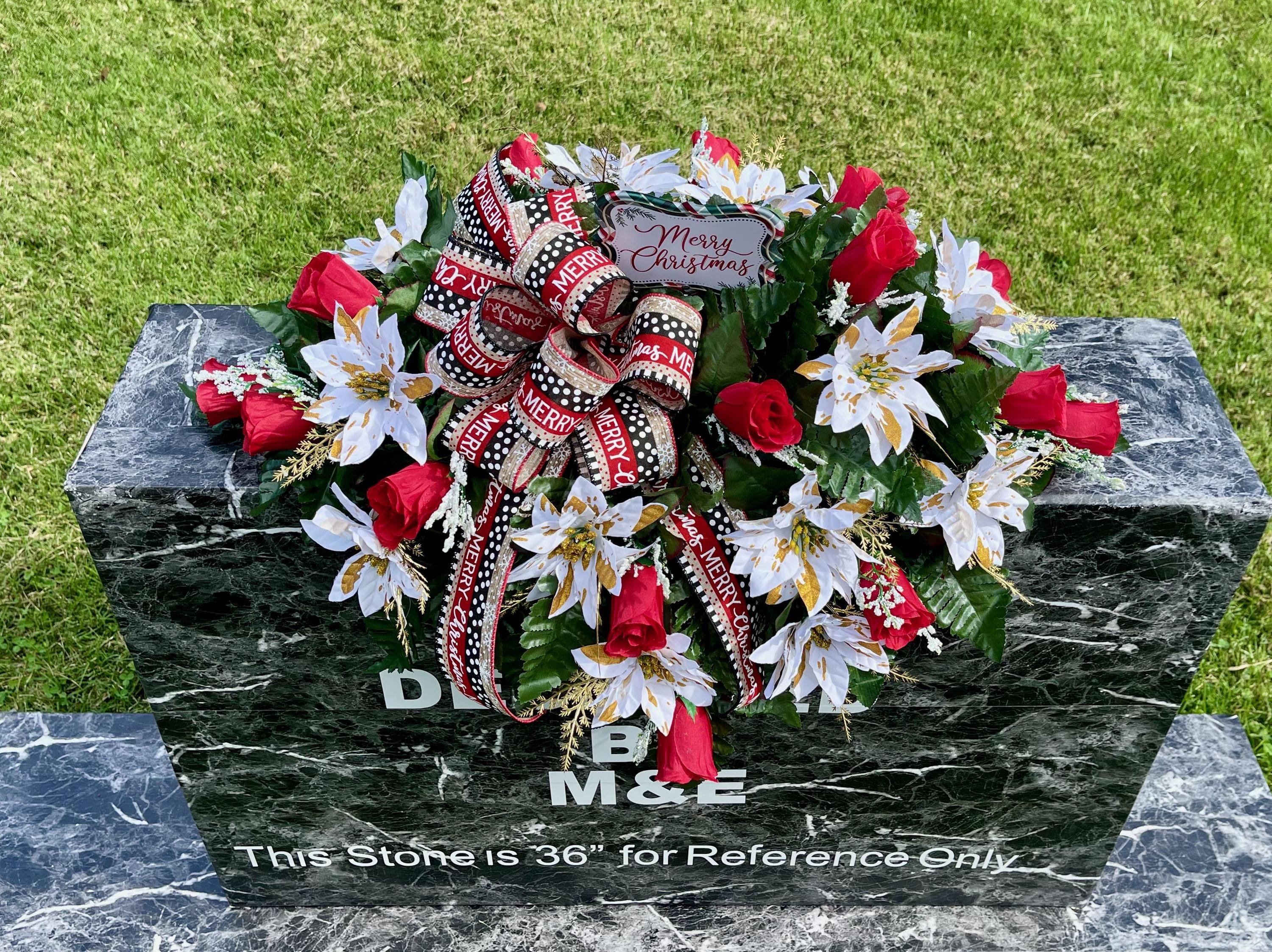 Christmas Cemetery Saddle: Merry Christmas Sign with Merry Christmas Bow Memorial Flowers