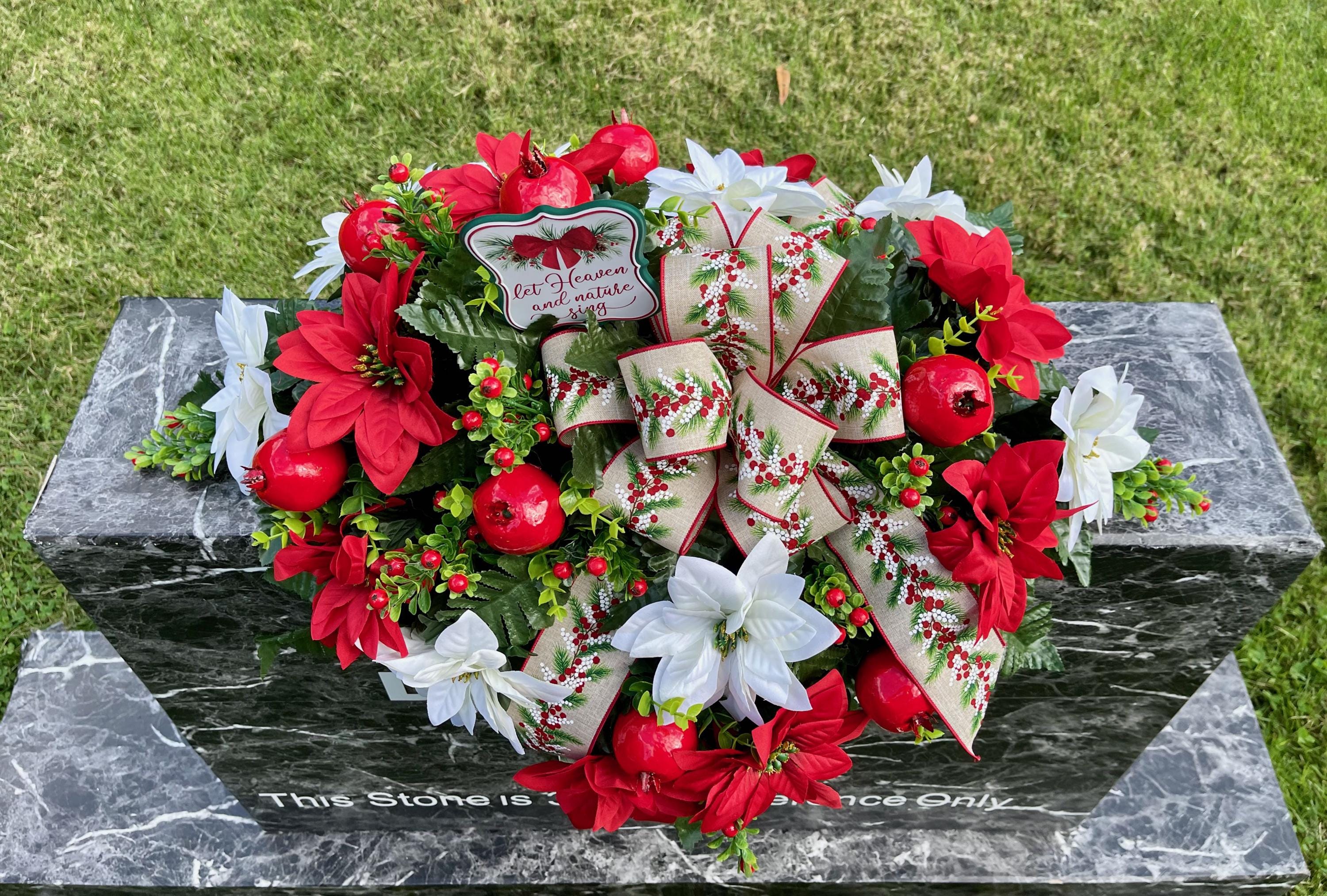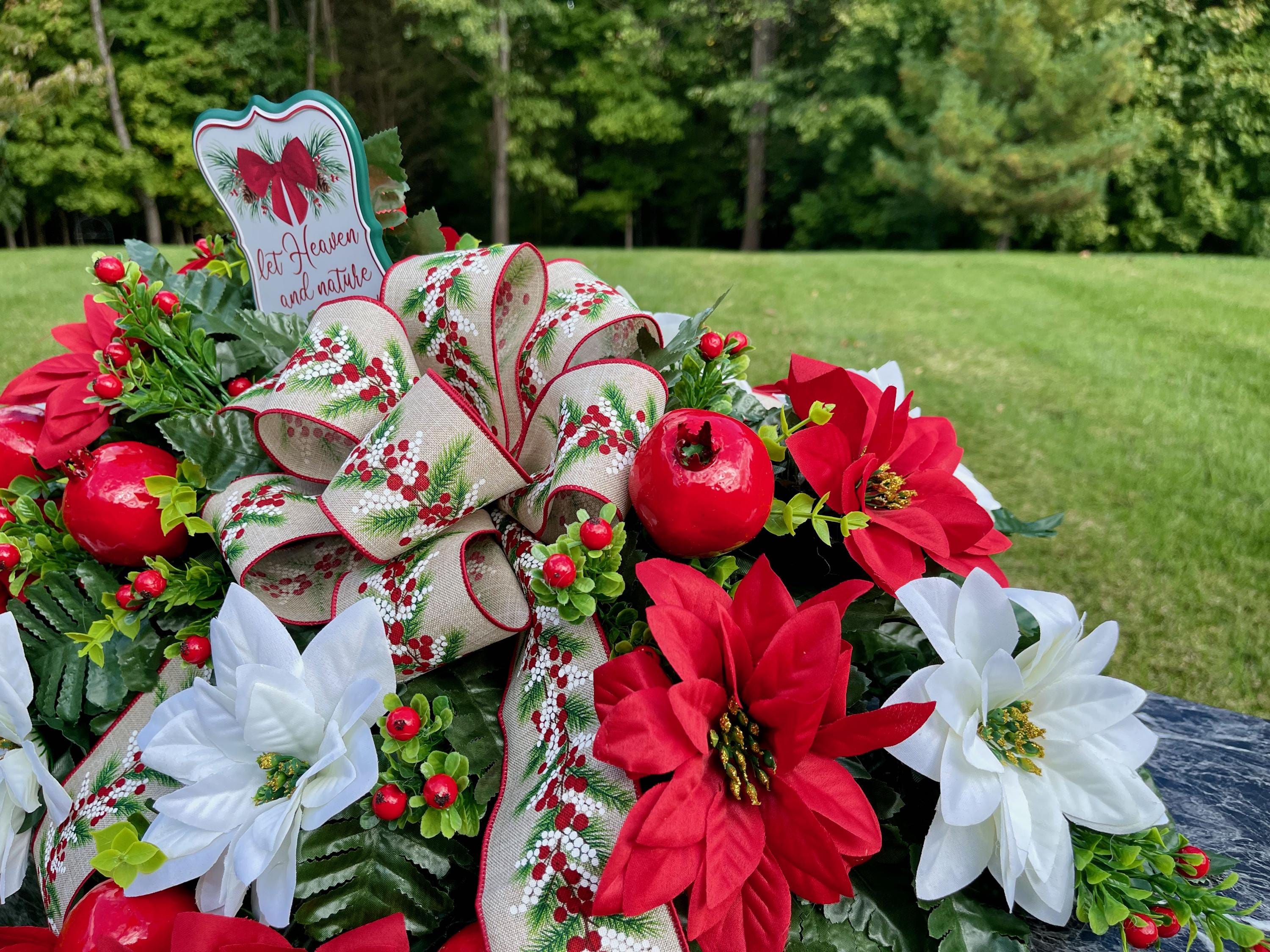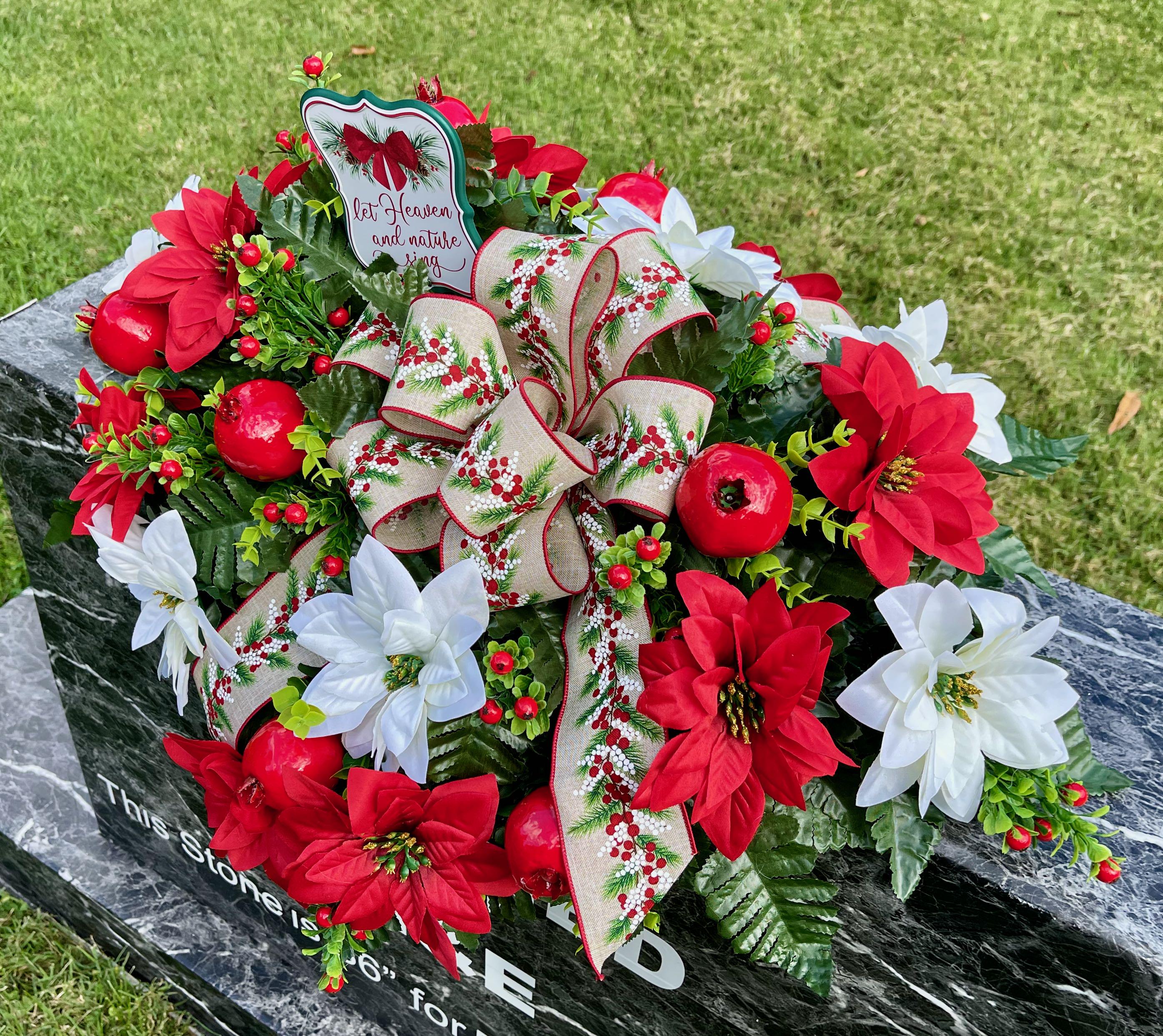 Christmas Cemetery Saddle: "Let Heaven and Nature Sing" sign with Bow, Silk Flowers