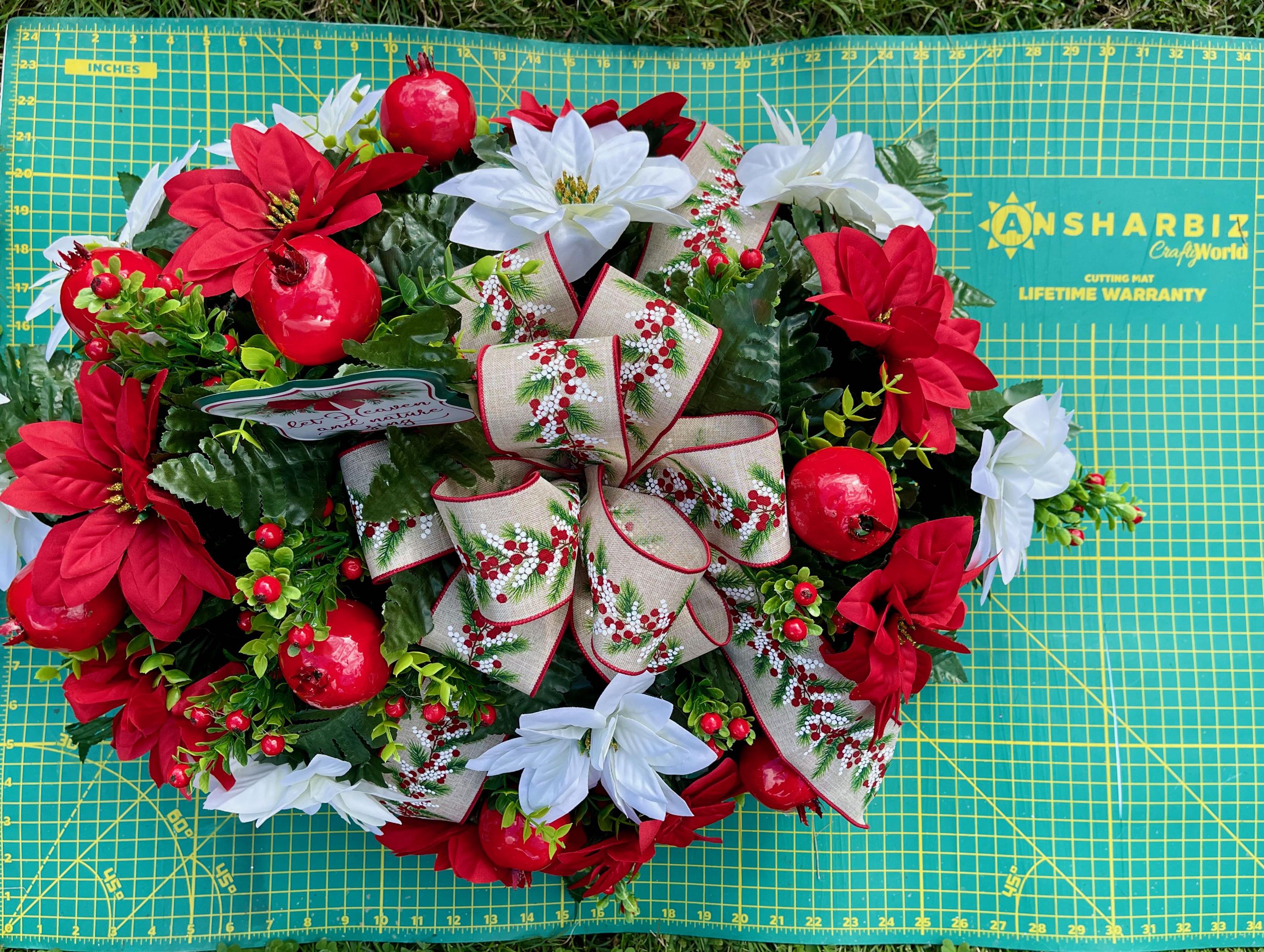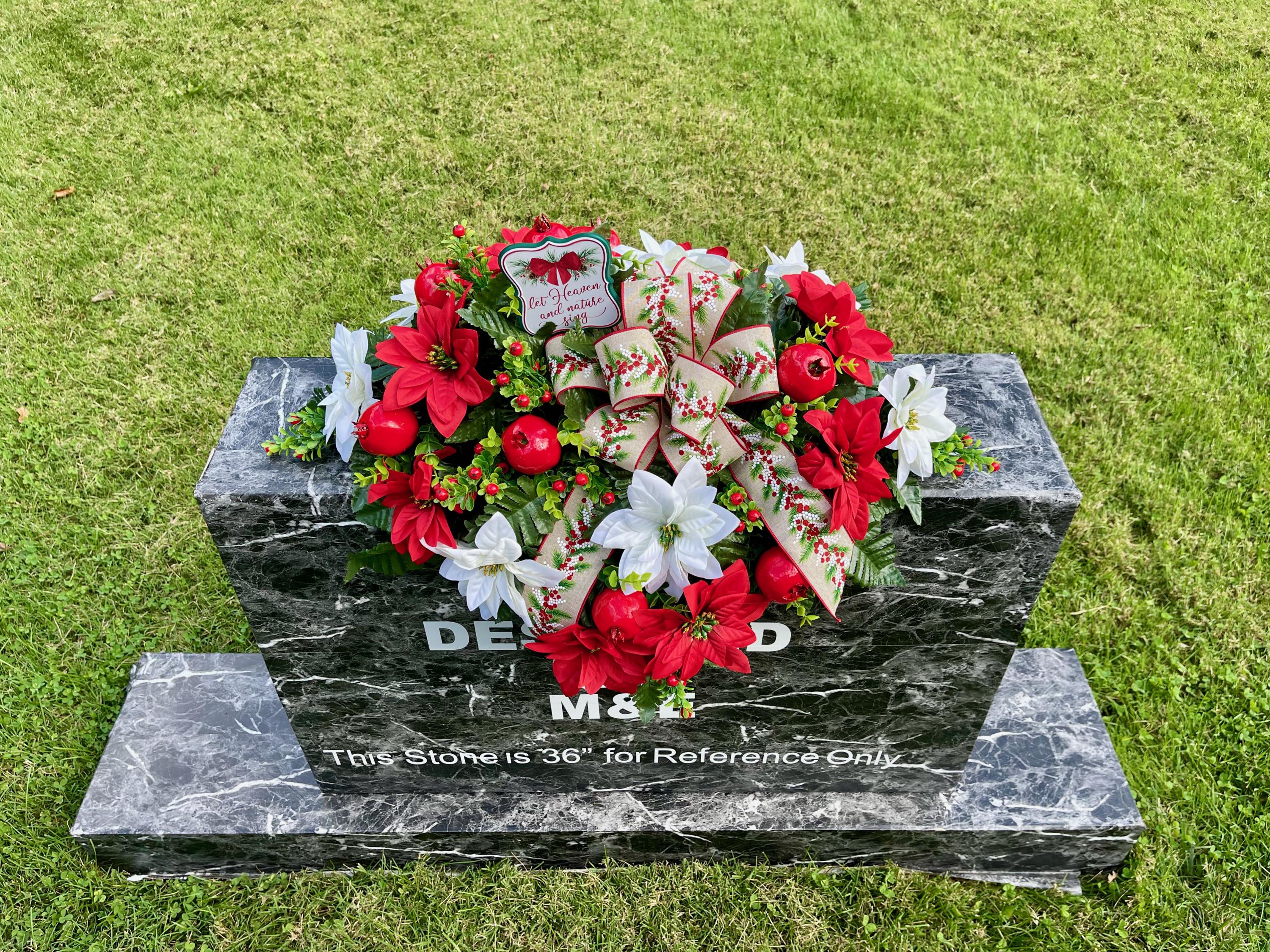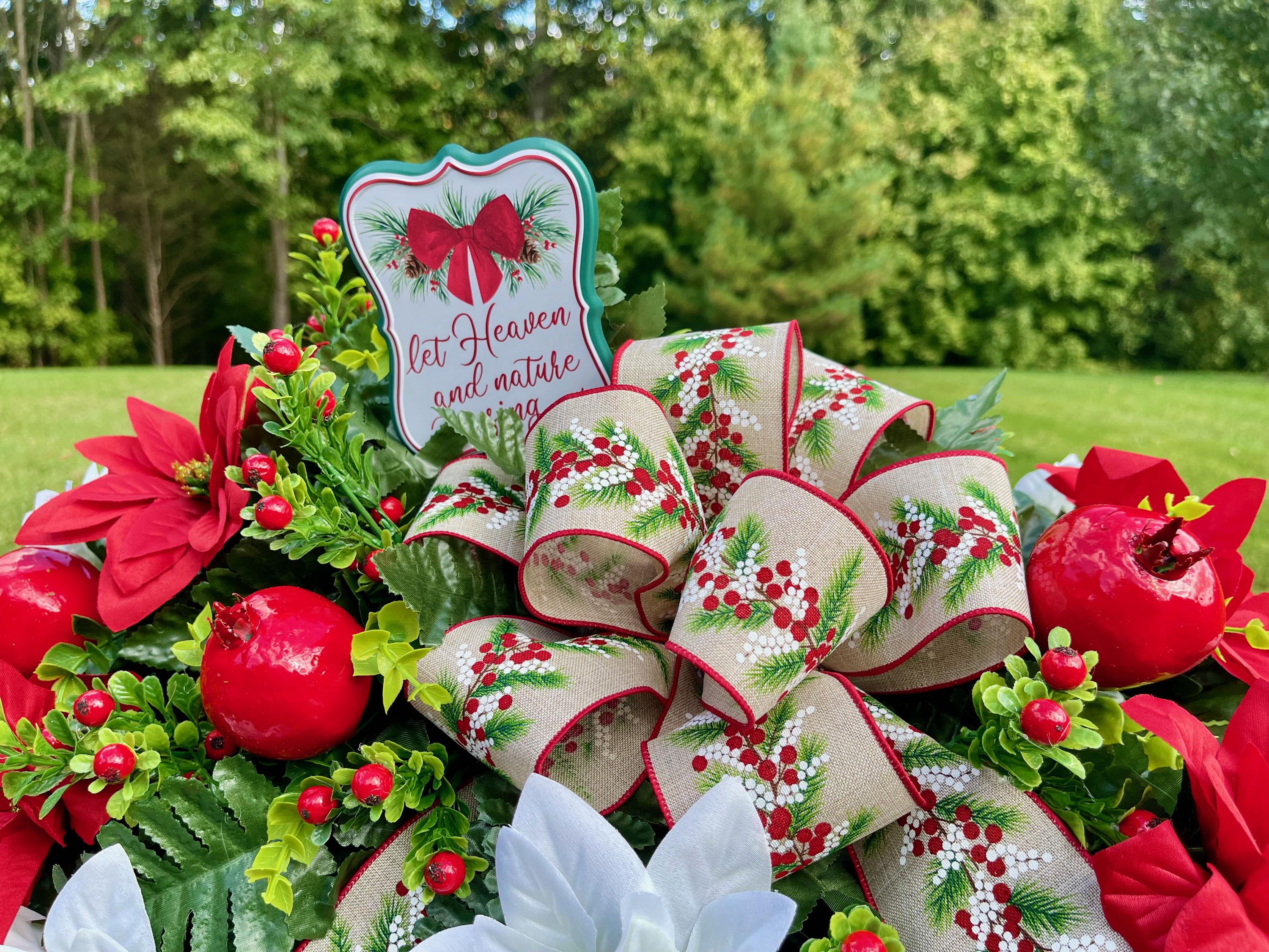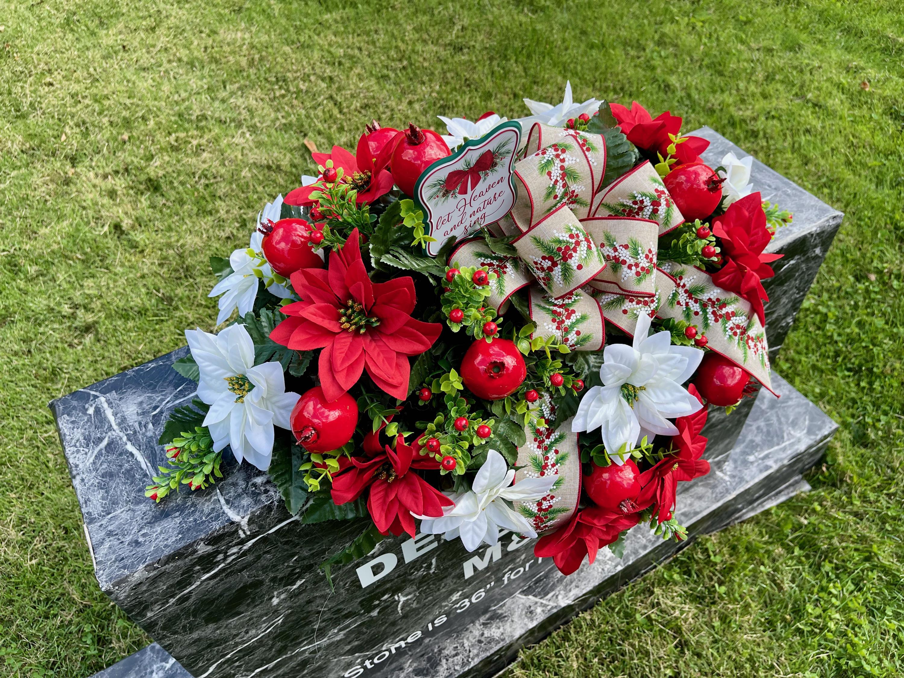 Christmas Cemetery Saddle: "Let Heaven and Nature Sing" sign with Bow, Silk Flowers