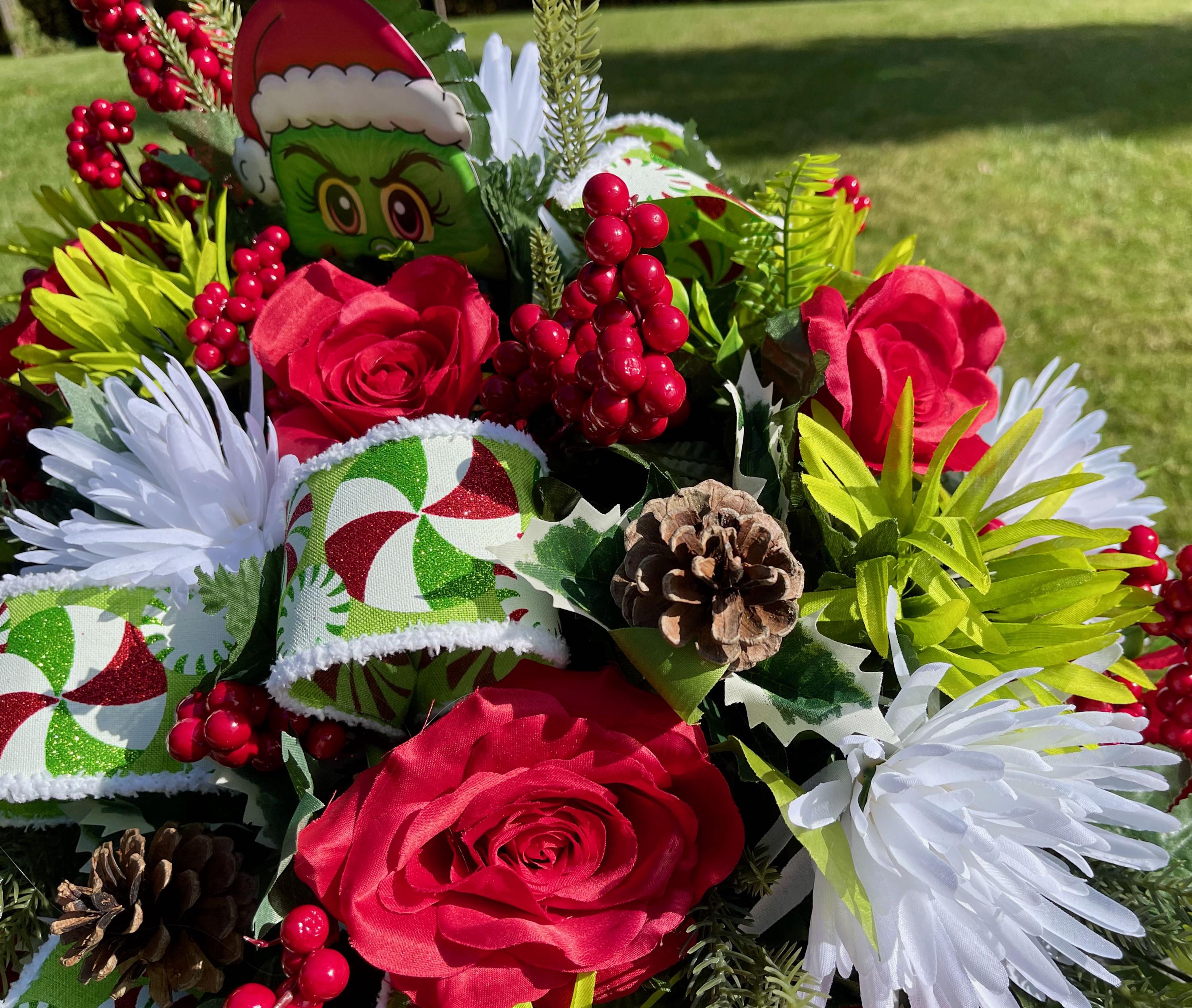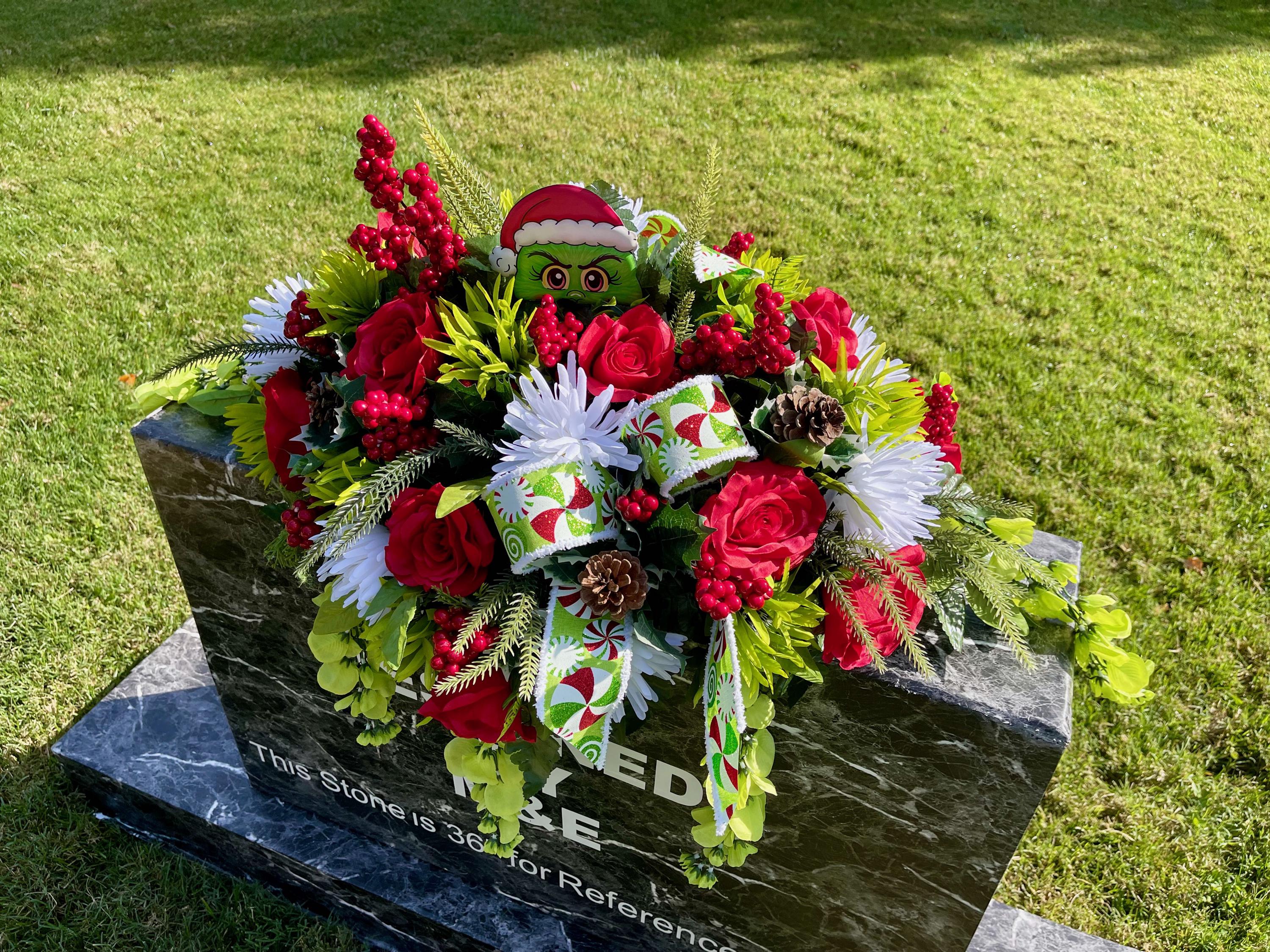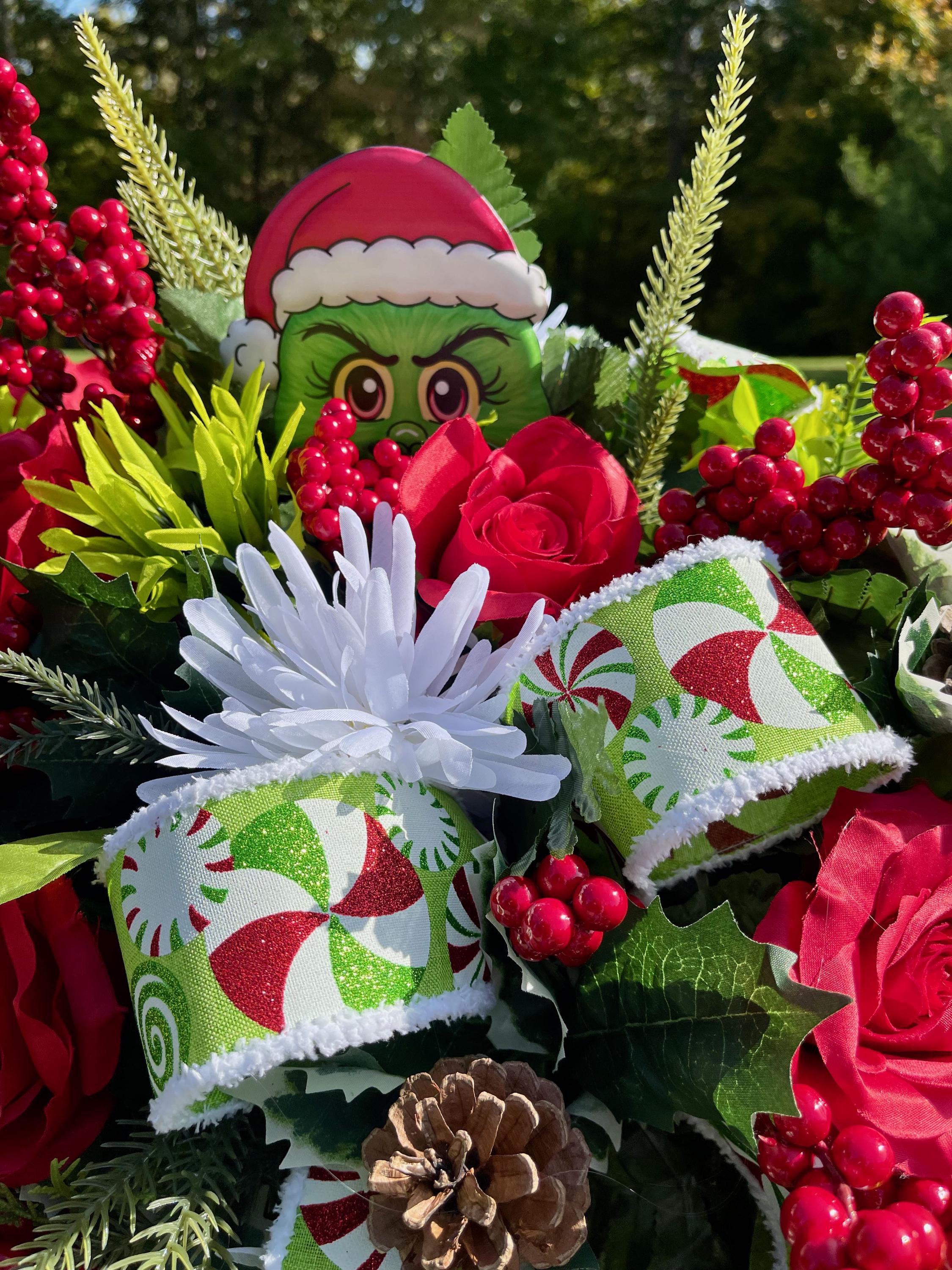 Grinch Likeness Metal Pick Christmas Cemetery Saddle: Christmas Candy Bow Memorial Flowers