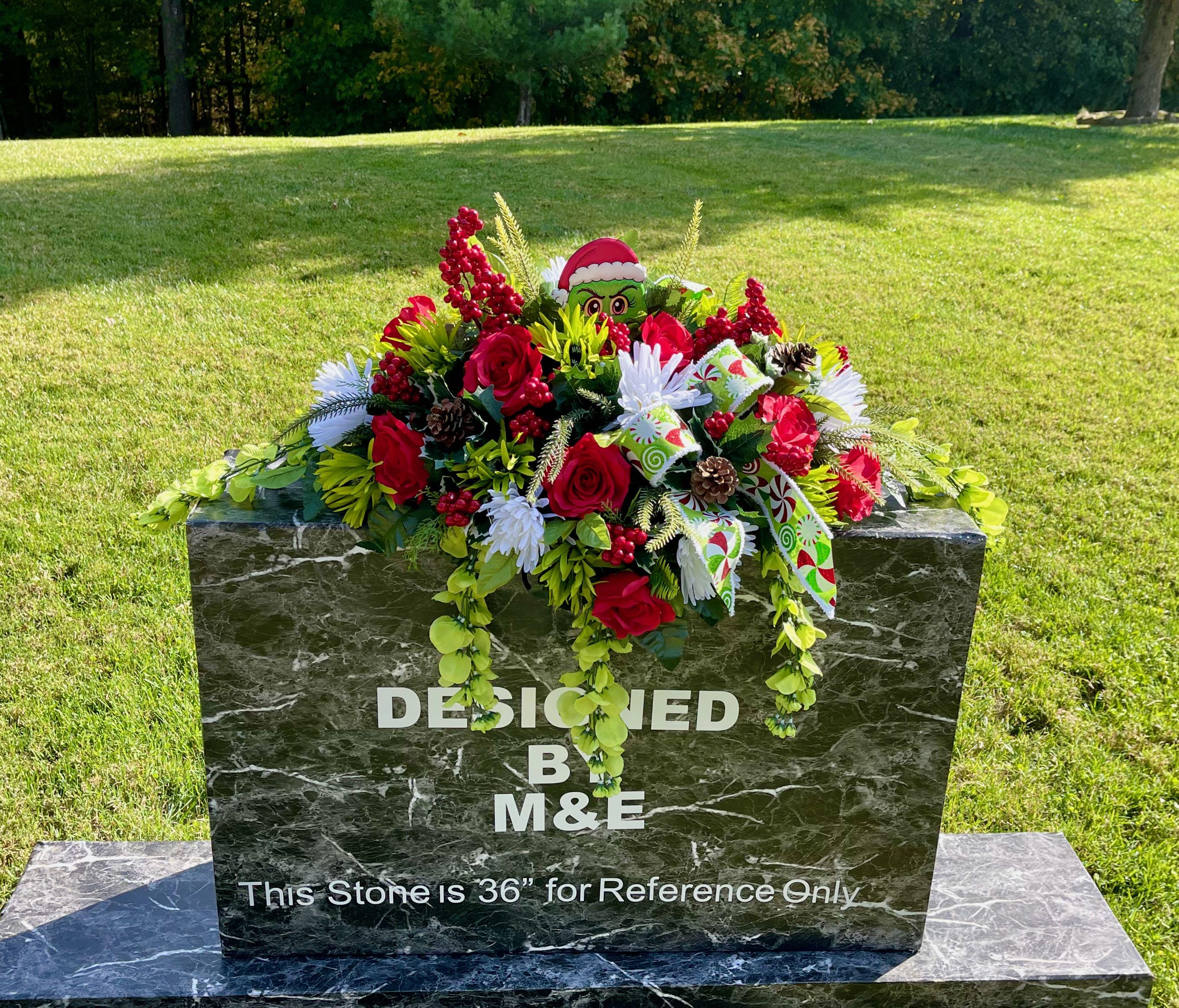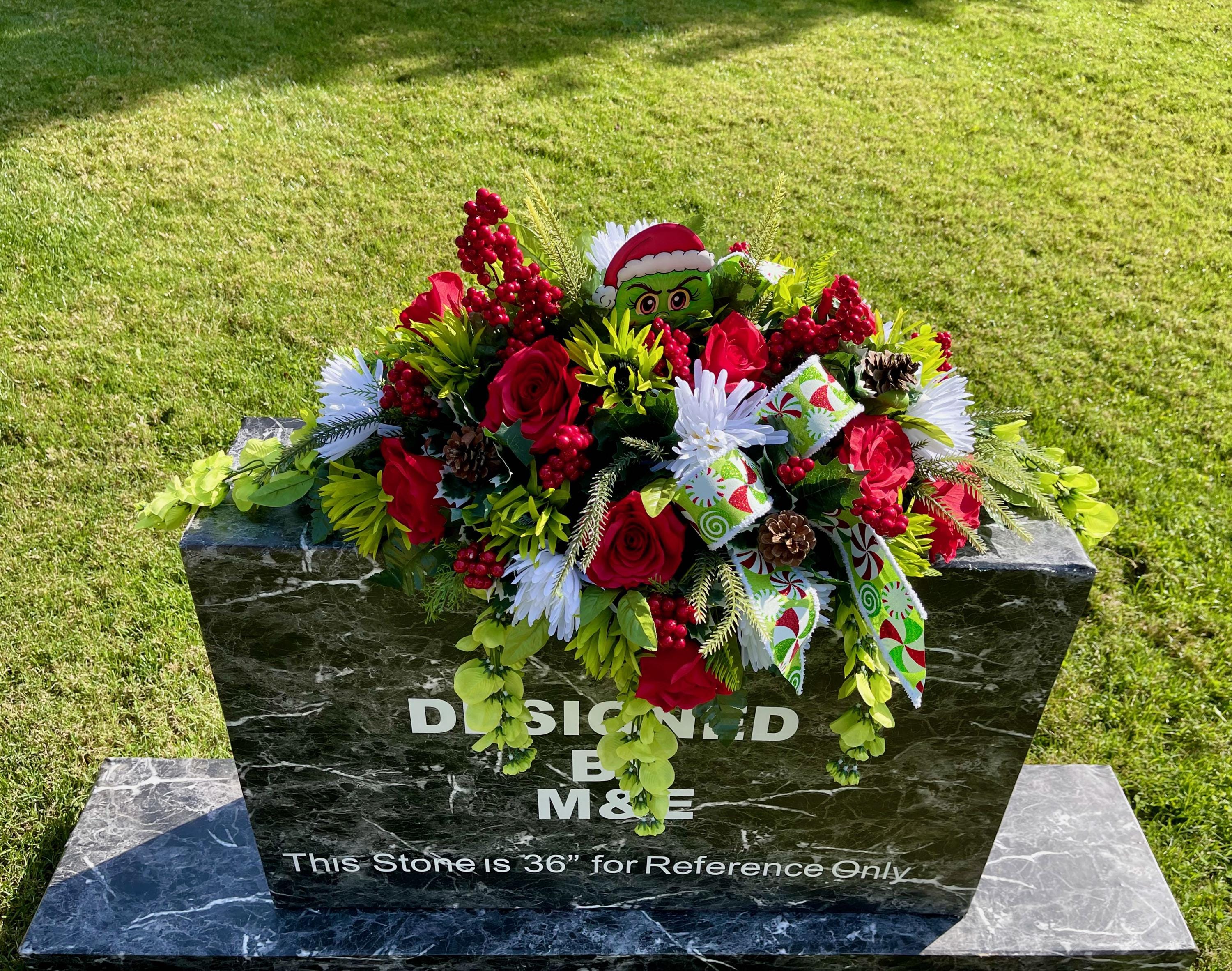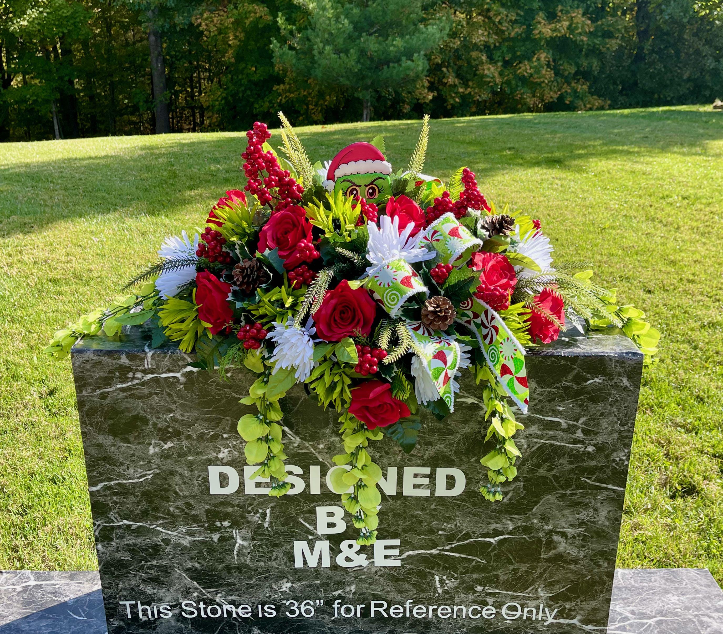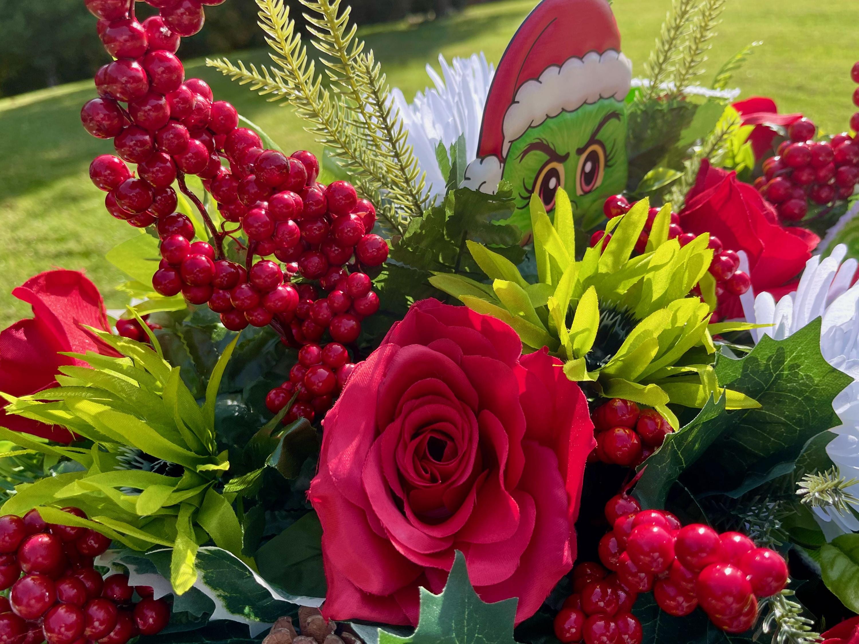 Grinch Likeness Metal Pick Christmas Cemetery Saddle: Christmas Candy Bow Memorial Flowers