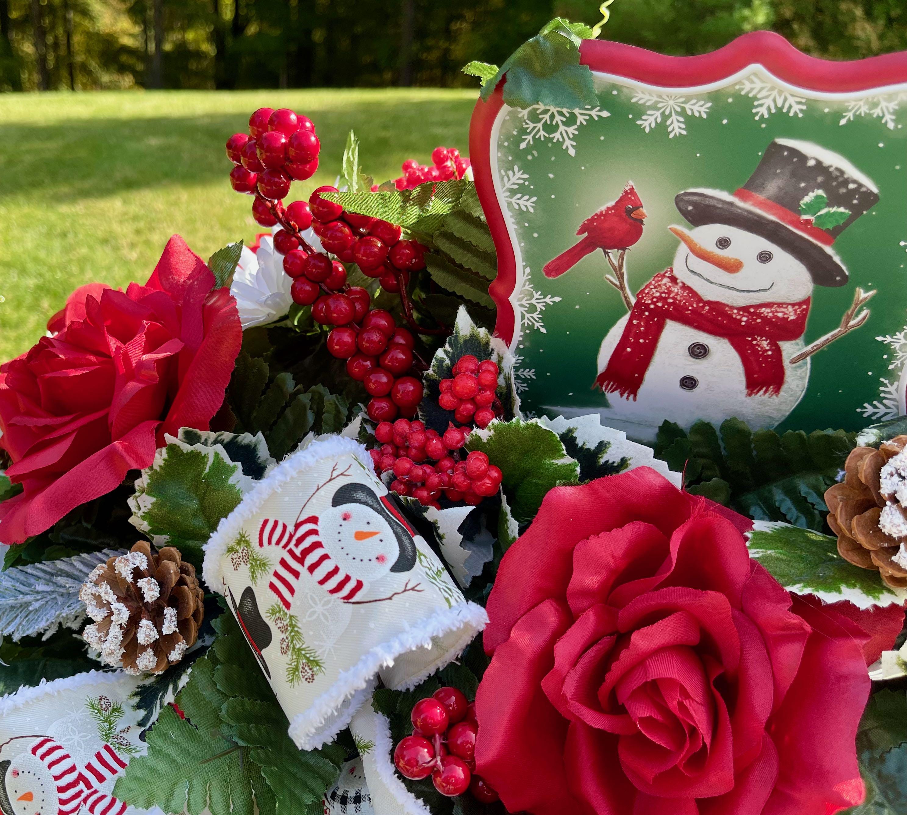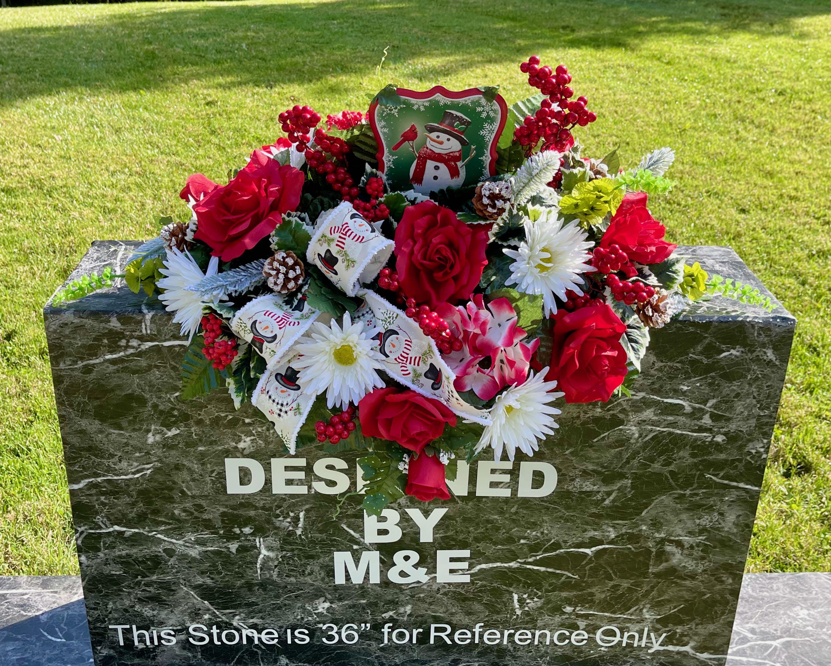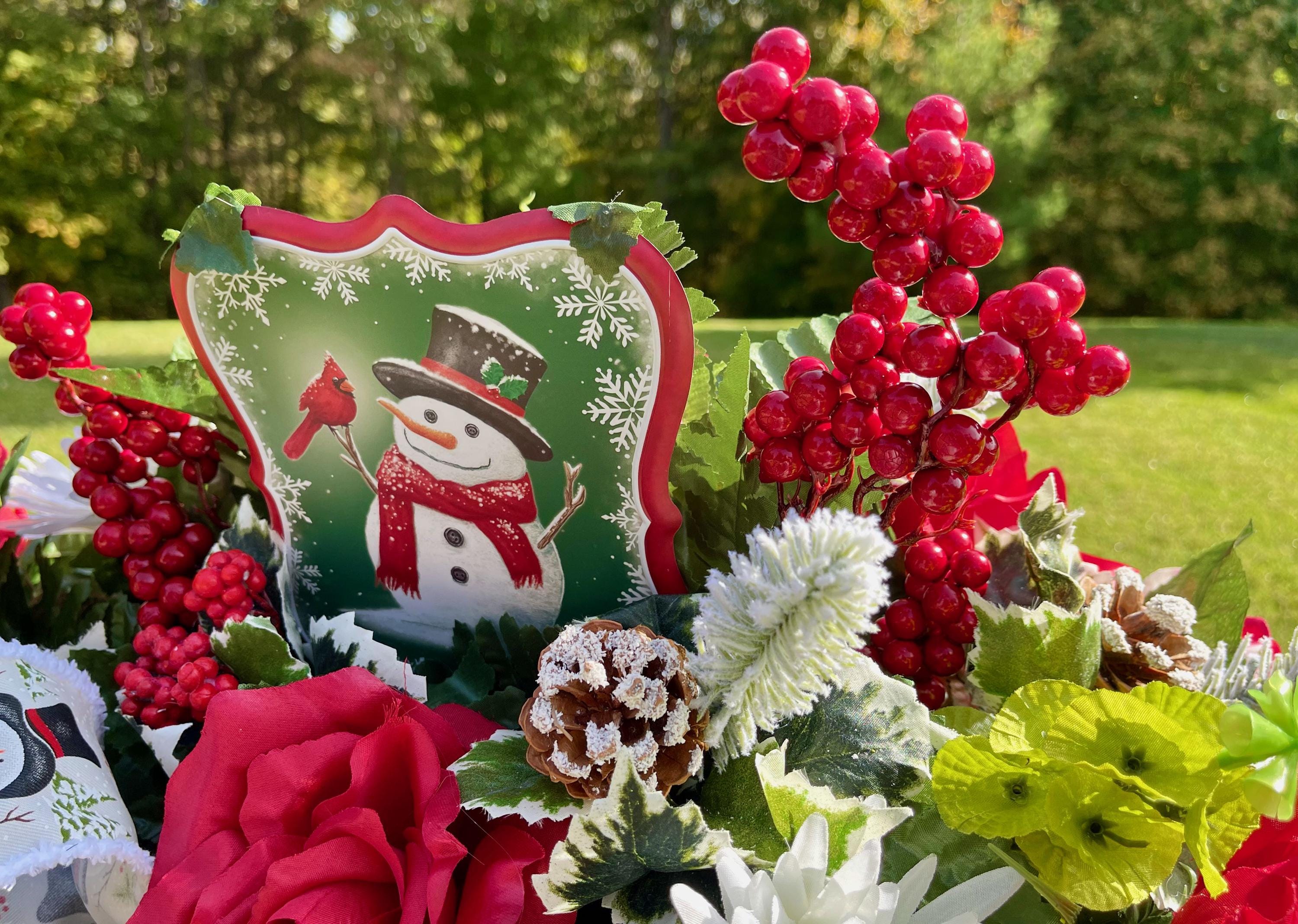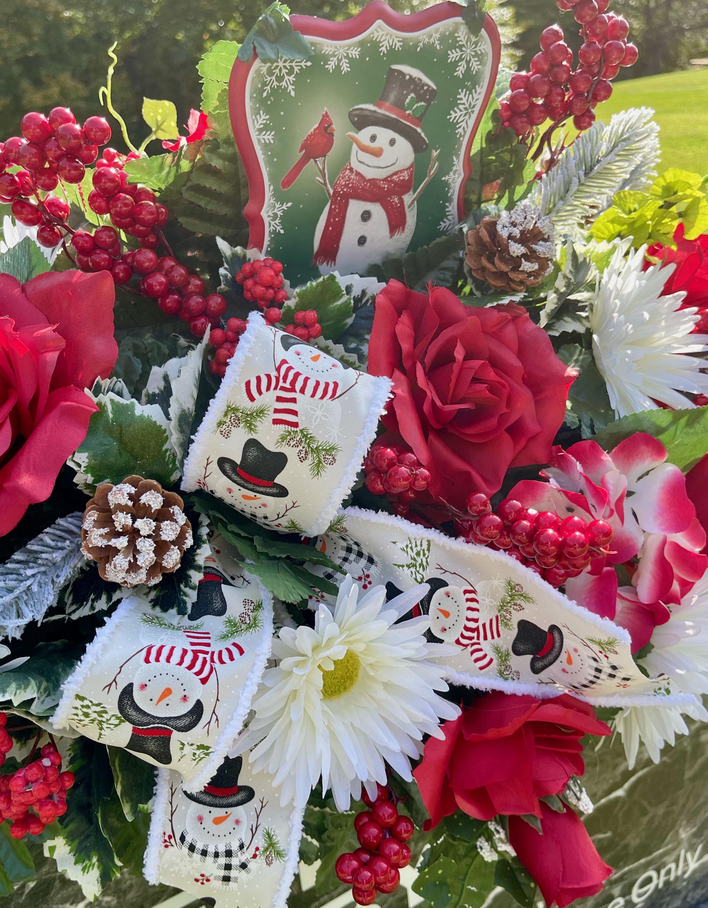 Snowman with Cardinal Metal Pick Christmas Cemetery Saddle: Snowman Bow Memorial Flowers