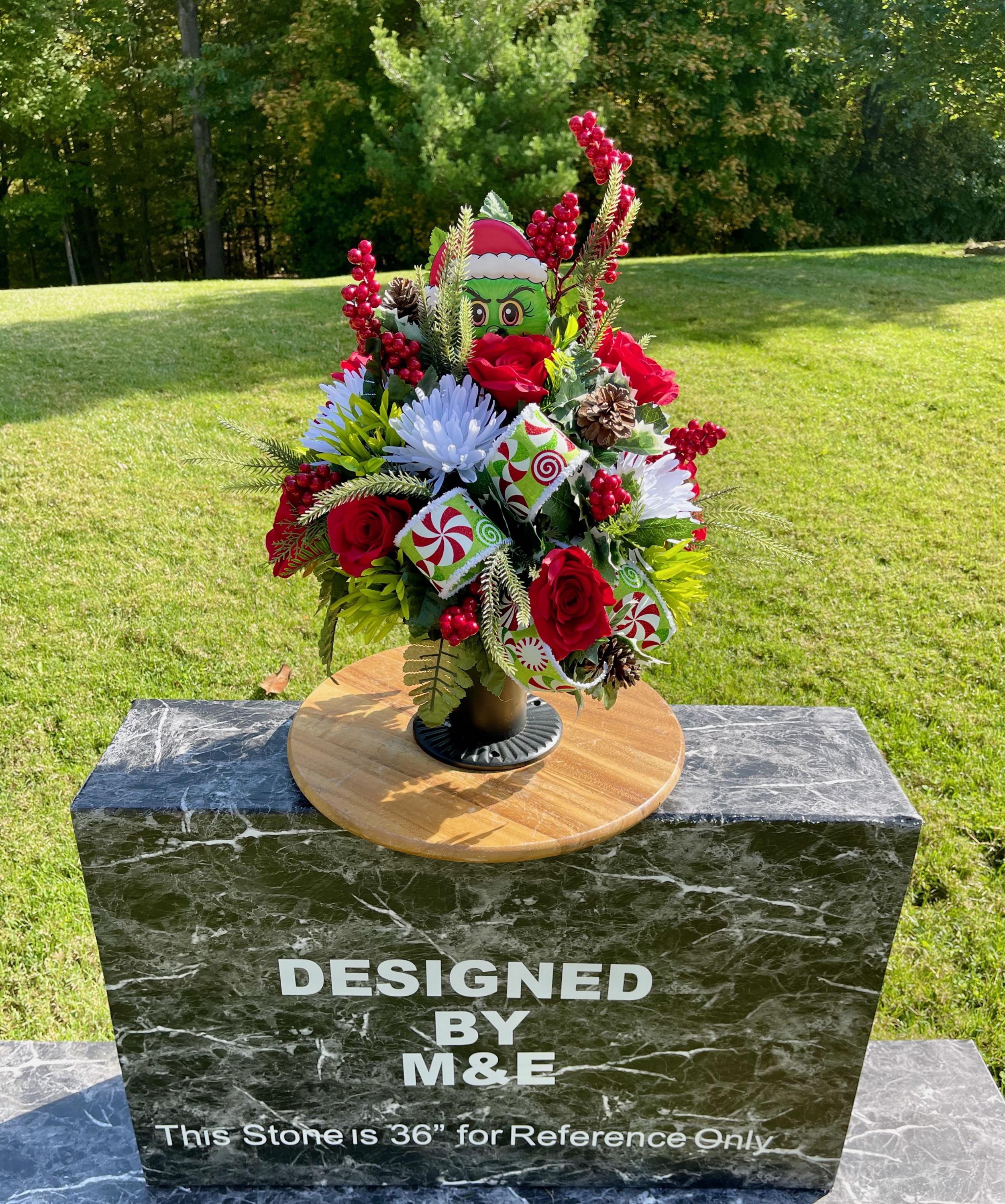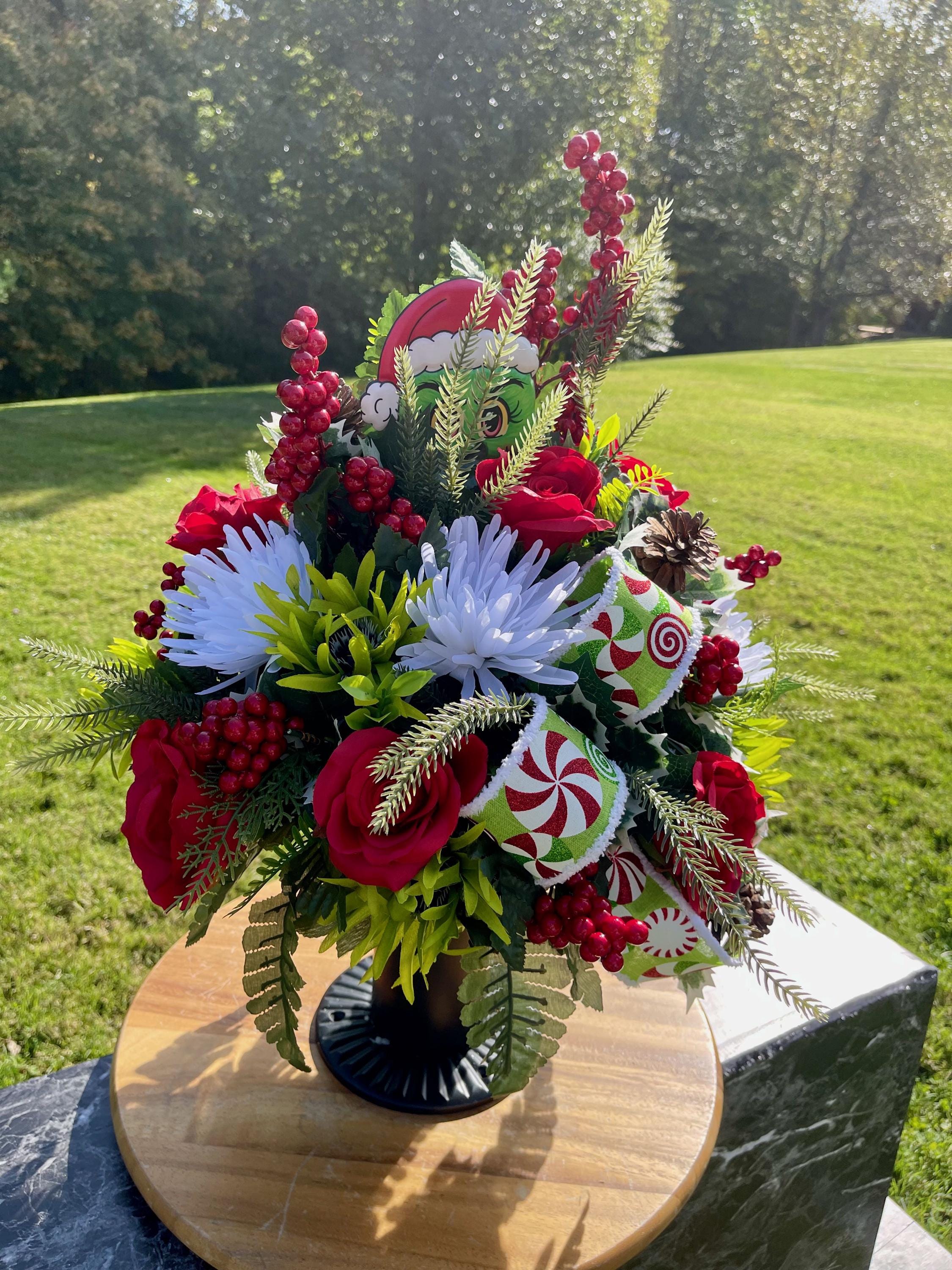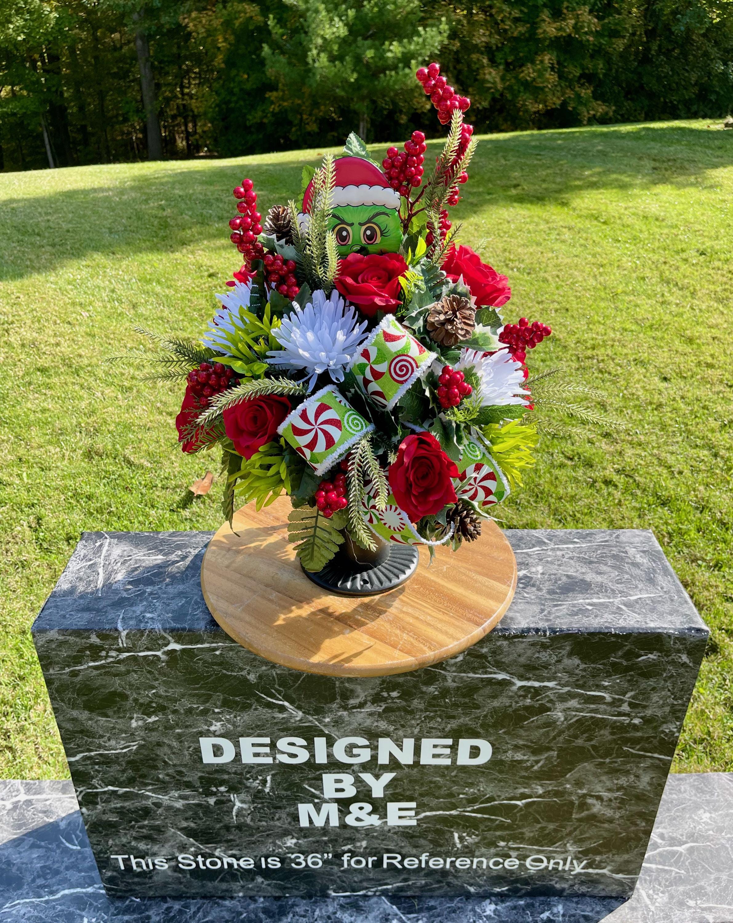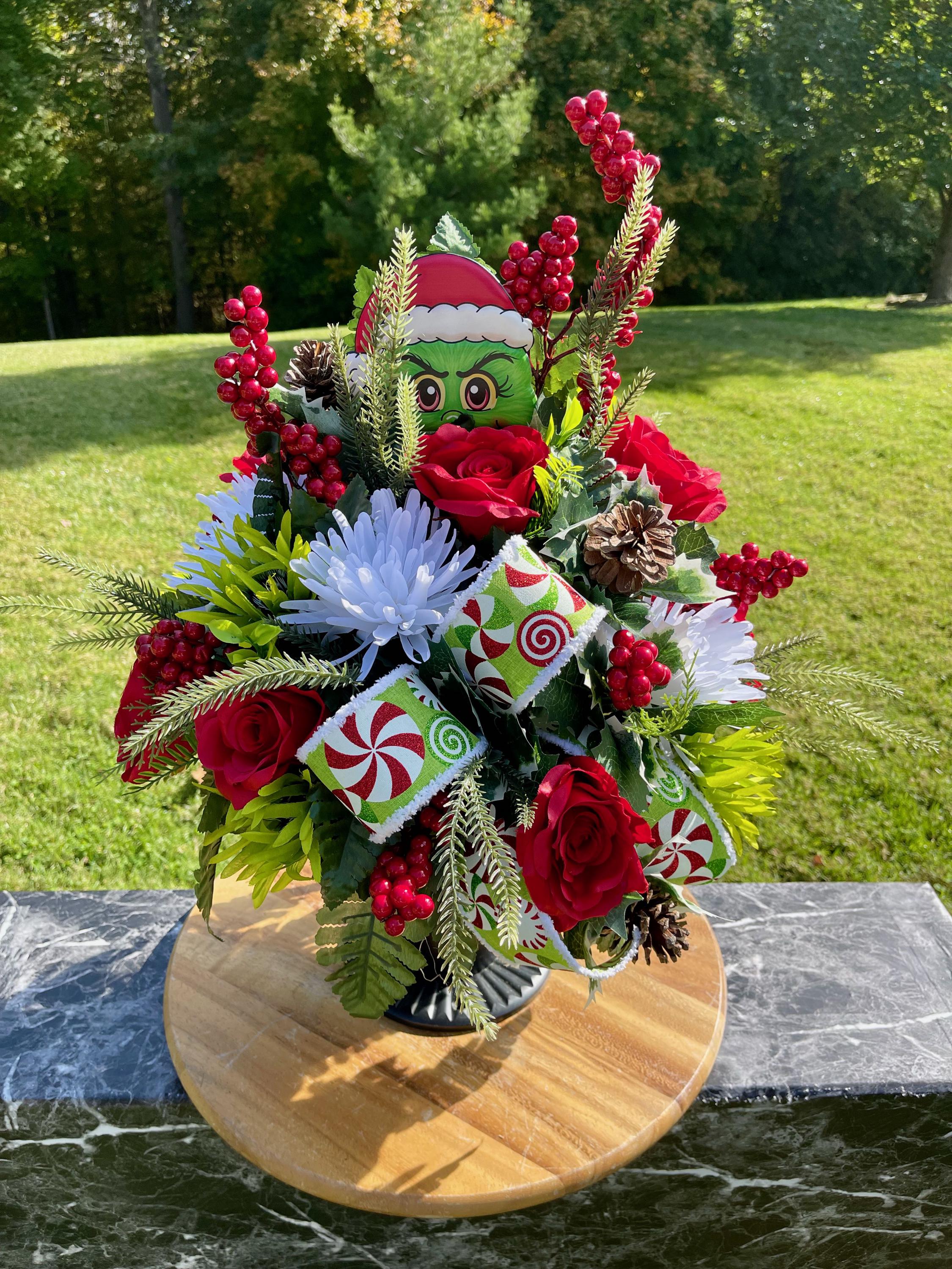 Christmas Cemetery Vase: Likeness of the Grinch with Christmas Candy Bow Memorial Flowers
