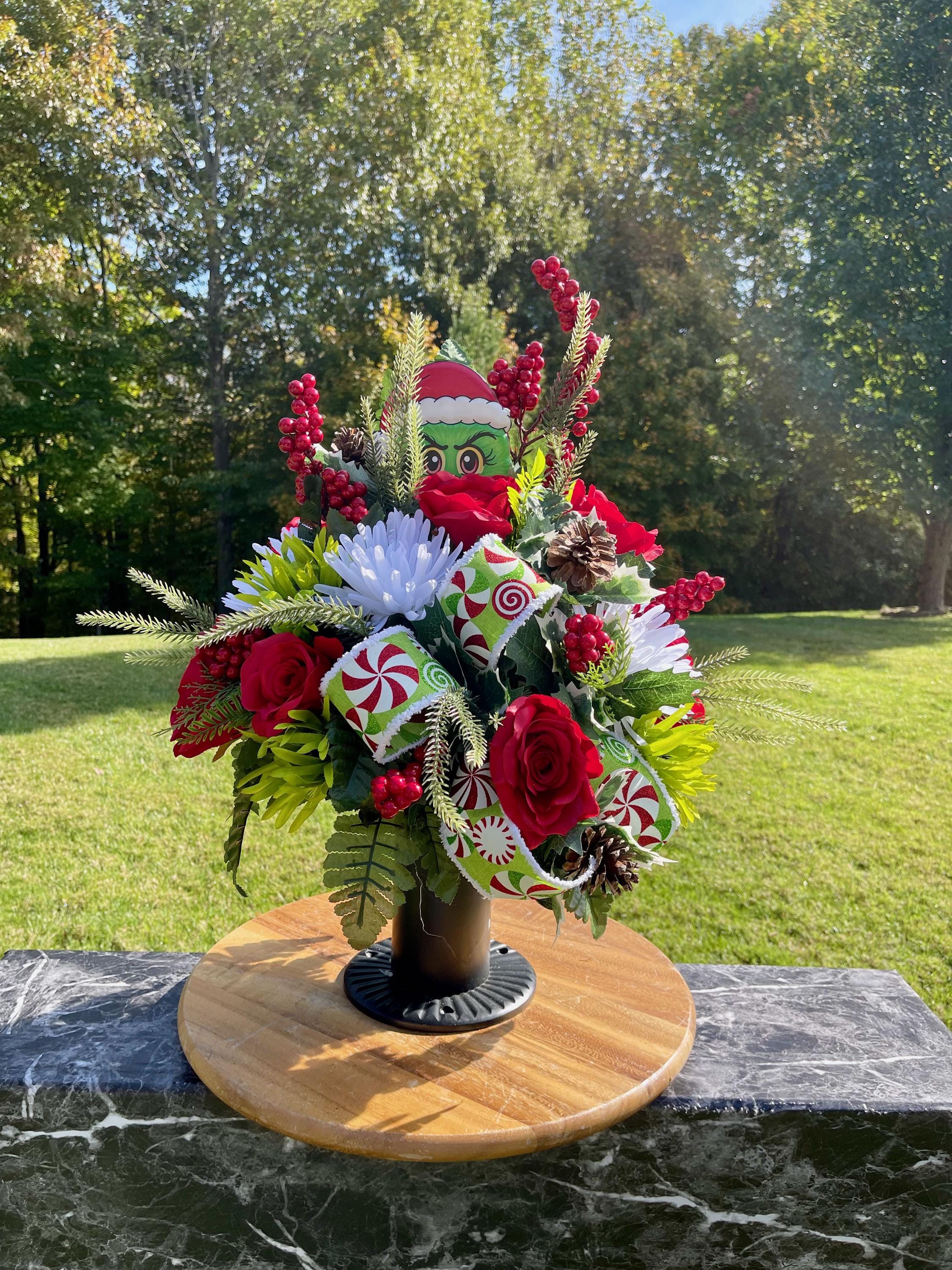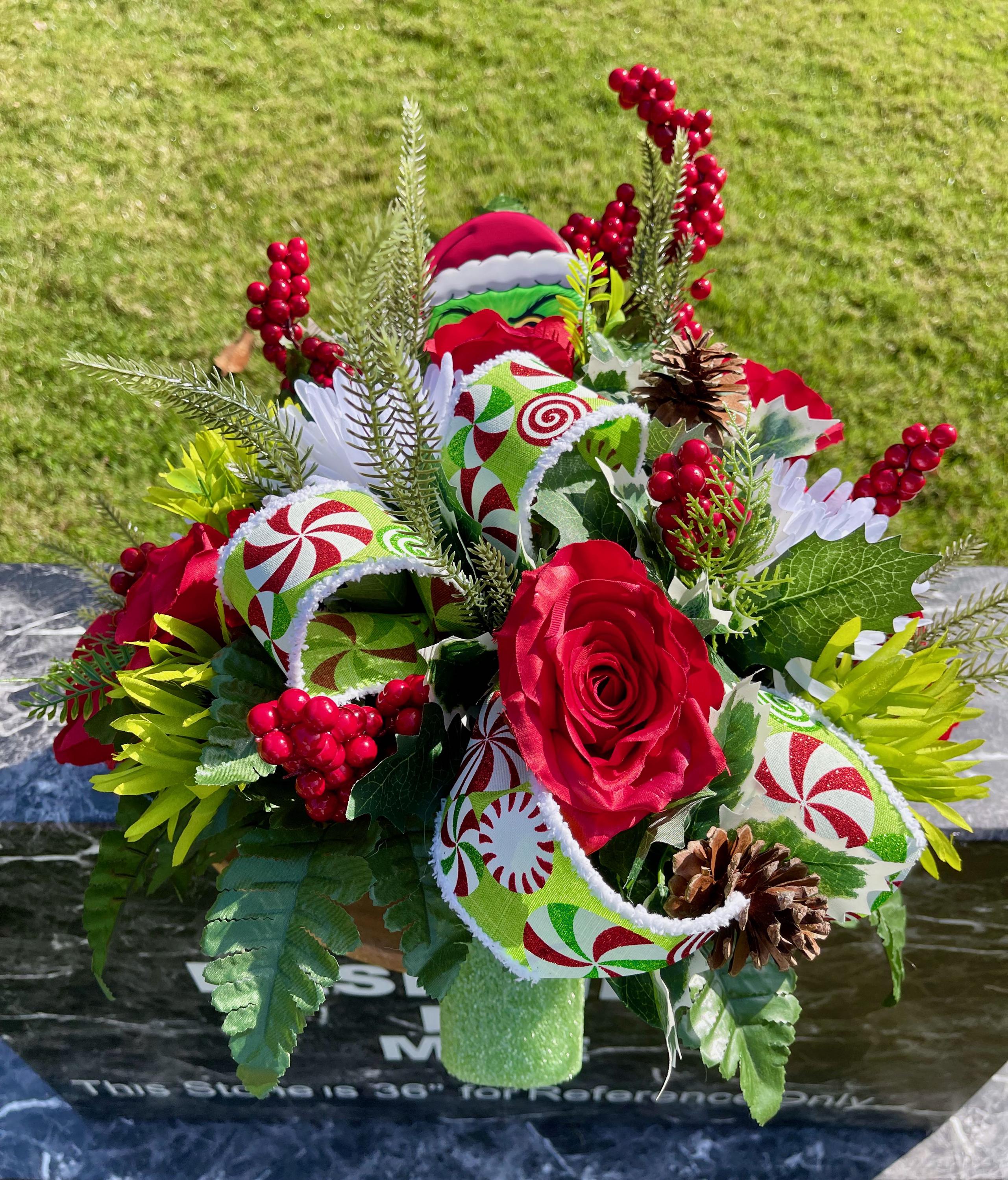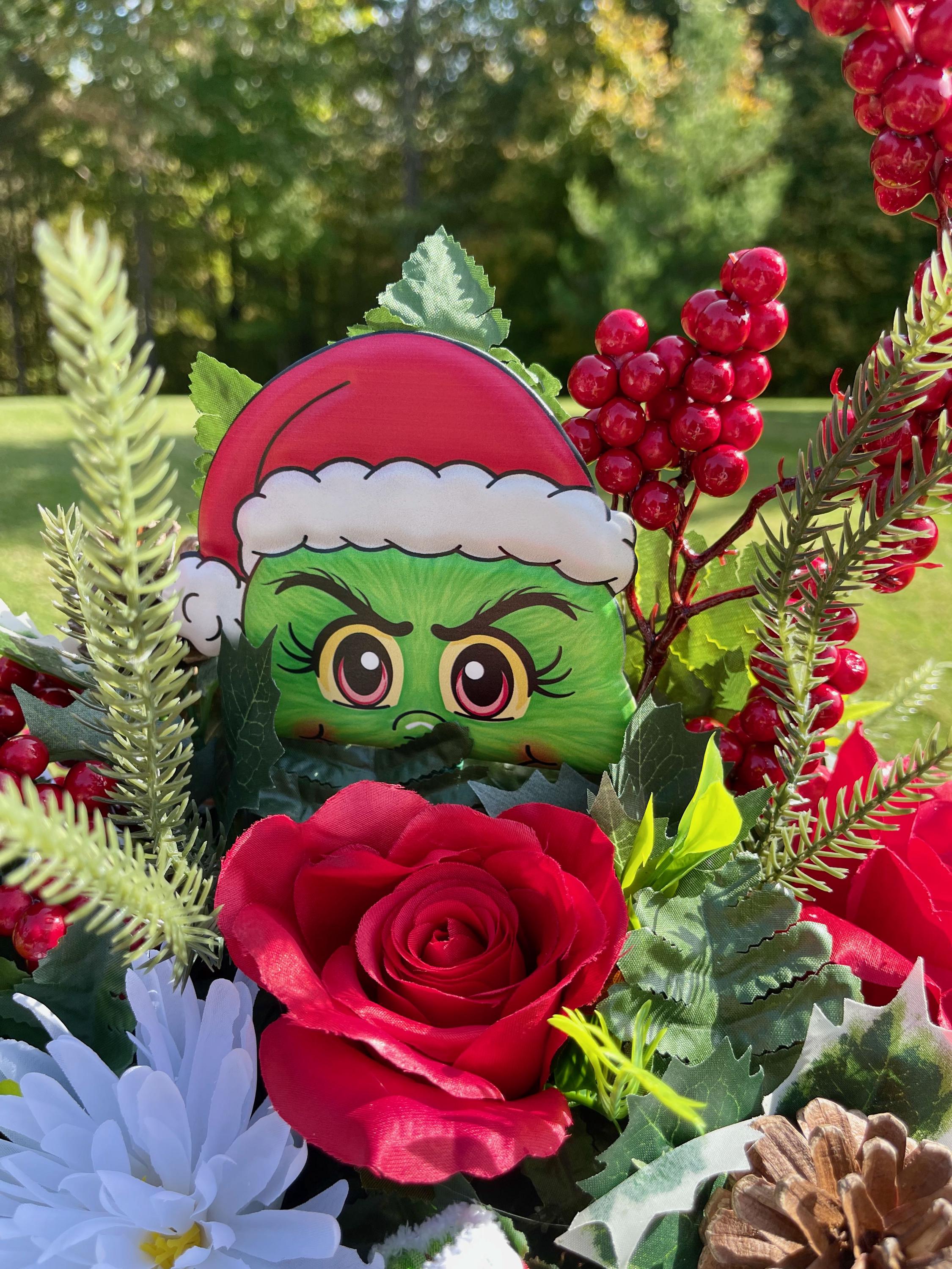 Christmas Cemetery Vase: Likeness of the Grinch with Christmas Candy Bow Memorial Flowers