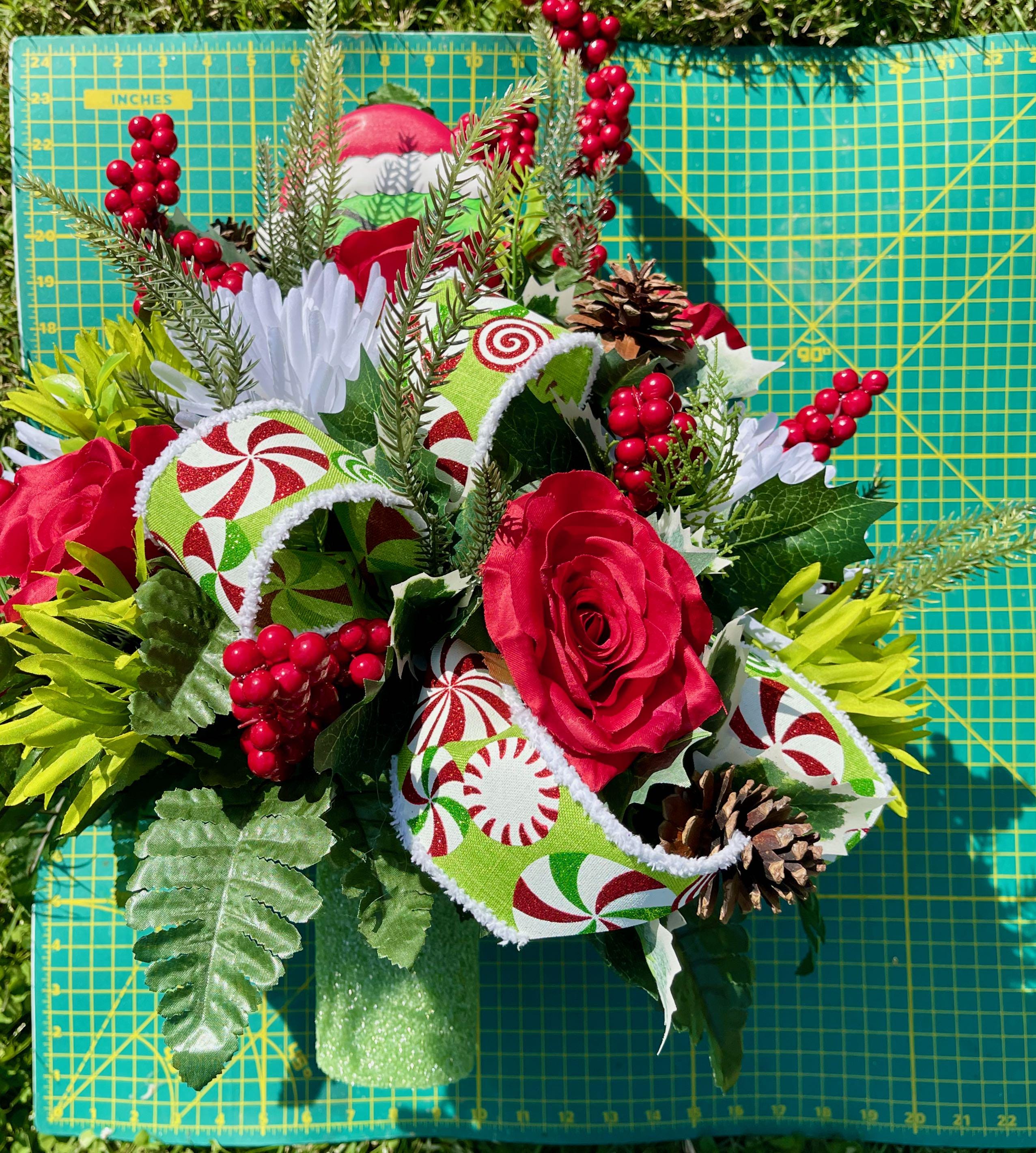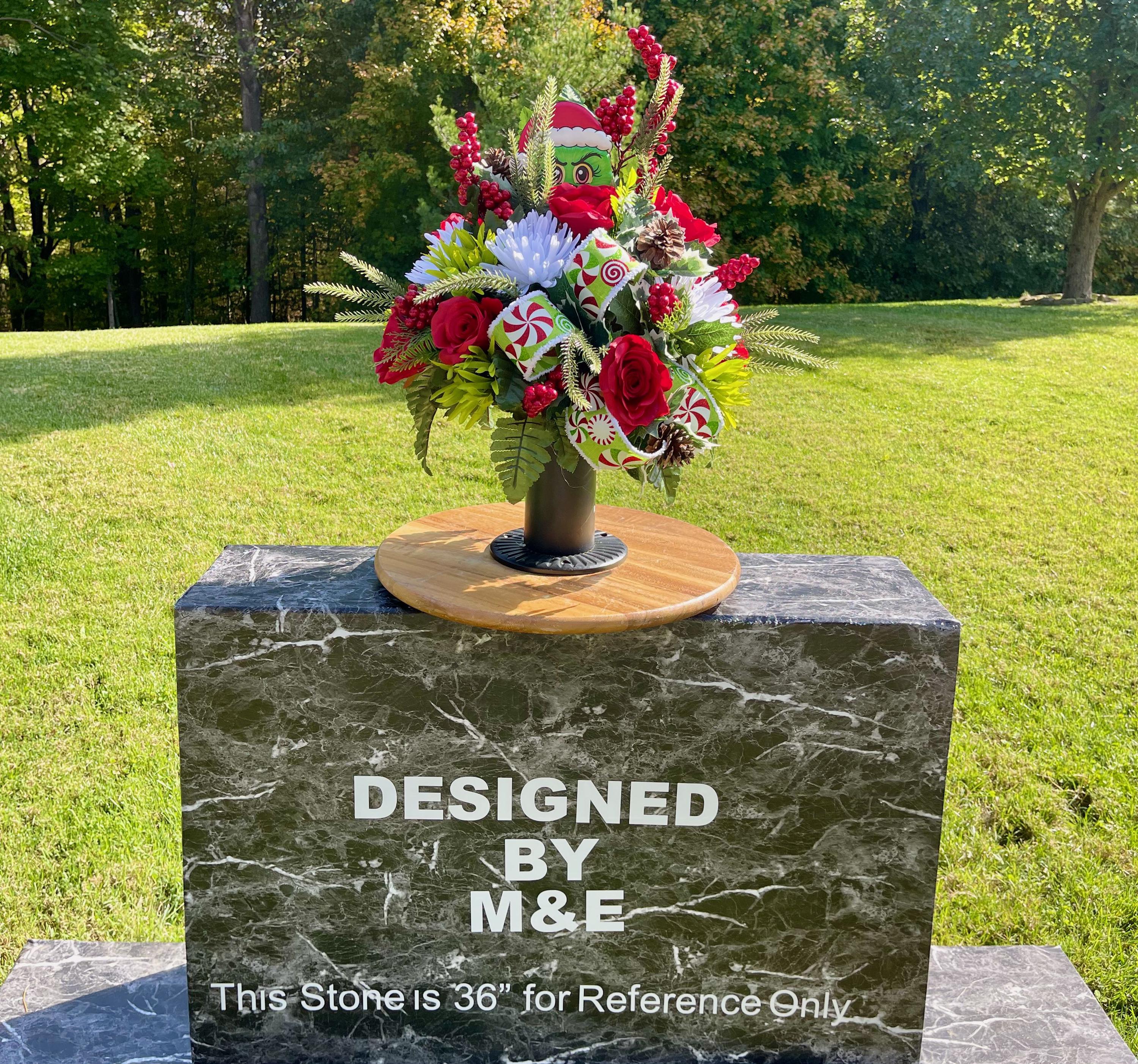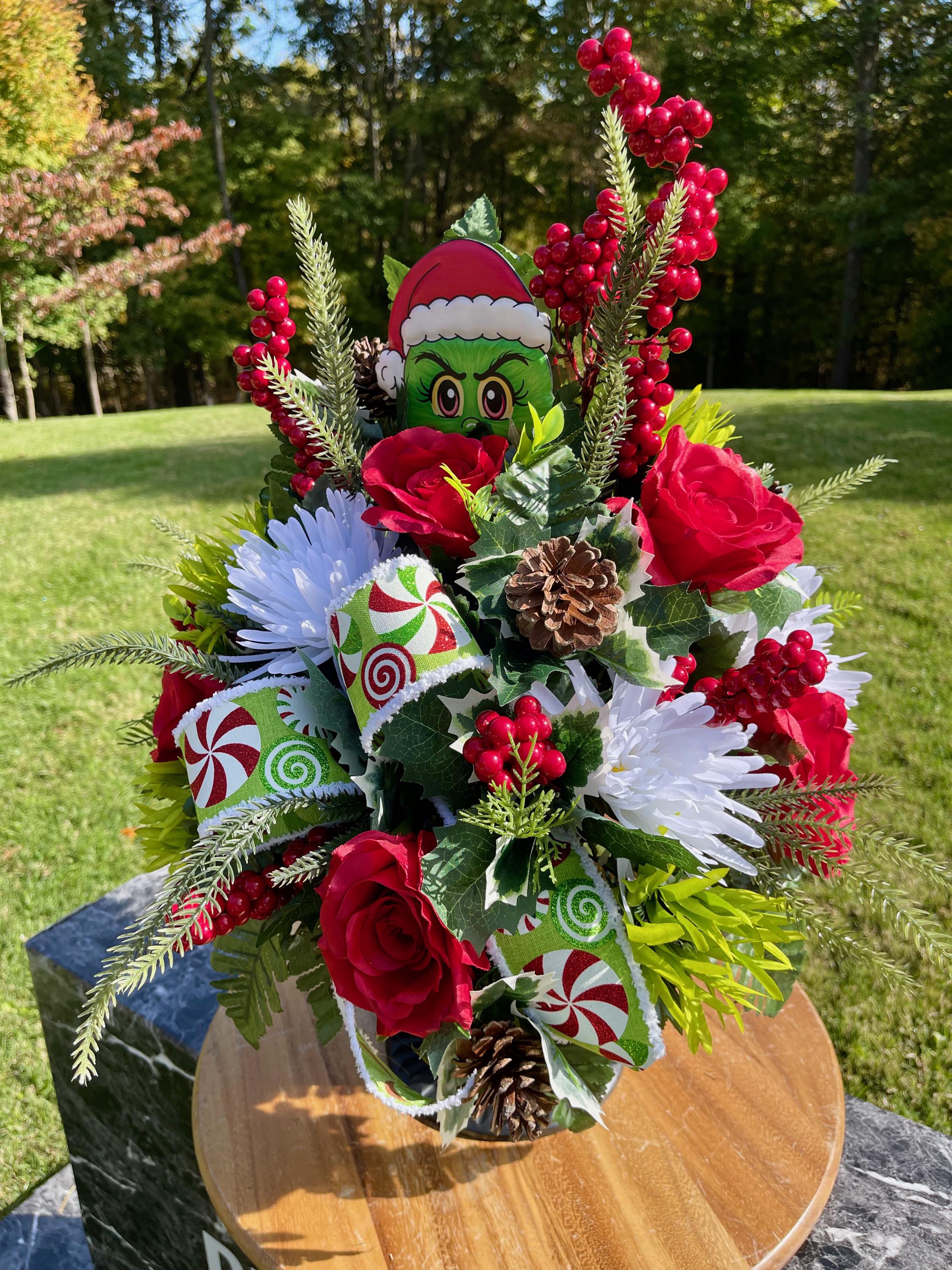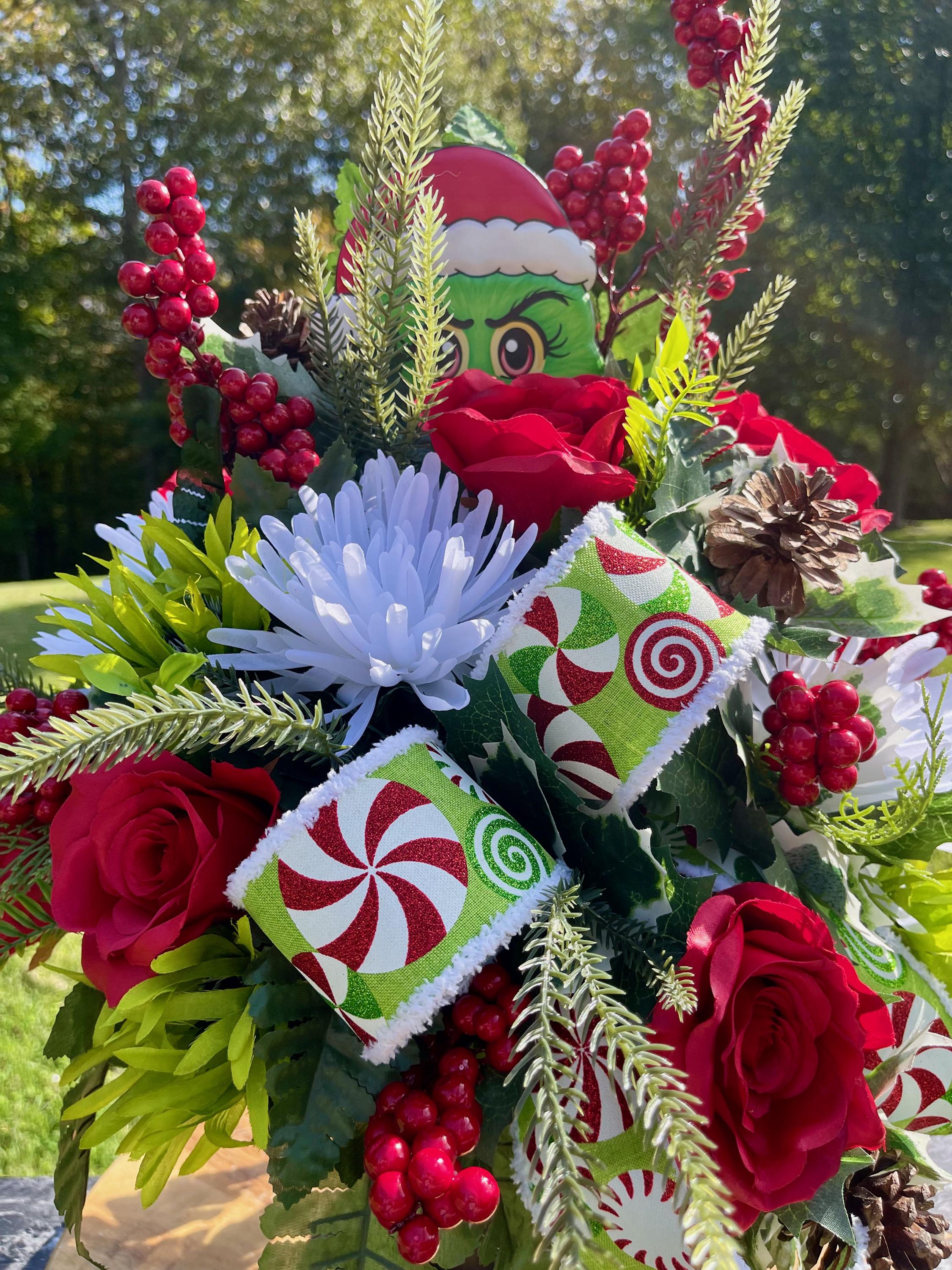 Christmas Cemetery Vase: Likeness of the Grinch with Christmas Candy Bow Memorial Flowers