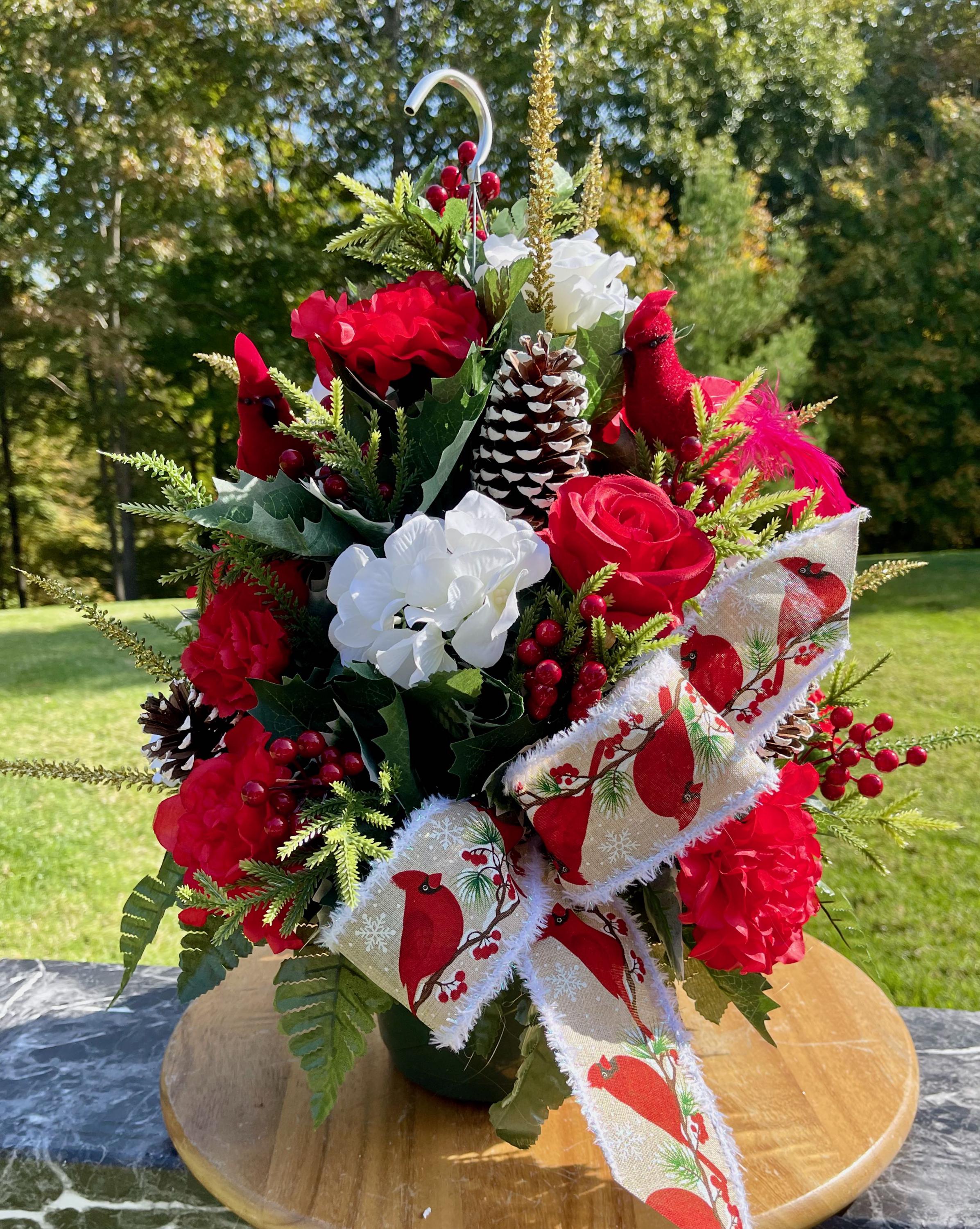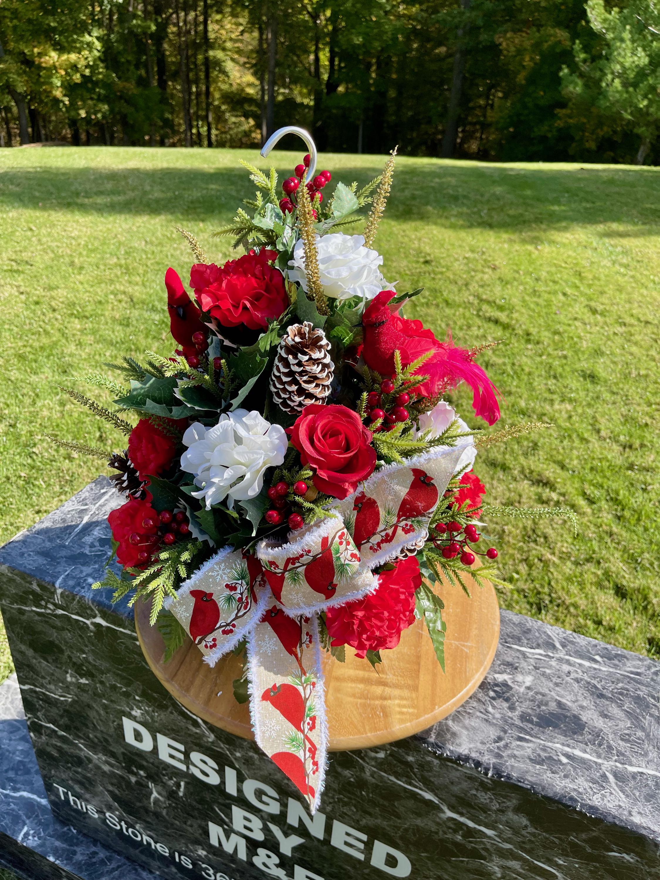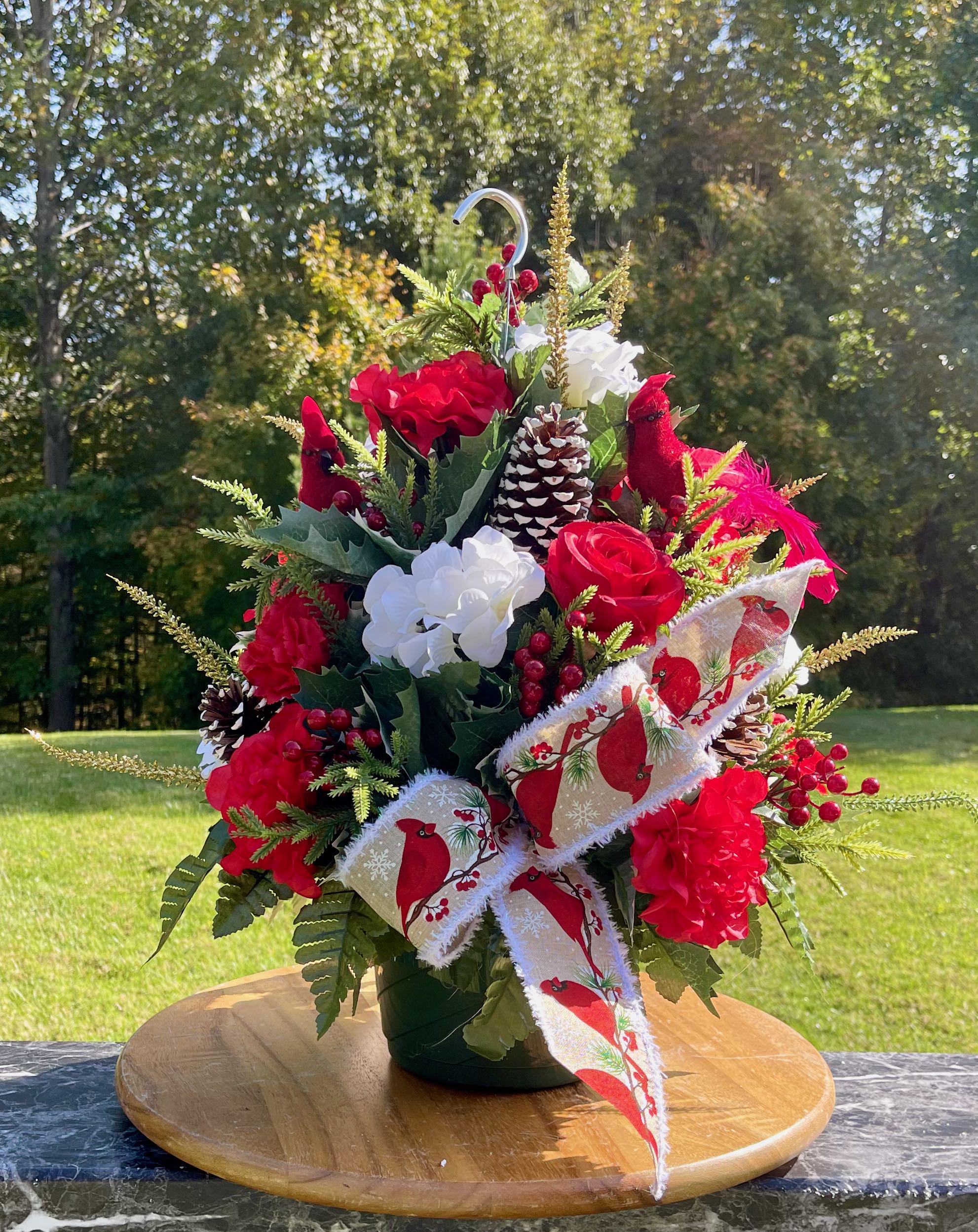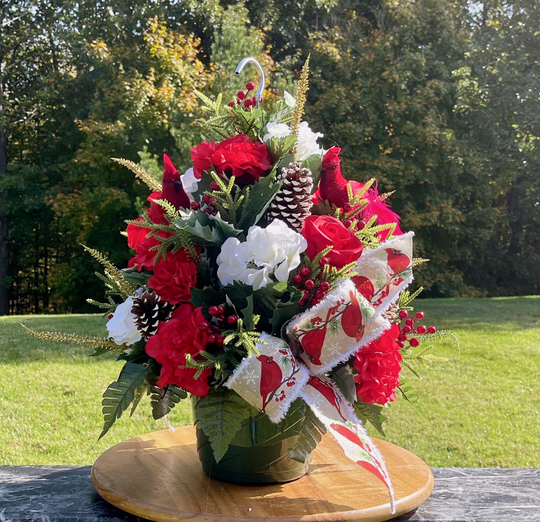 Hanging Basket Christmas Cemetery: Winter Forest Redbird Cardinal with Bow Memorial Flowers