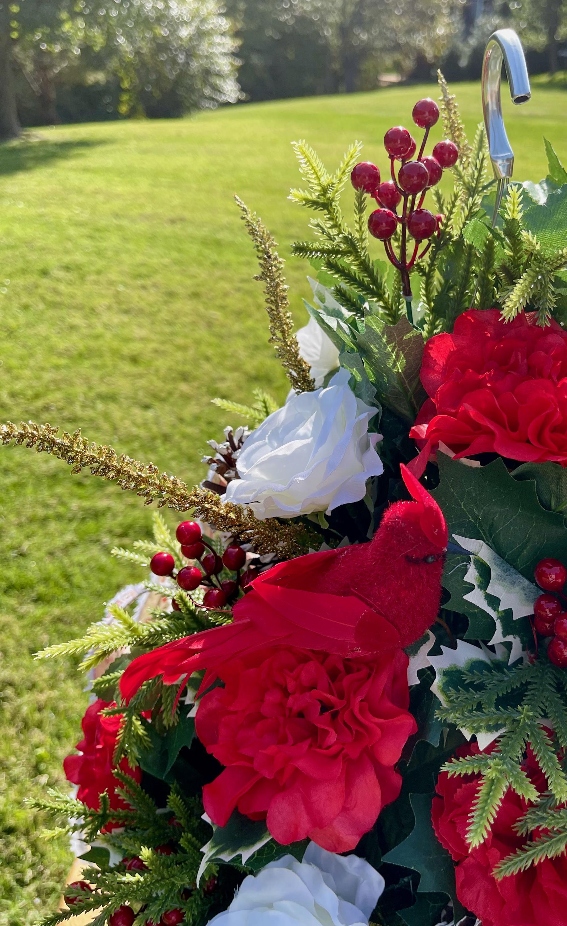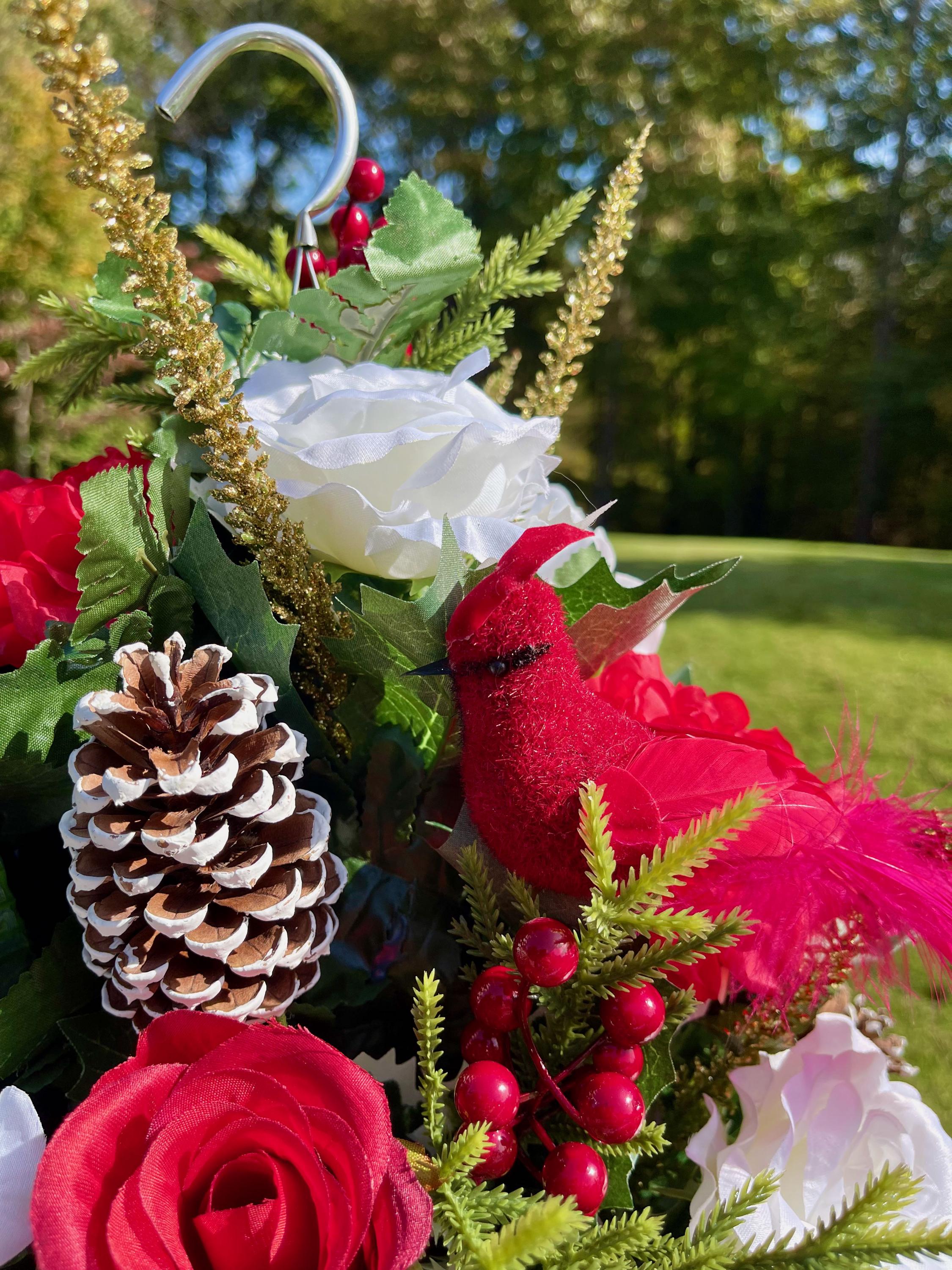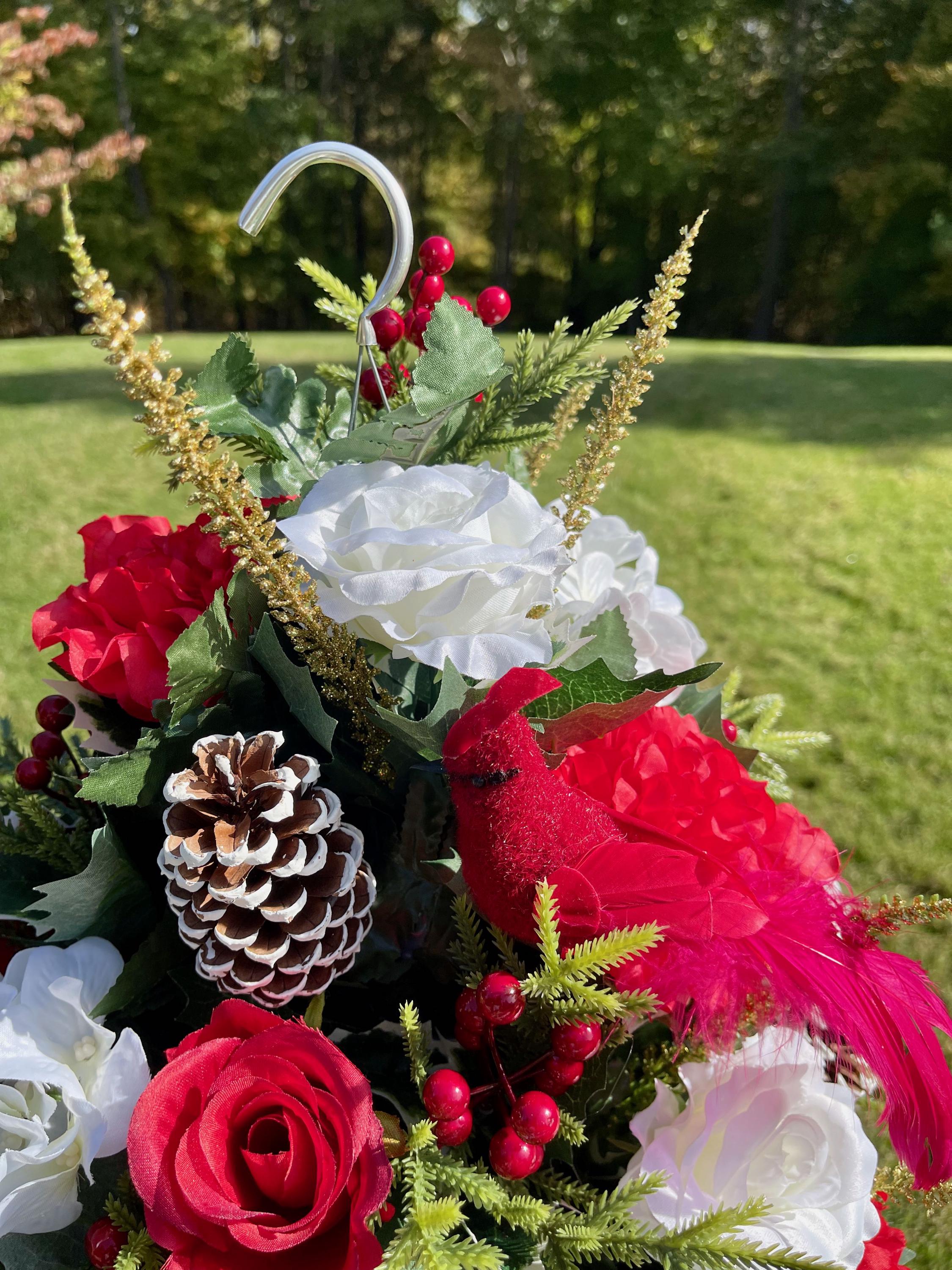 Hanging Basket Christmas Cemetery: Winter Forest Redbird Cardinal with Bow Memorial Flowers