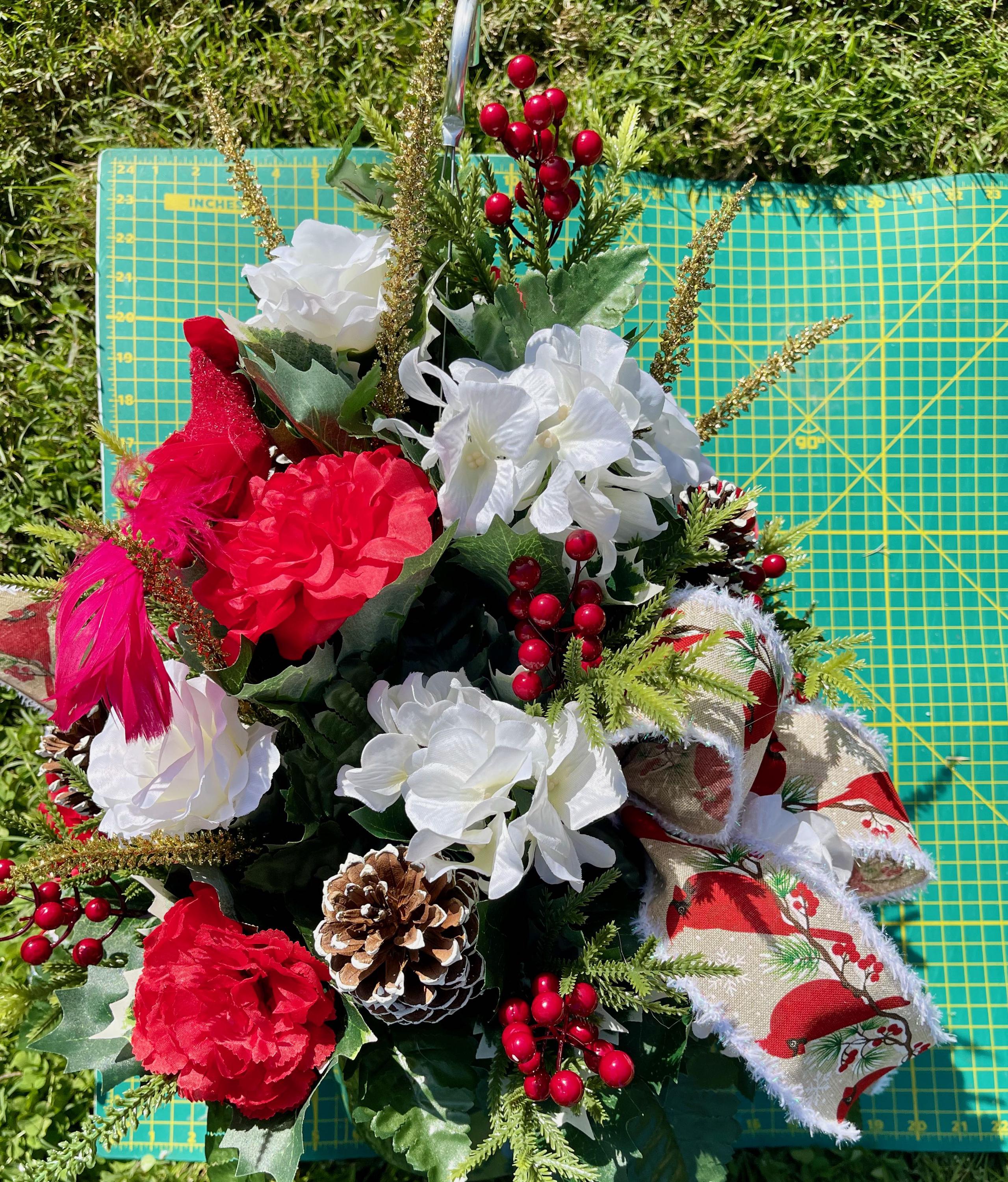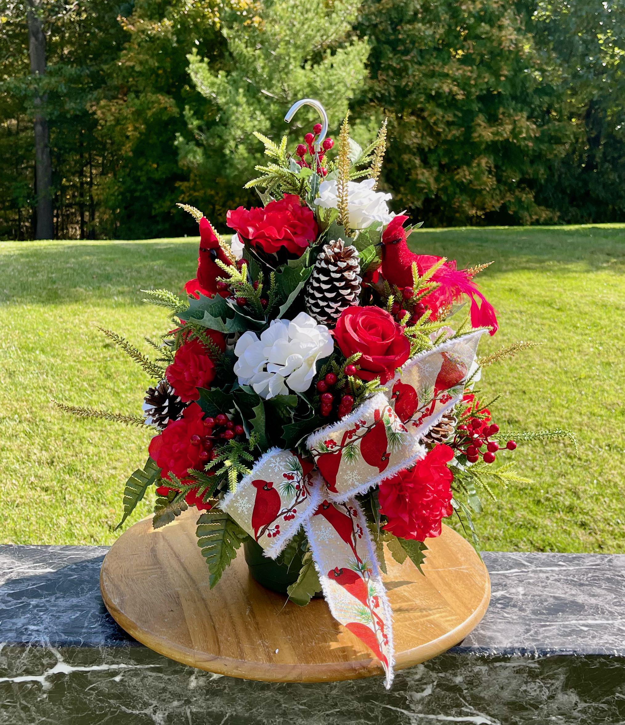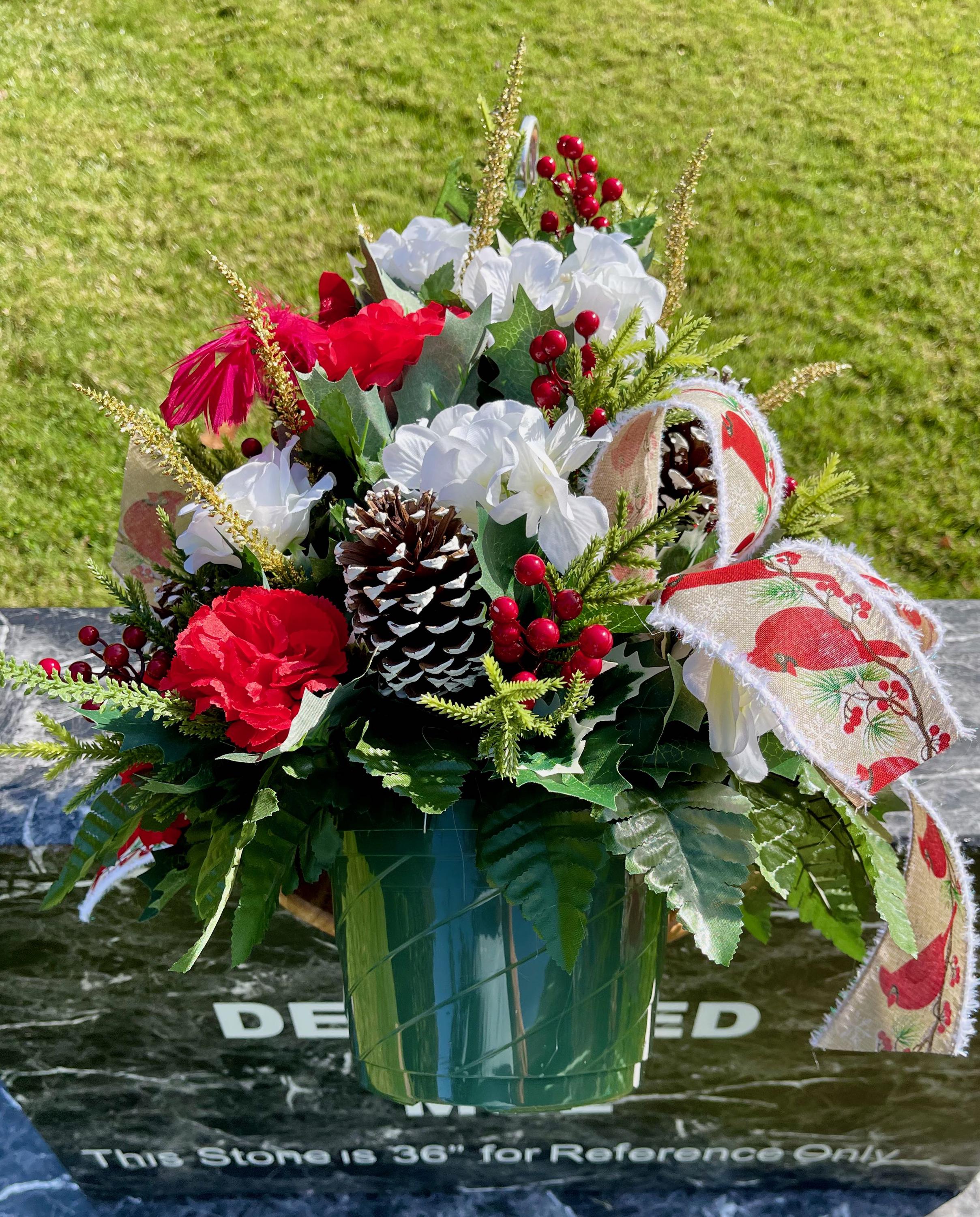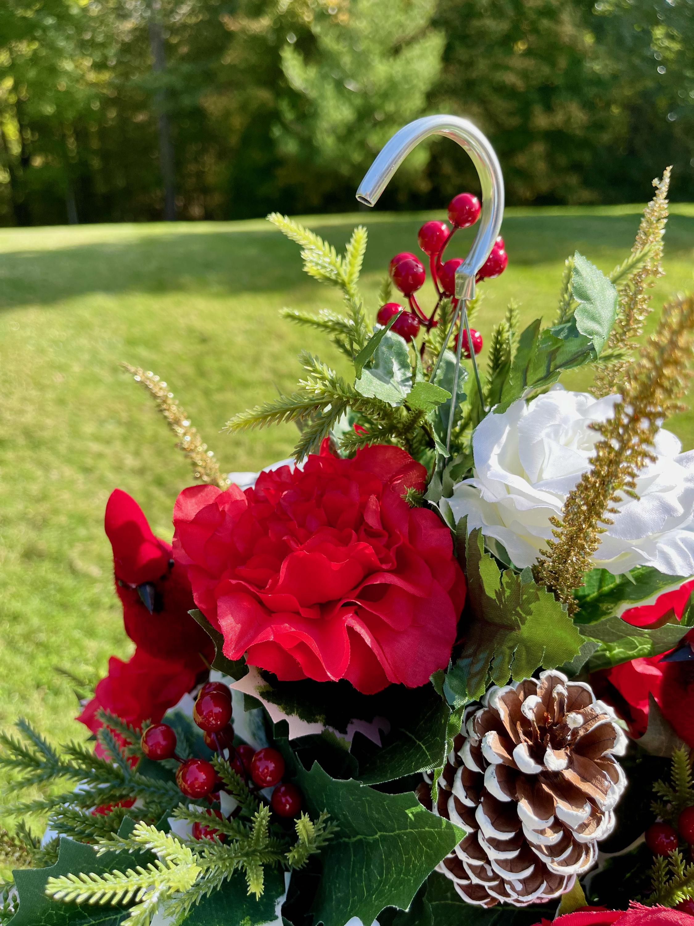 Hanging Basket Christmas Cemetery: Winter Forest Redbird Cardinal with Bow Memorial Flowers