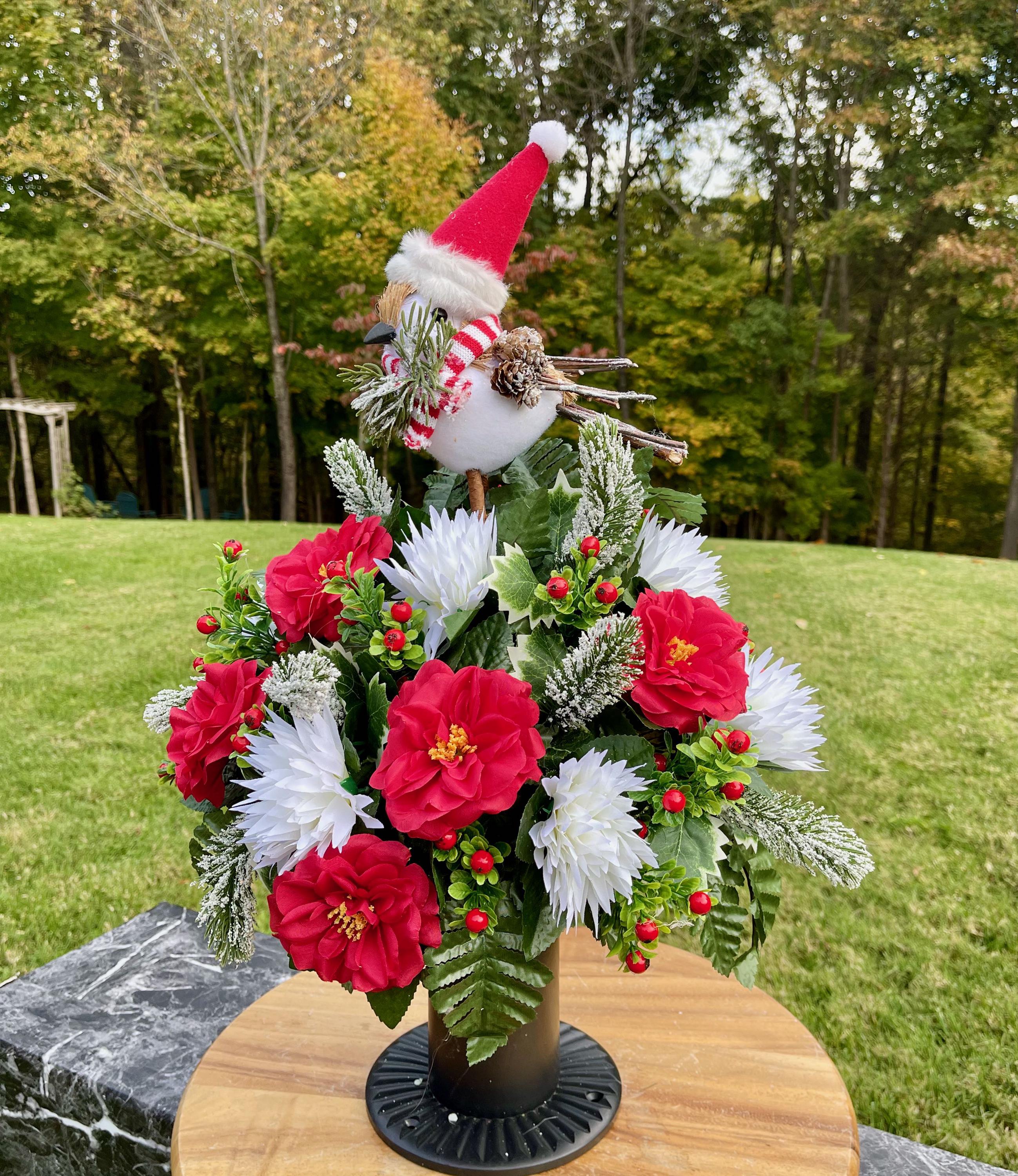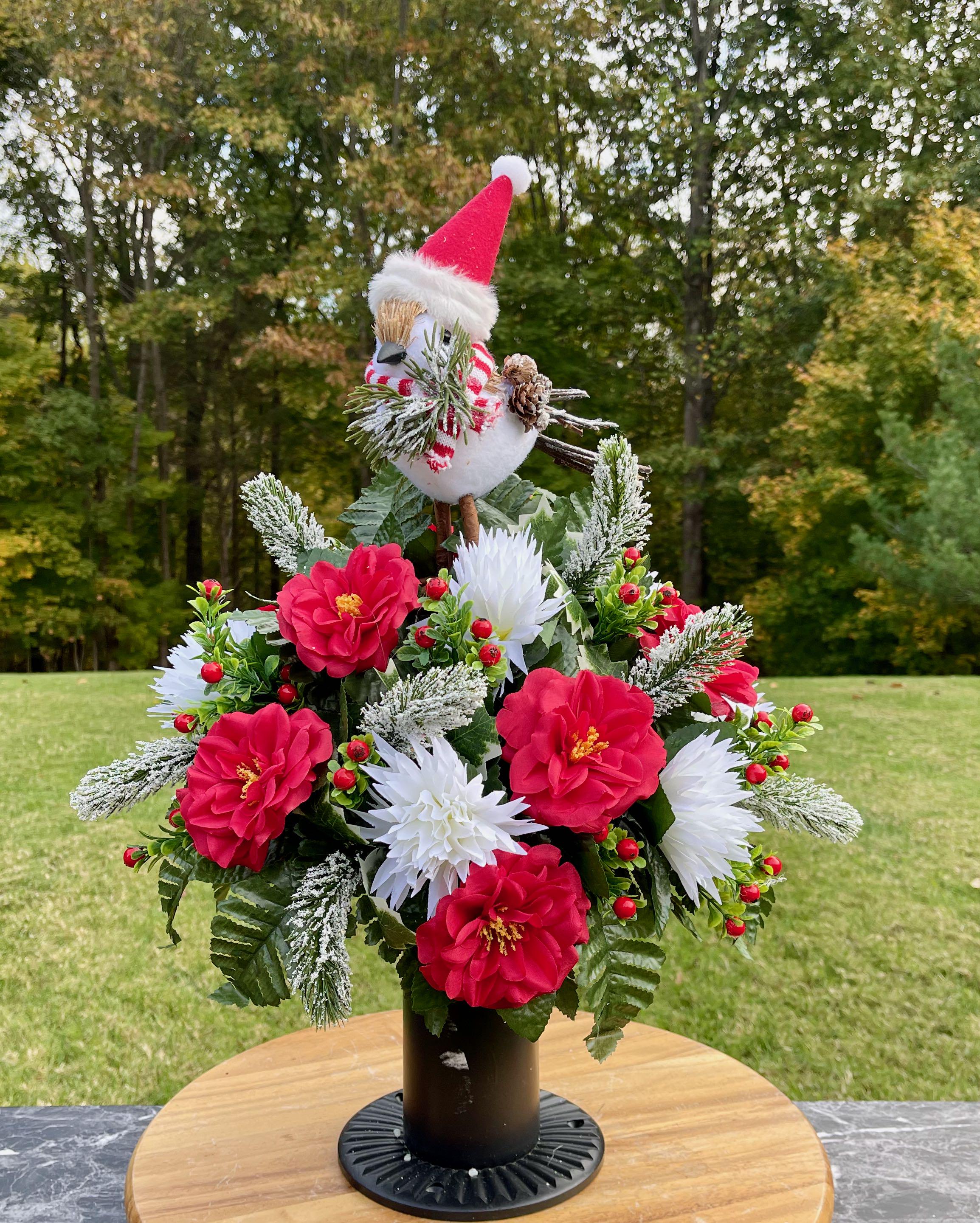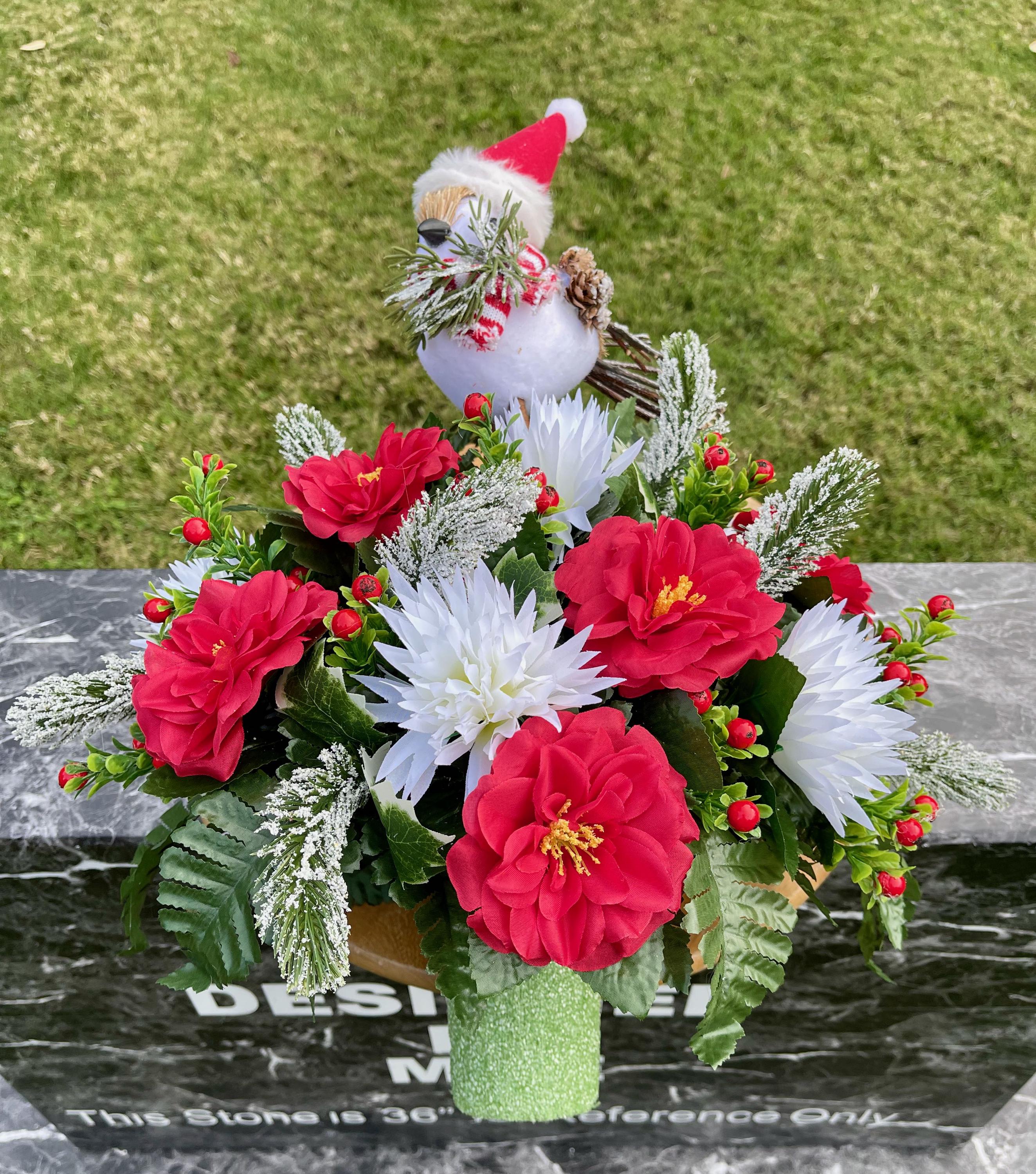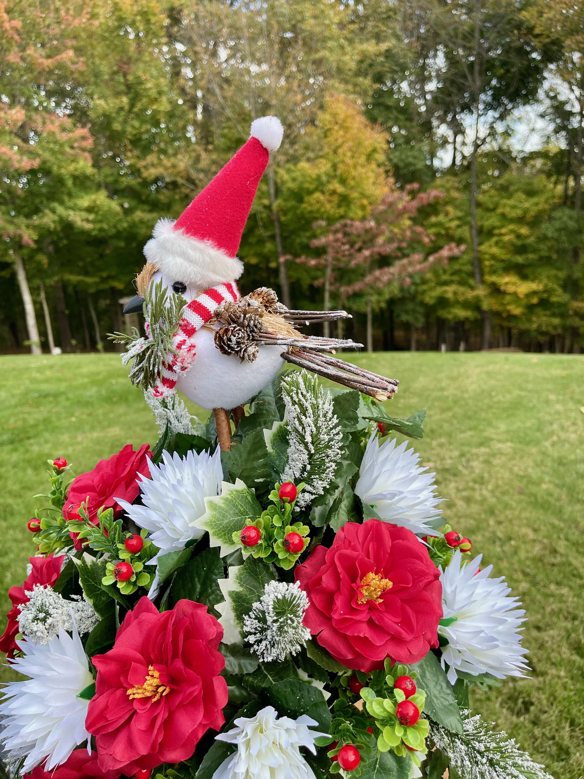 Christmas Cemetery Vase: Winter Snowbird with Santa Hat Memorial Flowers