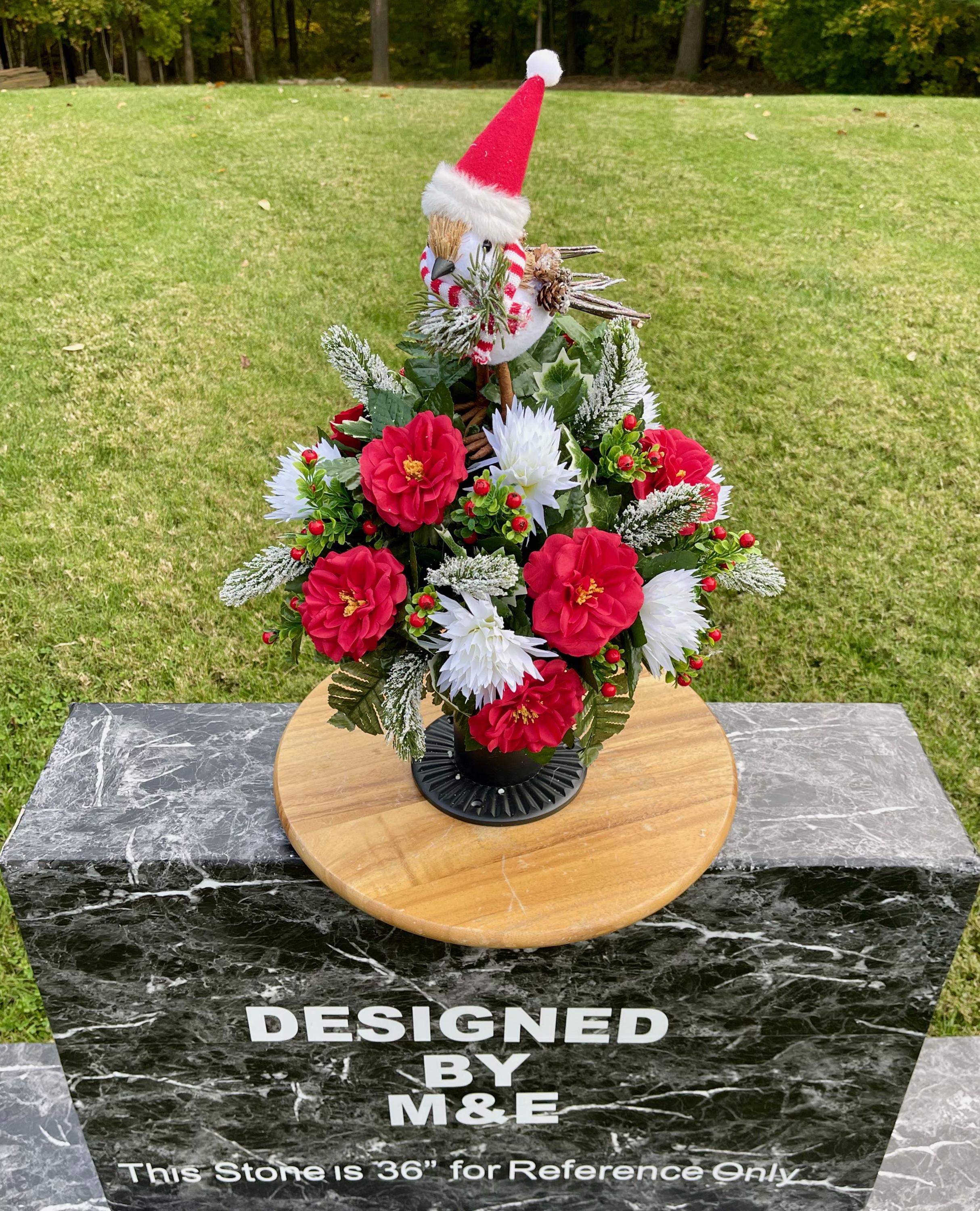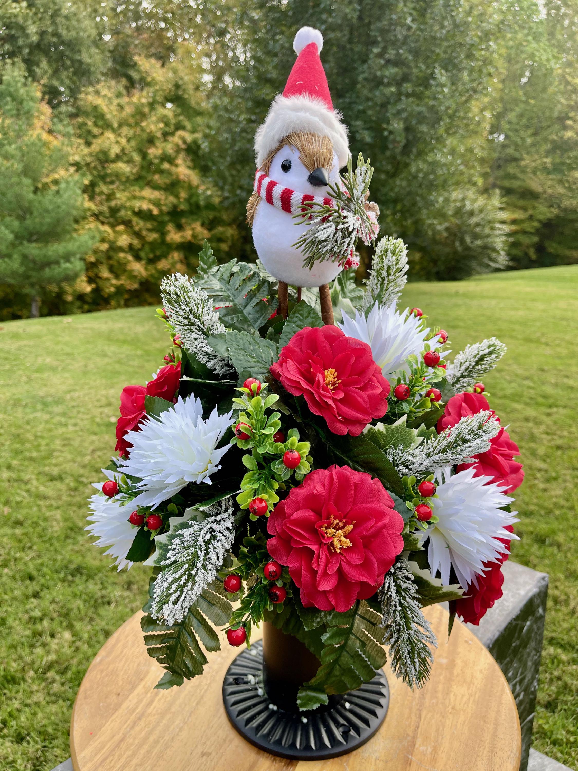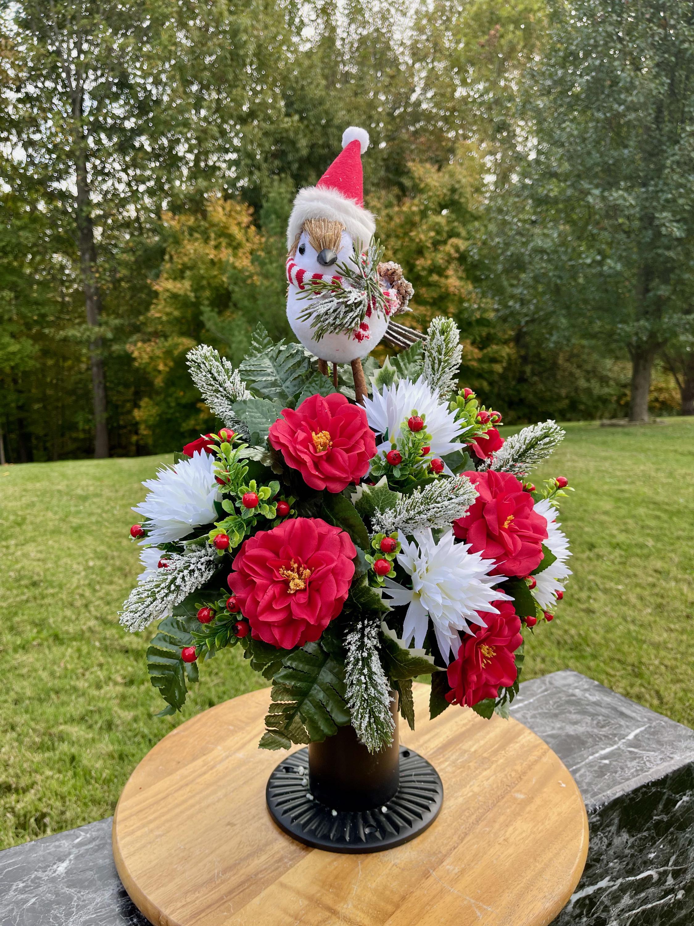 Christmas Cemetery Vase: Winter Snowbird with Santa Hat Memorial Flowers