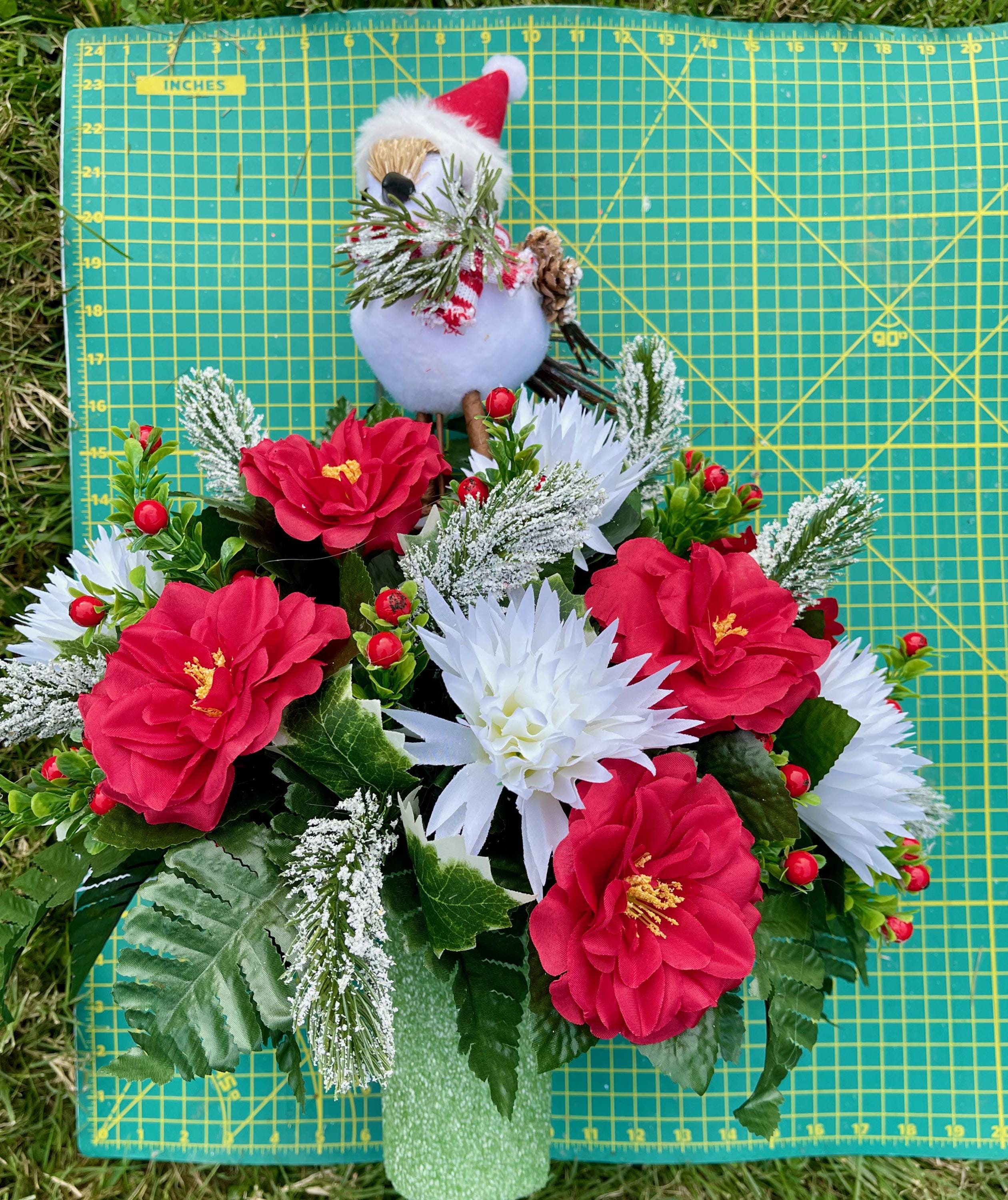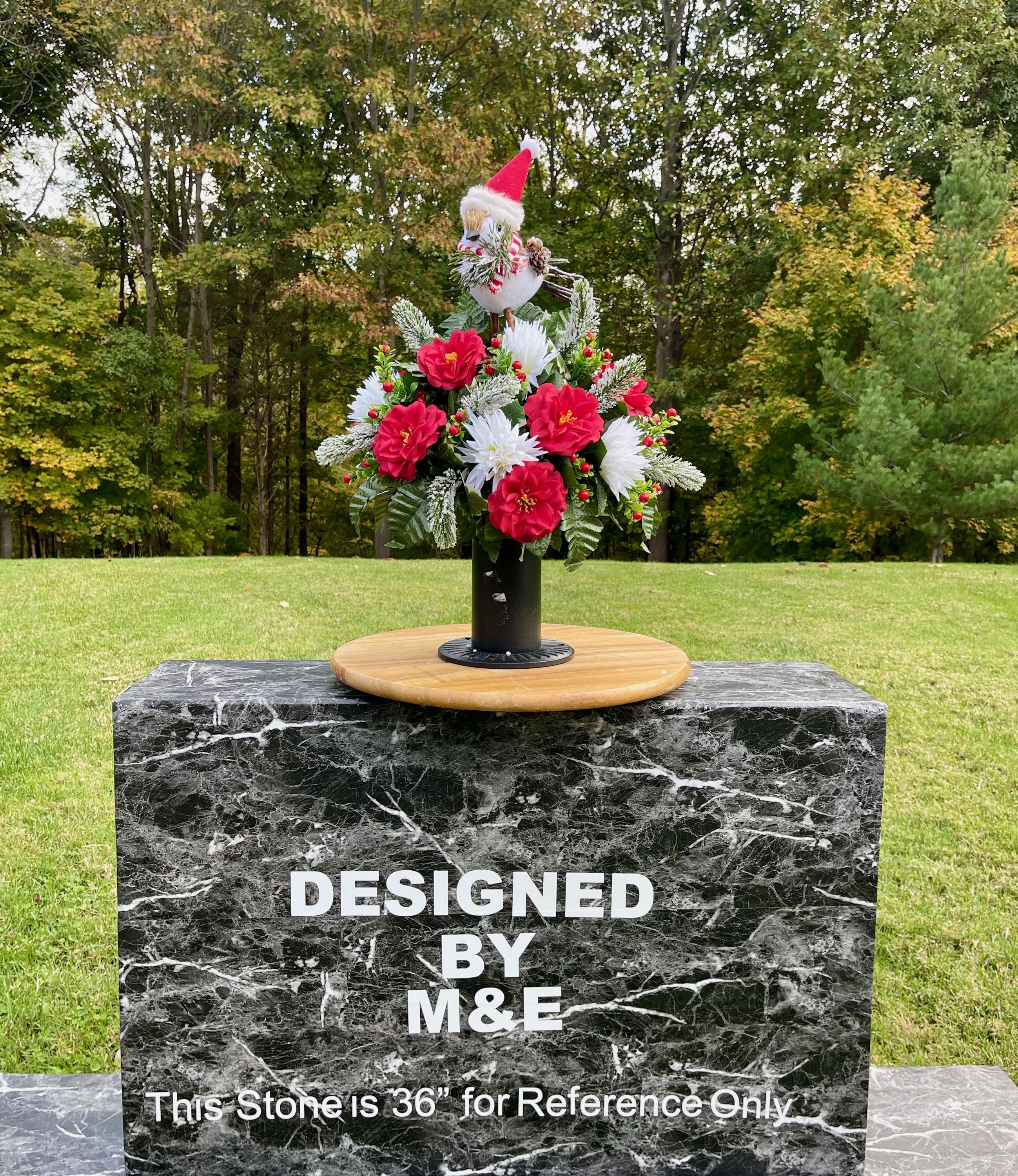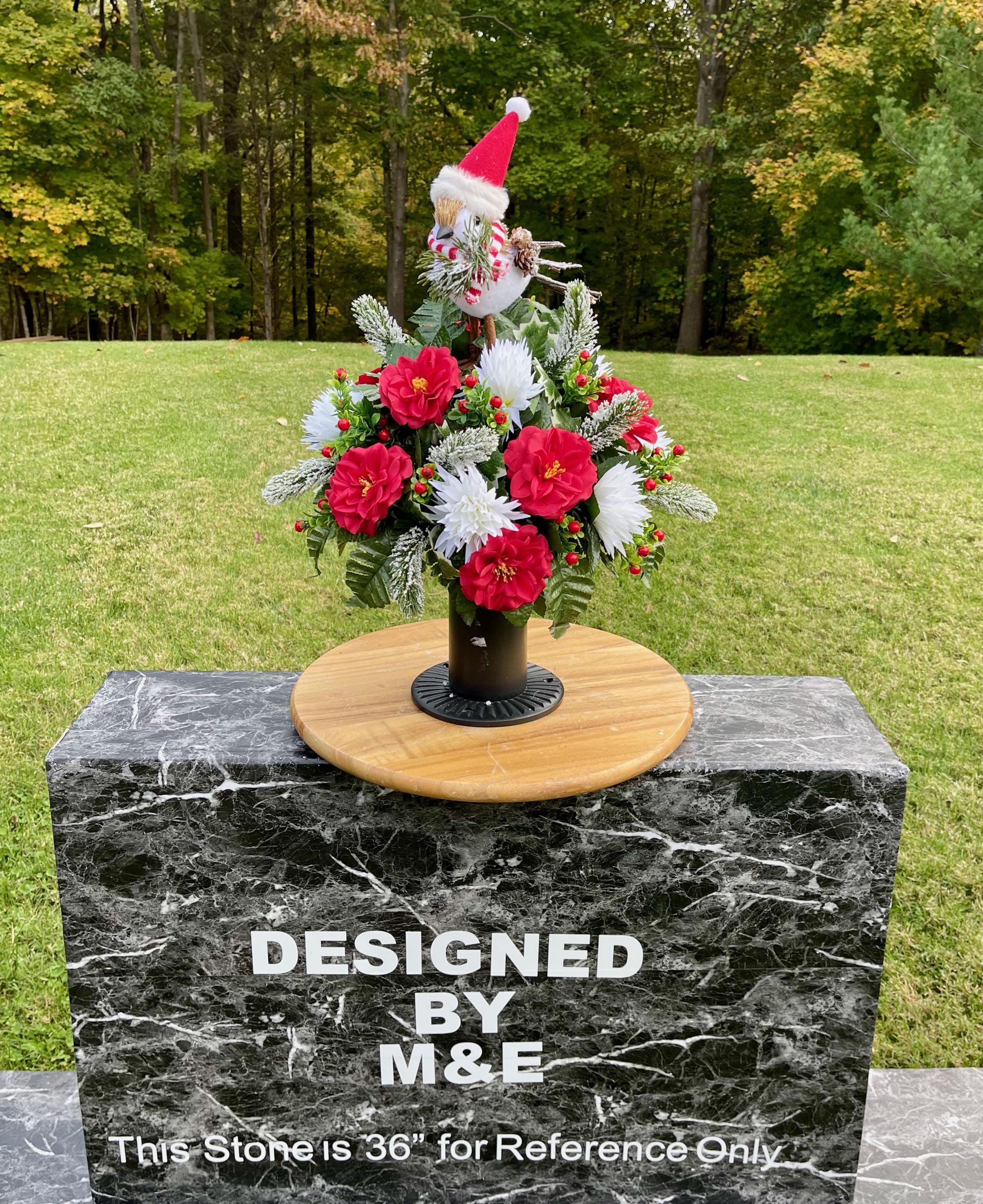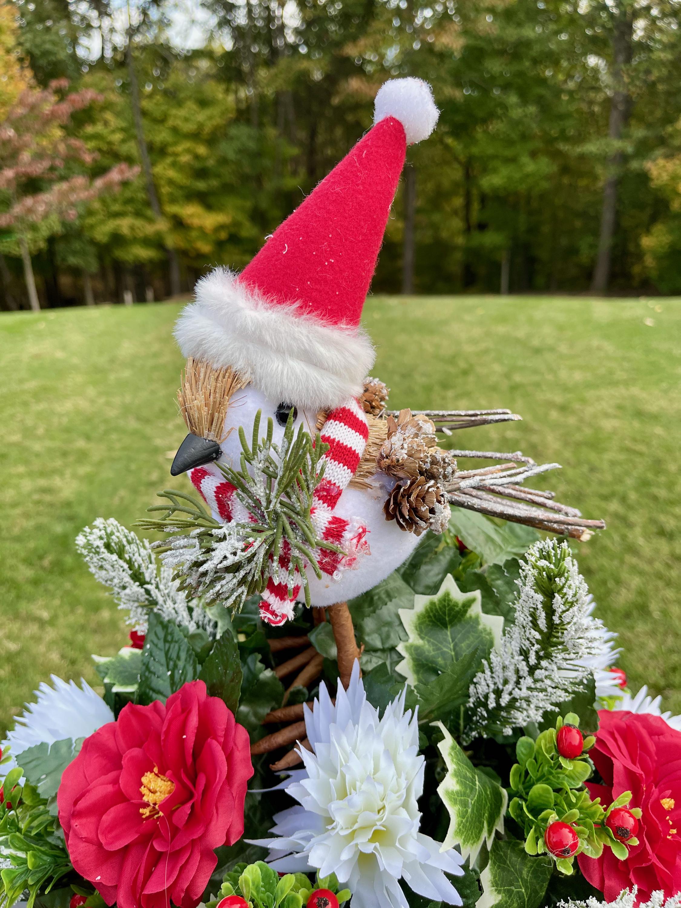 Christmas Cemetery Vase: Winter Snowbird with Santa Hat Memorial Flowers