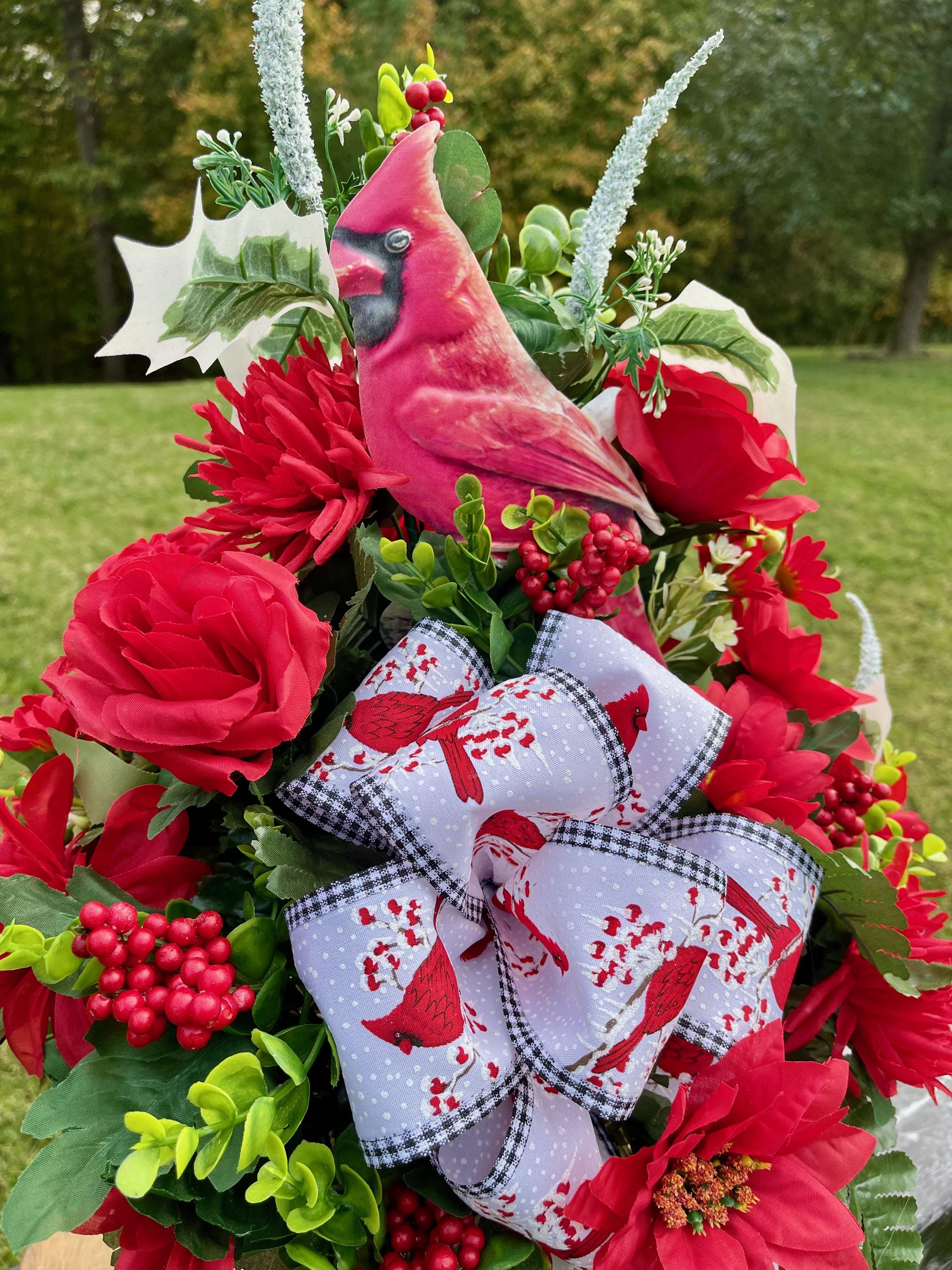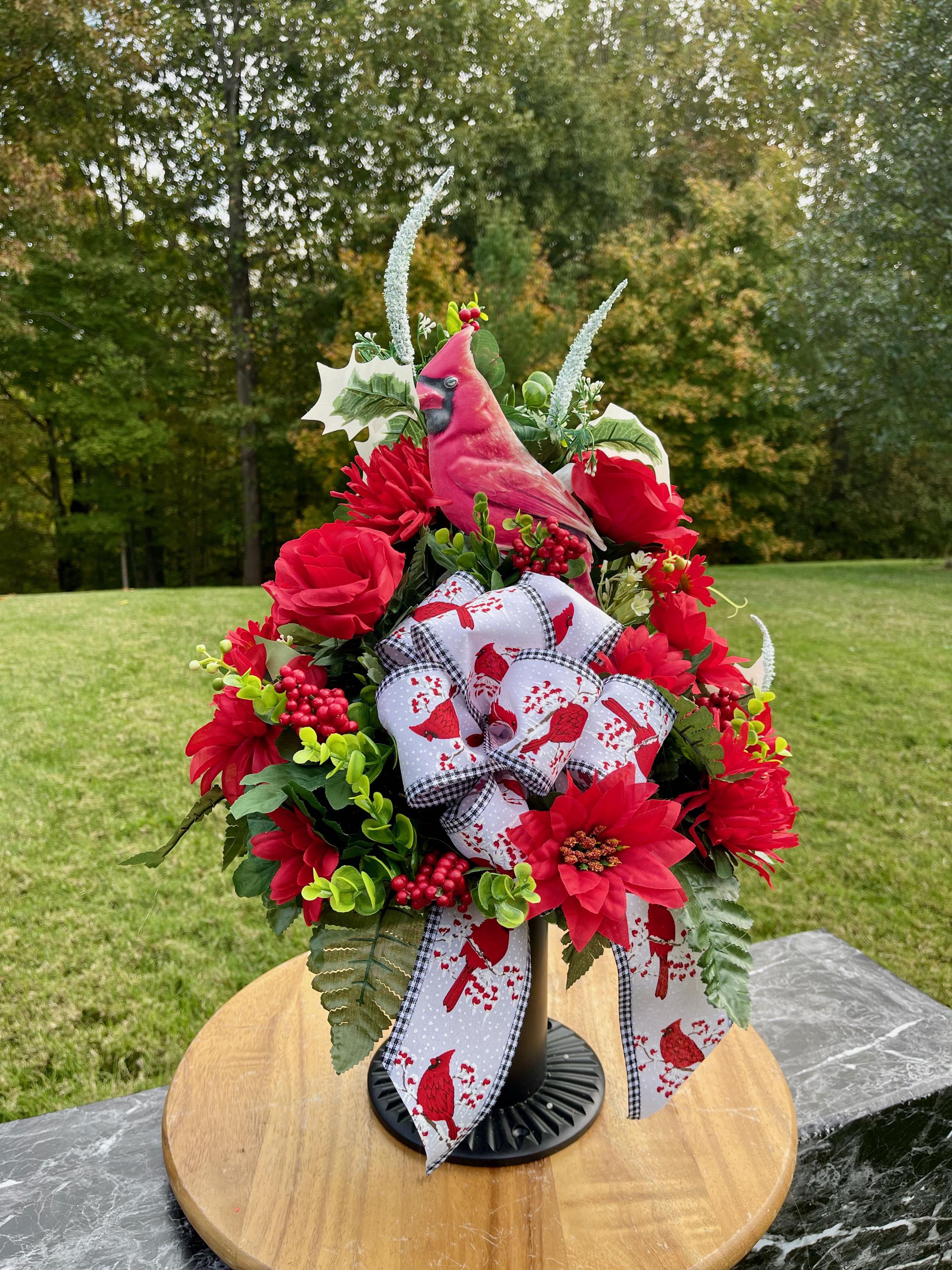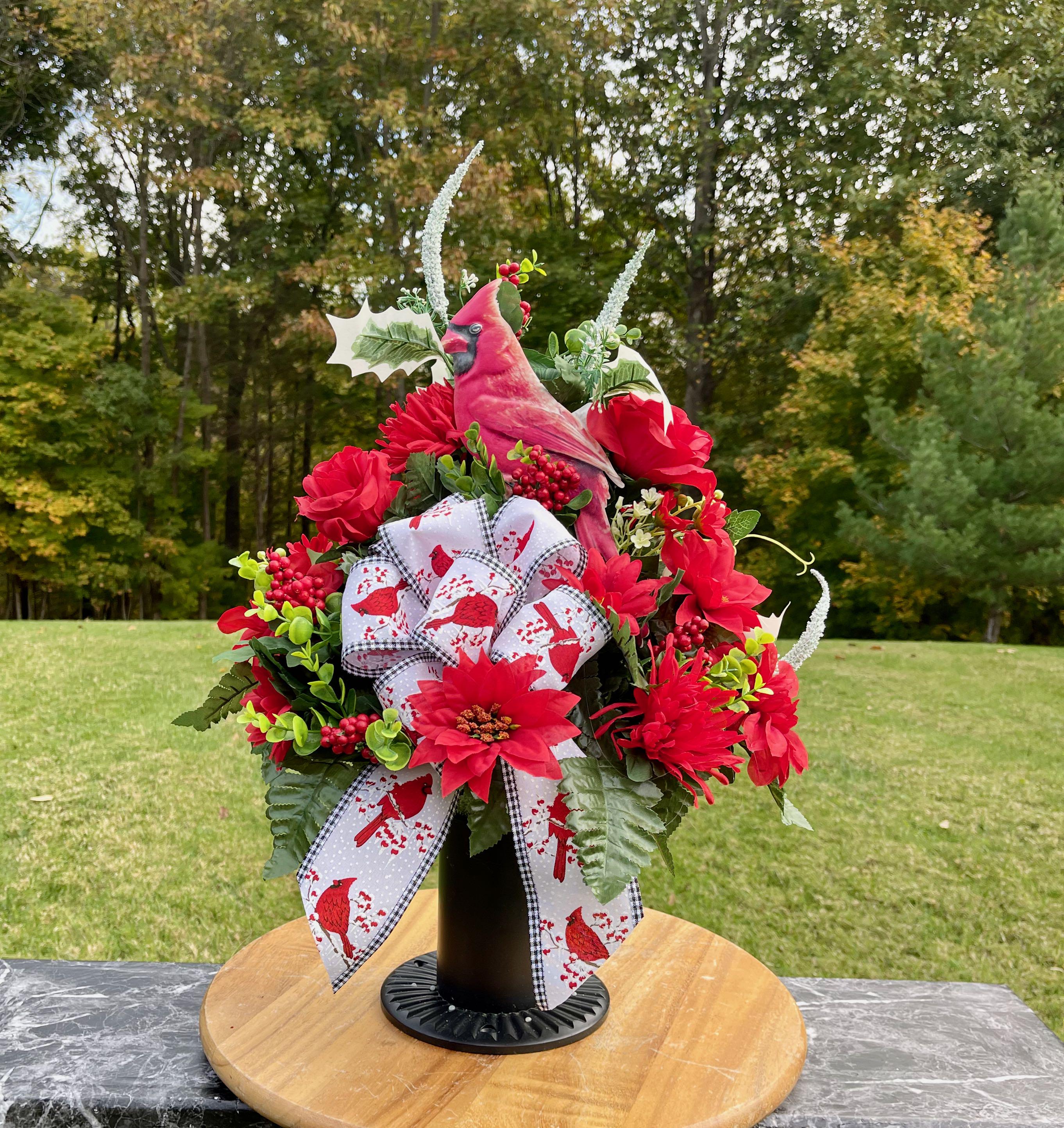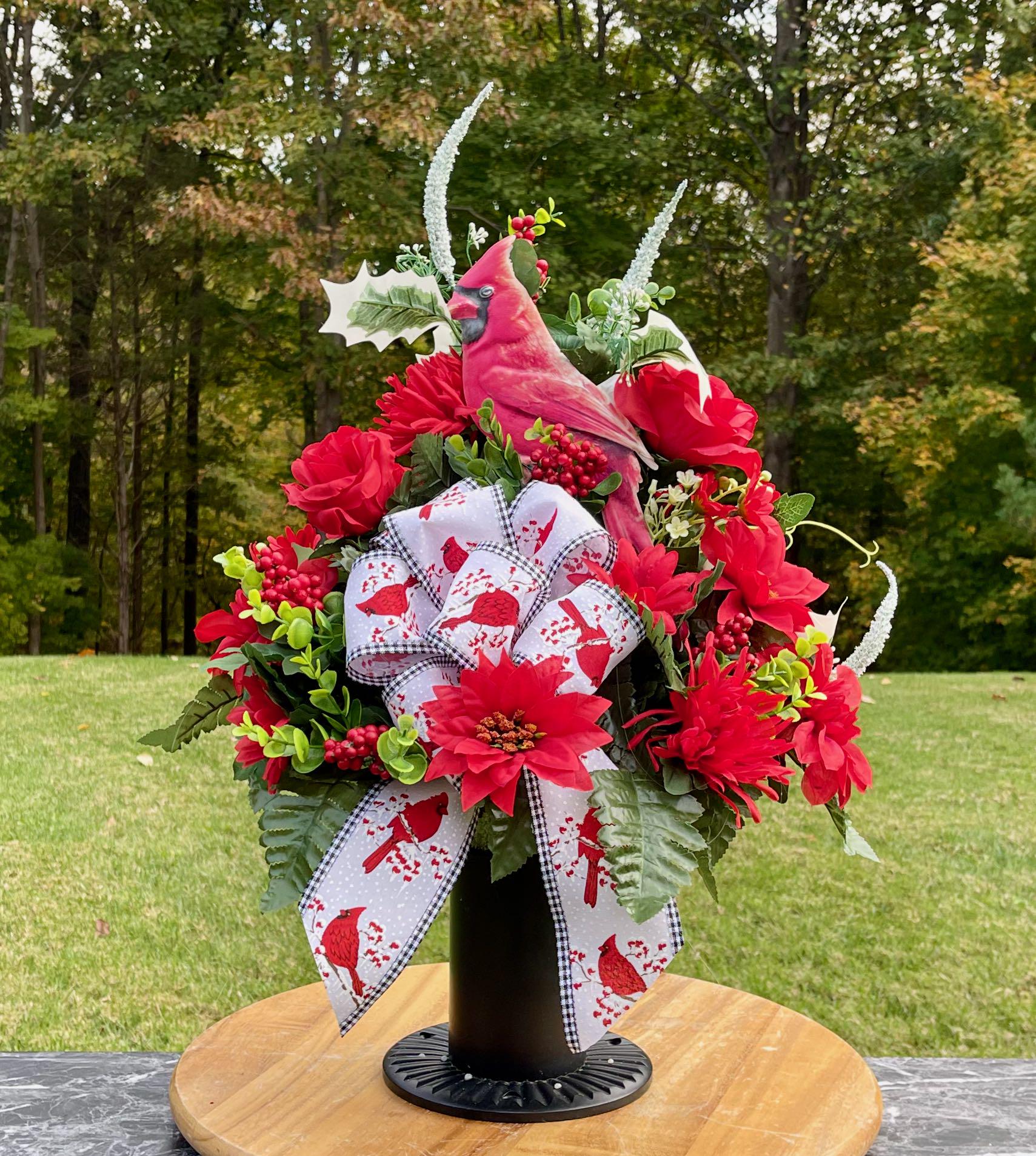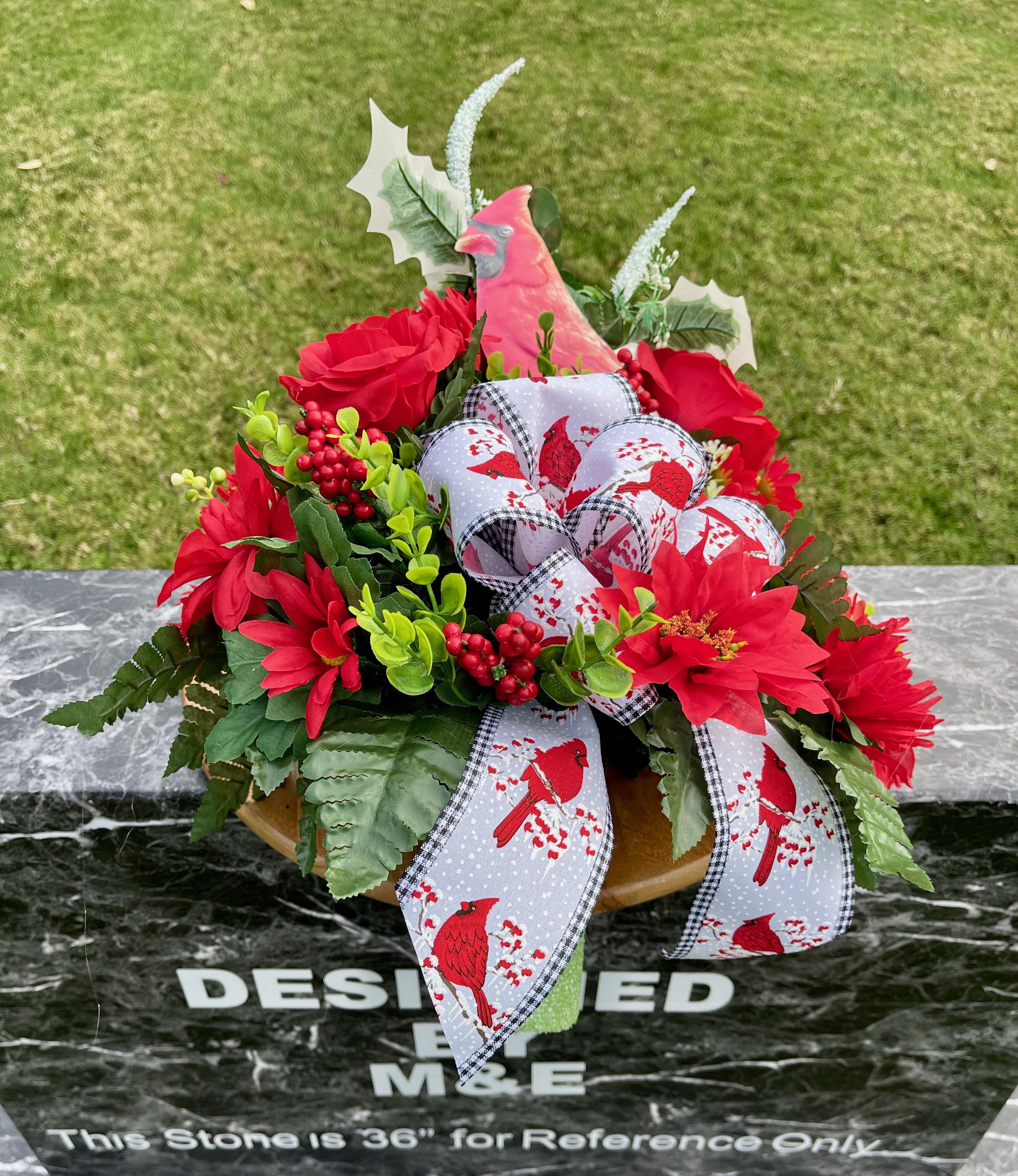 Holiday Cemetery Vase Arrangement, Large Cardinal Metal Sign with Redbird Bow Christmas Flowers