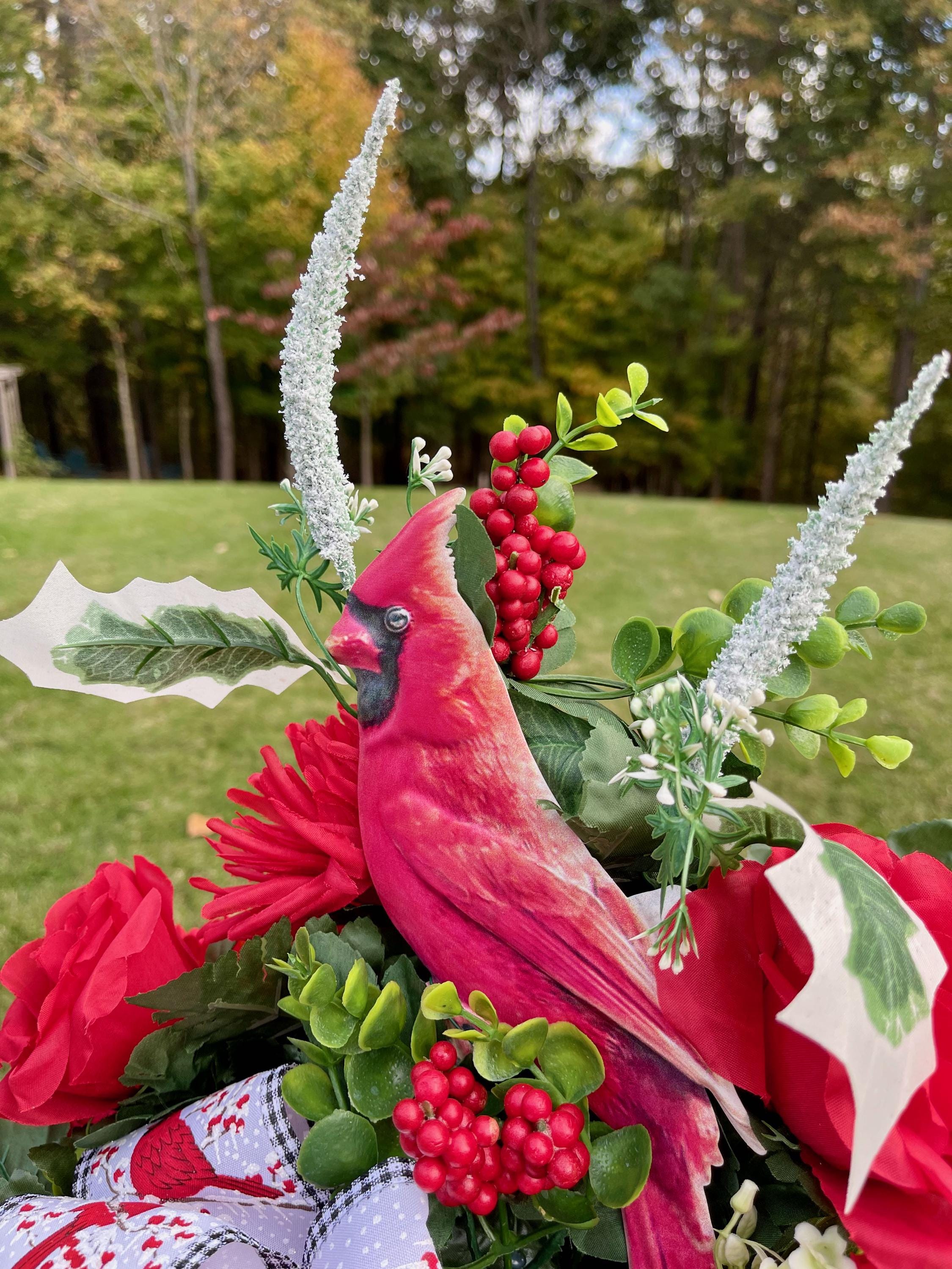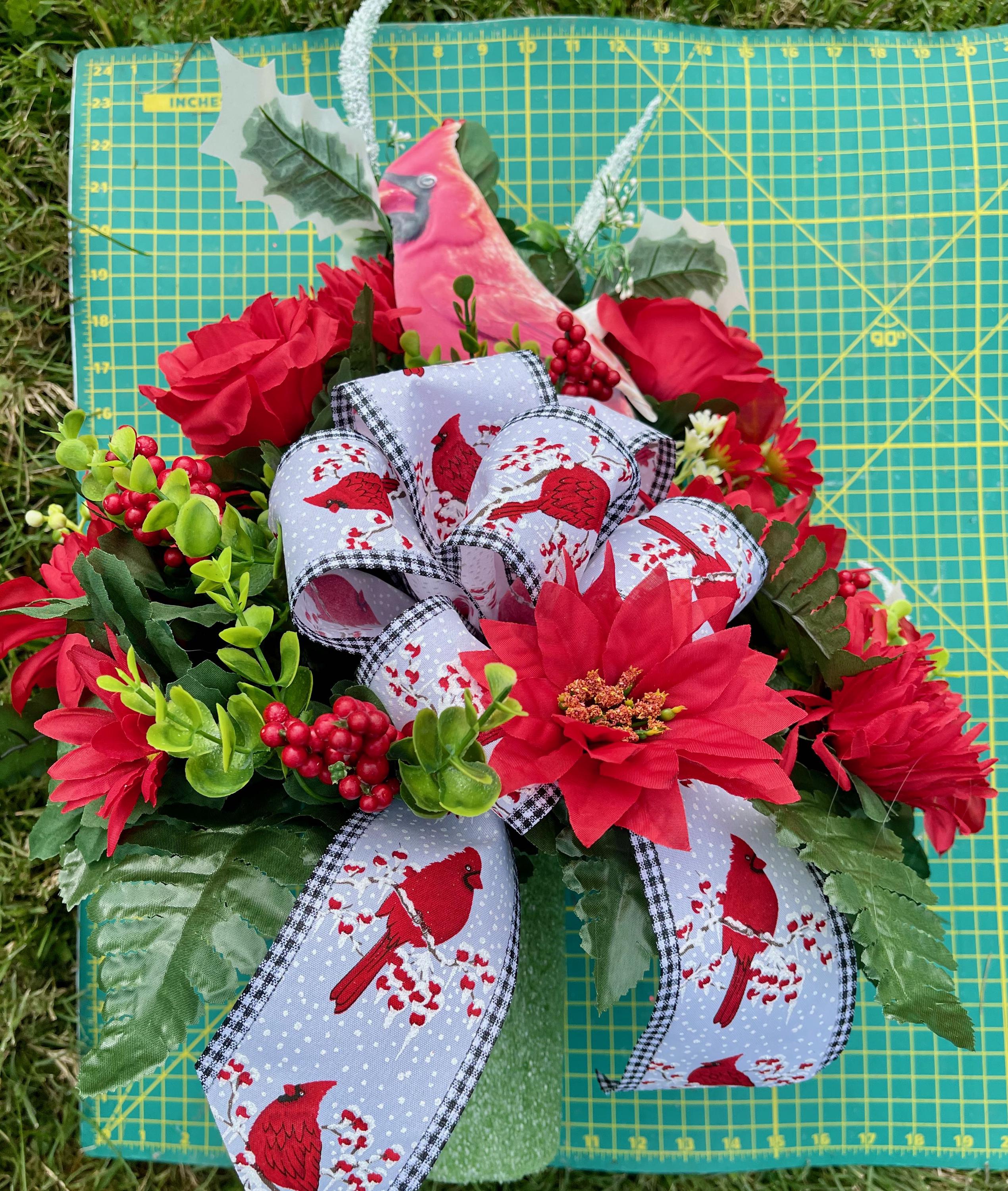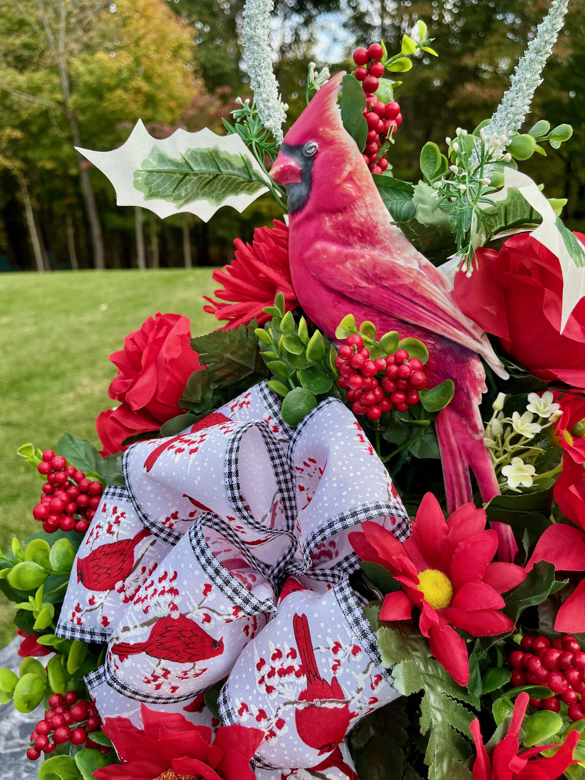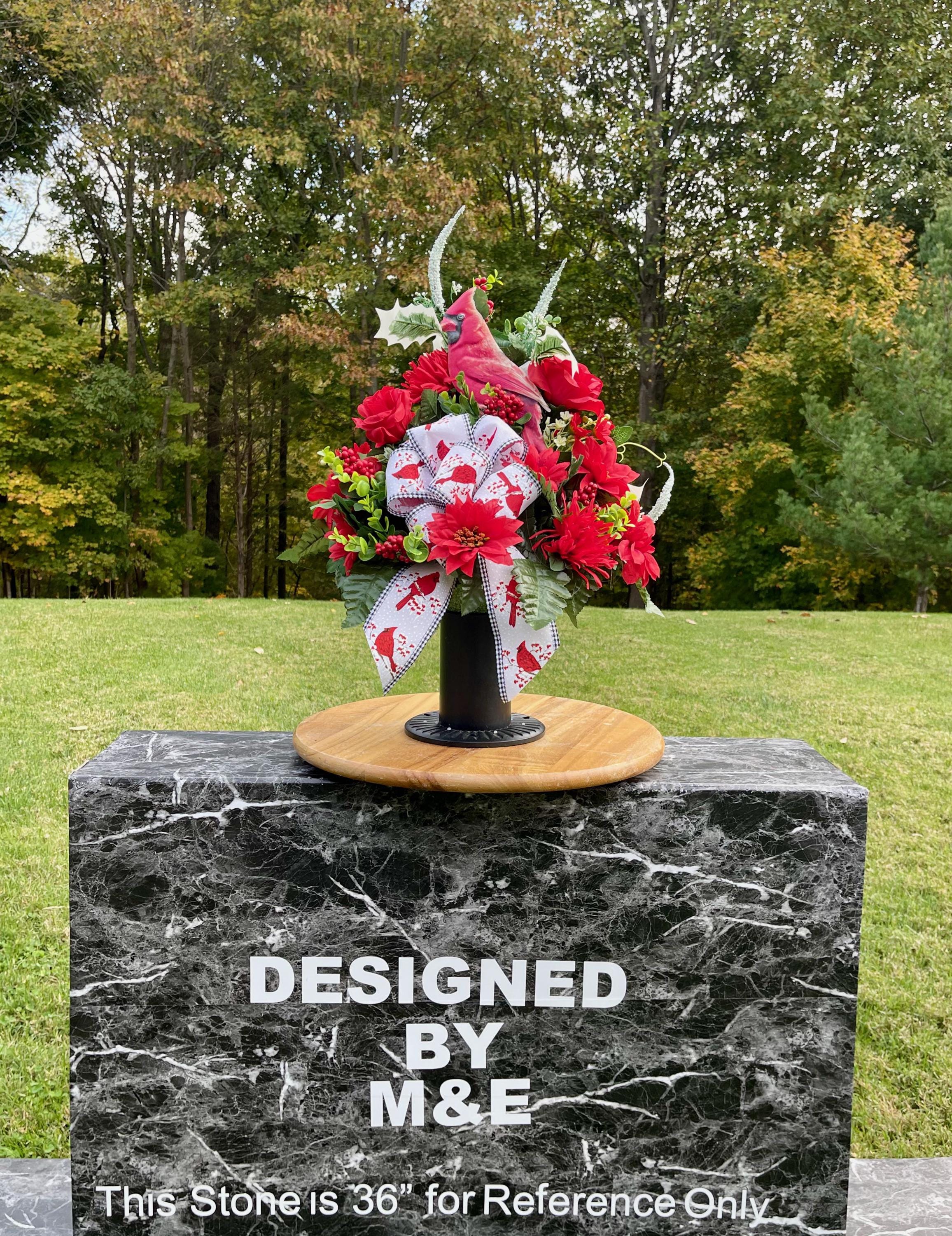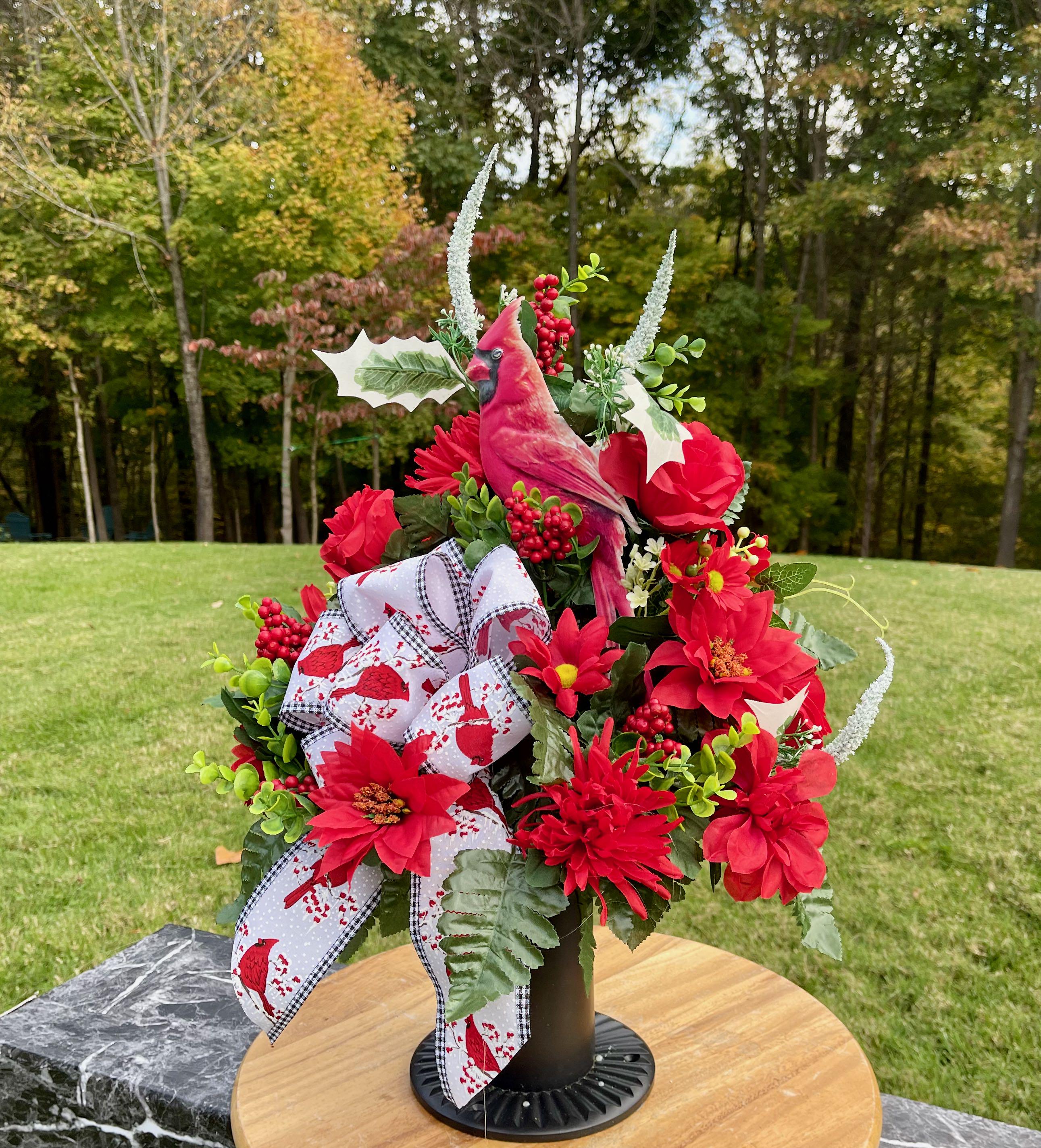 Holiday Cemetery Vase Arrangement, Large Cardinal Metal Sign with Redbird Bow Christmas Flowers